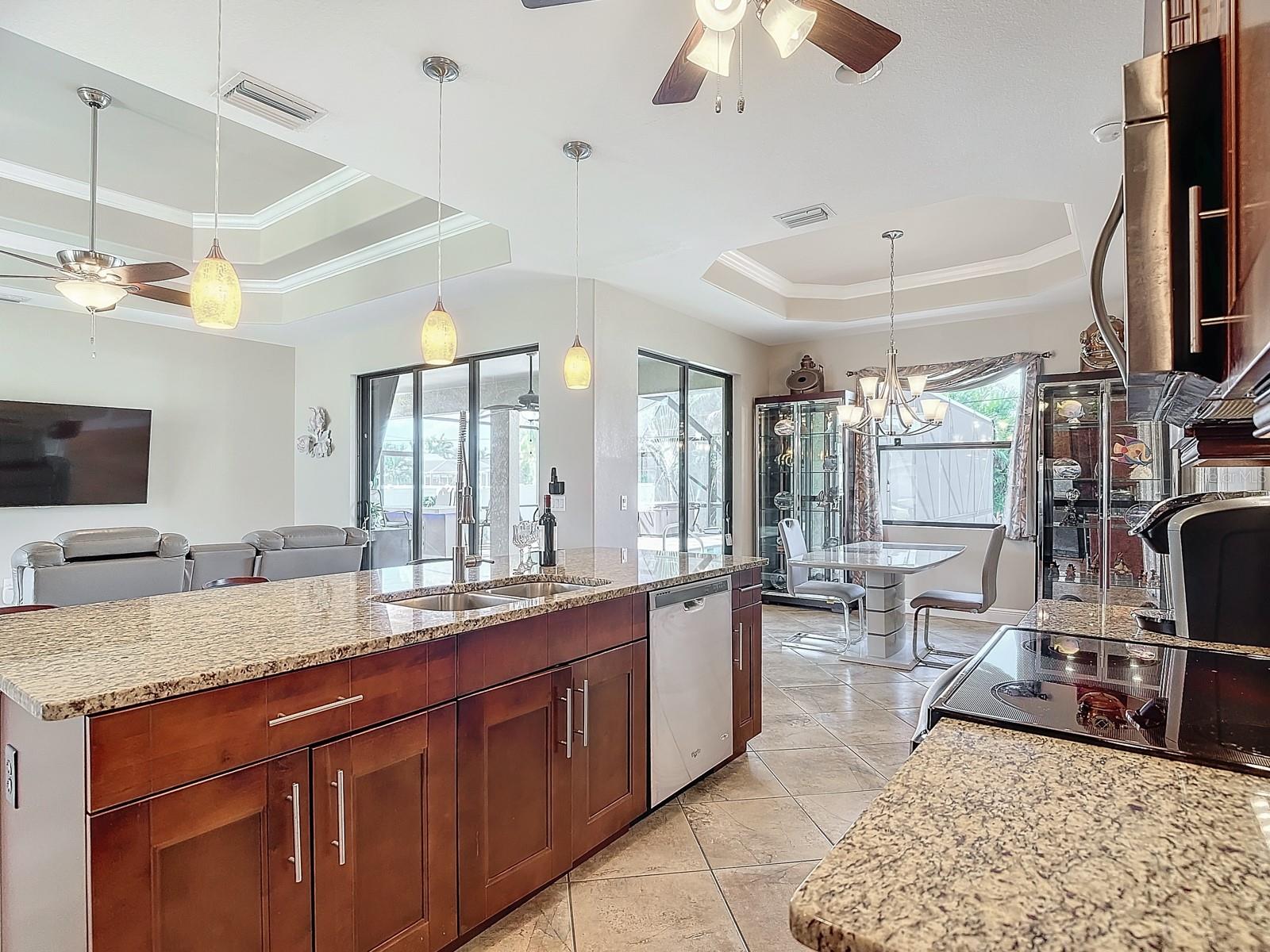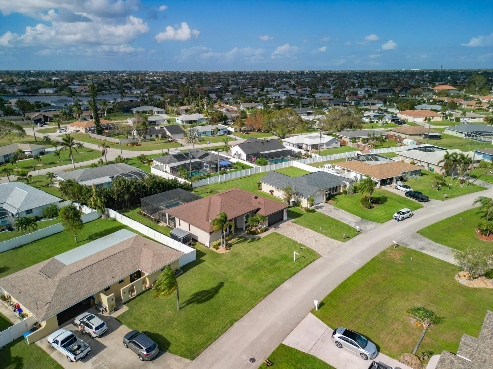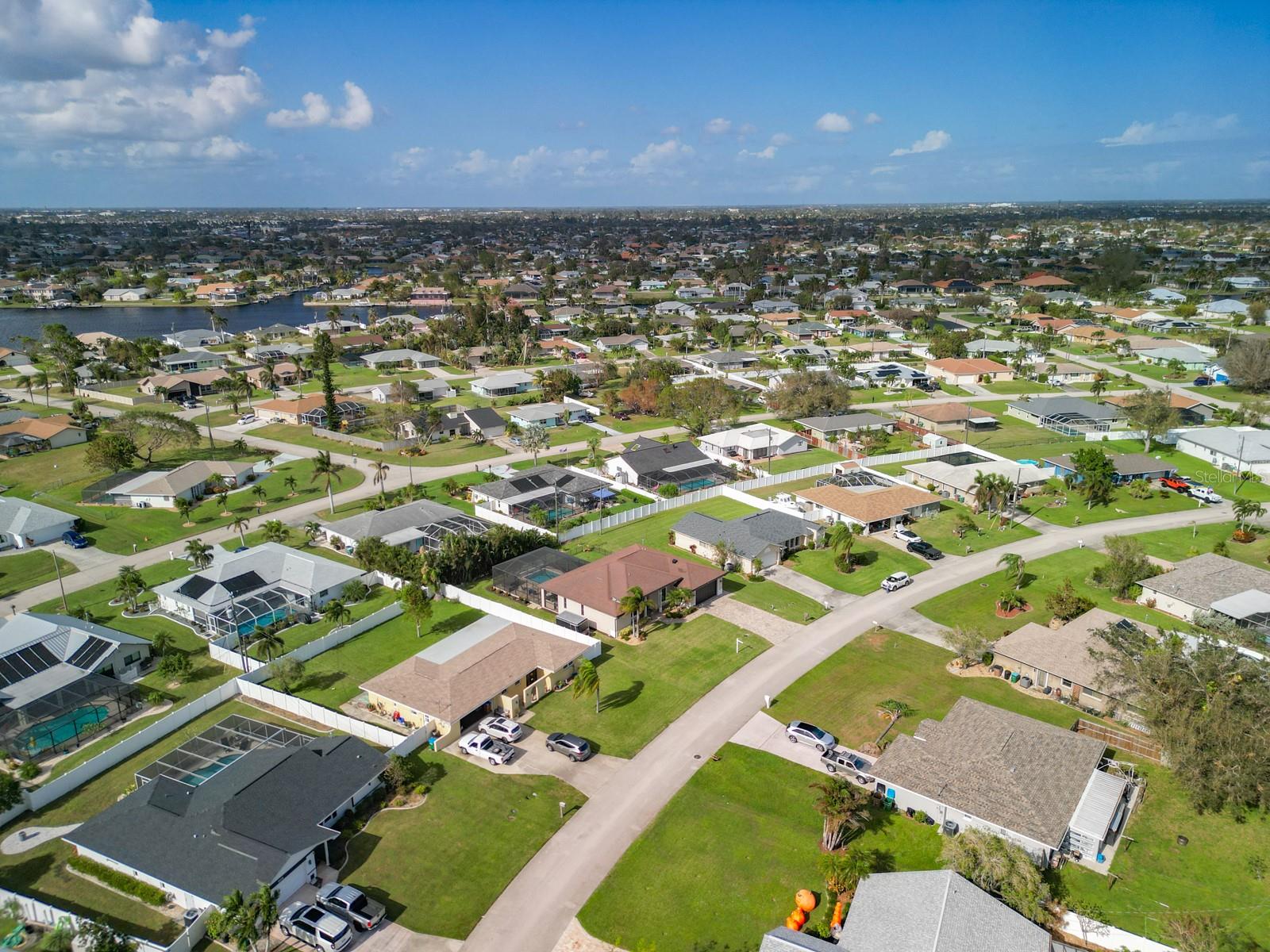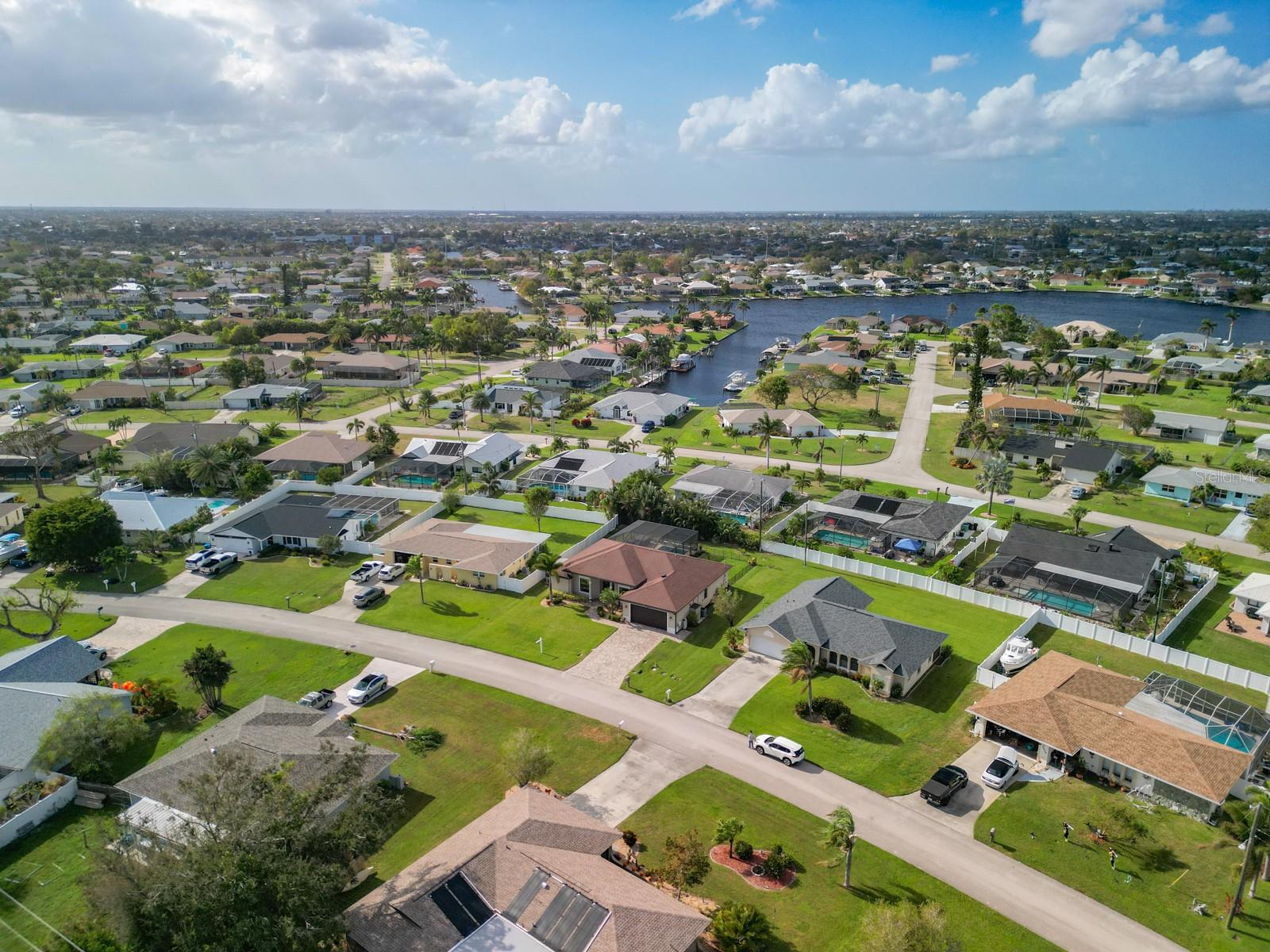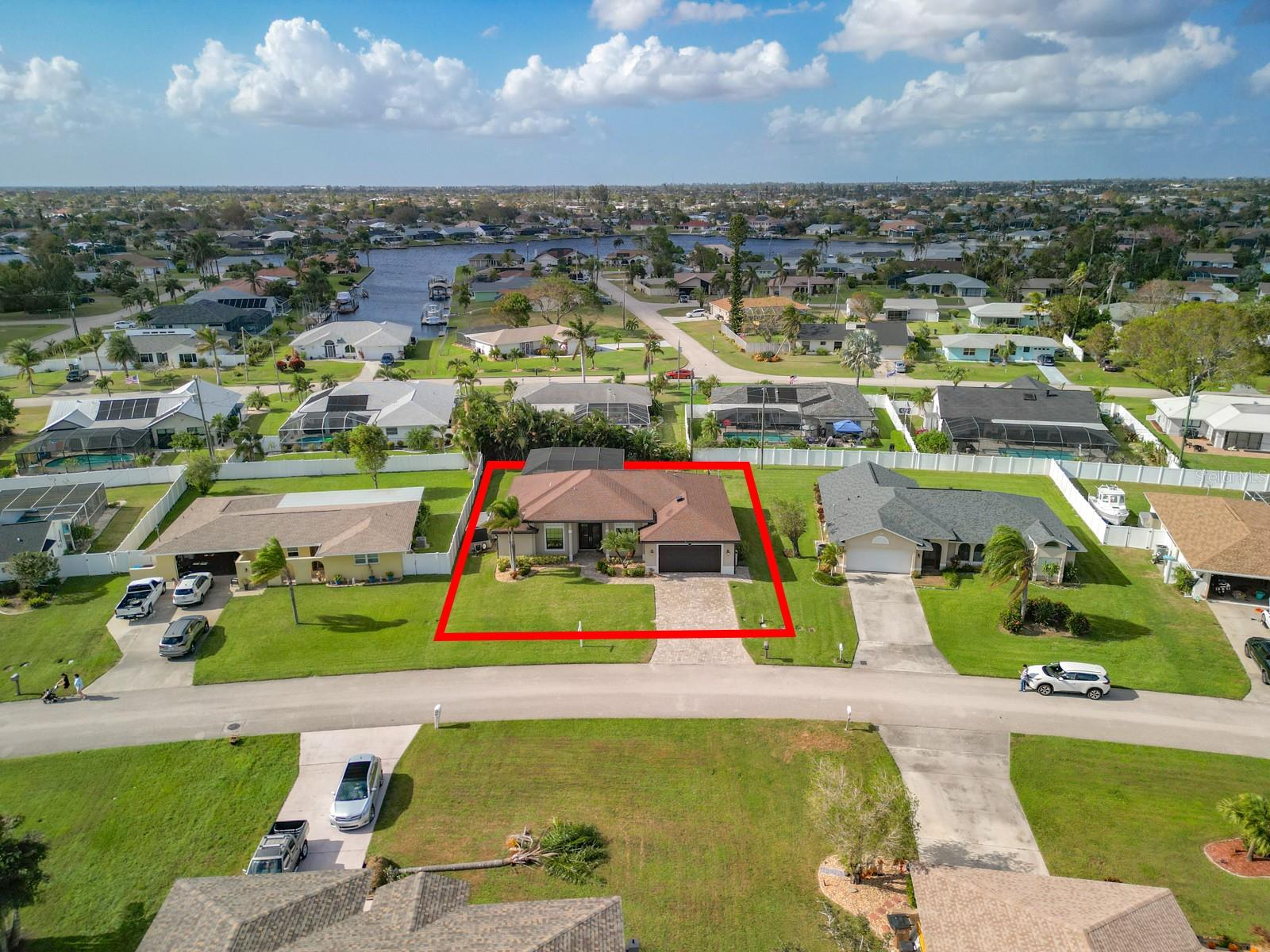 Welcome to this stunning modern home in Cape Coral, FL that comes with peace of mind - it has NEVER FLOODED! This three-bedroom, two- bathroom gem showcases a thoughtful split floor plan and includes a flexible den or office space, perfect for remote work or quiet study. Step into the open living area, where soaring high ceilings, elegant trayed detailing, and classic crown molding create a grand yet welcoming atmosphere. The kitchen is designed for both style and function, featuring expansive cabinets, a spacious island with seating, and a separate dining area ideal for family gatherings or entertaining friends. Triple and double sliding glass doors extend the indoor living space seamlessly to the outdoors, where a 24-by-14-foot pool awaits, nestled in private, lush landscaping. This outdoor oasis makes the patio a perfect place to host or unwind. The owner’s ensuite is a private retreat with luxurious trayed ceilings, dual sinks, a walk-in shower, and a roomy walk-in closet. The two additional bedrooms are cleverly designed with their own separate entrance, creating a private, two-bedroom in-law suite option. The oversized two-car garage, complete with fresh epoxy flooring, newer overhead storage, a workbench, and added electrical outlets, is built for convenience. It also has pull-down attic access, providing even more storage options. This home offers a rare blend of modern luxury, practical layout, and storm security, making it a standout choice in Cape Coral. SW Florida International Airport: 18.4 miles. Yacht Club Public Beach: 4.0 miles. Sun Splash Family Waterpark: 6.0 miles. Cultural Park Theatre: 5.0 miles