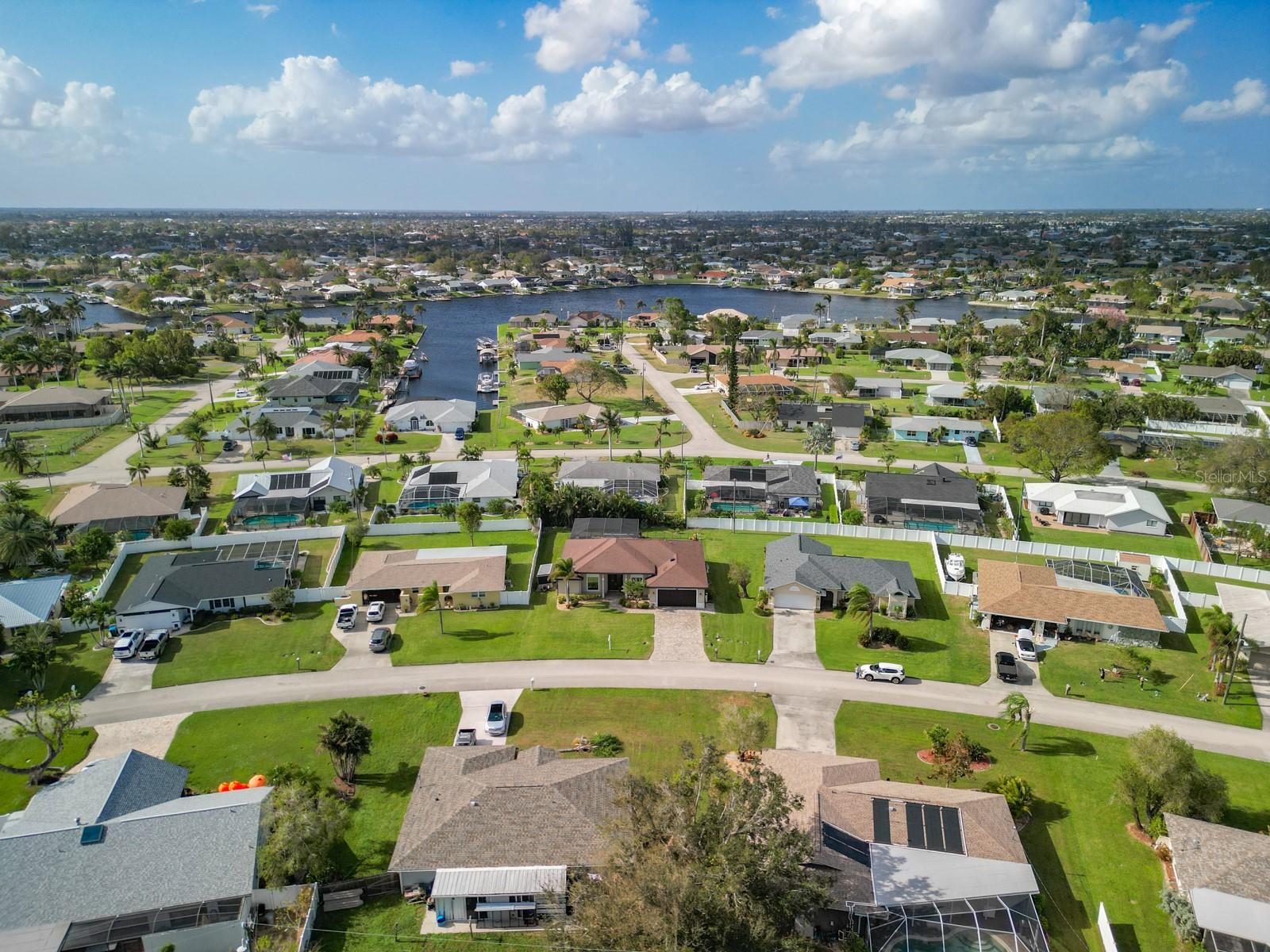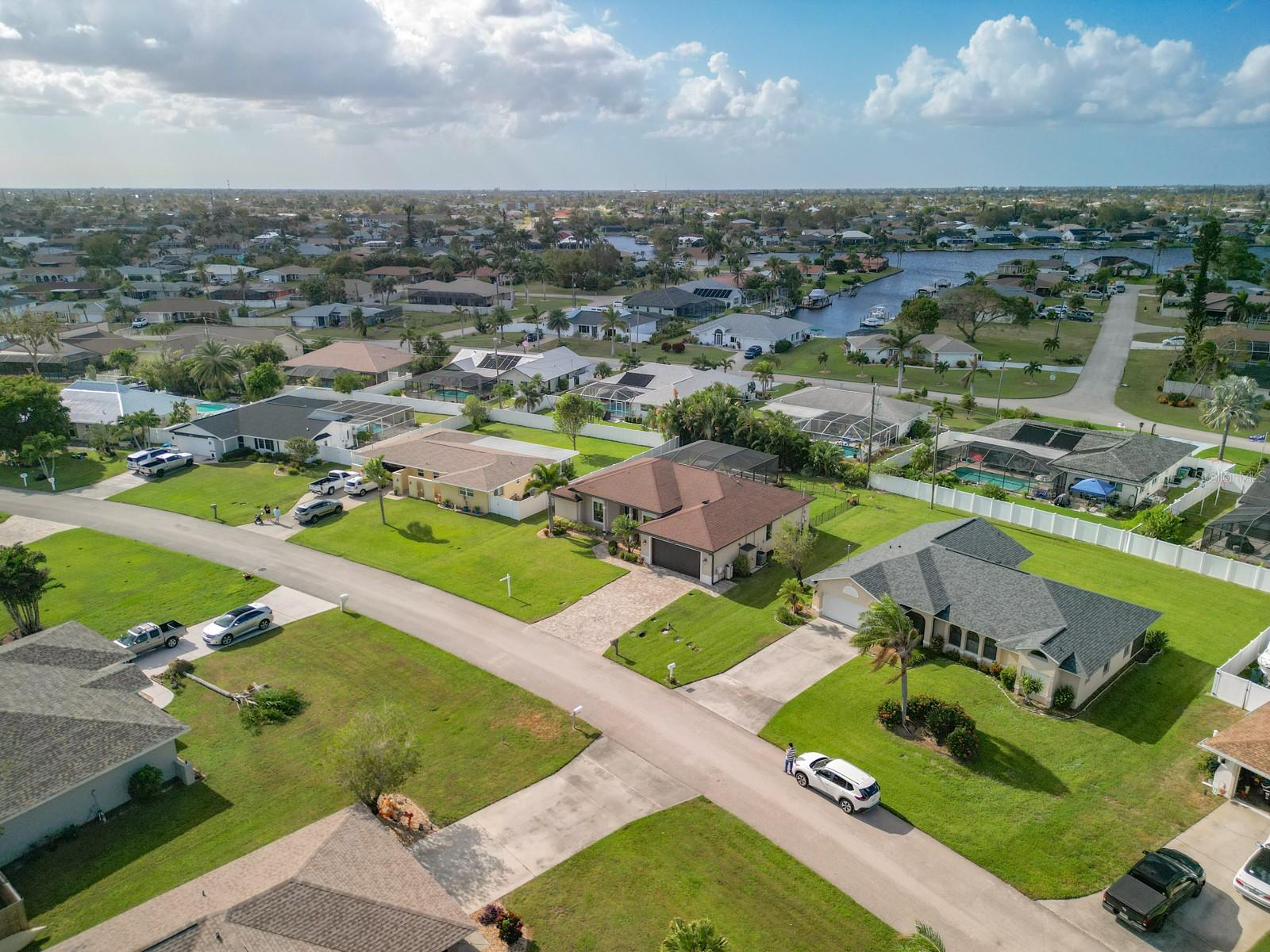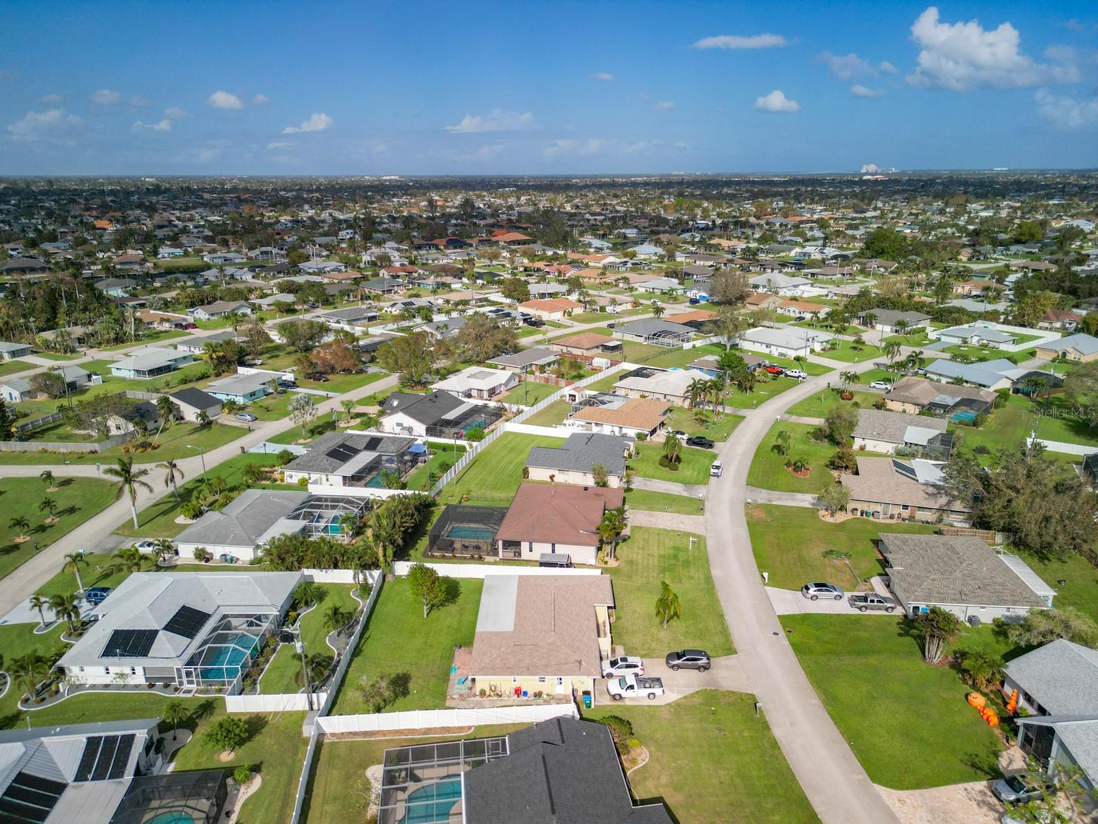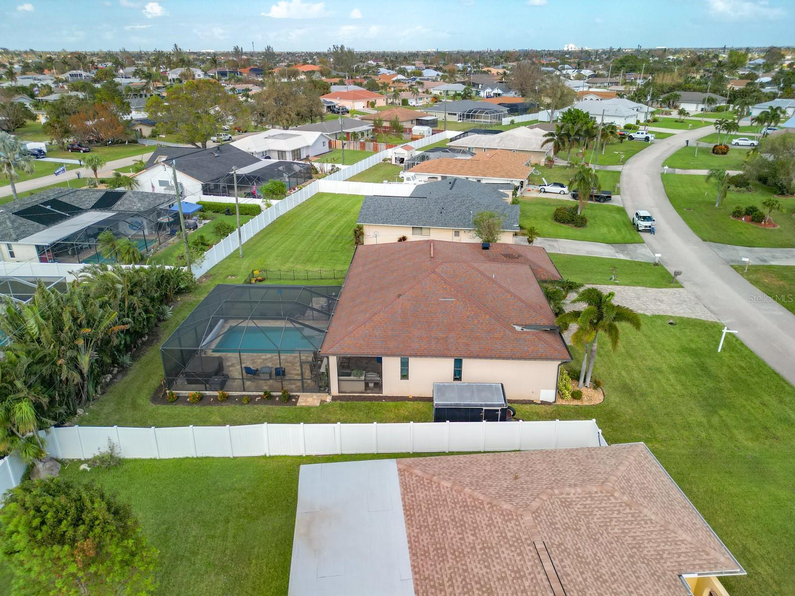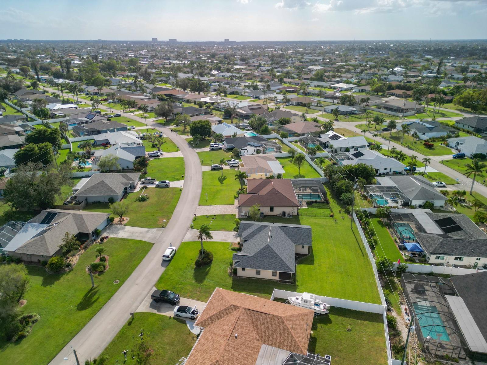 Welcome to this stunning modern home in Cape Coral, FL that comes with peace of mind - it has NEVER FLOODED! This three-bedroom, two- bathroom gem showcases a thoughtful split floor plan and includes a flexible den or office space, perfect for remote work or quiet study. Step into the open living area, where soaring high ceilings, elegant trayed detailing, and classic crown molding create a grand yet welcoming atmosphere. The kitchen is designed for both style and function, featuring expansive cabinets, a spacious island with seating, and a separate dining area ideal for family gatherings or entertaining friends. Triple and double sliding glass doors extend the indoor living space seamlessly to the outdoors, where a 24-by-14-foot pool awaits, nestled in private, lush landscaping. This outdoor oasis makes the patio a perfect place to host or unwind. The owner’s ensuite is a private retreat with luxurious trayed ceilings, dual sinks, a walk-in shower, and a roomy walk-in closet. The two additional bedrooms are cleverly designed with their own separate entrance, creating a private, two-bedroom in-law suite option. The oversized two-car garage, complete with fresh epoxy flooring, newer overhead storage, a workbench, and added electrical outlets, is built for convenience. It also has pull-down attic access, providing even more storage options. This home offers a rare blend of modern luxury, practical layout, and storm security, making it a standout choice in Cape Coral. SW Florida International Airport: 18.4 miles. Yacht Club Public Beach: 4.0 miles. Sun Splash Family Waterpark: 6.0 miles. Cultural Park Theatre: 5.0 miles
