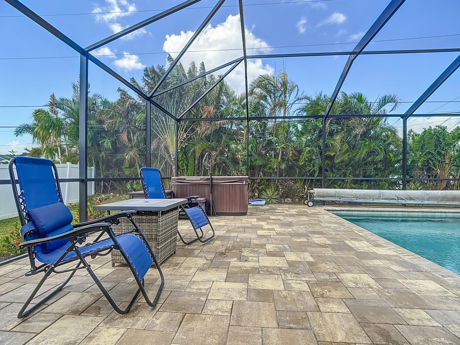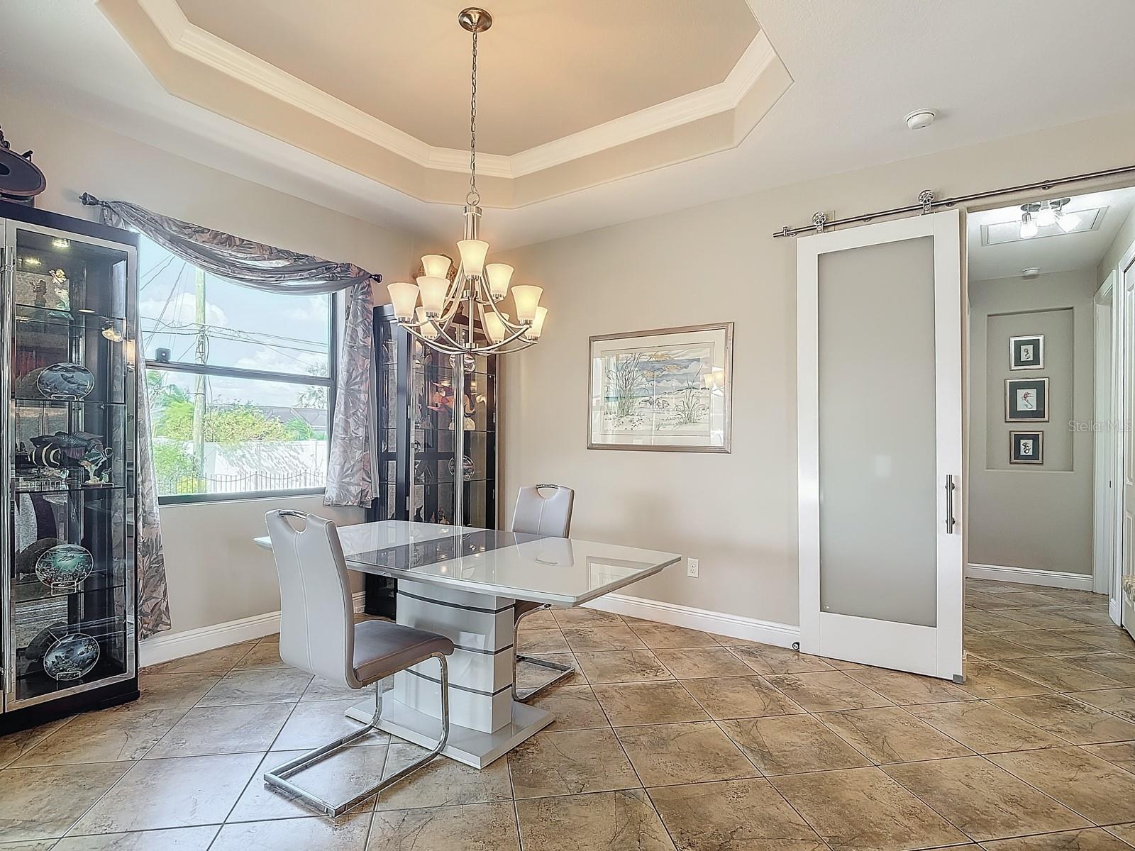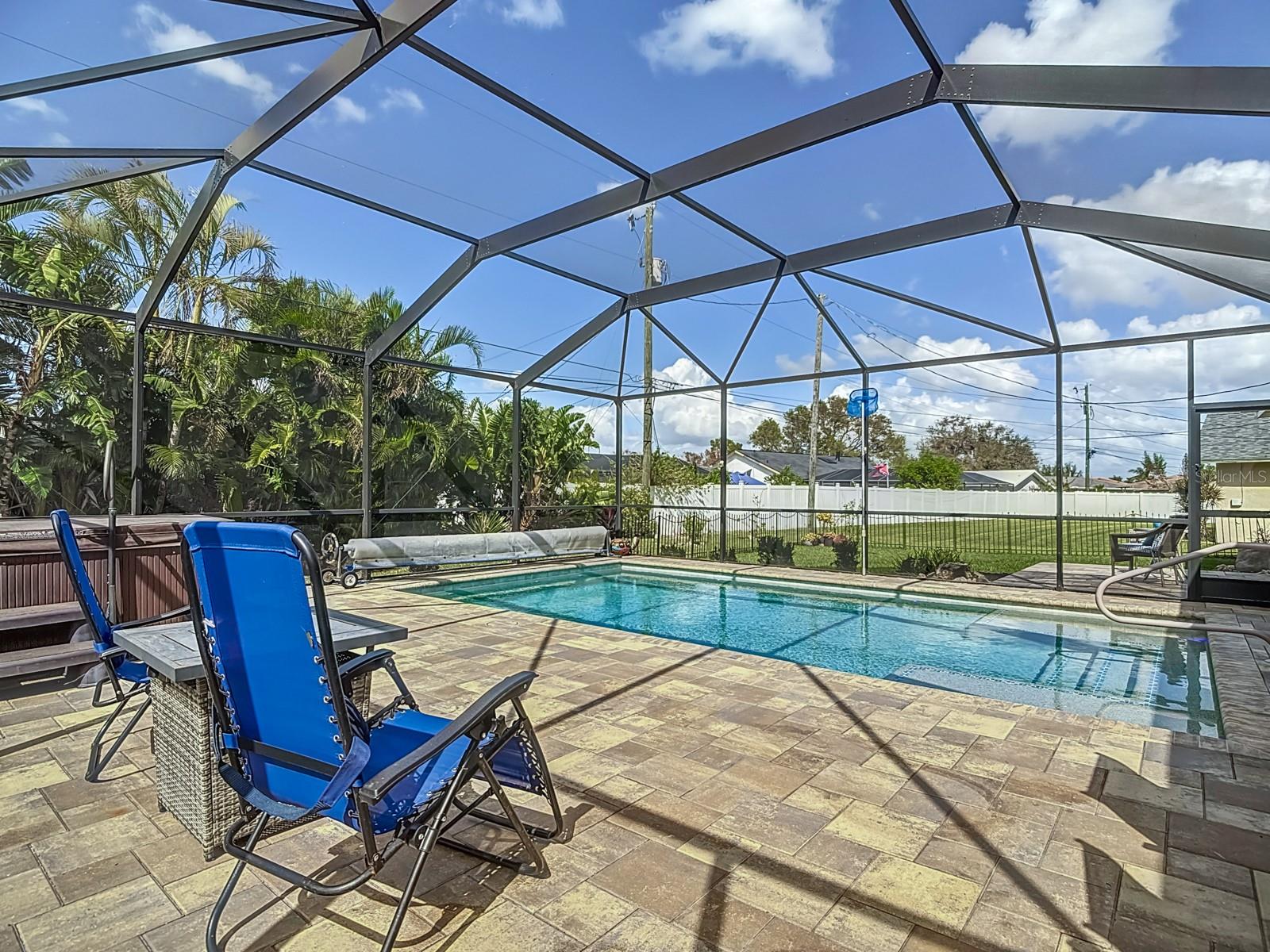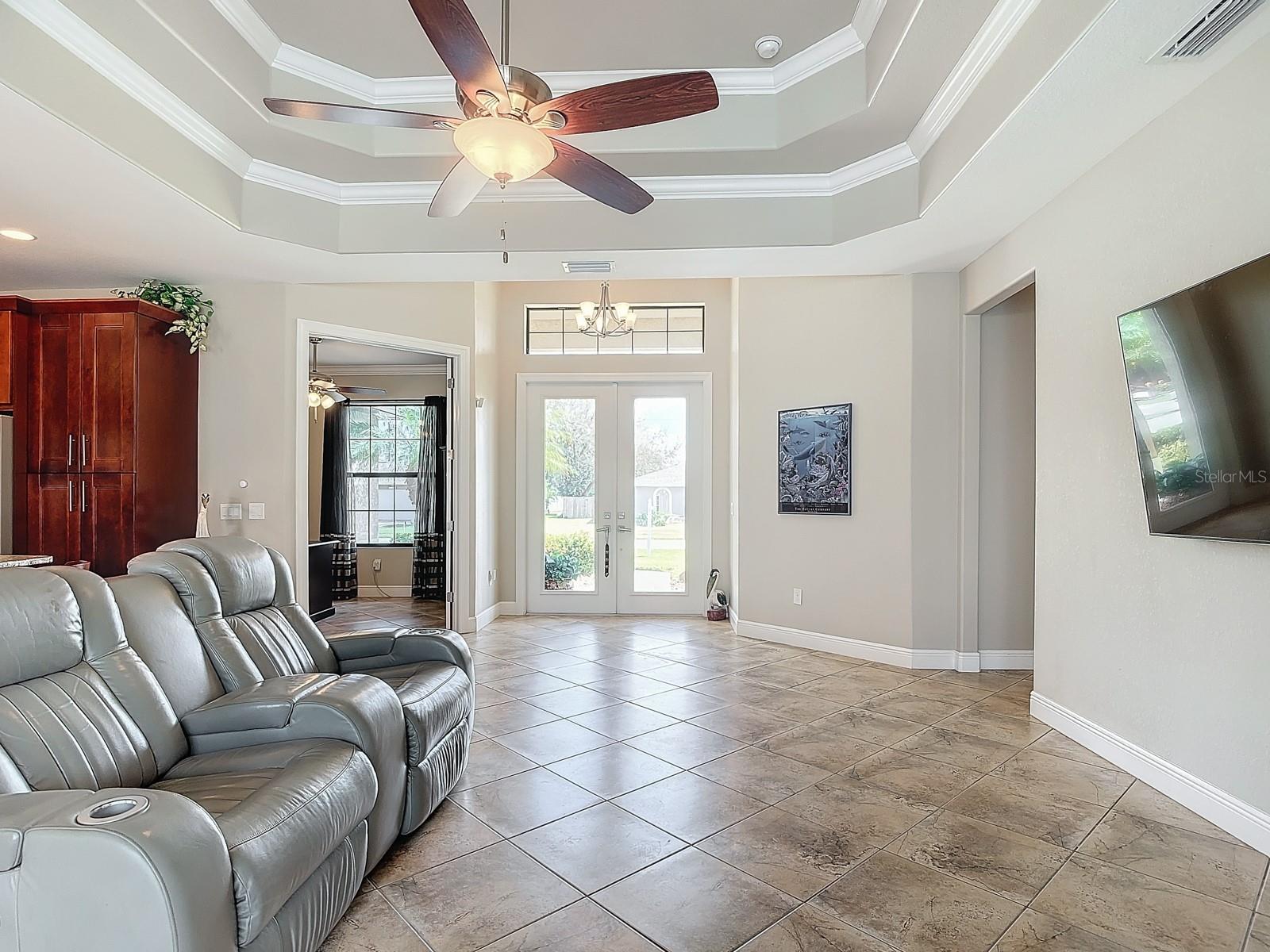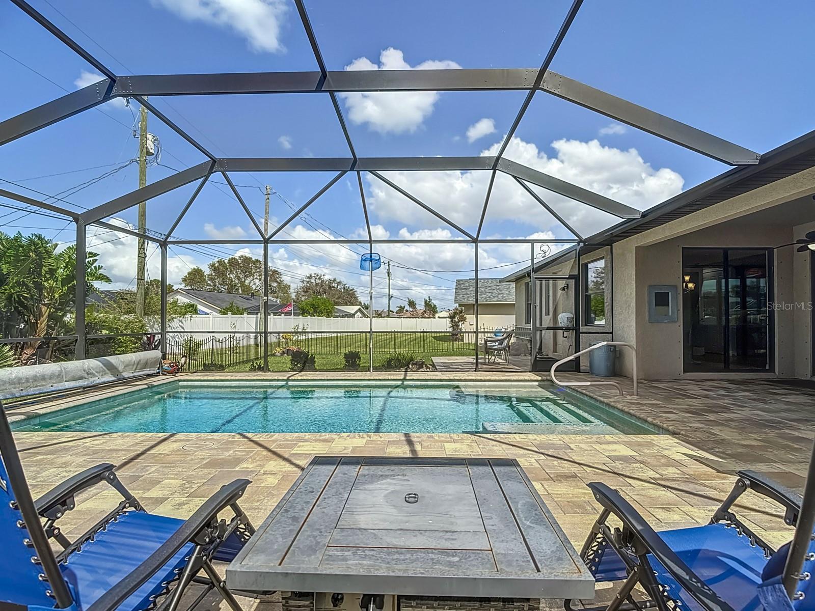 Welcome to this stunning modern home in Cape Coral, FL that comes with peace of mind - it has NEVER FLOODED! This three-bedroom, two- bathroom gem showcases a thoughtful split floor plan and includes a flexible den or office space, perfect for remote work or quiet study. Step into the open living area, where soaring high ceilings, elegant trayed detailing, and classic crown molding create a grand yet welcoming atmosphere. The kitchen is designed for both style and function, featuring expansive cabinets, a spacious island with seating, and a separate dining area ideal for family gatherings or entertaining friends. Triple and double sliding glass doors extend the indoor living space seamlessly to the outdoors, where a 24-by-14-foot pool awaits, nestled in private, lush landscaping. This outdoor oasis makes the patio a perfect place to host or unwind. The owner’s ensuite is a private retreat with luxurious trayed ceilings, dual sinks, a walk-in shower, and a roomy walk-in closet. The two additional bedrooms are cleverly designed with their own separate entrance, creating a private, two-bedroom in-law suite option. The oversized two-car garage, complete with fresh epoxy flooring, newer overhead storage, a workbench, and added electrical outlets, is built for convenience. It also has pull-down attic access, providing even more storage options. This home offers a rare blend of modern luxury, practical layout, and storm security, making it a standout choice in Cape Coral. SW Florida International Airport: 18.4 miles. Yacht Club Public Beach: 4.0 miles. Sun Splash Family Waterpark: 6.0 miles. Cultural Park Theatre: 5.0 miles