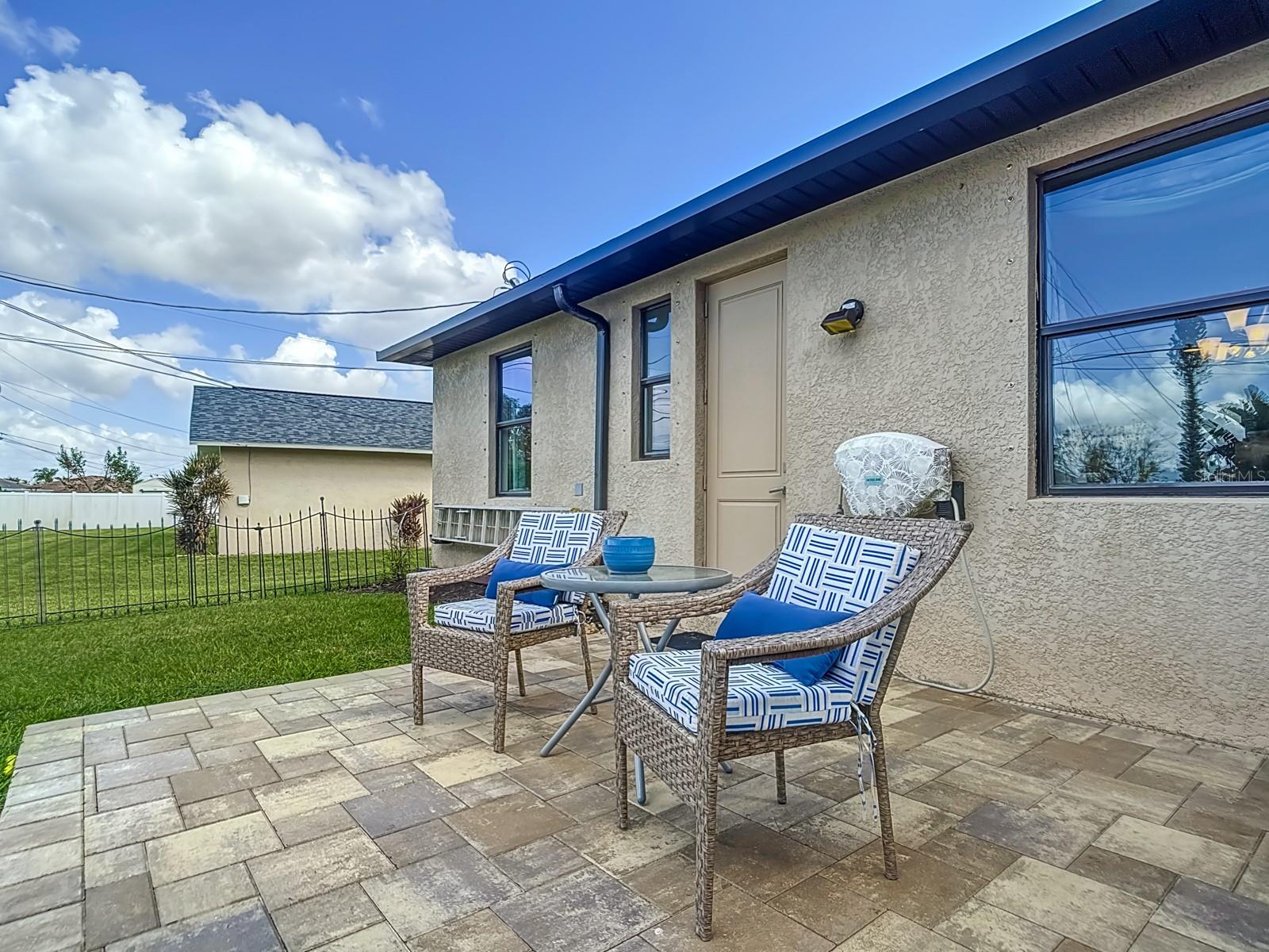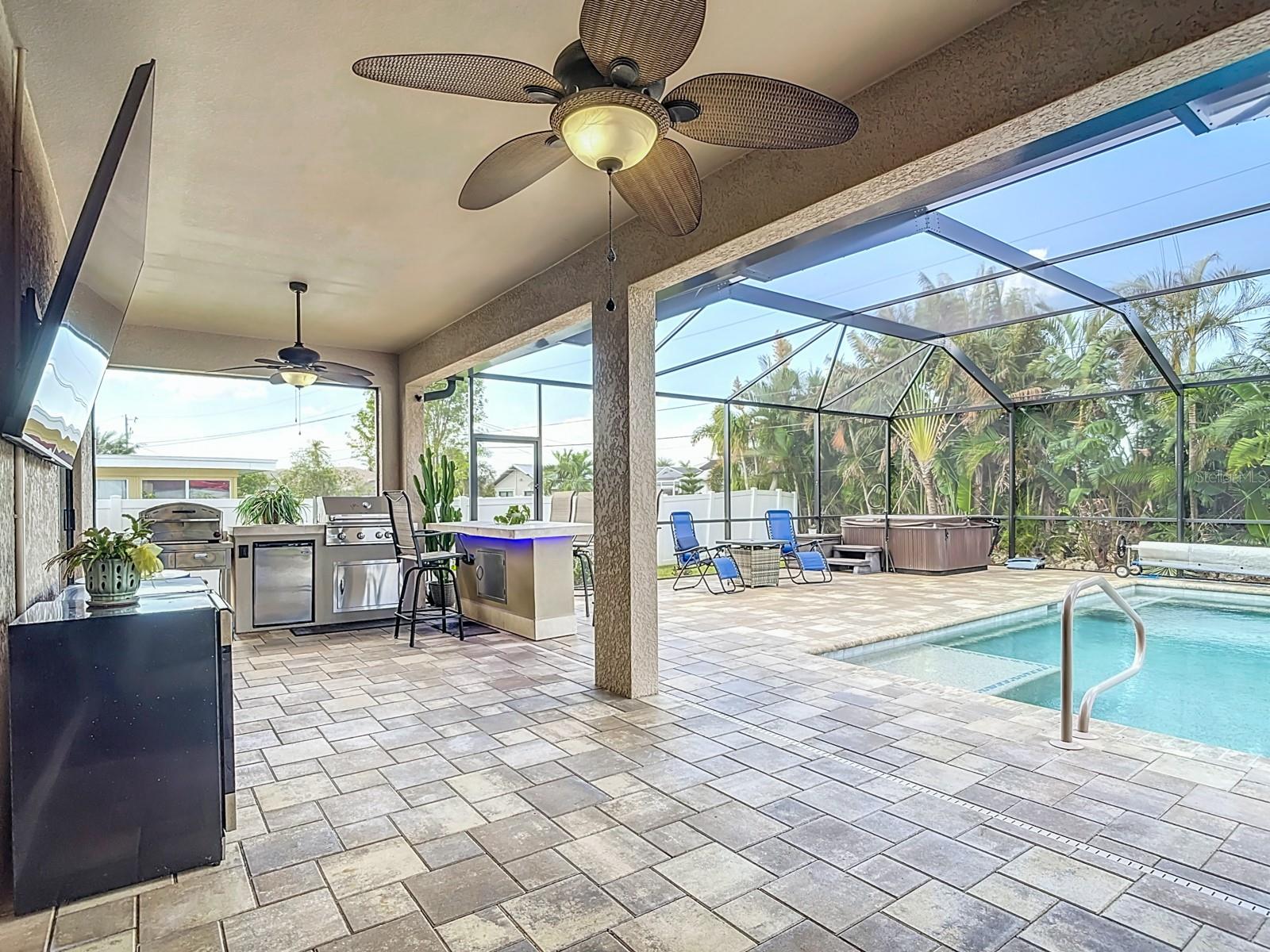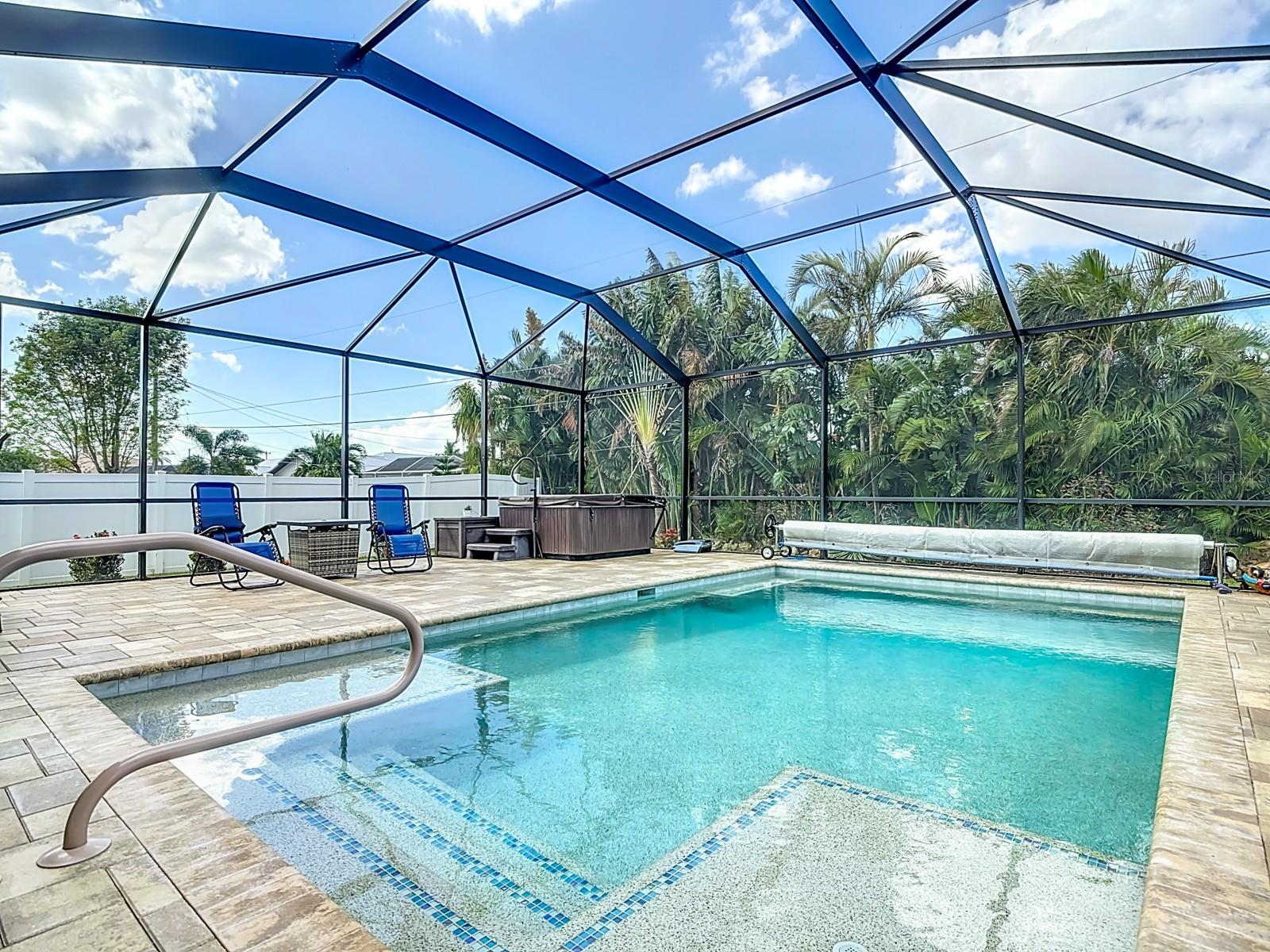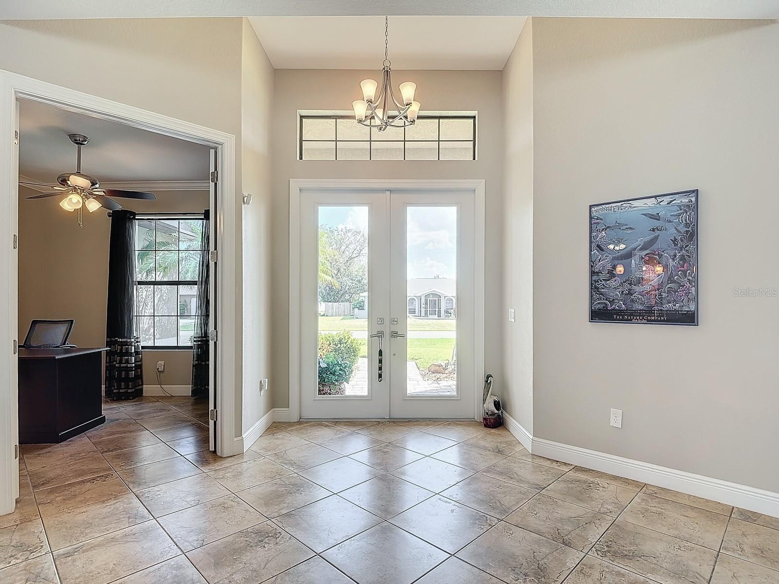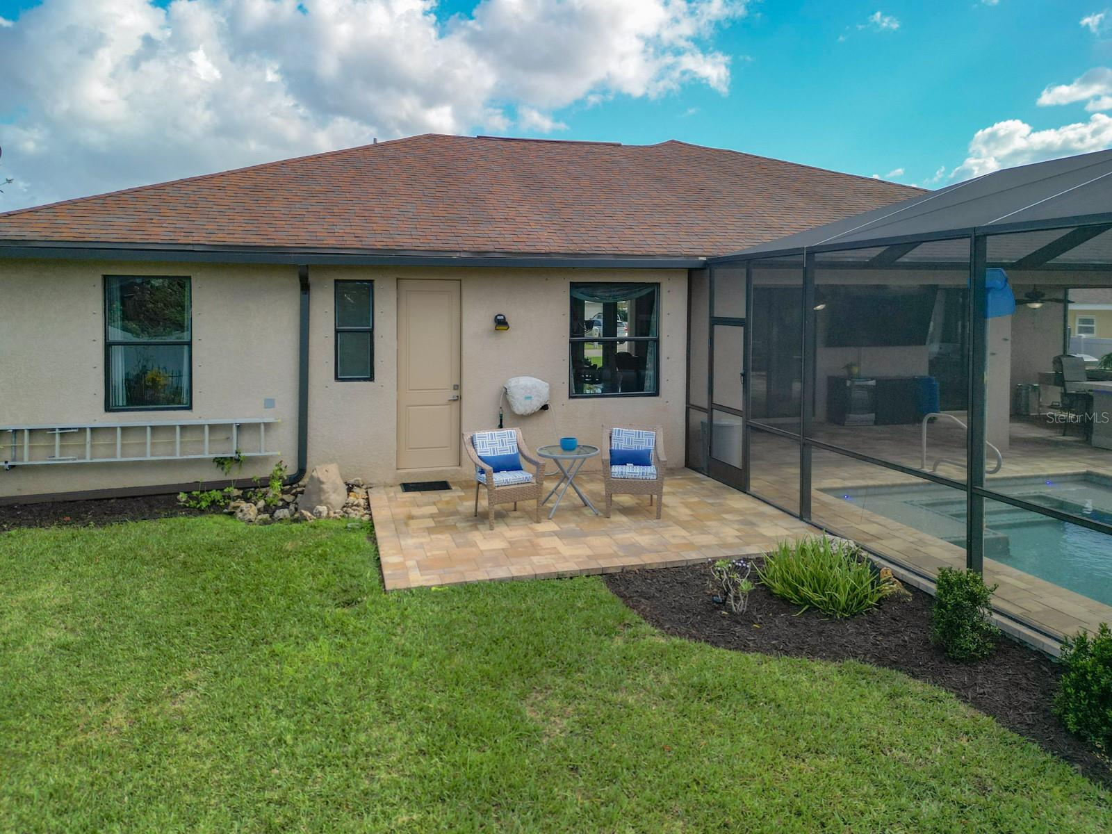 Welcome to this stunning modern home in Cape Coral, FL that comes with peace of mind - it has NEVER FLOODED! This three-bedroom, two- bathroom gem showcases a thoughtful split floor plan and includes a flexible den or office space, perfect for remote work or quiet study. Step into the open living area, where soaring high ceilings, elegant trayed detailing, and classic crown molding create a grand yet welcoming atmosphere. The kitchen is designed for both style and function, featuring expansive cabinets, a spacious island with seating, and a separate dining area ideal for family gatherings or entertaining friends. Triple and double sliding glass doors extend the indoor living space seamlessly to the outdoors, where a 24-by-14-foot pool awaits, nestled in private, lush landscaping. This outdoor oasis makes the patio a perfect place to host or unwind. The owner’s ensuite is a private retreat with luxurious trayed ceilings, dual sinks, a walk-in shower, and a roomy walk-in closet. The two additional bedrooms are cleverly designed with their own separate entrance, creating a private, two-bedroom in-law suite option. The oversized two-car garage, complete with fresh epoxy flooring, newer overhead storage, a workbench, and added electrical outlets, is built for convenience. It also has pull-down attic access, providing even more storage options. This home offers a rare blend of modern luxury, practical layout, and storm security, making it a standout choice in Cape Coral. SW Florida International Airport: 18.4 miles. Yacht Club Public Beach: 4.0 miles. Sun Splash Family Waterpark: 6.0 miles. Cultural Park Theatre: 5.0 miles