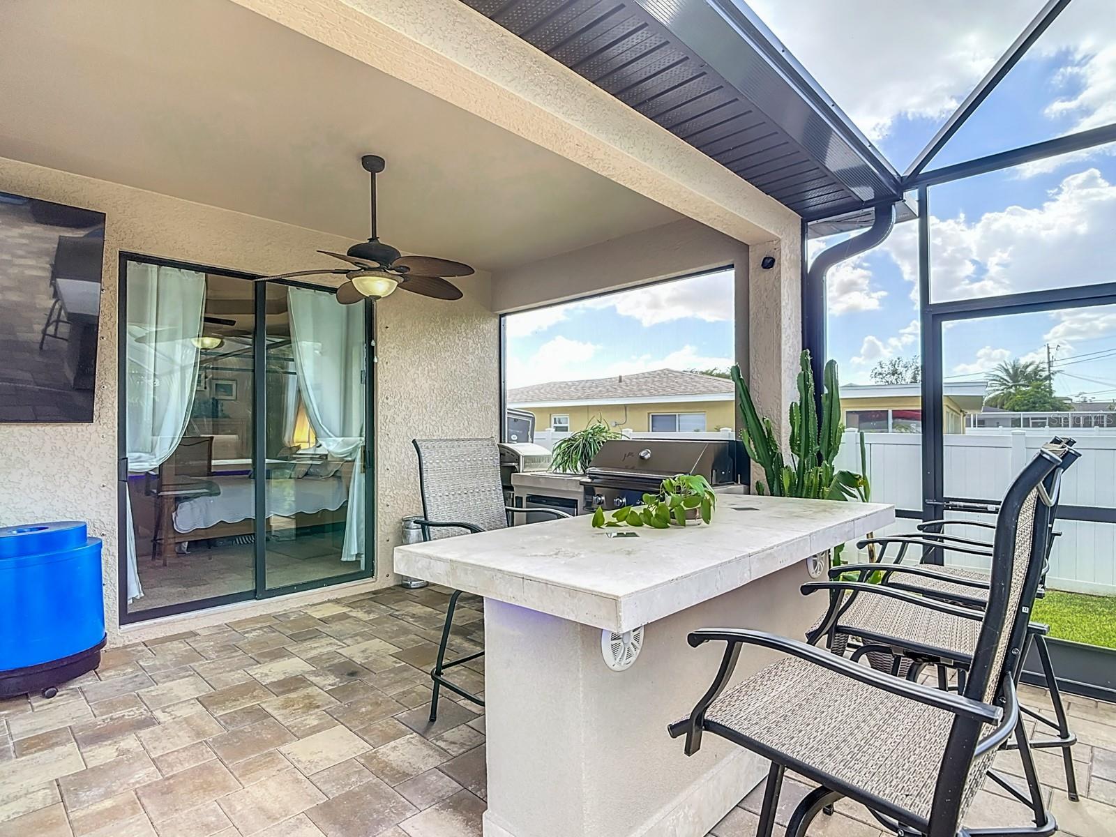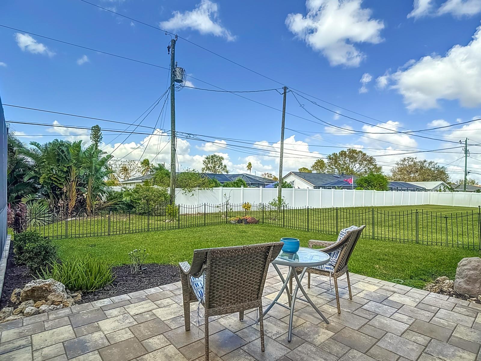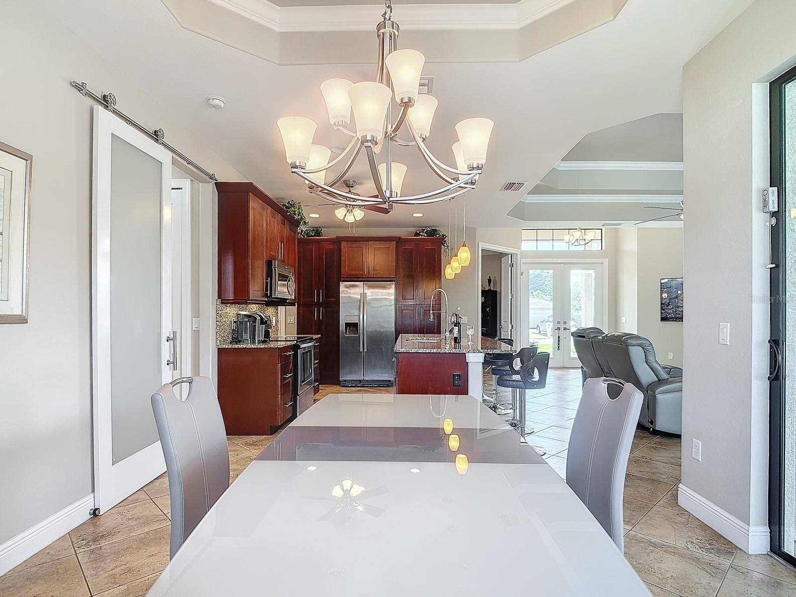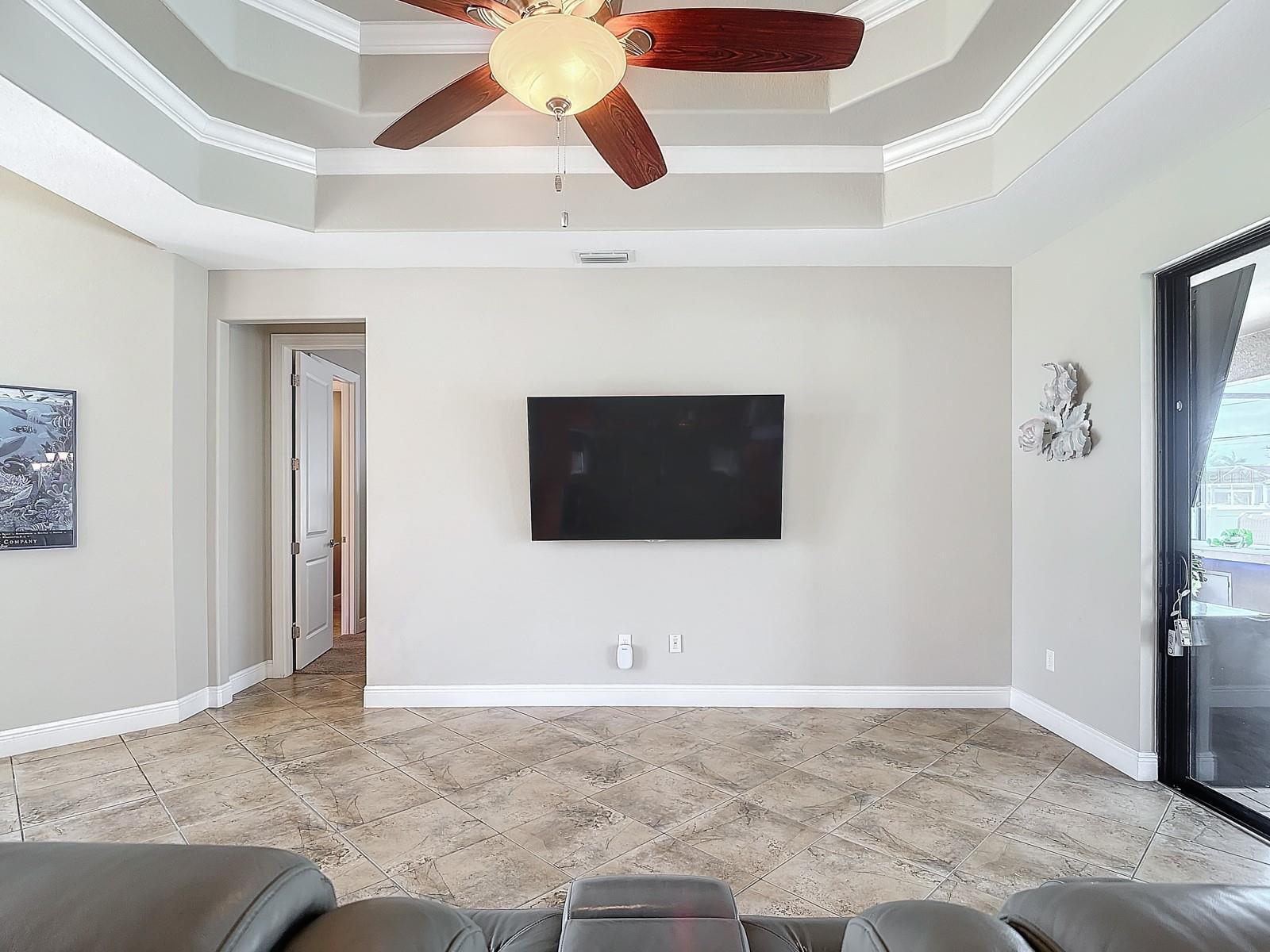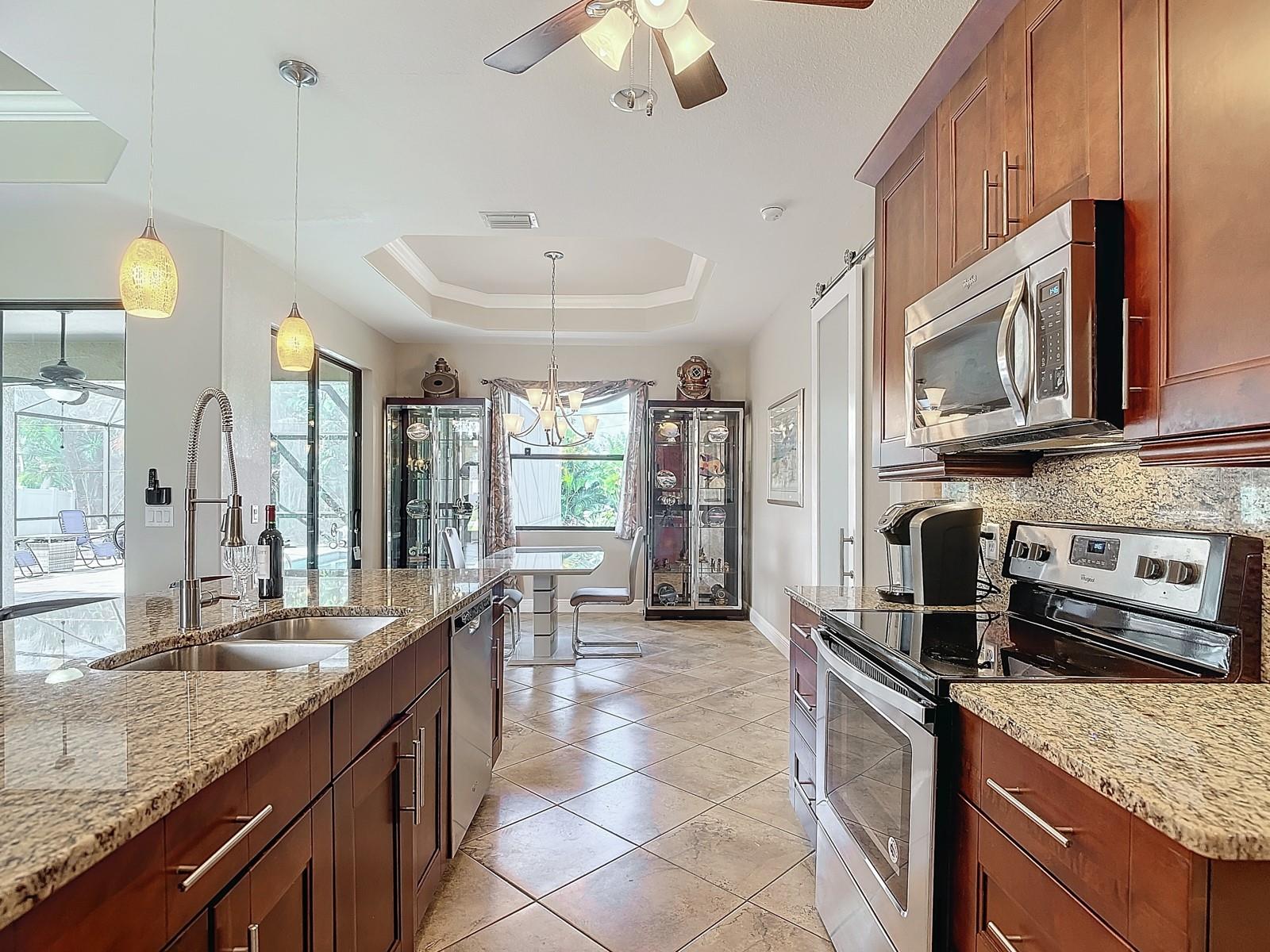 Welcome to this stunning modern home in Cape Coral, FL that comes with peace of mind - it has NEVER FLOODED! This three-bedroom, two- bathroom gem showcases a thoughtful split floor plan and includes a flexible den or office space, perfect for remote work or quiet study. Step into the open living area, where soaring high ceilings, elegant trayed detailing, and classic crown molding create a grand yet welcoming atmosphere. The kitchen is designed for both style and function, featuring expansive cabinets, a spacious island with seating, and a separate dining area ideal for family gatherings or entertaining friends. Triple and double sliding glass doors extend the indoor living space seamlessly to the outdoors, where a 24-by-14-foot pool awaits, nestled in private, lush landscaping. This outdoor oasis makes the patio a perfect place to host or unwind. The owner’s ensuite is a private retreat with luxurious trayed ceilings, dual sinks, a walk-in shower, and a roomy walk-in closet. The two additional bedrooms are cleverly designed with their own separate entrance, creating a private, two-bedroom in-law suite option. The oversized two-car garage, complete with fresh epoxy flooring, newer overhead storage, a workbench, and added electrical outlets, is built for convenience. It also has pull-down attic access, providing even more storage options. This home offers a rare blend of modern luxury, practical layout, and storm security, making it a standout choice in Cape Coral. SW Florida International Airport: 18.4 miles. Yacht Club Public Beach: 4.0 miles. Sun Splash Family Waterpark: 6.0 miles. Cultural Park Theatre: 5.0 miles
