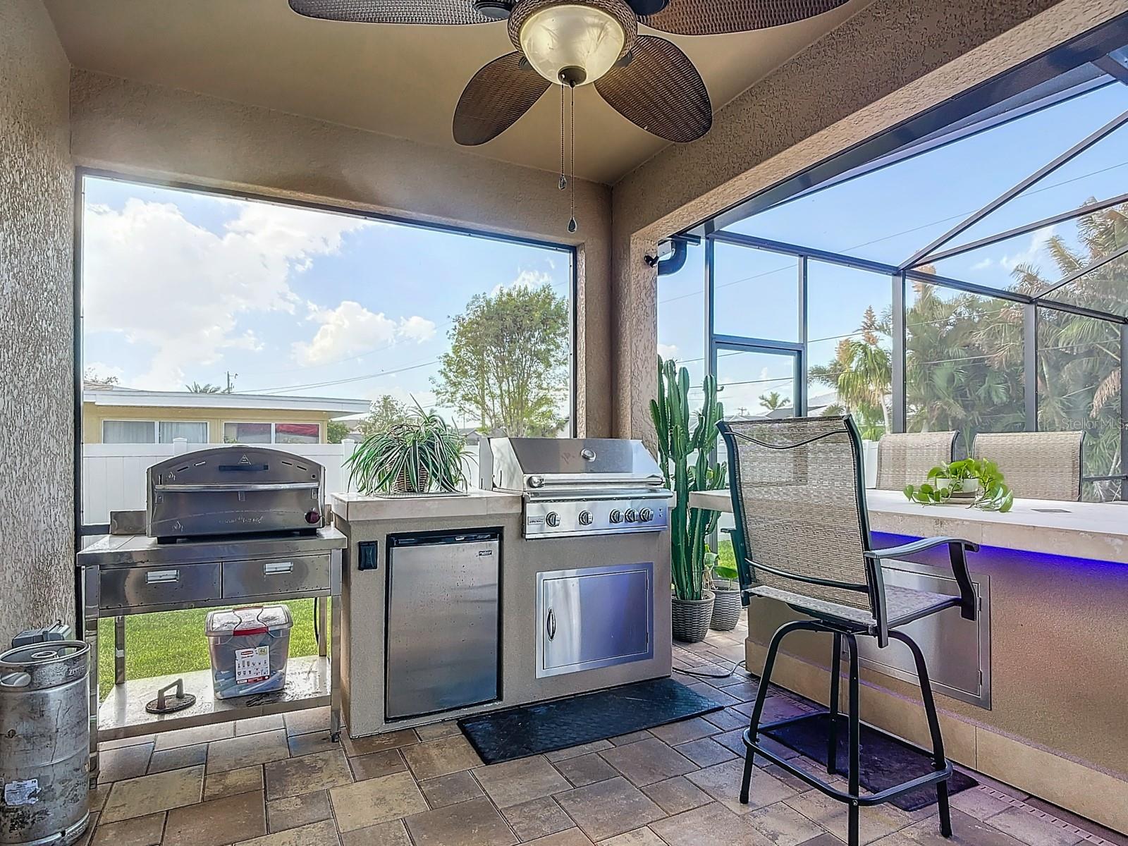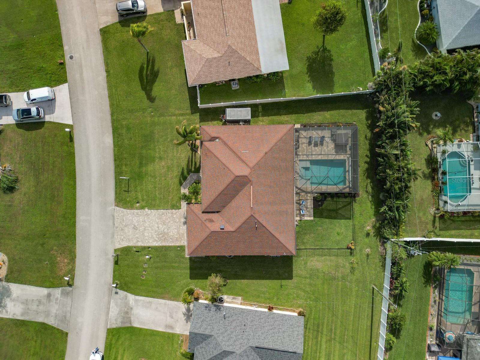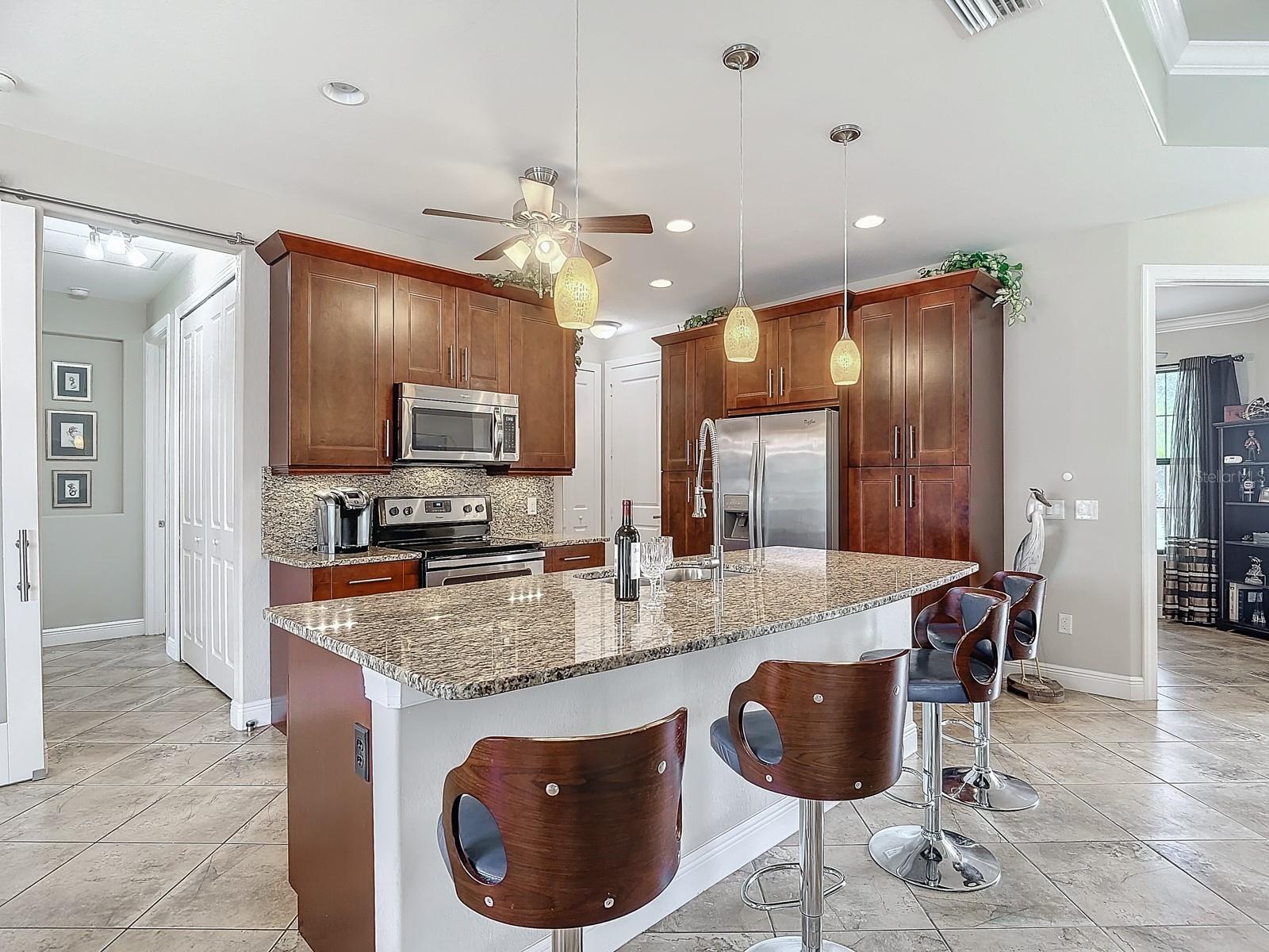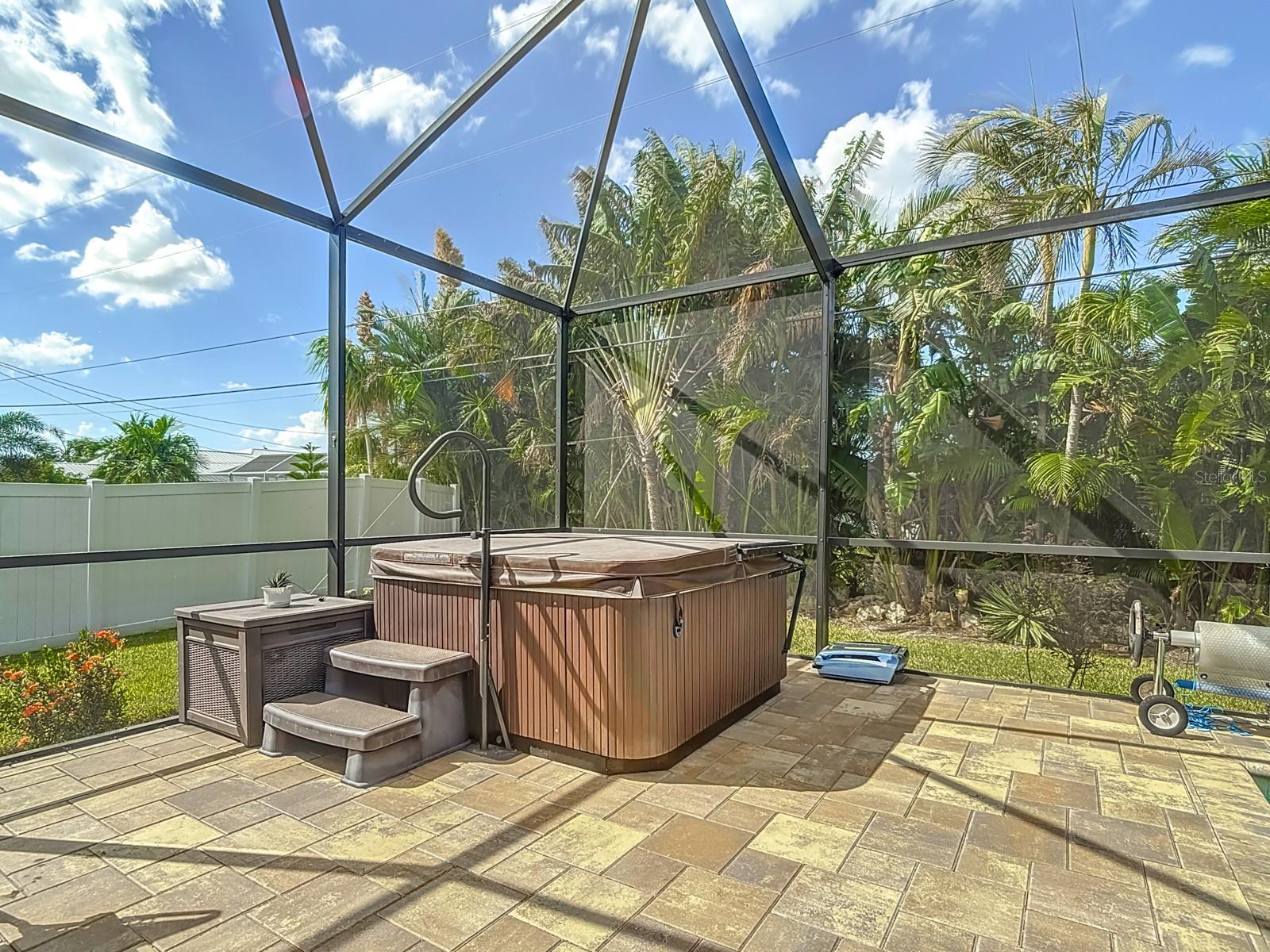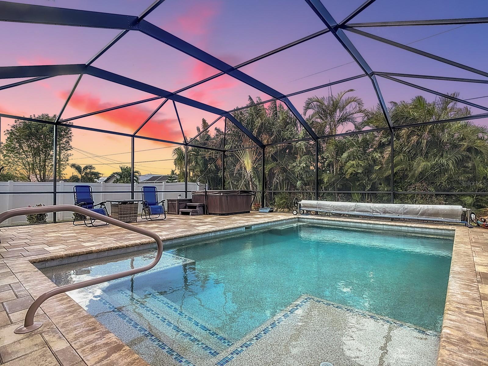Welcome to this stunning modern home in Cape Coral, FL that comes with peace of mind - it has NEVER FLOODED! This three-bedroom, two- bathroom gem showcases a thoughtful split floor plan and includes a flexible den or office space, perfect for remote work or quiet study. Step into the open living area, where soaring high ceilings, elegant trayed detailing, and classic crown molding create a grand yet welcoming atmosphere. The kitchen is designed for both style and function, featuring expansive cabinets, a spacious island with seating, and a separate dining area ideal for family gatherings or entertaining friends. Triple and double sliding glass doors extend the indoor living space seamlessly to the outdoors, where a 24-by-14-foot pool awaits, nestled in private, lush landscaping. This outdoor oasis makes the patio a perfect place to host or unwind. The owner’s ensuite is a private retreat with luxurious trayed ceilings, dual sinks, a walk-in shower, and a roomy walk-in closet. The two additional bedrooms are cleverly designed with their own separate entrance, creating a private, two-bedroom in-law suite option. The oversized two-car garage, complete with fresh epoxy flooring, newer overhead storage, a workbench, and added electrical outlets, is built for convenience. It also has pull-down attic access, providing even more storage options. This home offers a rare blend of modern luxury, practical layout, and storm security, making it a standout choice in Cape Coral. SW Florida International Airport: 18.4 miles. Yacht Club Public Beach: 4.0 miles. Sun Splash Family Waterpark: 6.0 miles. Cultural Park Theatre: 5.0 miles