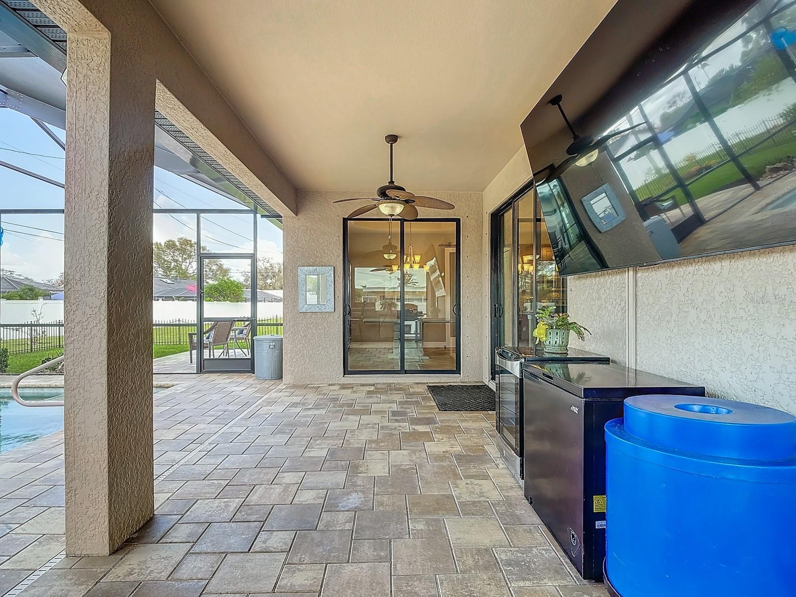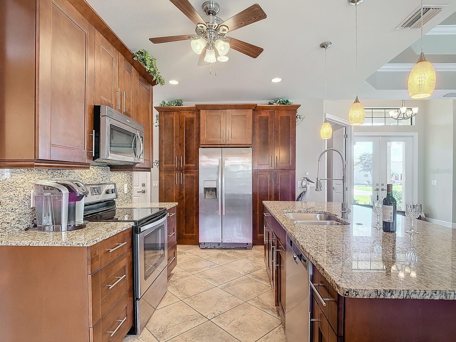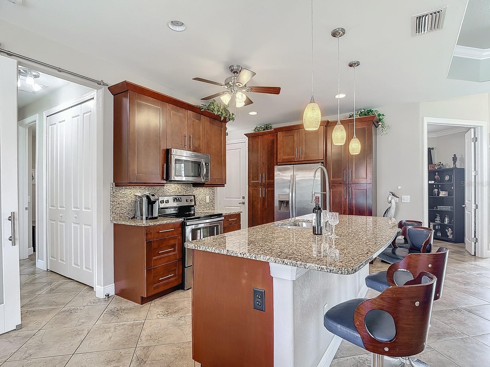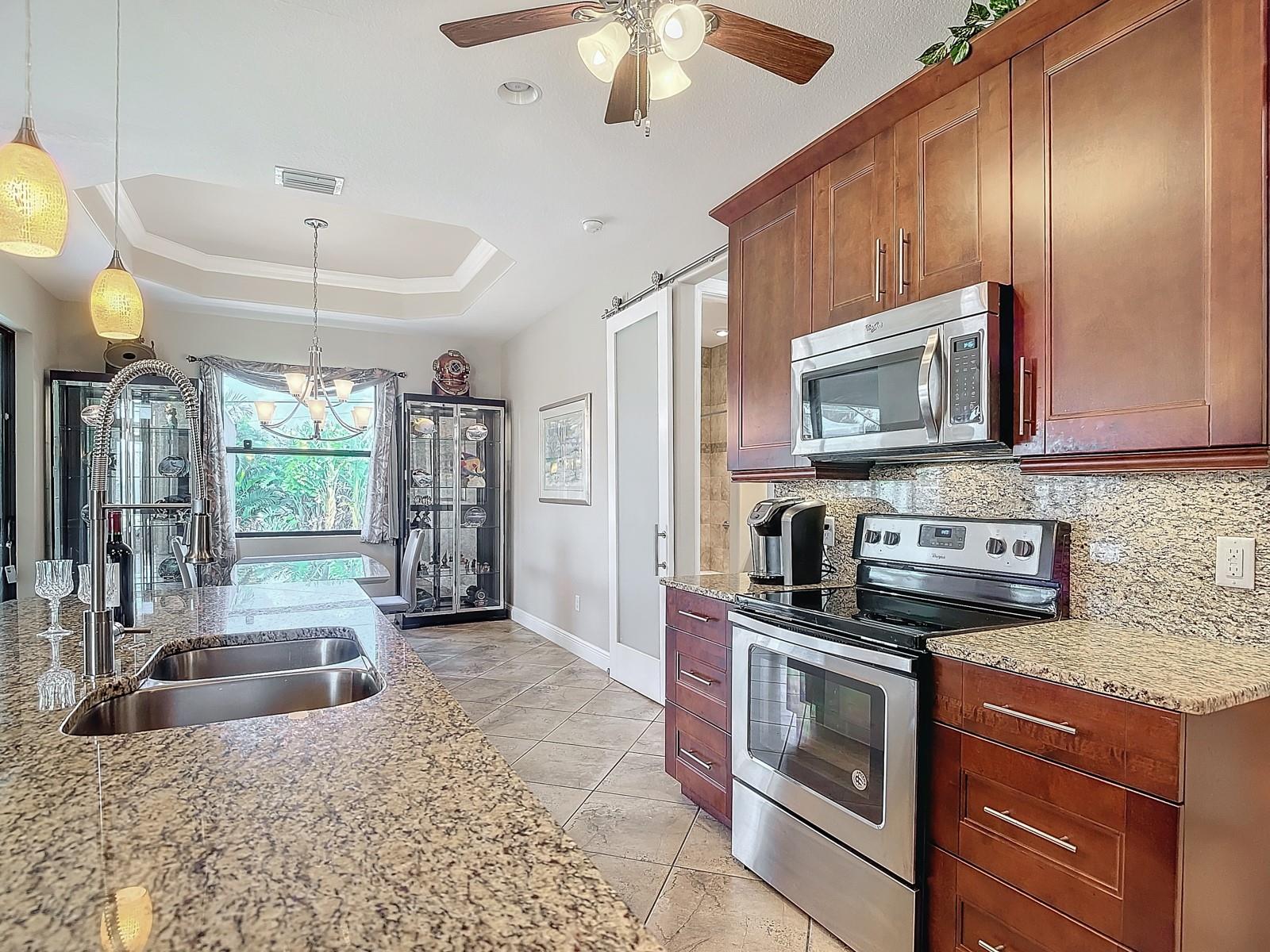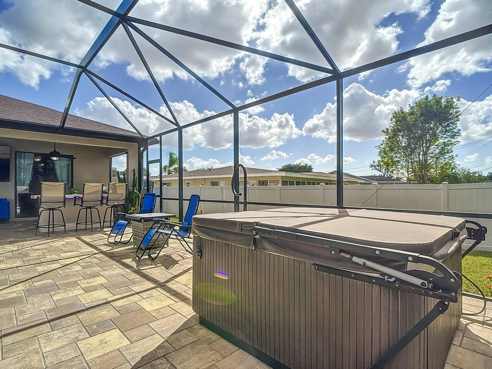 Welcome to this stunning modern home in Cape Coral, FL that comes with peace of mind - it has NEVER FLOODED! This three-bedroom, two- bathroom gem showcases a thoughtful split floor plan and includes a flexible den or office space, perfect for remote work or quiet study. Step into the open living area, where soaring high ceilings, elegant trayed detailing, and classic crown molding create a grand yet welcoming atmosphere. The kitchen is designed for both style and function, featuring expansive cabinets, a spacious island with seating, and a separate dining area ideal for family gatherings or entertaining friends. Triple and double sliding glass doors extend the indoor living space seamlessly to the outdoors, where a 24-by-14-foot pool awaits, nestled in private, lush landscaping. This outdoor oasis makes the patio a perfect place to host or unwind. The owner’s ensuite is a private retreat with luxurious trayed ceilings, dual sinks, a walk-in shower, and a roomy walk-in closet. The two additional bedrooms are cleverly designed with their own separate entrance, creating a private, two-bedroom in-law suite option. The oversized two-car garage, complete with fresh epoxy flooring, newer overhead storage, a workbench, and added electrical outlets, is built for convenience. It also has pull-down attic access, providing even more storage options. This home offers a rare blend of modern luxury, practical layout, and storm security, making it a standout choice in Cape Coral. SW Florida International Airport: 18.4 miles. Yacht Club Public Beach: 4.0 miles. Sun Splash Family Waterpark: 6.0 miles. Cultural Park Theatre: 5.0 miles