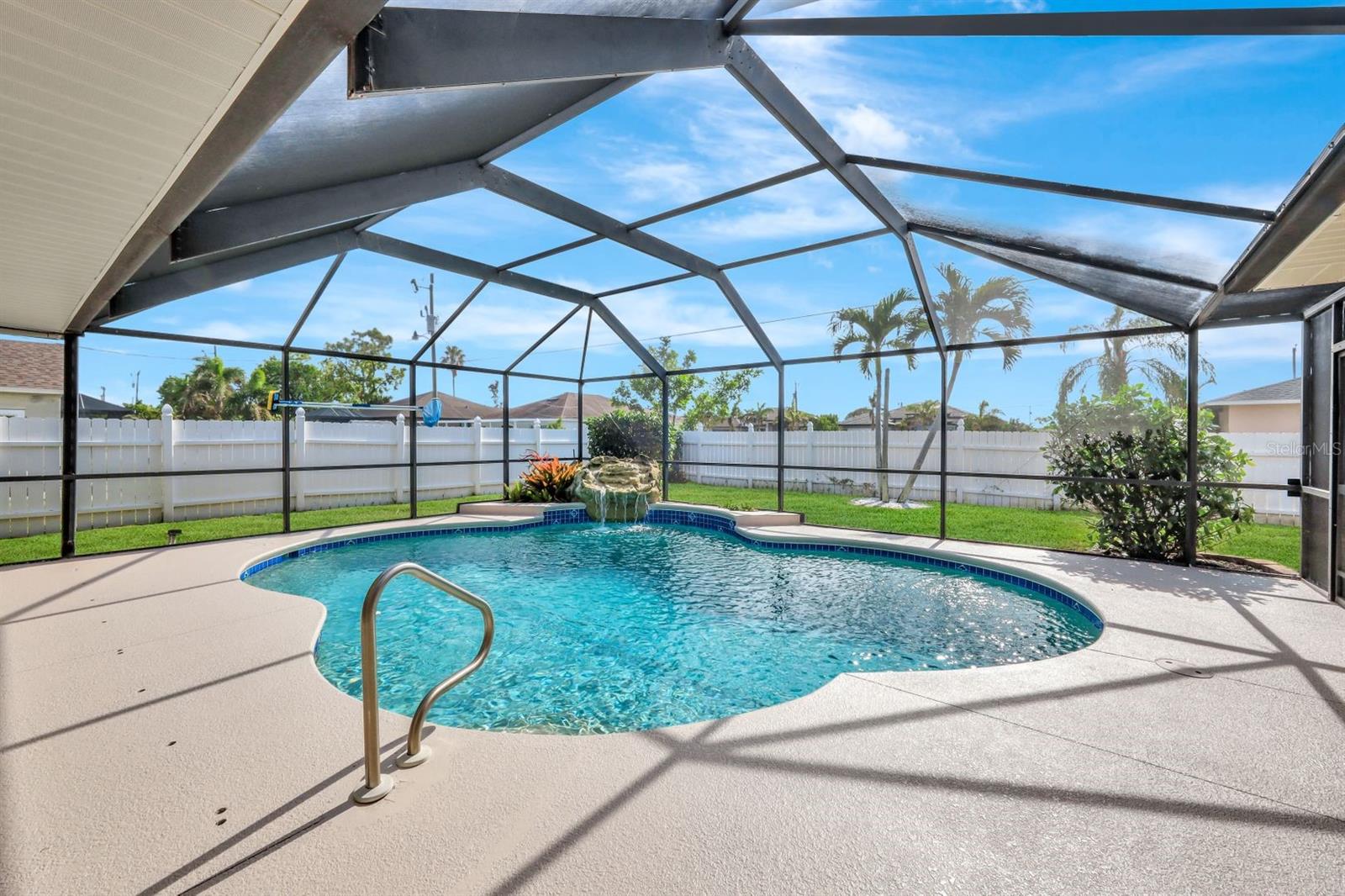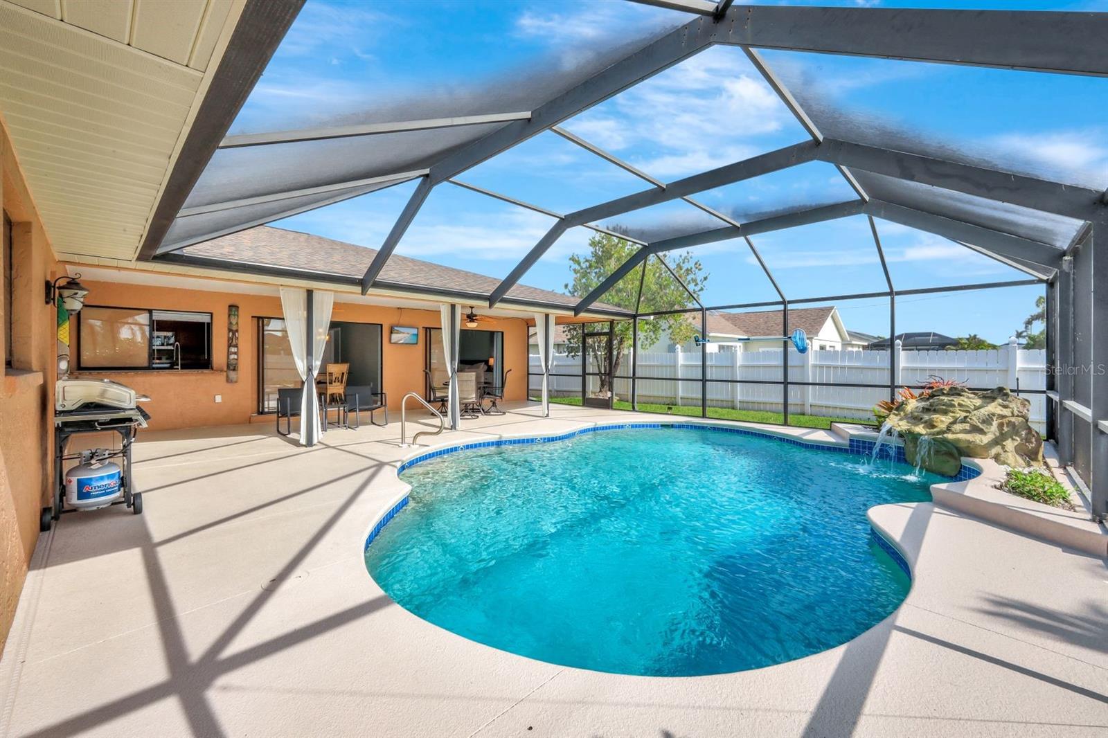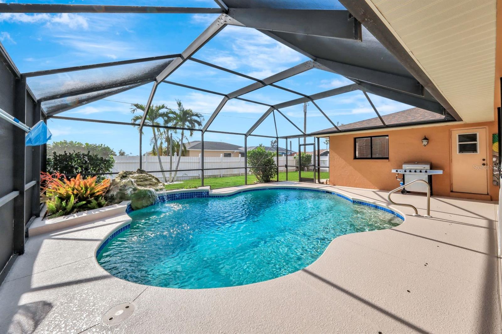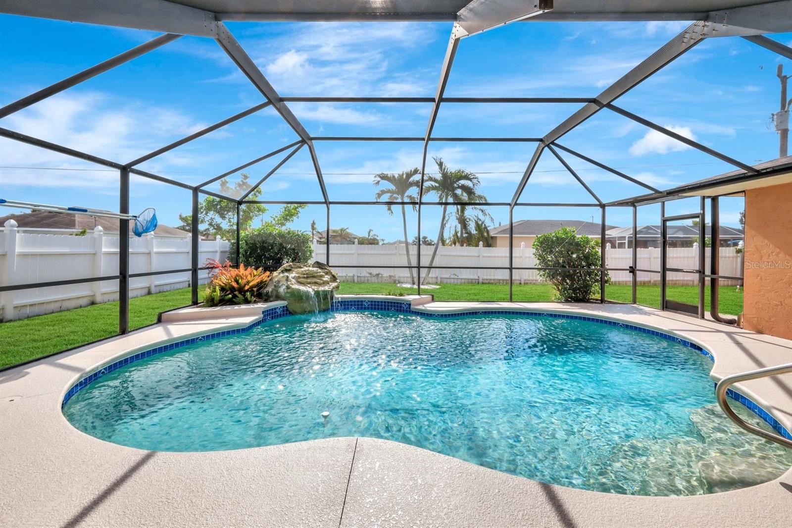 This stunning Southern Exposure pool home offers beautiful landscaping with recessed spotlights, decorative stamped curbing, marble chip rocks, and an irrigation system installed in 2022. The charming screened-in entryway welcomes you into a home featuring diagonal-stacked tile flooring with sleek transition strips and luxury vinyl plank in key areas, as well as fresh interior paint throughout. The kitchen boasts granite countertops, a stacked-stone backsplash with decorative inlay, a window overlooking the pool, wood cabinetry, recessed lighting, and a 2024 stainless steel appliance package. Vaulted ceilings with backlit crown molding enhance the living room, while the spacious laundry room includes a laundry sink for added convenience. The primary bedroom offers private pocket sliding doors leading to the pool area, a huge walk-in closet, and an en-suite bath with granite countertops and a floor-to-ceiling tiled shower. The outdoor space features a screened-in pool with a waterfall, freshly painted lanai flooring, and an outdoor bar area perfect for entertaining, all enclosed by a 6-foot privacy fence. Additional highlights include a new roof installed in 2022, a new HVAC system in 2023, updated electrical and water heater in 2023, a pool bath, and guest bedrooms with walk-in closets. This home is a perfect blend of style, comfort, and functionality, offering everything you need to enjoy the Southwest Florida lifestyle. Schedule your private showing today!