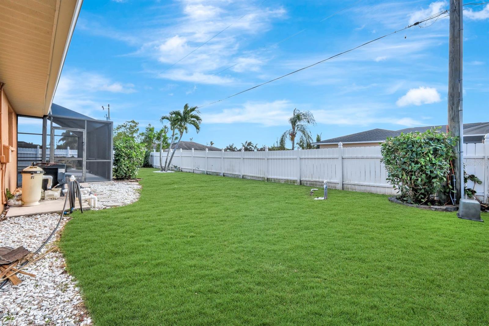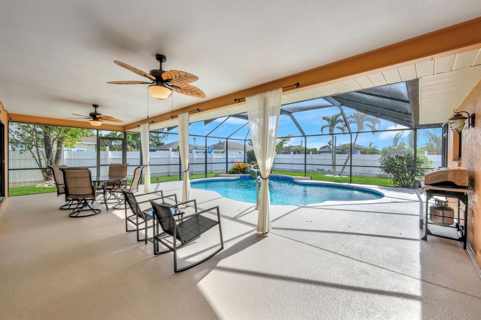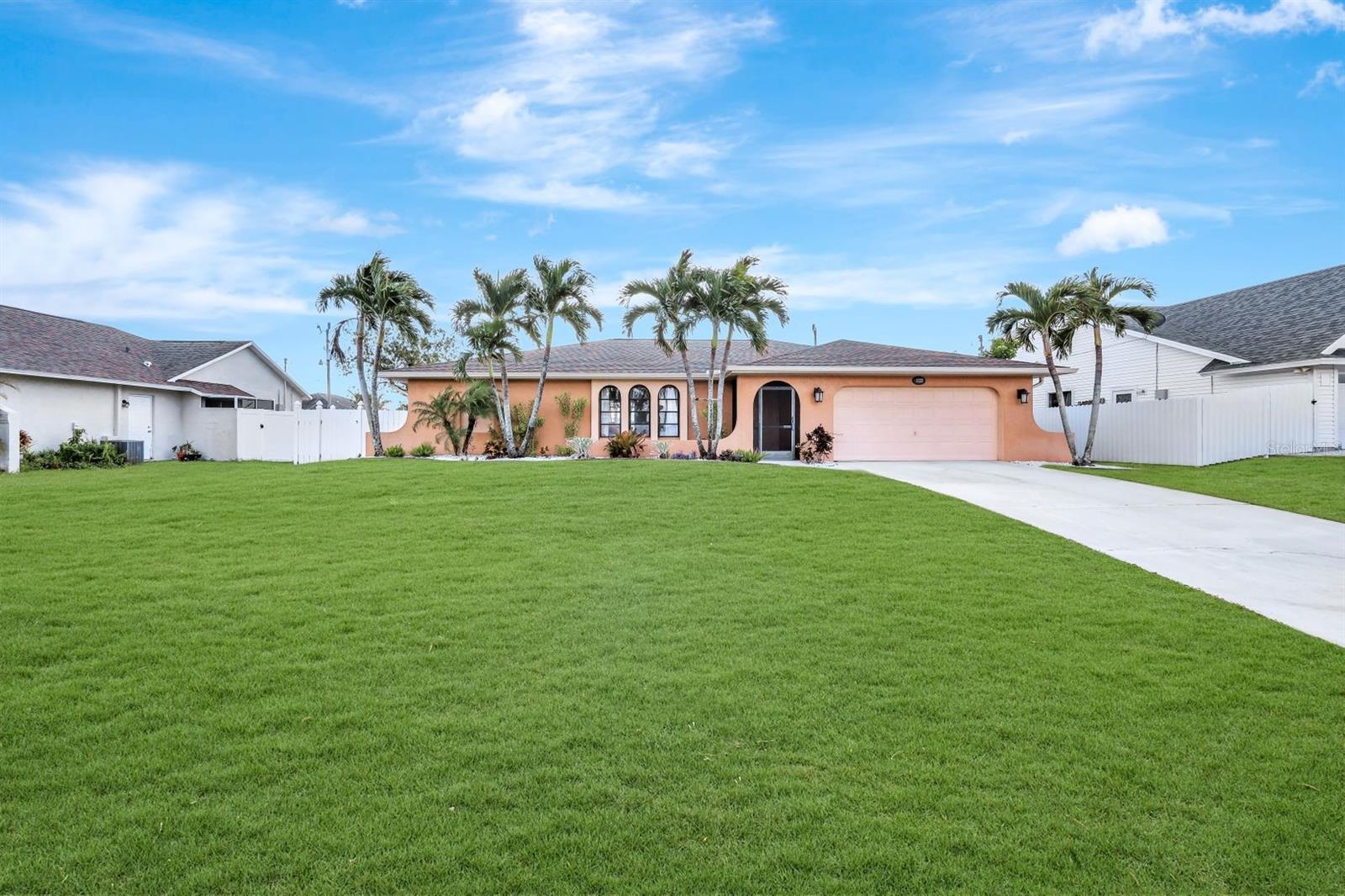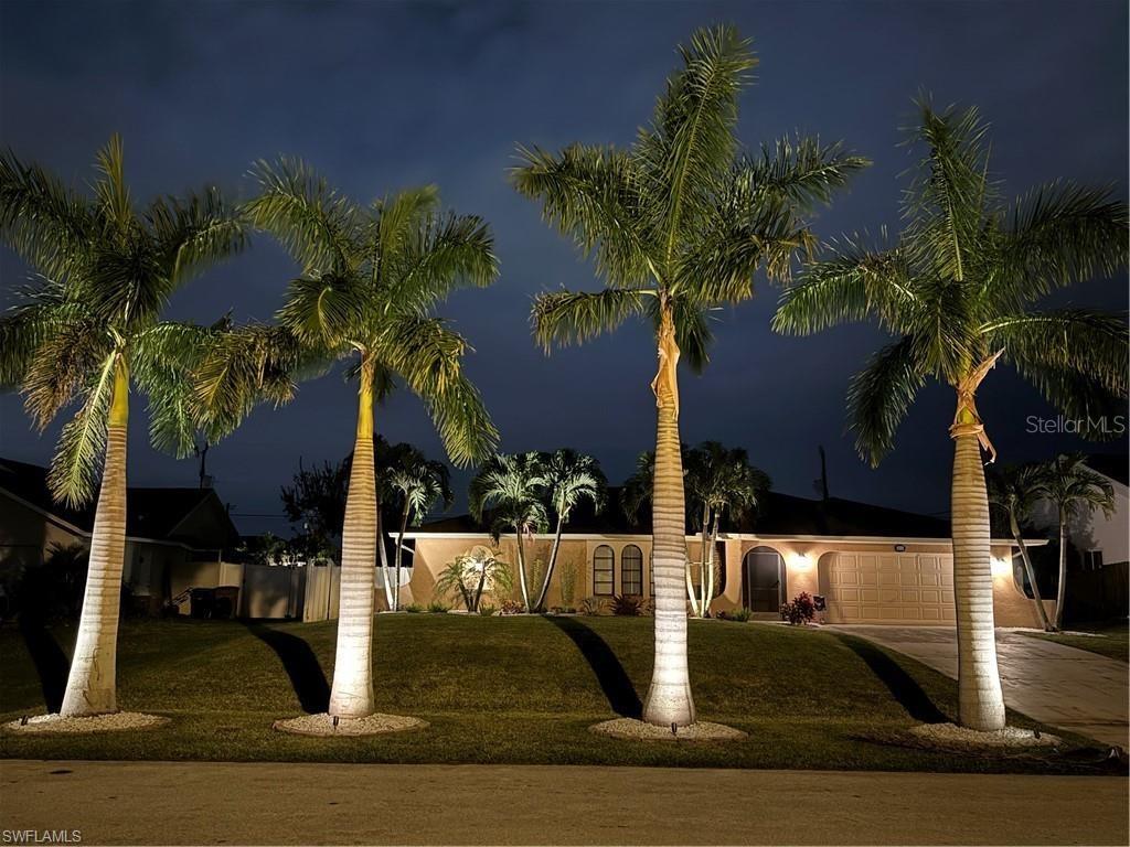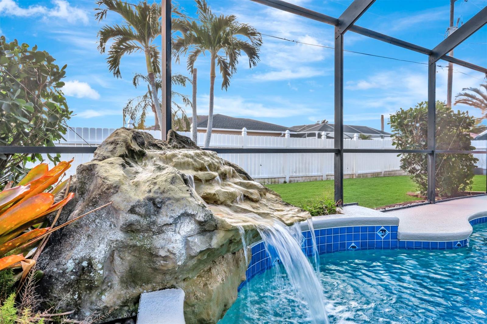 This stunning Southern Exposure pool home offers beautiful landscaping with recessed spotlights, decorative stamped curbing, marble chip rocks, and an irrigation system installed in 2022. The charming screened-in entryway welcomes you into a home featuring diagonal-stacked tile flooring with sleek transition strips and luxury vinyl plank in key areas, as well as fresh interior paint throughout. The kitchen boasts granite countertops, a stacked-stone backsplash with decorative inlay, a window overlooking the pool, wood cabinetry, recessed lighting, and a 2024 stainless steel appliance package. Vaulted ceilings with backlit crown molding enhance the living room, while the spacious laundry room includes a laundry sink for added convenience. The primary bedroom offers private pocket sliding doors leading to the pool area, a huge walk-in closet, and an en-suite bath with granite countertops and a floor-to-ceiling tiled shower. The outdoor space features a screened-in pool with a waterfall, freshly painted lanai flooring, and an outdoor bar area perfect for entertaining, all enclosed by a 6-foot privacy fence. Additional highlights include a new roof installed in 2022, a new HVAC system in 2023, updated electrical and water heater in 2023, a pool bath, and guest bedrooms with walk-in closets. This home is a perfect blend of style, comfort, and functionality, offering everything you need to enjoy the Southwest Florida lifestyle. Schedule your private showing today!