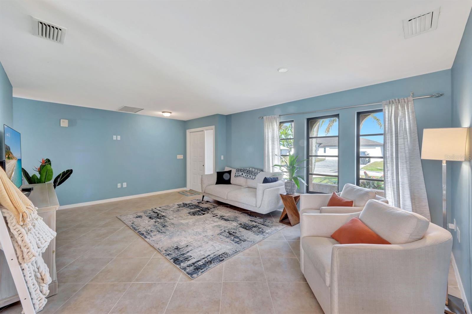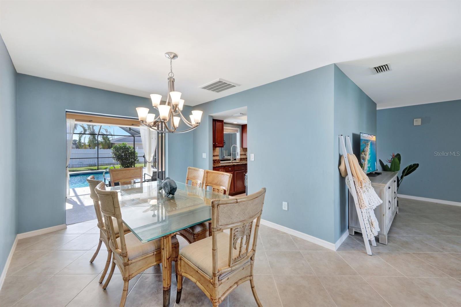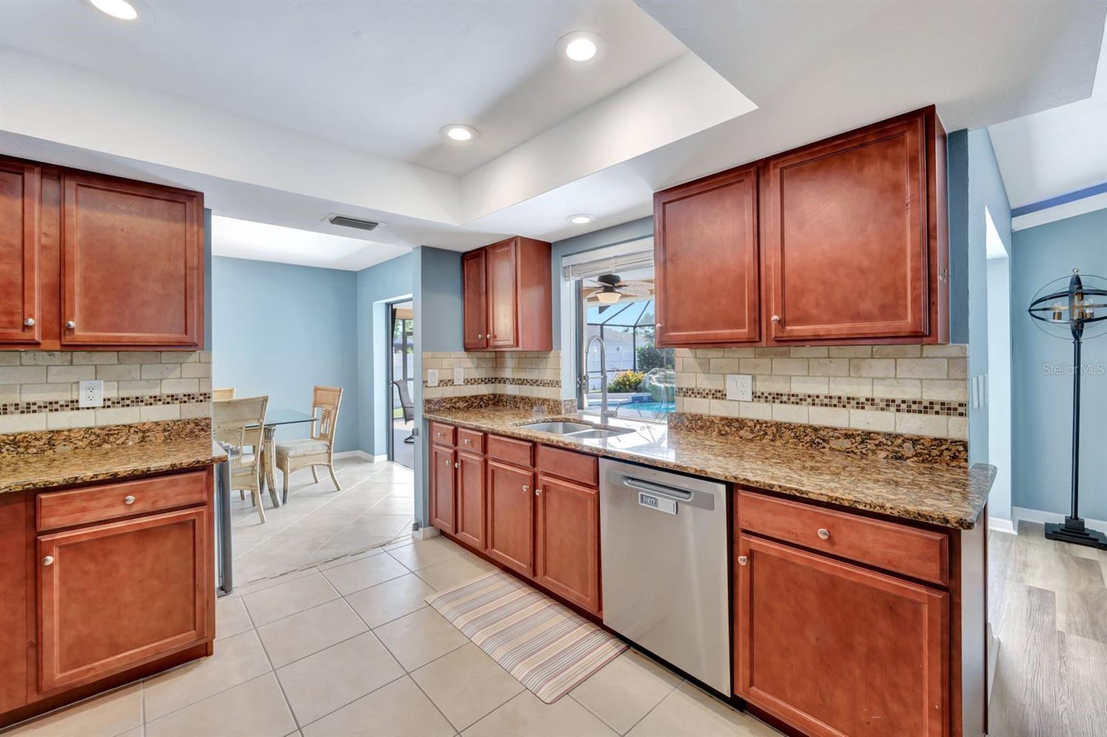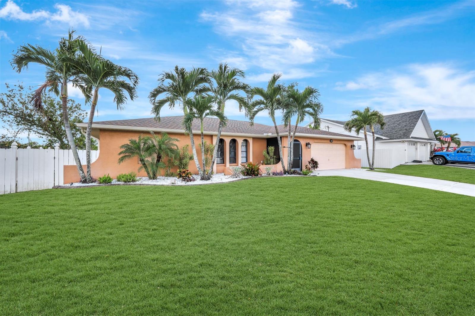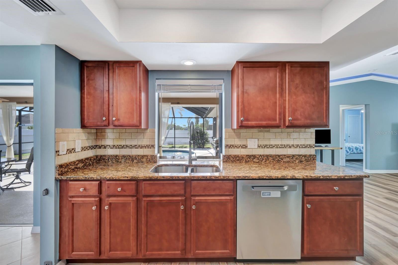 This stunning Southern Exposure pool home offers beautiful landscaping with recessed spotlights, decorative stamped curbing, marble chip rocks, and an irrigation system installed in 2022. The charming screened-in entryway welcomes you into a home featuring diagonal-stacked tile flooring with sleek transition strips and luxury vinyl plank in key areas, as well as fresh interior paint throughout. The kitchen boasts granite countertops, a stacked-stone backsplash with decorative inlay, a window overlooking the pool, wood cabinetry, recessed lighting, and a 2024 stainless steel appliance package. Vaulted ceilings with backlit crown molding enhance the living room, while the spacious laundry room includes a laundry sink for added convenience. The primary bedroom offers private pocket sliding doors leading to the pool area, a huge walk-in closet, and an en-suite bath with granite countertops and a floor-to-ceiling tiled shower. The outdoor space features a screened-in pool with a waterfall, freshly painted lanai flooring, and an outdoor bar area perfect for entertaining, all enclosed by a 6-foot privacy fence. Additional highlights include a new roof installed in 2022, a new HVAC system in 2023, updated electrical and water heater in 2023, a pool bath, and guest bedrooms with walk-in closets. This home is a perfect blend of style, comfort, and functionality, offering everything you need to enjoy the Southwest Florida lifestyle. Schedule your private showing today!