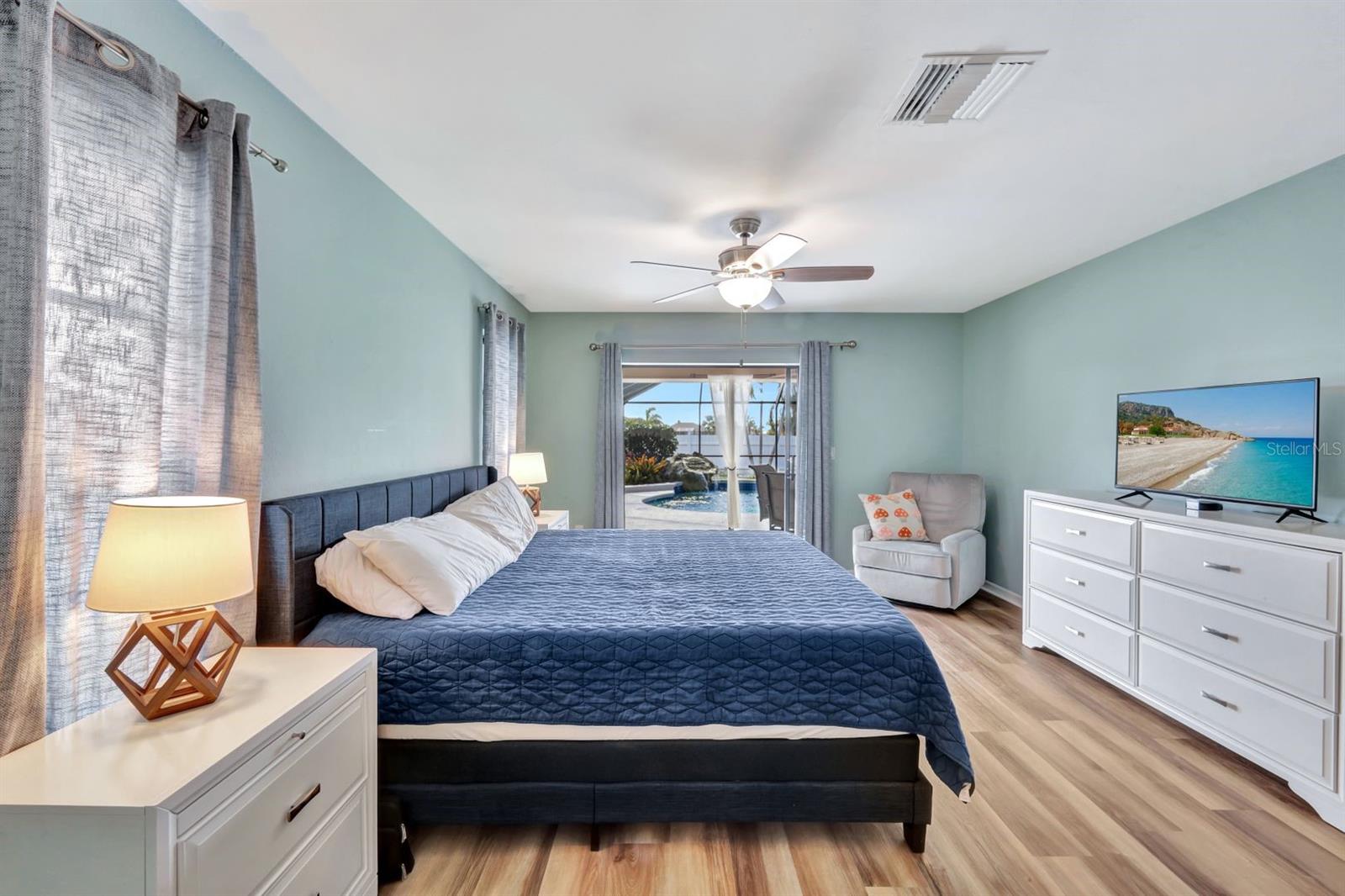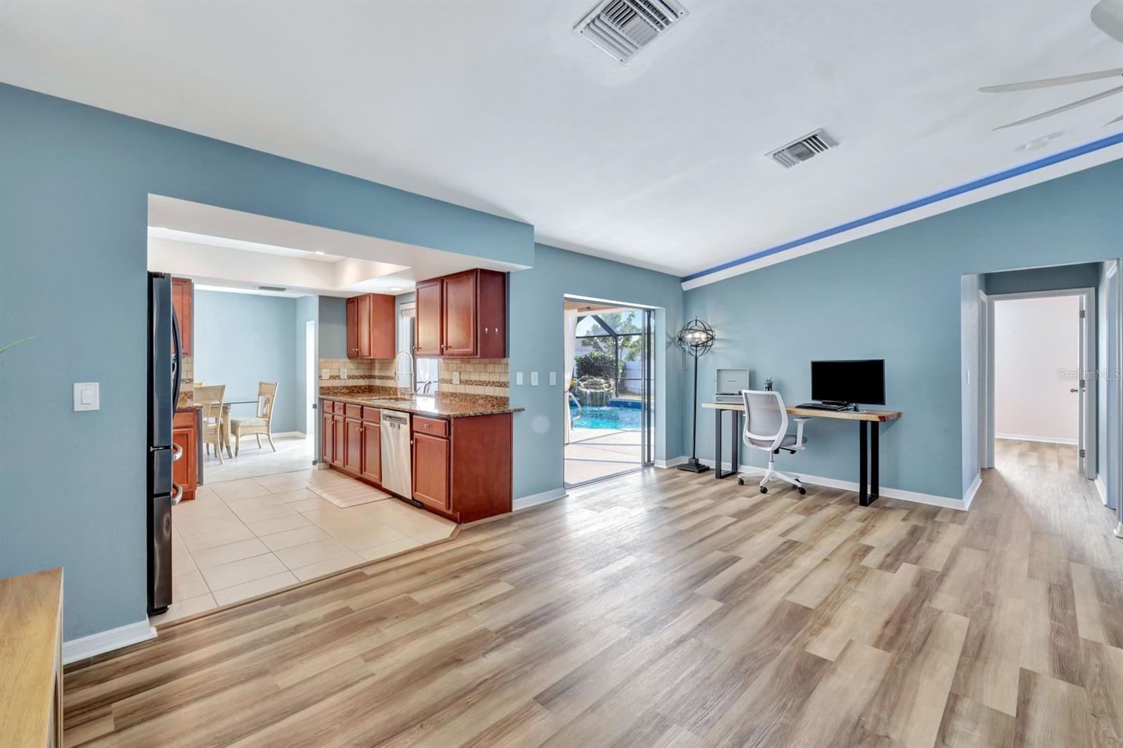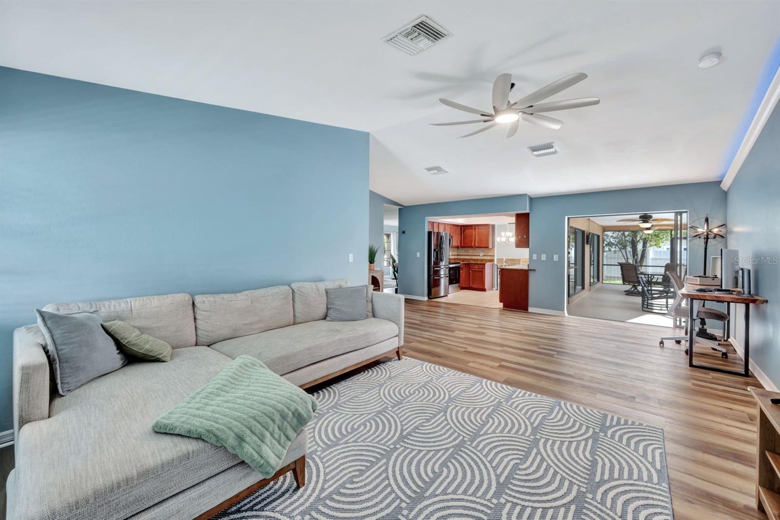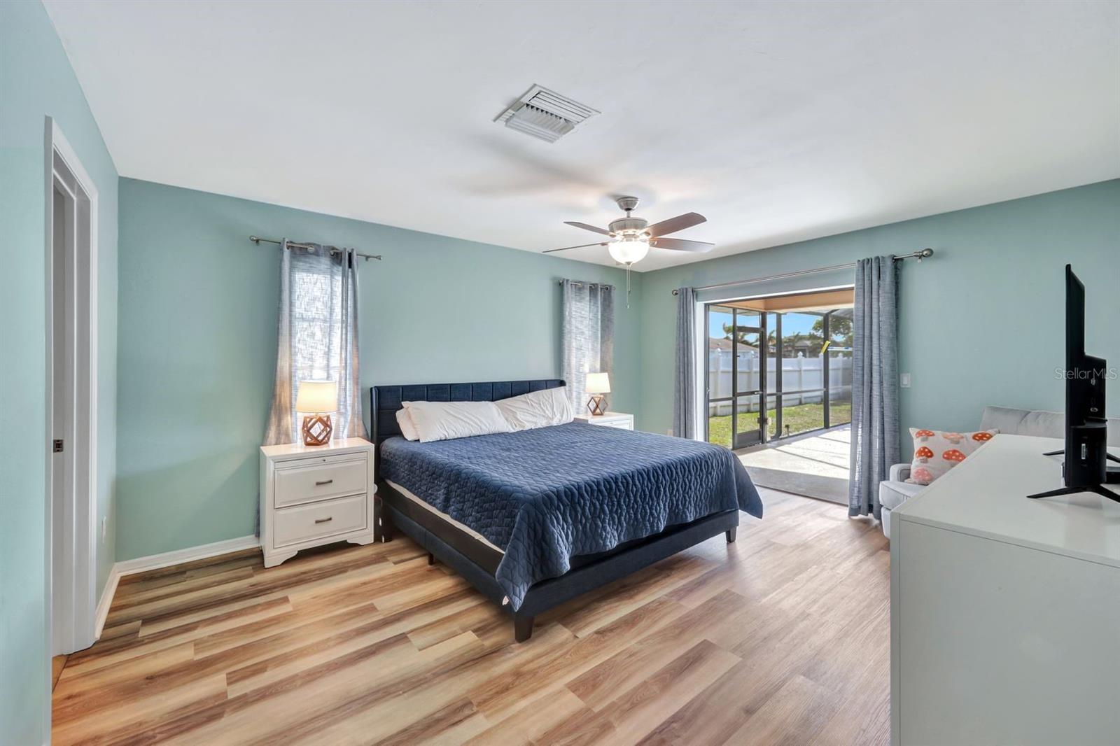 This stunning Southern Exposure pool home offers beautiful landscaping with recessed spotlights, decorative stamped curbing, marble chip rocks, and an irrigation system installed in 2022. The charming screened-in entryway welcomes you into a home featuring diagonal-stacked tile flooring with sleek transition strips and luxury vinyl plank in key areas, as well as fresh interior paint throughout. The kitchen boasts granite countertops, a stacked-stone backsplash with decorative inlay, a window overlooking the pool, wood cabinetry, recessed lighting, and a 2024 stainless steel appliance package. Vaulted ceilings with backlit crown molding enhance the living room, while the spacious laundry room includes a laundry sink for added convenience. The primary bedroom offers private pocket sliding doors leading to the pool area, a huge walk-in closet, and an en-suite bath with granite countertops and a floor-to-ceiling tiled shower. The outdoor space features a screened-in pool with a waterfall, freshly painted lanai flooring, and an outdoor bar area perfect for entertaining, all enclosed by a 6-foot privacy fence. Additional highlights include a new roof installed in 2022, a new HVAC system in 2023, updated electrical and water heater in 2023, a pool bath, and guest bedrooms with walk-in closets. This home is a perfect blend of style, comfort, and functionality, offering everything you need to enjoy the Southwest Florida lifestyle. Schedule your private showing today!