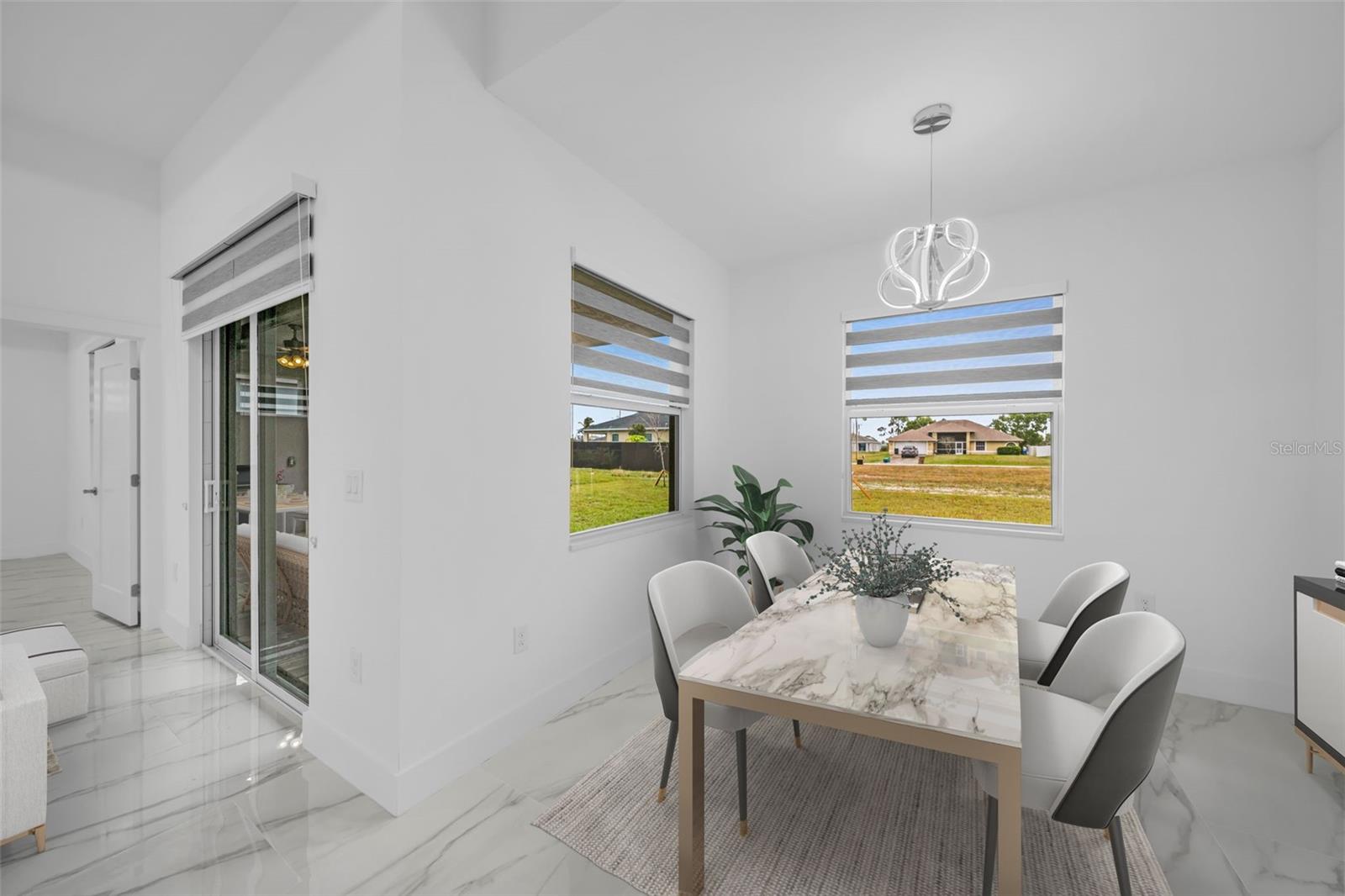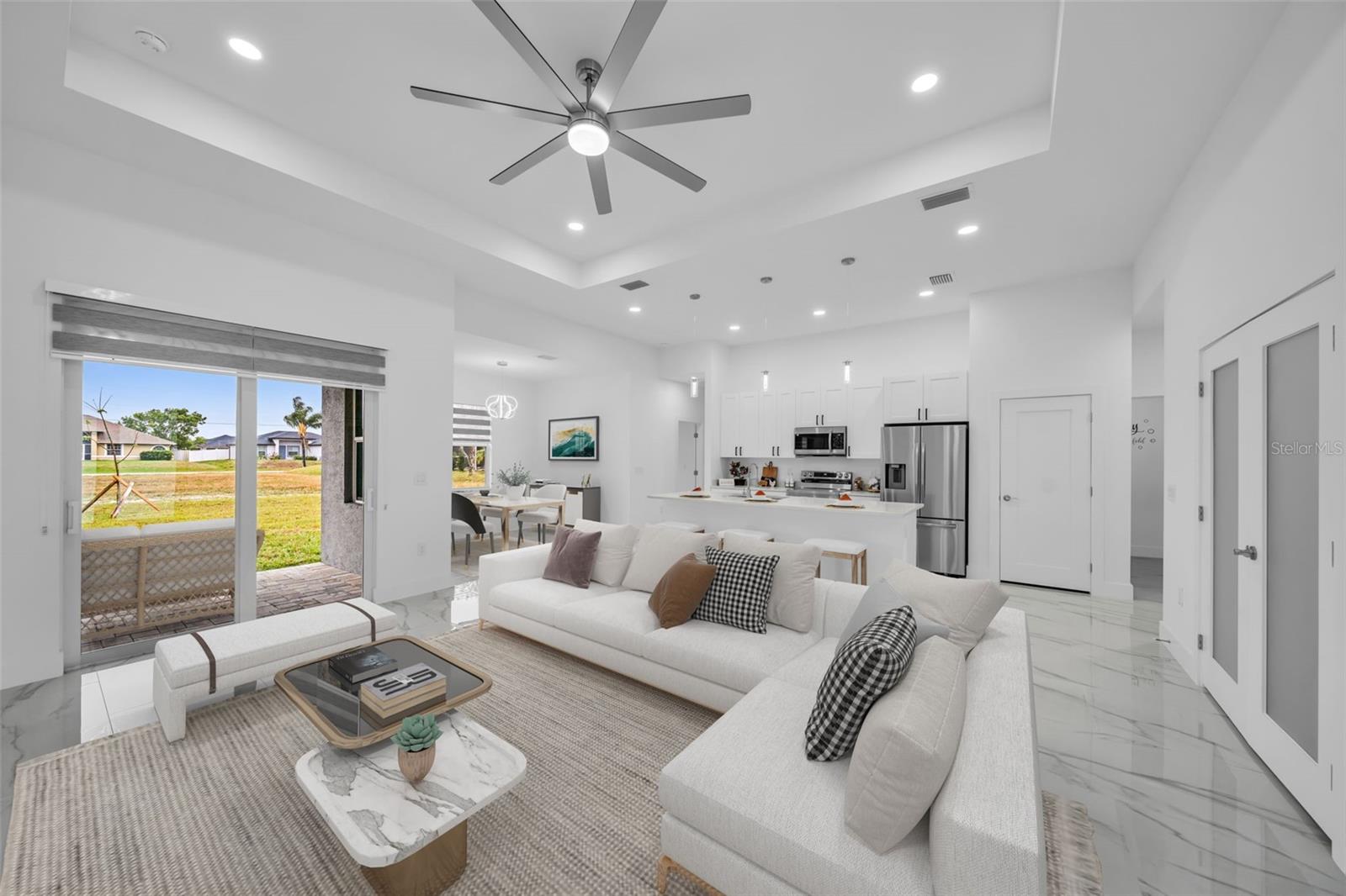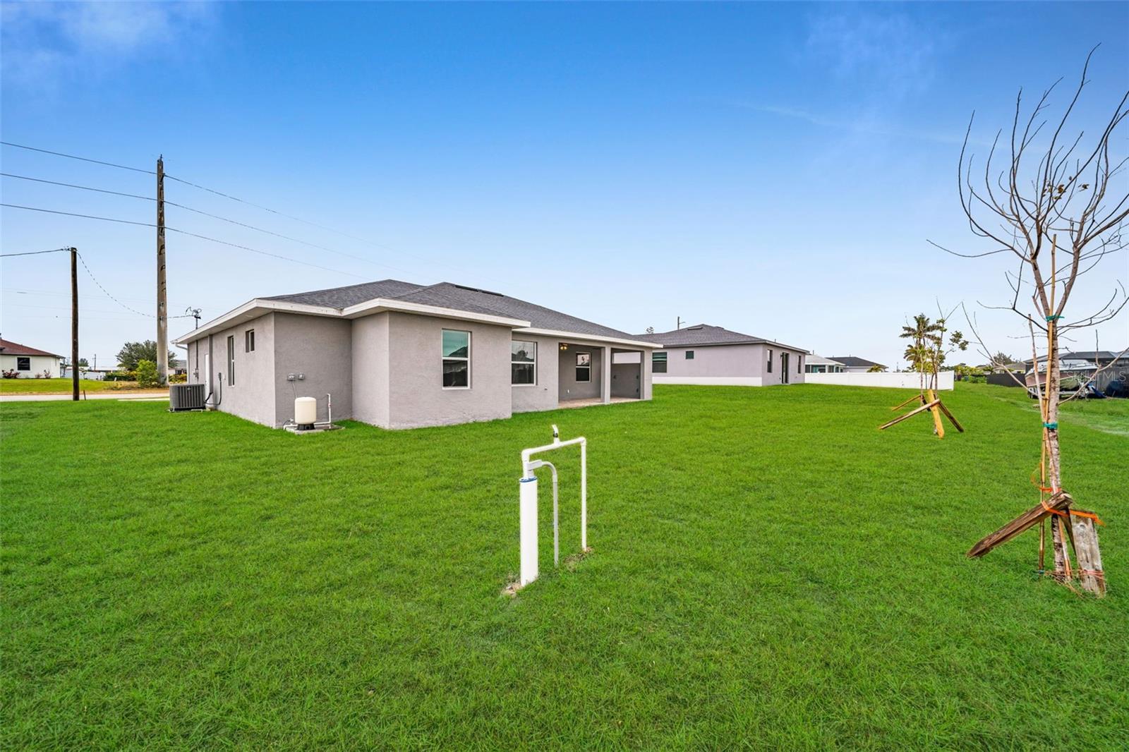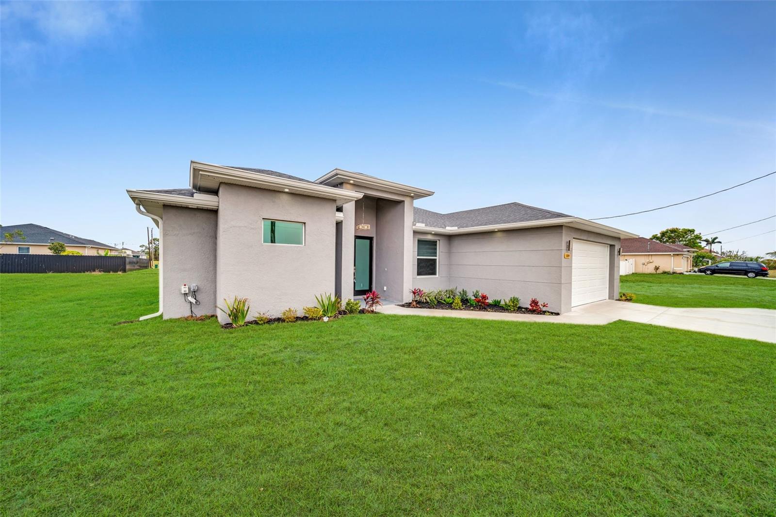 Modern Elegance, Brand-New Construction in Cape Coral, Fl. Be the first to own this stunning home. Featuring 3 bedrooms, a versatile Den, 2 bathrooms, and an open floor plan. This home boasts porcelain tile floors and a sleek knockdown finish with crisp light color paint. The chef-inspired kitchen includes solid wood cabinets, stainless steel Samsung appliances, a garbage disposal, and a modern stainless-steel sink. Bathrooms feature brushed nickel fixtures and tiled shower enclosures. The master bathroom features a separate tiled walking shower and freestanding bathtub. Enjoy soaring coffered ceilings. Additional highlights include energy-efficient impact and Low-E windows, LED lighting, ceiling fans room, and a digital thermostat. The outdoor space is perfect for entertaining with an equipped gas outdoor stainless-steel kitchen and generous open lanai. Low-voltage pre-wired for TV and internet, this home is stylish and functional, offering comfort and convenience. For your comfort and privacy, every window has beautiful and elegant blind zebra shade, gray color. NO IN A FLOOD ZONE AREA. This makes a huge difference!