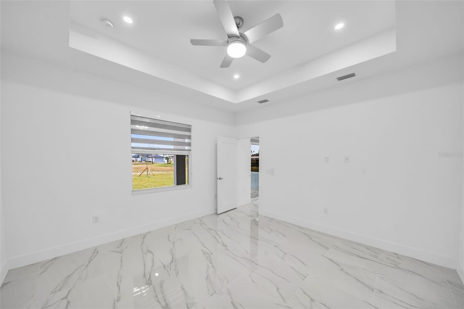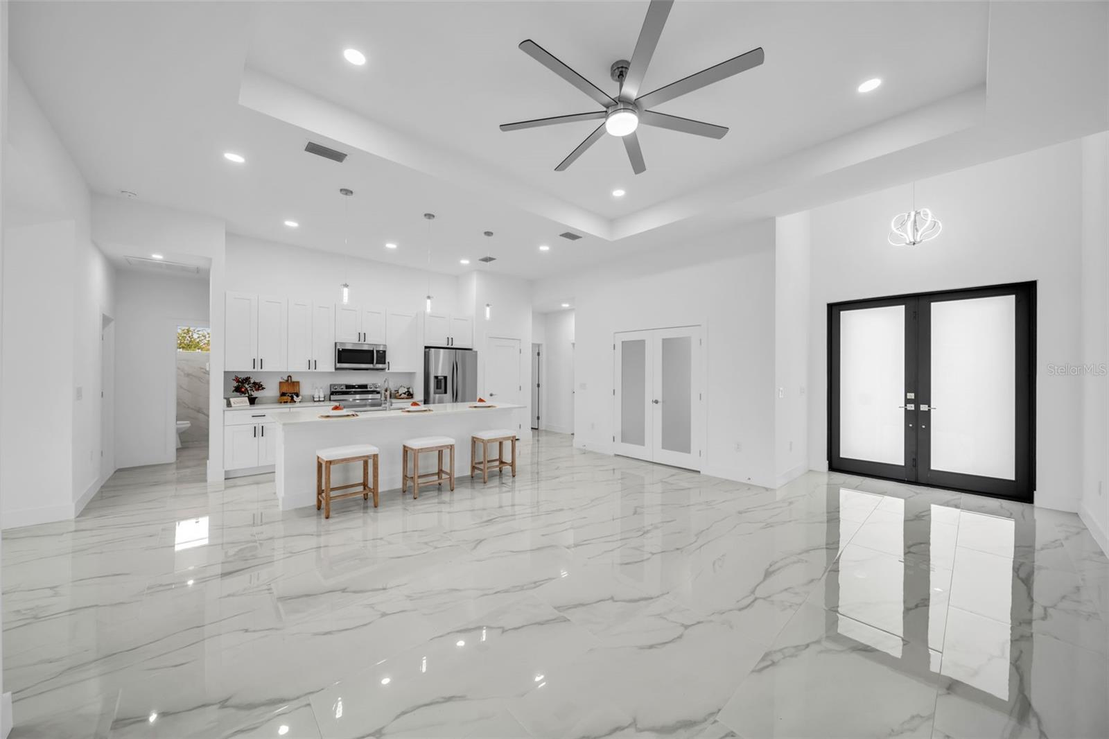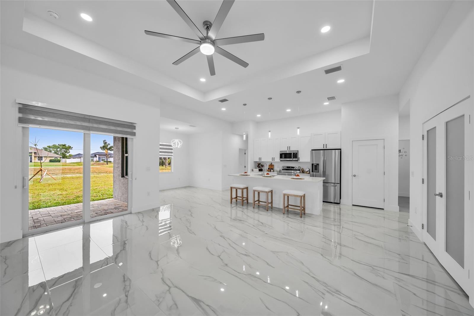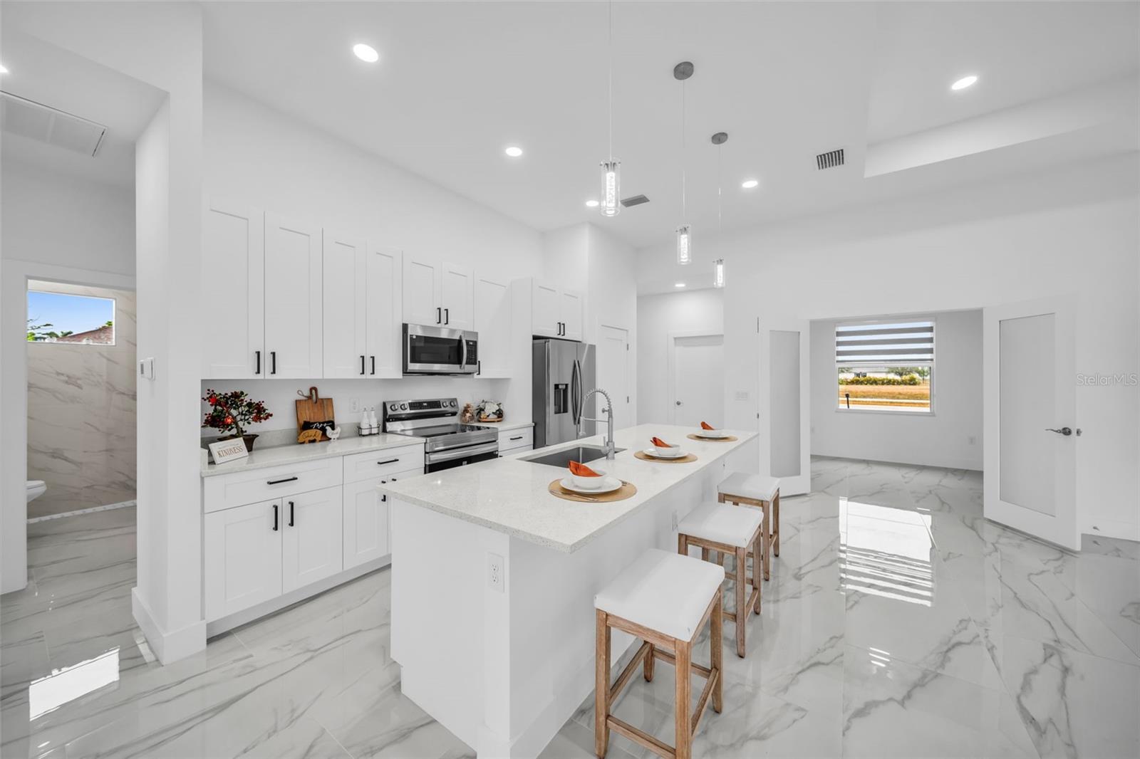 Modern Elegance, Brand-New Construction in Cape Coral, Fl. Be the first to own this stunning home. Featuring 3 bedrooms, a versatile Den, 2 bathrooms, and an open floor plan. This home boasts porcelain tile floors and a sleek knockdown finish with crisp light color paint. The chef-inspired kitchen includes solid wood cabinets, stainless steel Samsung appliances, a garbage disposal, and a modern stainless-steel sink. Bathrooms feature brushed nickel fixtures and tiled shower enclosures. The master bathroom features a separate tiled walking shower and freestanding bathtub. Enjoy soaring coffered ceilings. Additional highlights include energy-efficient impact and Low-E windows, LED lighting, ceiling fans room, and a digital thermostat. The outdoor space is perfect for entertaining with an equipped gas outdoor stainless-steel kitchen and generous open lanai. Low-voltage pre-wired for TV and internet, this home is stylish and functional, offering comfort and convenience. For your comfort and privacy, every window has beautiful and elegant blind zebra shade, gray color. NO IN A FLOOD ZONE AREA. This makes a huge difference!
