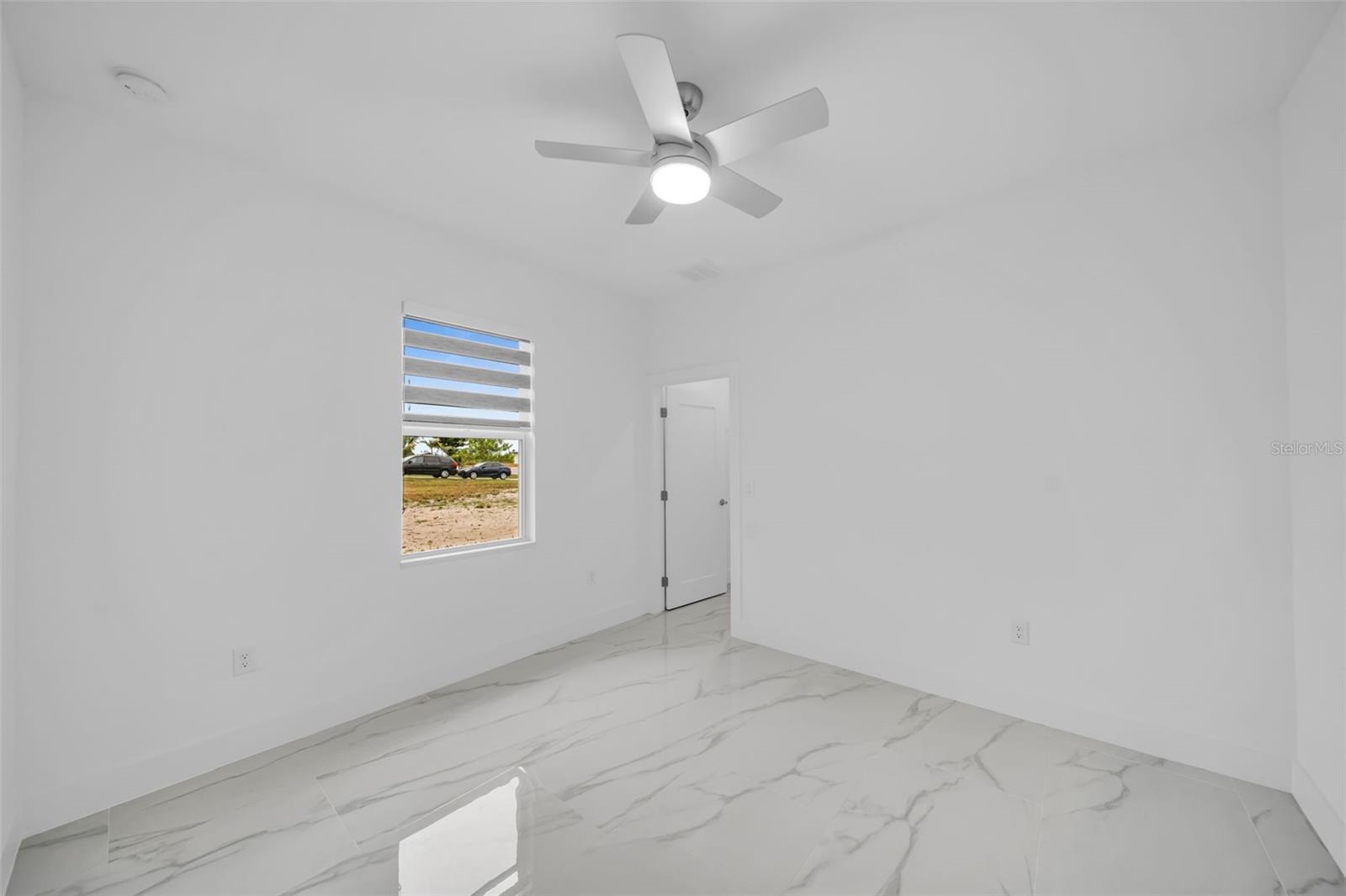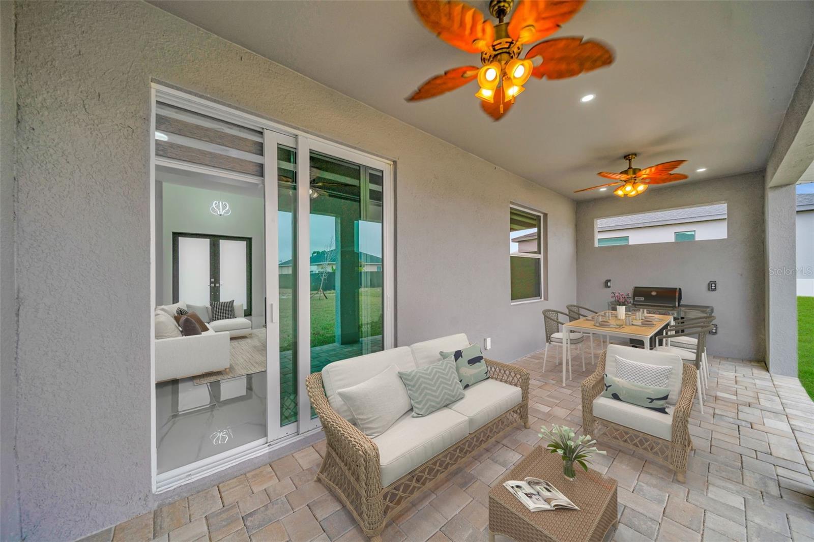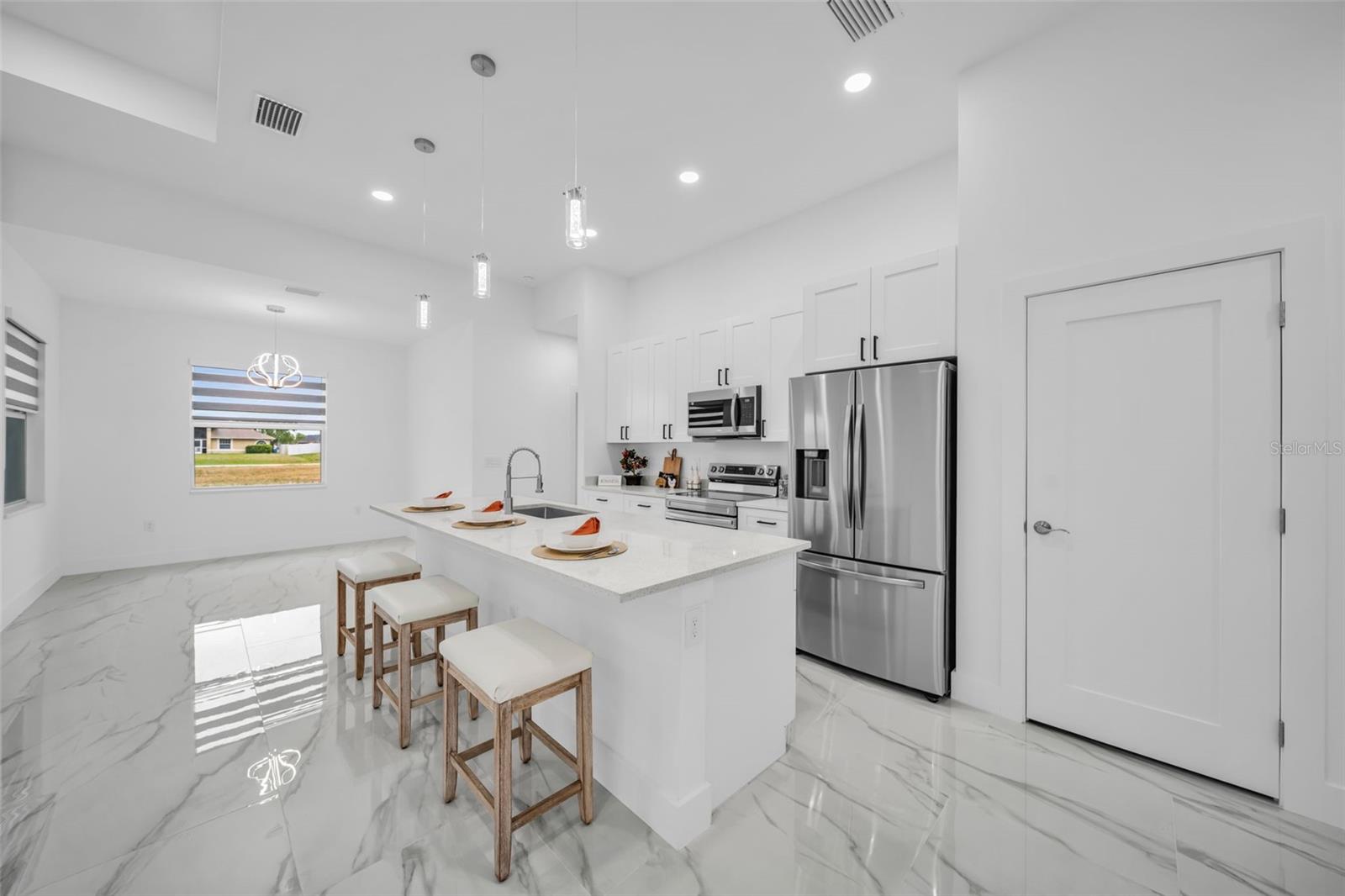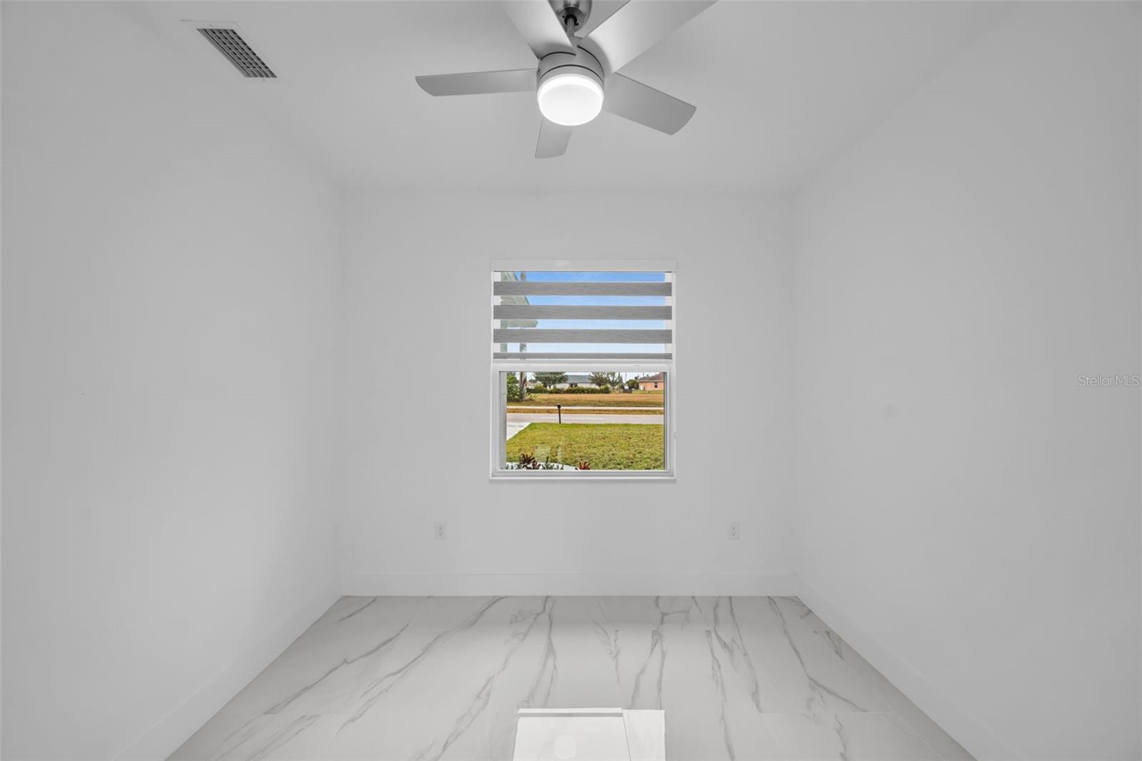 Modern Elegance, Brand-New Construction in Cape Coral, Fl. Be the first to own this stunning home. Featuring 3 bedrooms, a versatile Den, 2 bathrooms, and an open floor plan. This home boasts porcelain tile floors and a sleek knockdown finish with crisp light color paint. The chef-inspired kitchen includes solid wood cabinets, stainless steel Samsung appliances, a garbage disposal, and a modern stainless-steel sink. Bathrooms feature brushed nickel fixtures and tiled shower enclosures. The master bathroom features a separate tiled walking shower and freestanding bathtub. Enjoy soaring coffered ceilings. Additional highlights include energy-efficient impact and Low-E windows, LED lighting, ceiling fans room, and a digital thermostat. The outdoor space is perfect for entertaining with an equipped gas outdoor stainless-steel kitchen and generous open lanai. Low-voltage pre-wired for TV and internet, this home is stylish and functional, offering comfort and convenience. For your comfort and privacy, every window has beautiful and elegant blind zebra shade, gray color. NO IN A FLOOD ZONE AREA. This makes a huge difference!