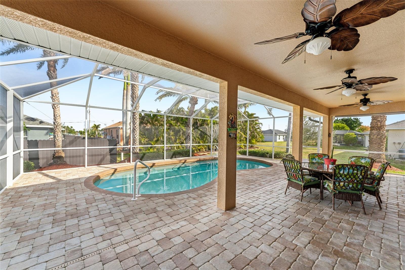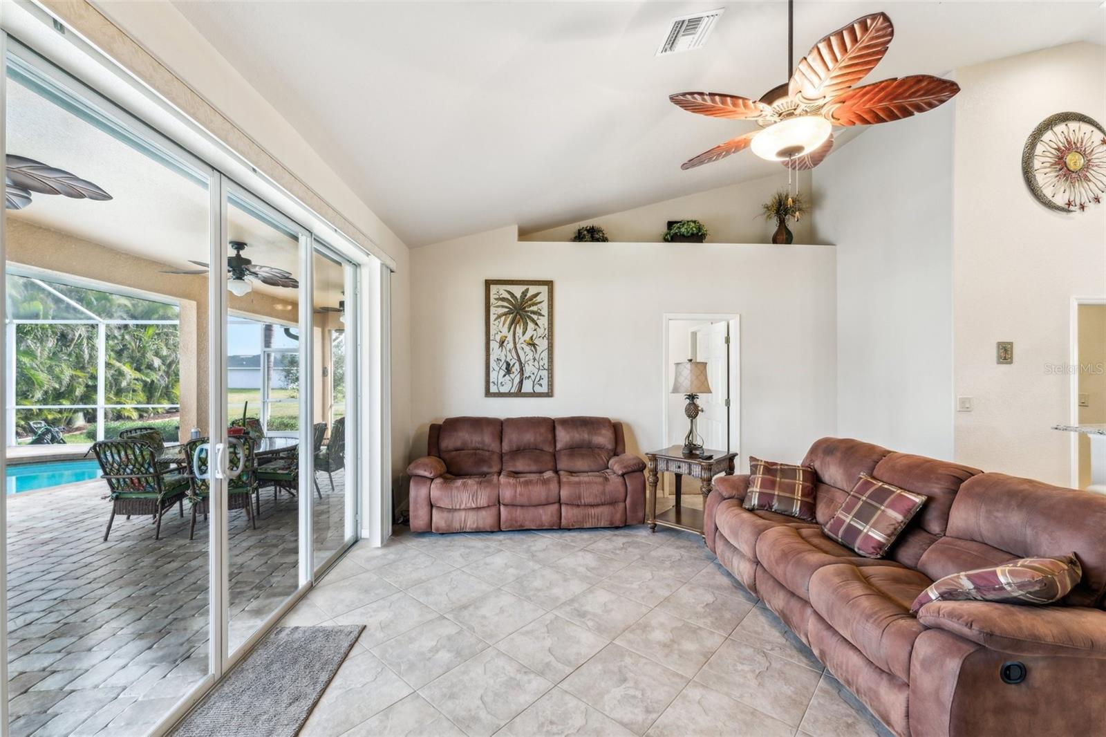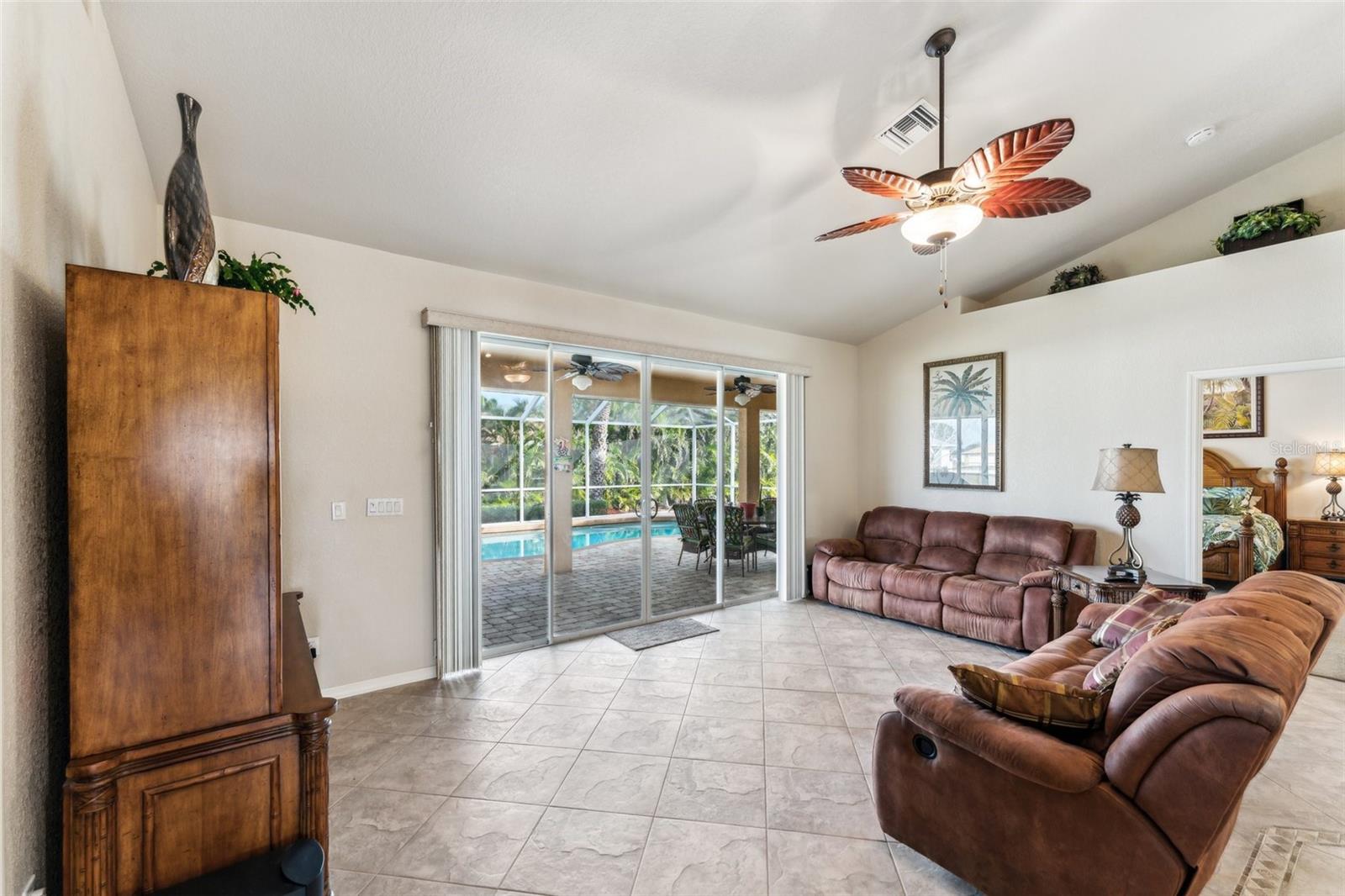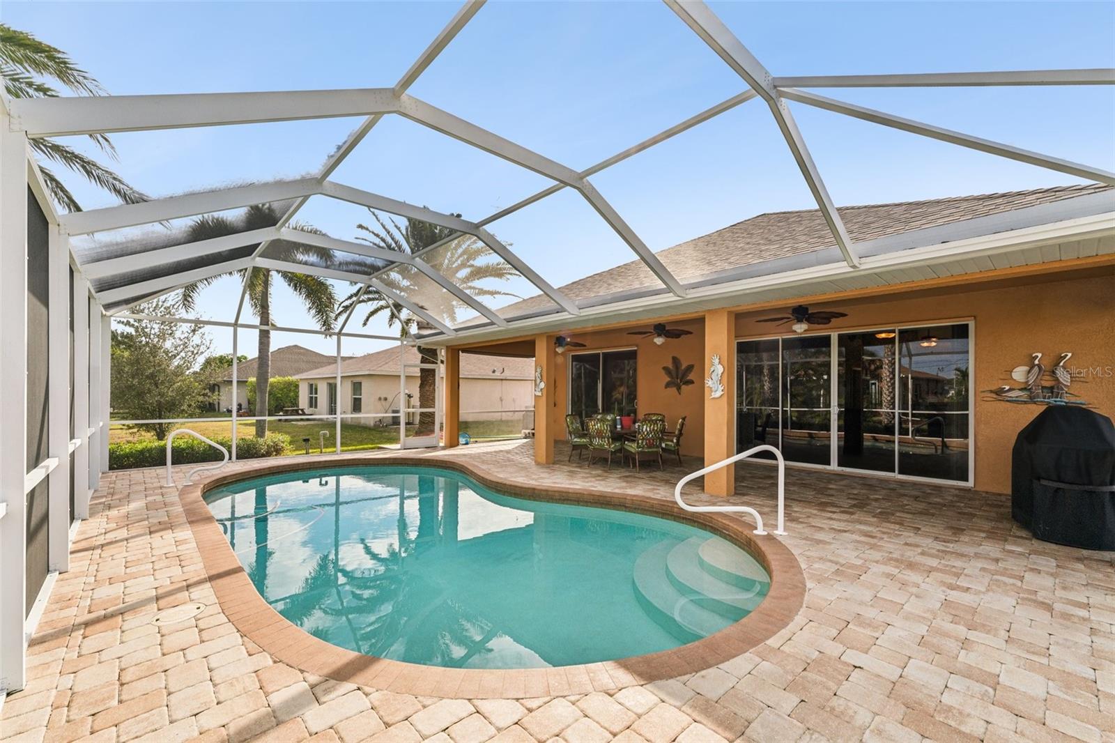 Enter into this light-filled 3-bedroom + den, 2-bathroom pool home with no HOA, featuring peace of mind with no flood history and new hurricane-rated windows throughout. Originally the builder's model, this impeccably maintained home blends luxury and practicality. Premium upgrades include matching wood window blinds, ambient lighting in the tray ceiling of the primary suite, and anti-slip upgraded floor tile in the main living areas. The recently remodeled kitchen by Academy is a standout, with high-end cabinets, a coffee bar, Cambria quartz countertops and backsplash, a Frigidaire Professional appliance suite, and a breakfast bar. Adjacent, the spacious living room and formal dining area provide an inviting space for entertaining, while the versatile den/flex room offers additional functionality. The private primary suite features lanai access, a huge walk-in closet, dual vanities, and a walk-in shower with high-end Moen fixtures. Two generously sized guest bedrooms offer ample closet space and share a beautifully updated bath, with matching high-quality cabinetry in the bathrooms and laundry room for a cohesive design. The home boasts several impressive upgrades, including a new roof, soffits, and gutters with extra-wide downspouts, a new hurricane-rated garage door, and a new HVAC system installed in 2024 by Strada. The hot water tank was replaced in 2021, and a new well pump and system was installed in 2021. The septic system was pumped and serviced in January 2025. The outdoor area is perfect for relaxing and entertaining, featuring a completely new pool cage, upgraded paver pool deck, and a 3.5-ton pool heater. The pool equipment is professionally maintained by Water Medic, ensuring the pool remains in pristine condition. The professionally landscaped grounds add to the home's curb appeal. The seller had a pre-listing inspection completed and addressed all minor repairs. No flooding or water damage has ever occurred on the property, and there was no damage from Hurricane Ian except for the pool cage, which has since been replaced. While not in a flood zone, transferable flood insurance is available for additional peace of mind. Additional highlights include upgraded light fixtures and ceiling fans throughout, repurposed kitchen cabinets with an extra refrigerator in the garage, and a home that is truly move-in ready. This exceptional home offers luxury, comfort, and security in a serene, year-round residential neighborhood.