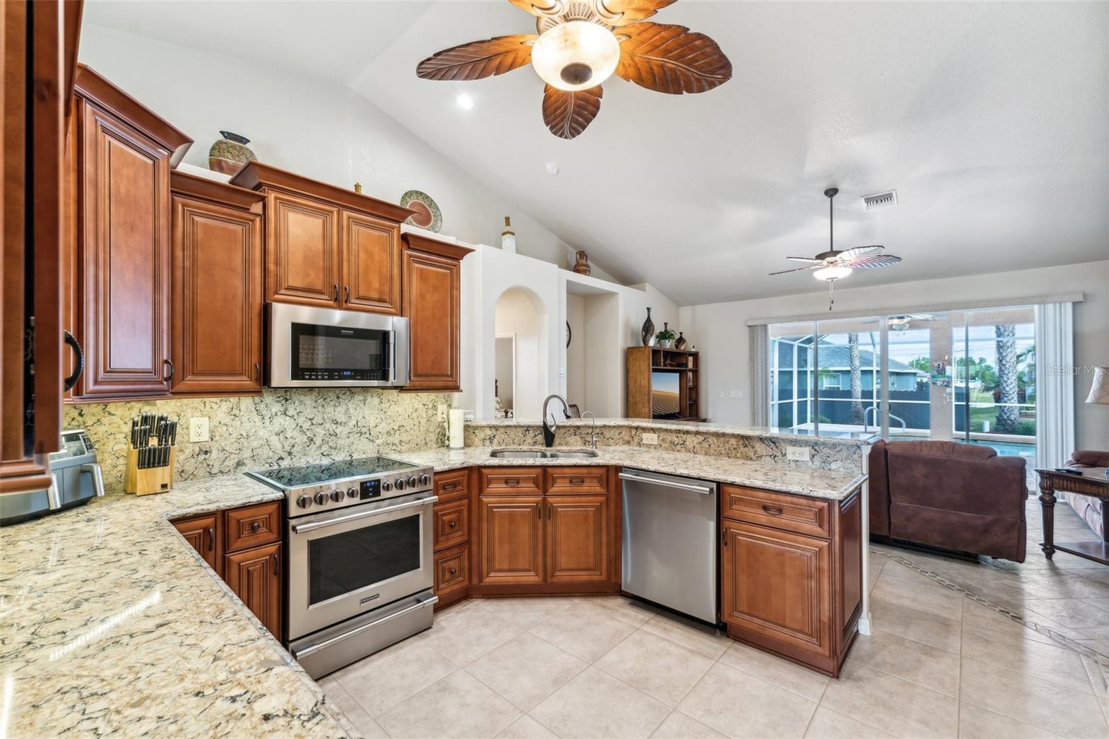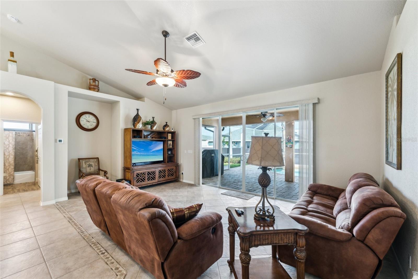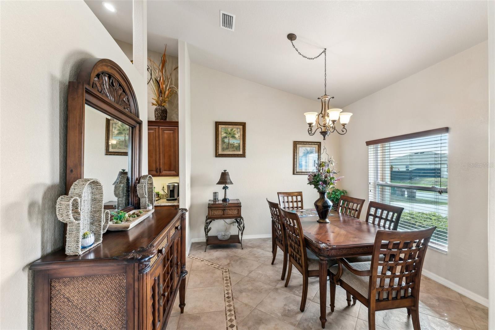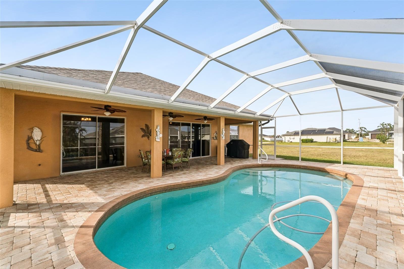 Enter into this light-filled 3-bedroom + den, 2-bathroom pool home with no HOA, featuring peace of mind with no flood history and new hurricane-rated windows throughout. Originally the builder's model, this impeccably maintained home blends luxury and practicality. Premium upgrades include matching wood window blinds, ambient lighting in the tray ceiling of the primary suite, and anti-slip upgraded floor tile in the main living areas. The recently remodeled kitchen by Academy is a standout, with high-end cabinets, a coffee bar, Cambria quartz countertops and backsplash, a Frigidaire Professional appliance suite, and a breakfast bar. Adjacent, the spacious living room and formal dining area provide an inviting space for entertaining, while the versatile den/flex room offers additional functionality. The private primary suite features lanai access, a huge walk-in closet, dual vanities, and a walk-in shower with high-end Moen fixtures. Two generously sized guest bedrooms offer ample closet space and share a beautifully updated bath, with matching high-quality cabinetry in the bathrooms and laundry room for a cohesive design. The home boasts several impressive upgrades, including a new roof, soffits, and gutters with extra-wide downspouts, a new hurricane-rated garage door, and a new HVAC system installed in 2024 by Strada. The hot water tank was replaced in 2021, and a new well pump and system was installed in 2021. The septic system was pumped and serviced in January 2025. The outdoor area is perfect for relaxing and entertaining, featuring a completely new pool cage, upgraded paver pool deck, and a 3.5-ton pool heater. The pool equipment is professionally maintained by Water Medic, ensuring the pool remains in pristine condition. The professionally landscaped grounds add to the home's curb appeal. The seller had a pre-listing inspection completed and addressed all minor repairs. No flooding or water damage has ever occurred on the property, and there was no damage from Hurricane Ian except for the pool cage, which has since been replaced. While not in a flood zone, transferable flood insurance is available for additional peace of mind. Additional highlights include upgraded light fixtures and ceiling fans throughout, repurposed kitchen cabinets with an extra refrigerator in the garage, and a home that is truly move-in ready. This exceptional home offers luxury, comfort, and security in a serene, year-round residential neighborhood.