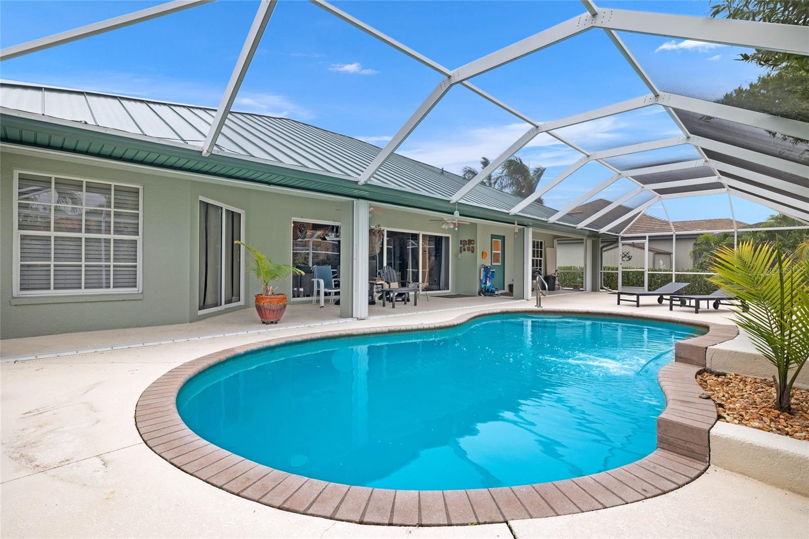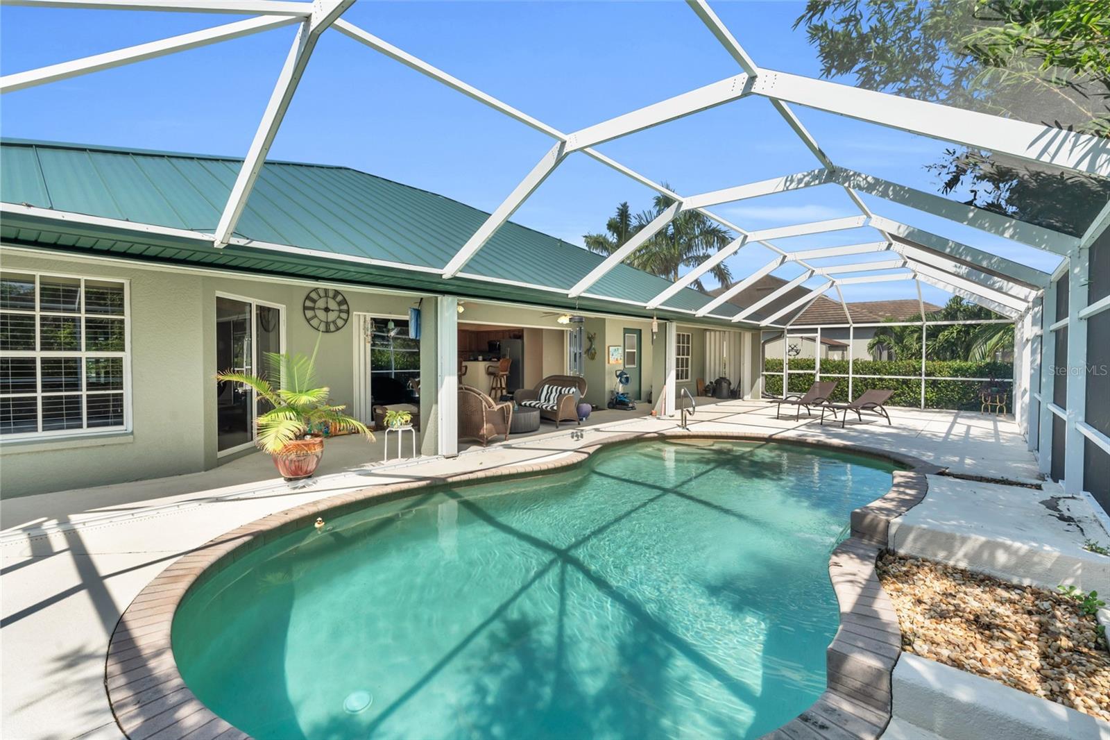 Location Location Location The House with the New Green Roof in Cape Coral features a new HVAC Unit on July 17, 2025, a new metal roof, fresh paint, and luxurious amenities. Built in 2006, this home features 2 bedrooms, 1 Den/office, 2 bathrooms, and a 2-car garage, along with a chef’s kitchen, Gas Stove, saltwater pool, and a primary suite with a lavish bath. The landscaped corner lot offers privacy, and the home is conveniently located near shopping, dining, and recreational activities.