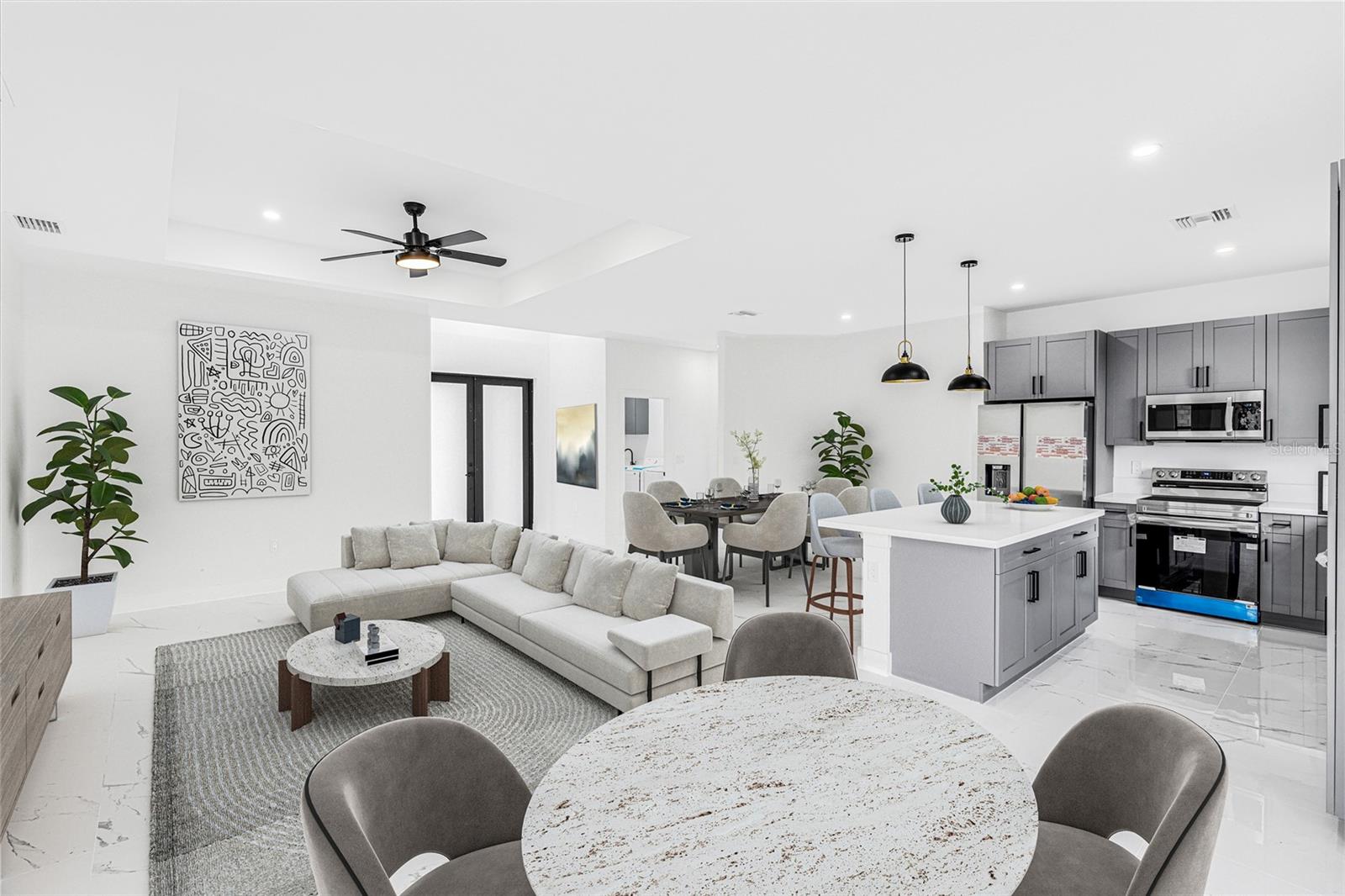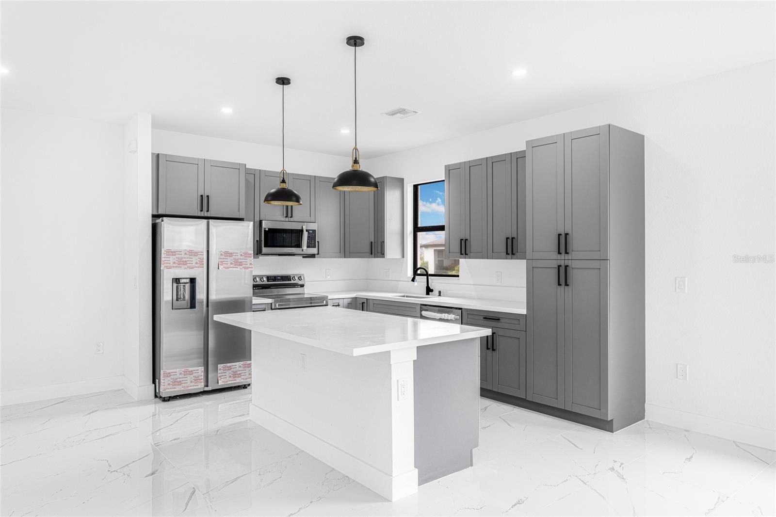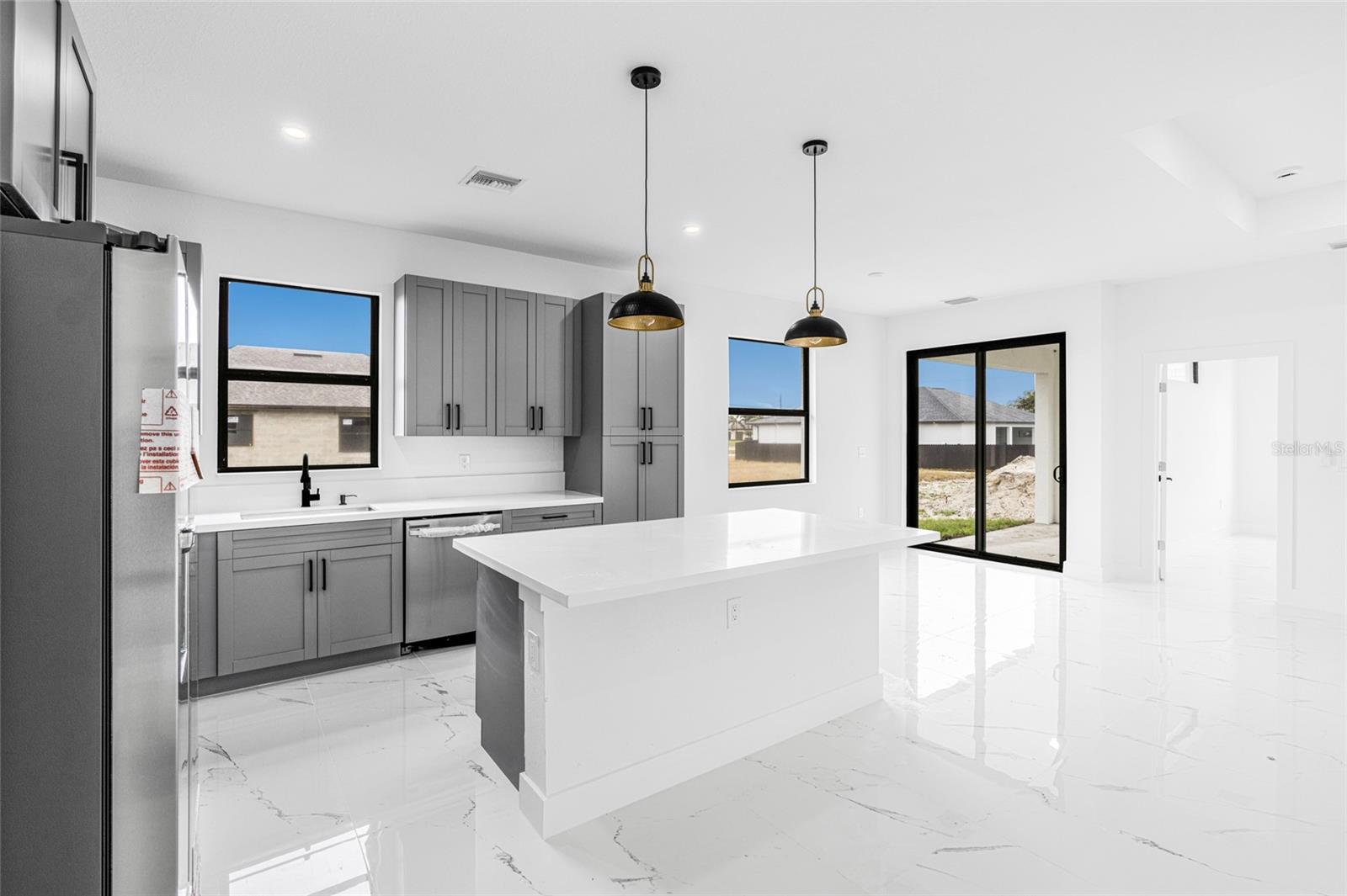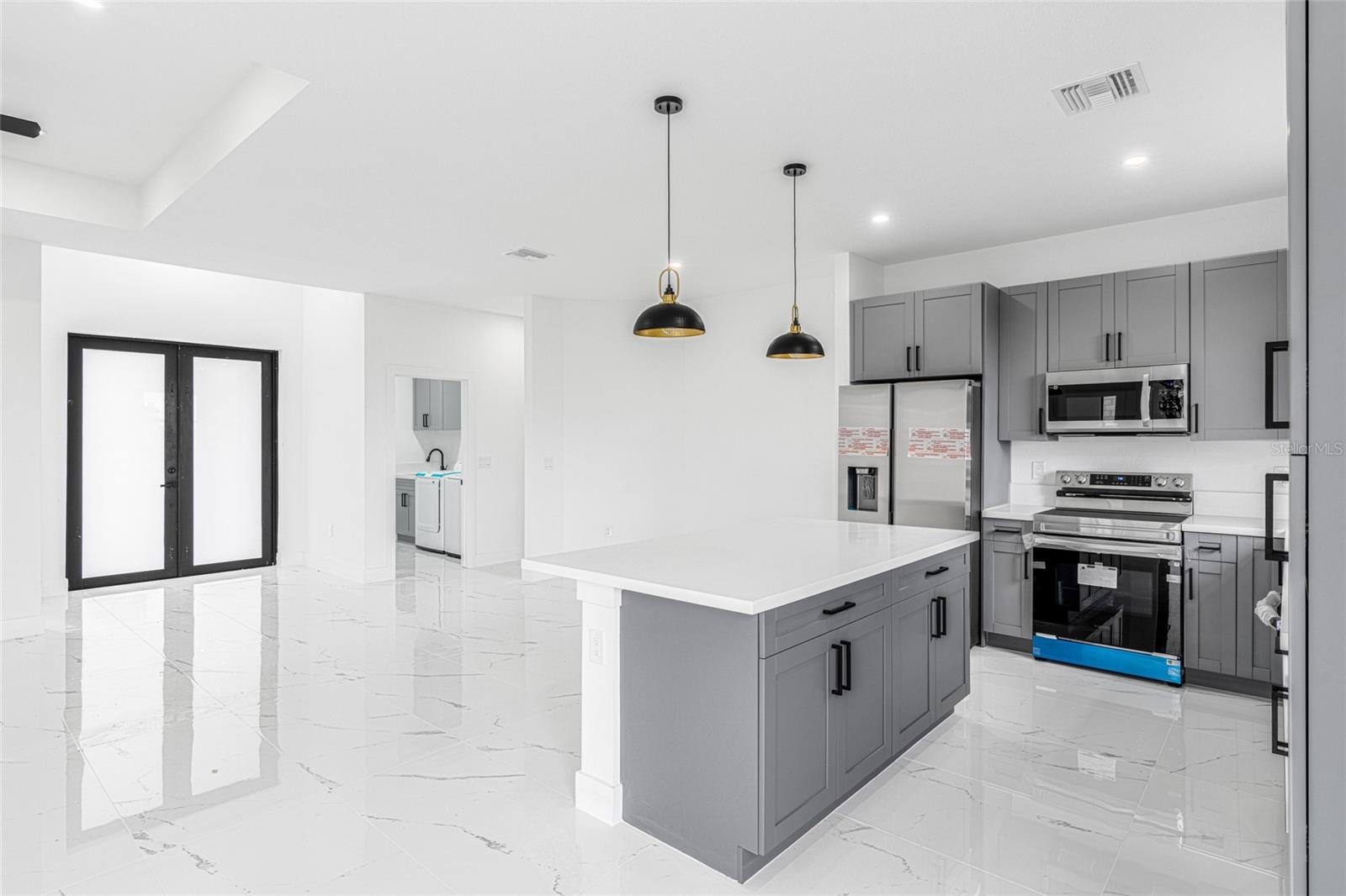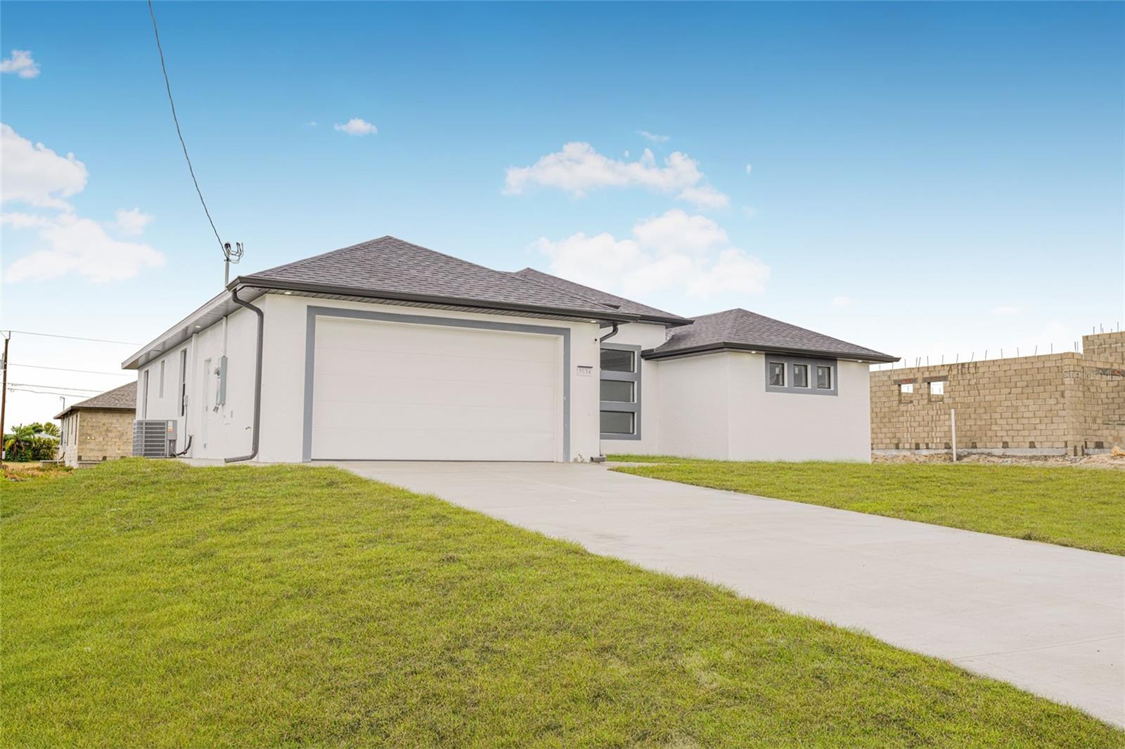 One or more photo(s) has been virtually staged. PRICE IMPROVEMENT! Seller is motivated and ready to make a deal. Be the first to call this brand-new Cape Coral home yours! Located in FEMA Flood Zone AE with an active Elevation Certificate, this property offers peace of mind and potential savings on flood insurance — a huge advantage in this area! Featuring 3 bedrooms, 2 baths, a flex den, and a modern open layout, this home blends comfort and style beautifully. The chef-inspired kitchen includes quartz countertops, soft-close cabinets, pantry, island, and brand-new stainless-steel appliances. Washer and dryer are also included, making it truly move-in ready. The primary suite has dual walk-in closets and a spa-like bath with double sinks and elegant finishes. Porcelain tile floors throughout give a sleek, easy-to-maintain look. Step outside to your lanai, perfect for BBQs, relaxing evenings, or adding a future pool. You’ll also enjoy a 2-car garage, full irrigation system, and lush landscaping. Everything’s ready — just bring your furniture and start living your Cape Coral dream! Great location close to schools, shopping, parks, and just a short drive to boating and Gulf beaches. Walkthrough video: https://www.youtube.com/embed/oFYToeD4nV8