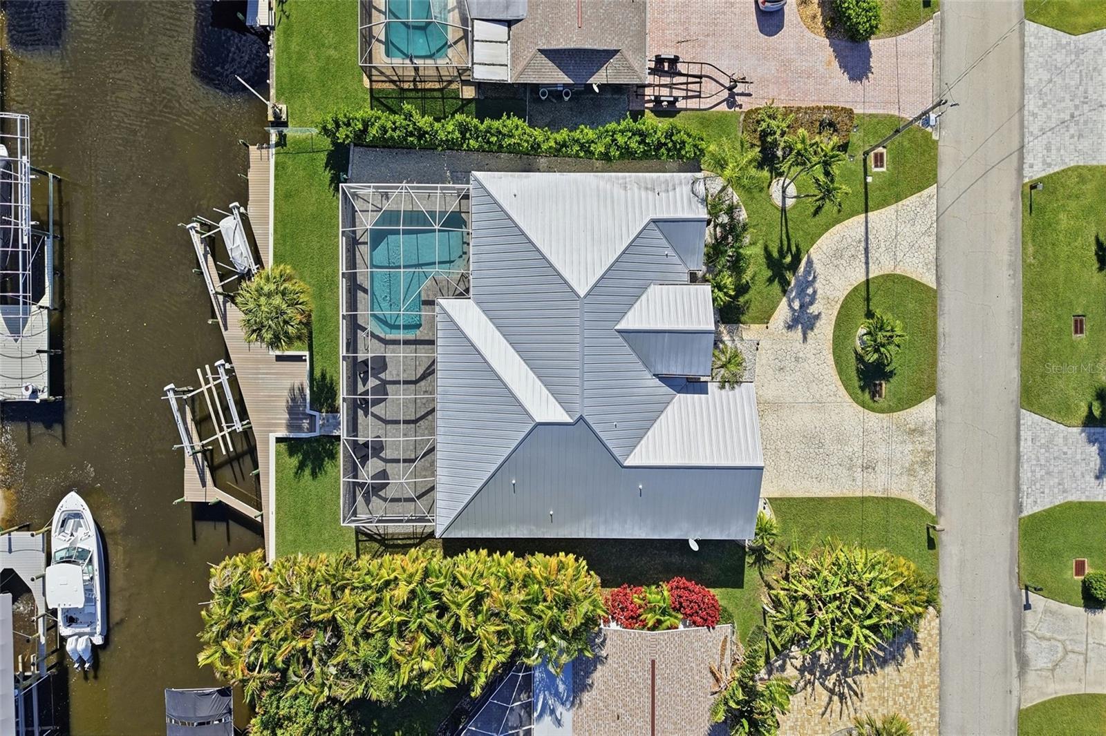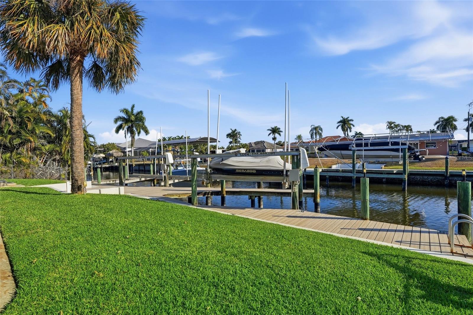 Set along a tranquil canal with direct Gulf access, this refined Cape Coral waterfront residence delivers the quintessential Florida lifestyle—where boating, luxury, and location come together effortlessly. Framed by lush tropical landscaping and anchored by a circular paver driveway, the home makes an immediate statement of timeless curb appeal. Inside, soaring vaulted ceilings, soft neutral tones, and expansive windows fill the interior with natural light, creating a bright coastal ambiance that feels both elegant and inviting. Durable vinyl and tile flooring throughout enhances everyday living while maintaining a clean, modern aesthetic. The open-concept living area is designed to impress, flowing seamlessly into the kitchen and outdoor retreat beyond. Sliding glass doors draw your eye straight to the water, reinforcing the home’s effortless connection to its canal-front setting. The spacious open kitchen features stainless steel appliances, generous counter space, and an oversized breakfast bar—perfect for casual dining or entertaining. Two distinct dining areas plus a breakfast nook provide flexibility for both intimate evenings and larger gatherings. The primary suite is a private sanctuary, thoughtfully remodeled and positioned to capture peaceful water views. It offers direct access to the pool area and a spa-inspired ensuite bath with dual vanities, a walk-in shower, and soaking tub space. Two additional guest bedrooms are equally well-appointed and share a Jack-and-Jill full bathroom, ideal for family or visiting guests. Outdoor living truly steals the show. The expansive screened lanai surrounds a beautifully proportioned pool and lounging area—an entertainer’s dream for sun-soaked afternoons and sunset evenings. A dedicated pool bath adds convenience, while a second half bath with two-way access enhances functionality throughout the home. For boating enthusiasts, the backyard is nothing short of exceptional. A private composite dock, wide water frontage, and two 10,000-lb boat lifts provide quick, effortless access to open water—making spontaneous sunset cruises, fishing trips, and island hopping part of everyday life. Even better, the home is less than five minutes from the highly anticipated Bimini Square, where waterfront dining and high-end restaurants are opening soon, adding an exciting new lifestyle destination just moments away. Additional peace of mind comes with an assumable flood insurance policy, offering both convenience and potential long-term savings. This residence blends comfort, style, and location into one exceptional offering—perfect as a full-time home, winter retreat, or luxury waterfront investment. This is more than a home—it’s a front-row seat to the evolving Gulf Coast lifestyle.