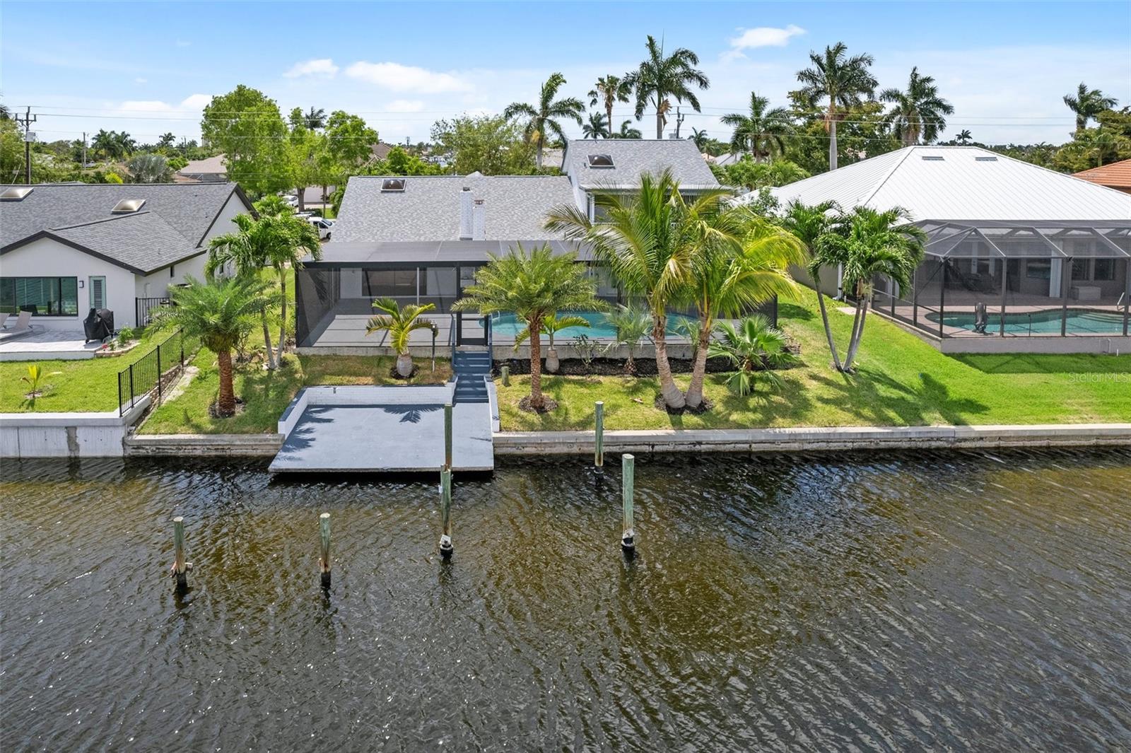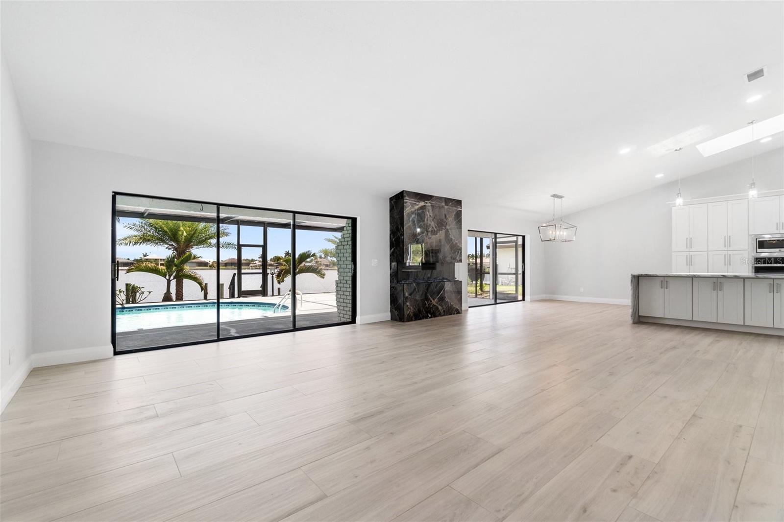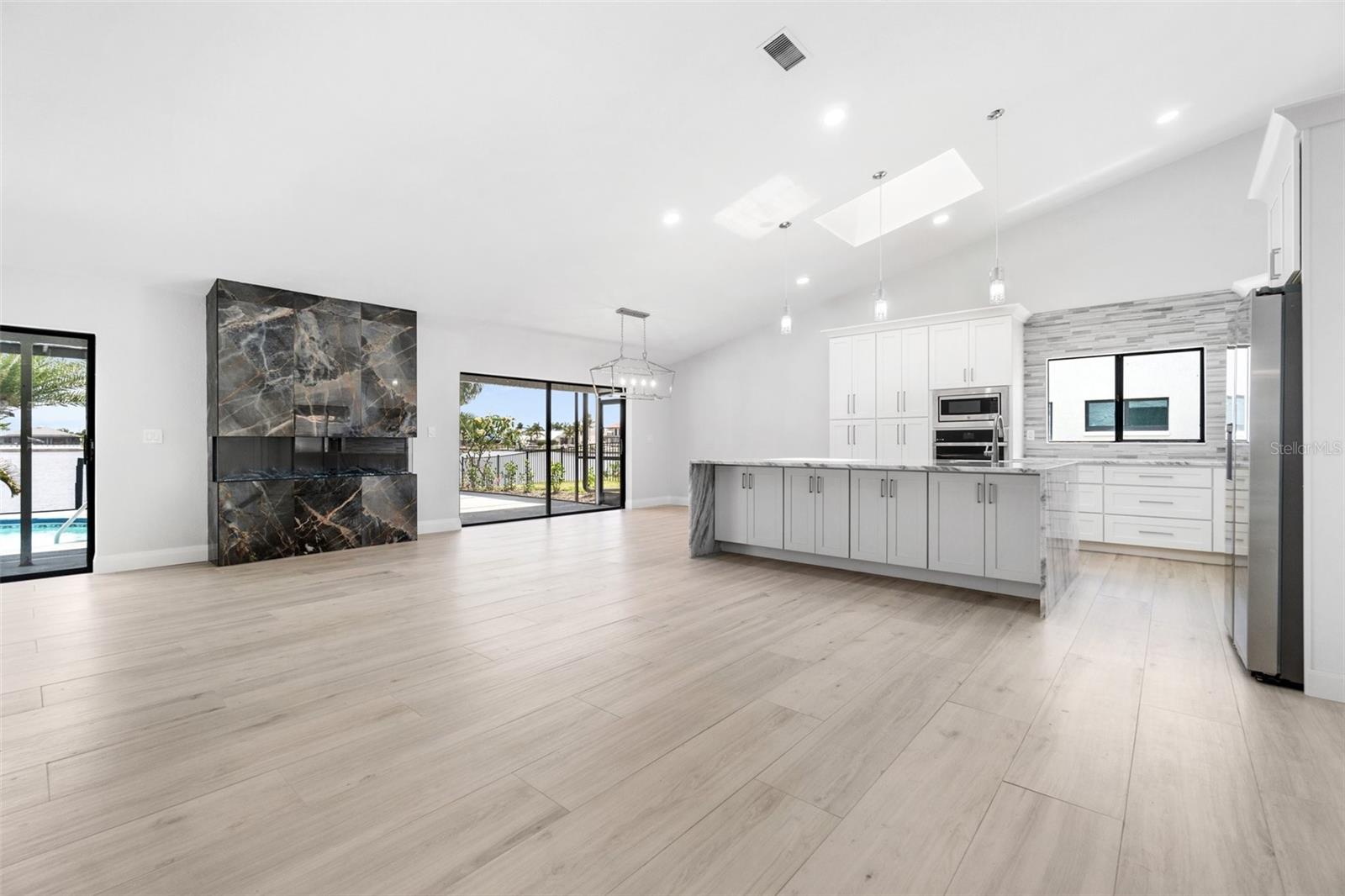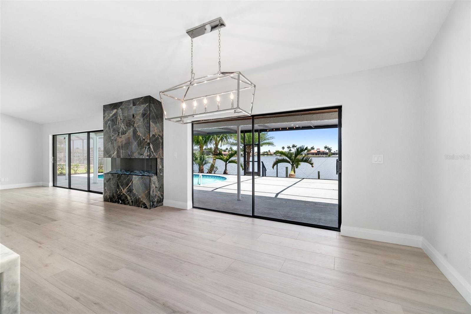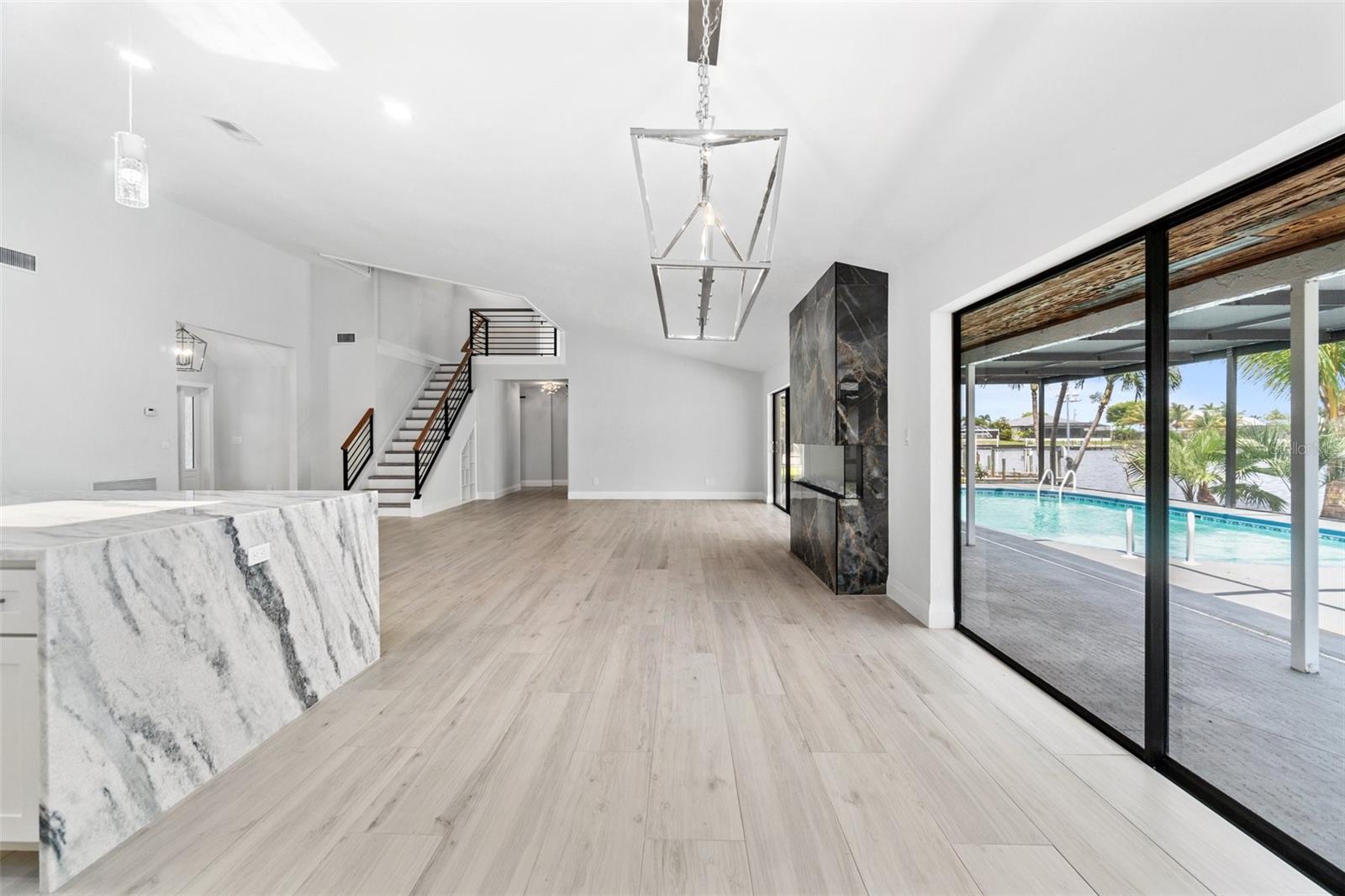 Looking for that WOW factor... this is your home! Amazing remodel on this home took over a year to complete and you can tell the attention to detail that went into this home. Starting with the double front doors leading into the home which has 5 total sliders in main living area showcasing the amazing waterfront view out back! The 18-foot-long island with waterfall countertops really stands out along with the amazing full tiled fireplace. This fireplace has more options than most cars! Every inch of this home has been remodeled and looks amazing. The 4 bedrooms offer ample space, and all have built in closet systems that scream luxury! The second-floor owner's suite is equipped with a great screened balcony to sit out and enjoy the views and sunrises. This home is a must see just for the views. The home is located on one of the 8 lakes in SW Cape Coral. Quick access out to open water with great views of million-dollar homes along the way. Out to open water in under 25 minutes. Located within Short distance to great shopping and restaurants in Cape Harbour and Marina Village! Ready to settle down and watch dolphins and manatees in your backyard? This home also has a BRAND-NEW pool cage and Roof! New AC! Come live the easy life in beautiful Cape Coral. Call today for your private showing of this amazing home!
