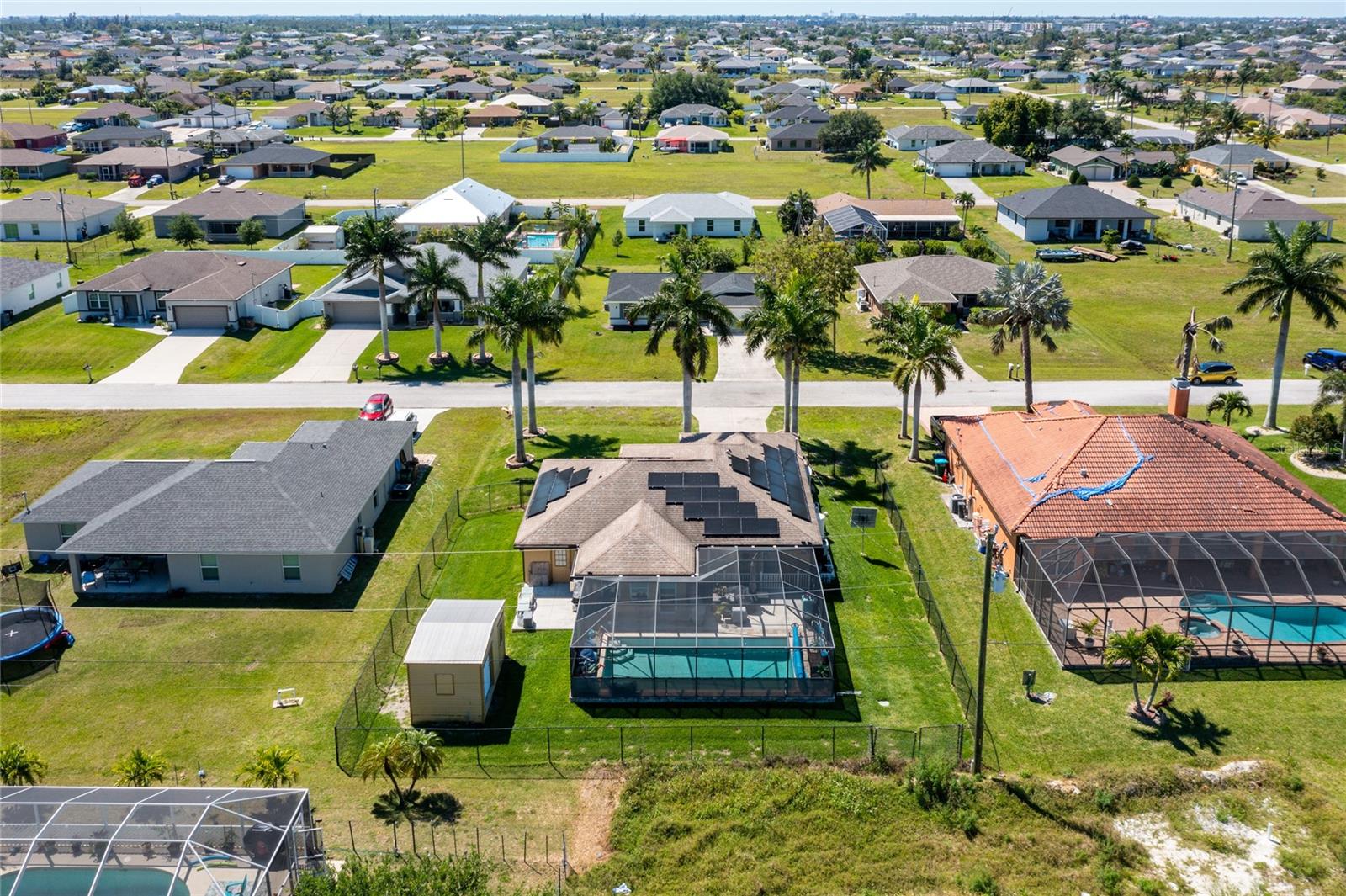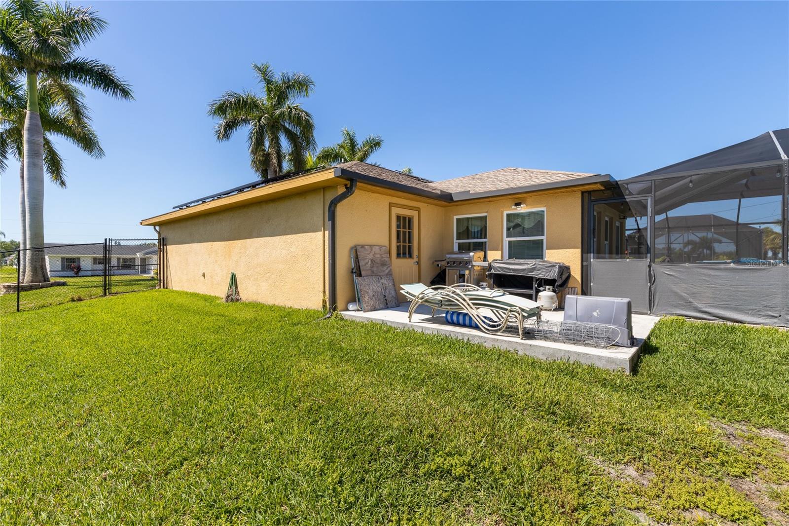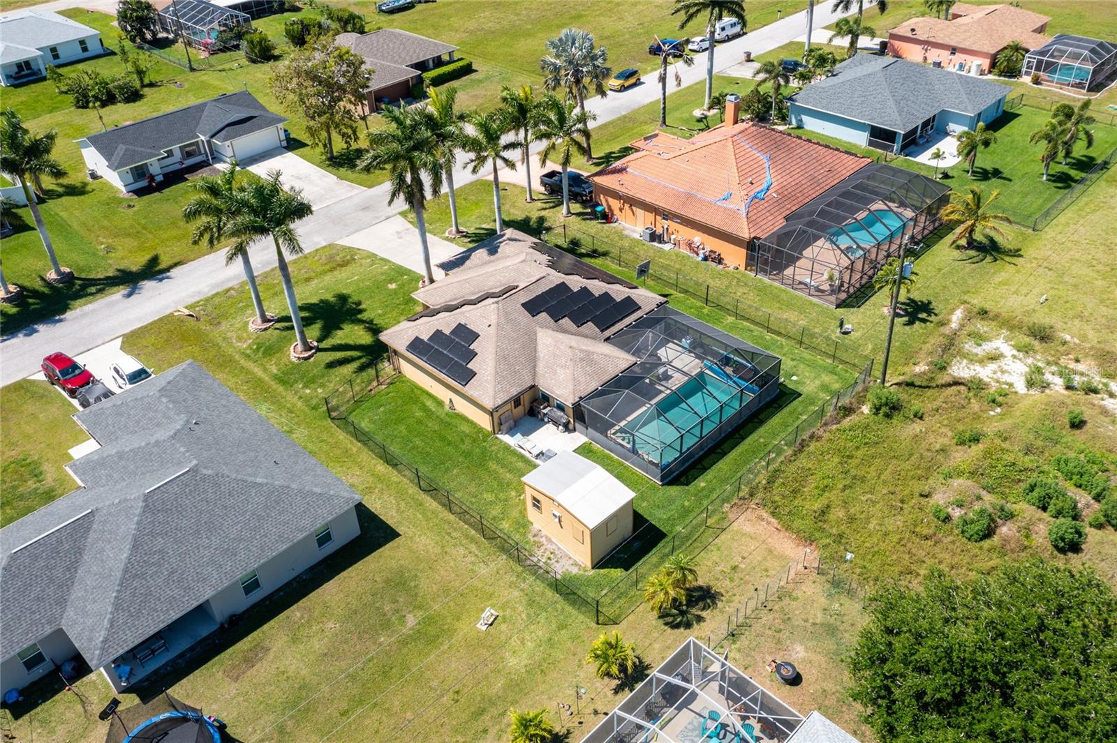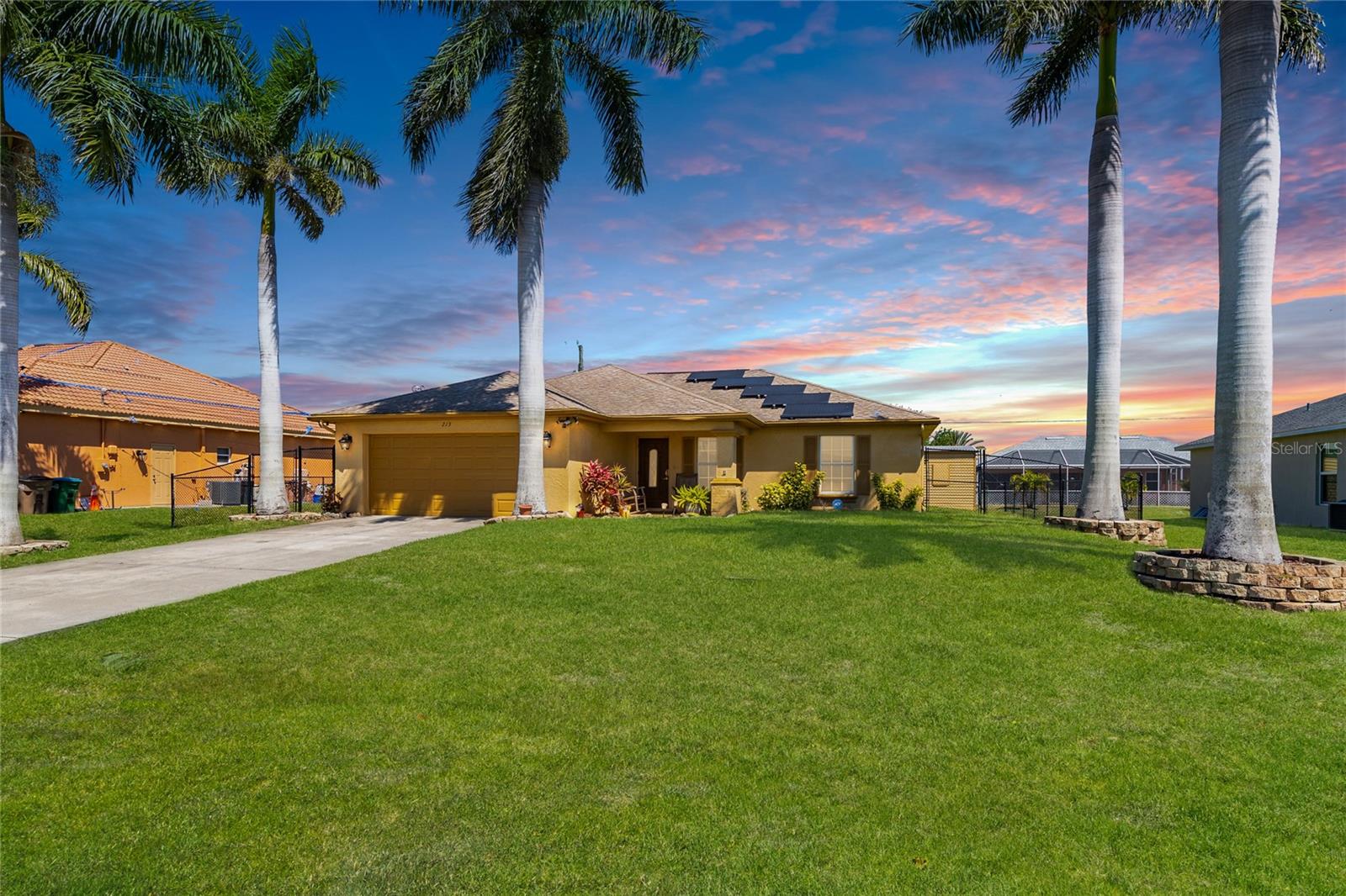 Make sure to check out the Virtual Tour for a 3D Model w/ Walkthrough, Floor Plan w/ Measurements, Video, & more! Looking for your perfect spot in NW Cape Coral - just MINUTES to Pine Island Sound - with a private pool, granite countertops, No HOA, Flood Zone X for NO Required Flood Insurance! AND SOLAR PANELS for UNDER $450K?! Here's your sign! Check out this amazing 3/2/2 pool home with 1458 SF Living, Solar Panels in 2022, pool built in 2020, and a fully fenced yard. Beyond the STUNNING 20'+ tall palm trees you will find a covered entryway leading to your new home (or home away from home!). Immediately to your right upon entry you have a set of glass french doors leading to the office/den/bonus room... as you exit the foyer you're greeted by an open and airy great room w/ vaulted ceilings, kitchen with Bright Cabinetry, stainless appliances, granite countertops w/ breakfast bar, and a separate bar area by the dining space. To the right side of the home, two guest bedrooms share a jack & jill bath and to the left side of the home is your entire master suite w/ walk-in closets and tons of space... and then straight through the living room you've got another bonus room that leads to the screened pool, lanai, and back yard. Have a furry friend? There's already a pet-door built into the wall in the master bedroom, giving them their own lanai access to the fenced back yard! Close to all the restaurants and shopping you could hope for, this is exactly what you've been looking for - Low Cost, Relaxing, Pool, Low Maintenance... did we mention relaxing? Good! ...but don't relax on this fantastic deal - set up your private showing and get your offer in ASAP!