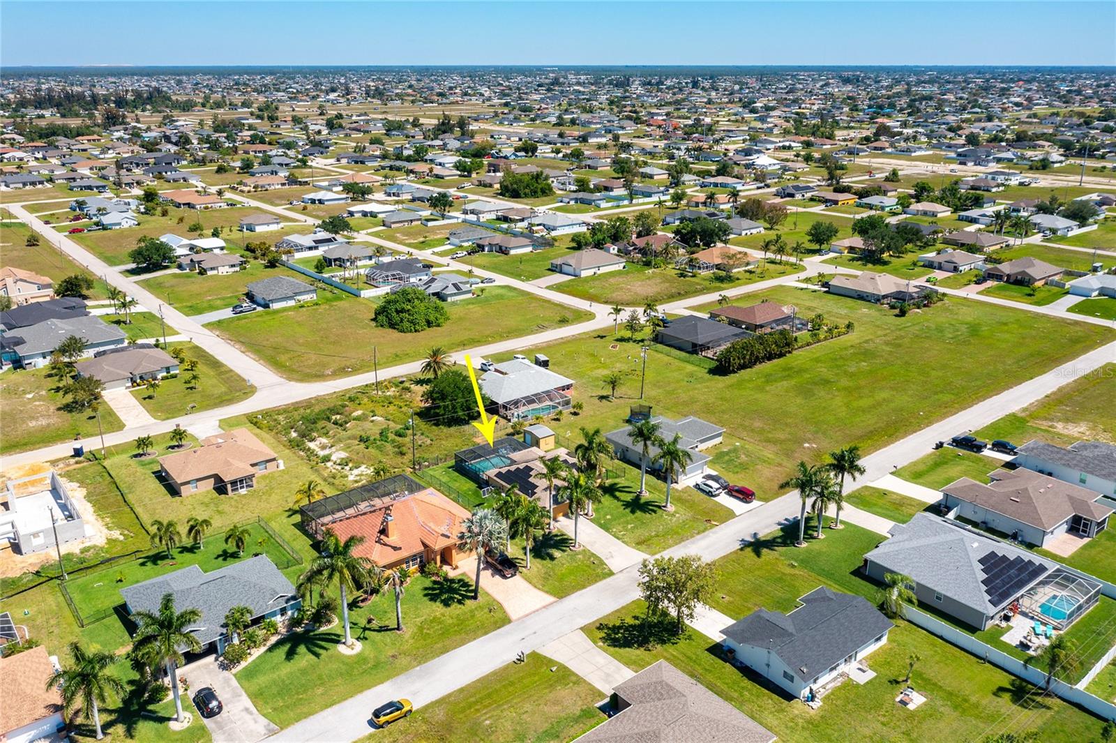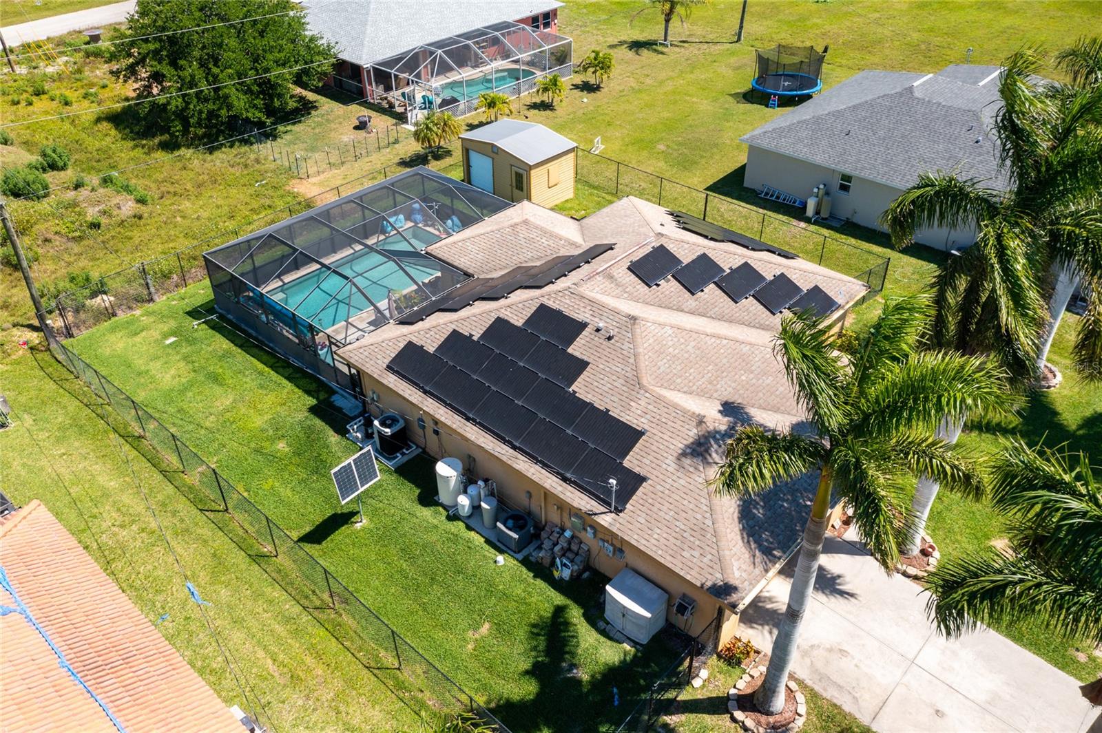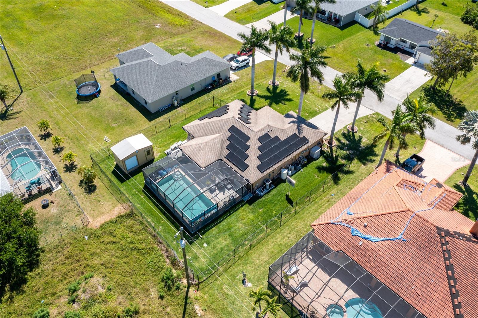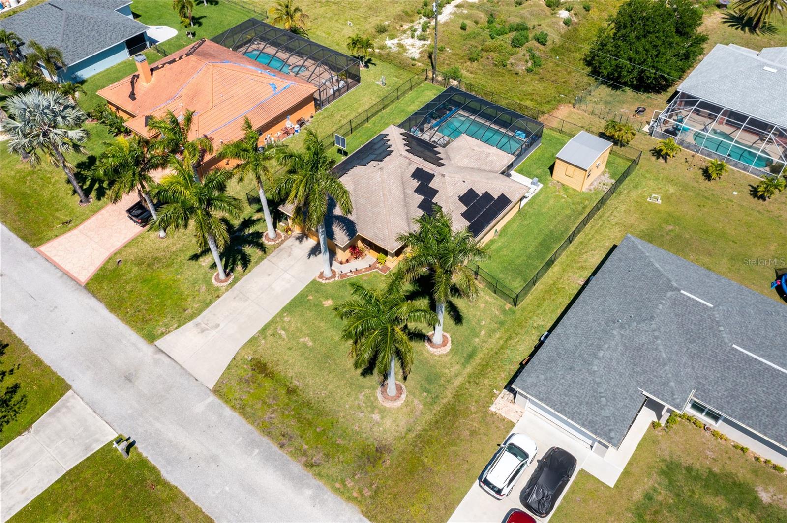 Make sure to check out the Virtual Tour for a 3D Model w/ Walkthrough, Floor Plan w/ Measurements, Video, & more! Looking for your perfect spot in NW Cape Coral - just MINUTES to Pine Island Sound - with a private pool, granite countertops, No HOA, Flood Zone X for NO Required Flood Insurance! AND SOLAR PANELS for UNDER $450K?! Here's your sign! Check out this amazing 3/2/2 pool home with 1458 SF Living, Solar Panels in 2022, pool built in 2020, and a fully fenced yard. Beyond the STUNNING 20'+ tall palm trees you will find a covered entryway leading to your new home (or home away from home!). Immediately to your right upon entry you have a set of glass french doors leading to the office/den/bonus room... as you exit the foyer you're greeted by an open and airy great room w/ vaulted ceilings, kitchen with Bright Cabinetry, stainless appliances, granite countertops w/ breakfast bar, and a separate bar area by the dining space. To the right side of the home, two guest bedrooms share a jack & jill bath and to the left side of the home is your entire master suite w/ walk-in closets and tons of space... and then straight through the living room you've got another bonus room that leads to the screened pool, lanai, and back yard. Have a furry friend? There's already a pet-door built into the wall in the master bedroom, giving them their own lanai access to the fenced back yard! Close to all the restaurants and shopping you could hope for, this is exactly what you've been looking for - Low Cost, Relaxing, Pool, Low Maintenance... did we mention relaxing? Good! ...but don't relax on this fantastic deal - set up your private showing and get your offer in ASAP!