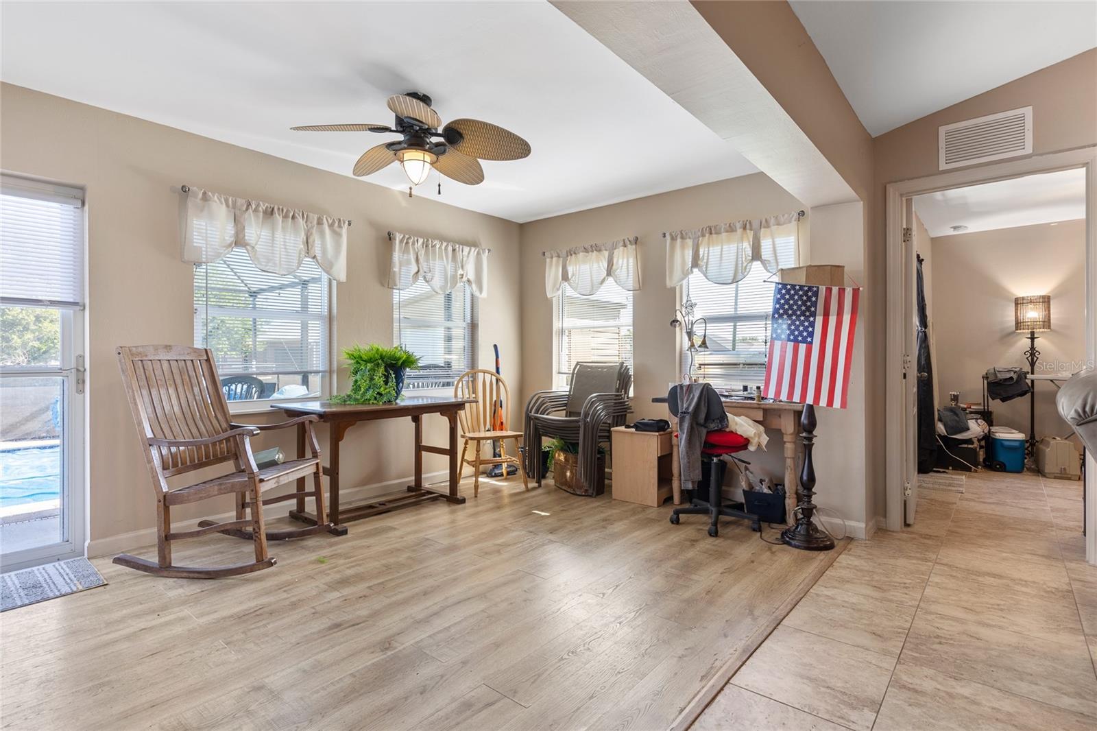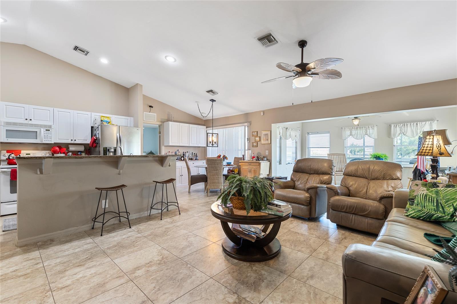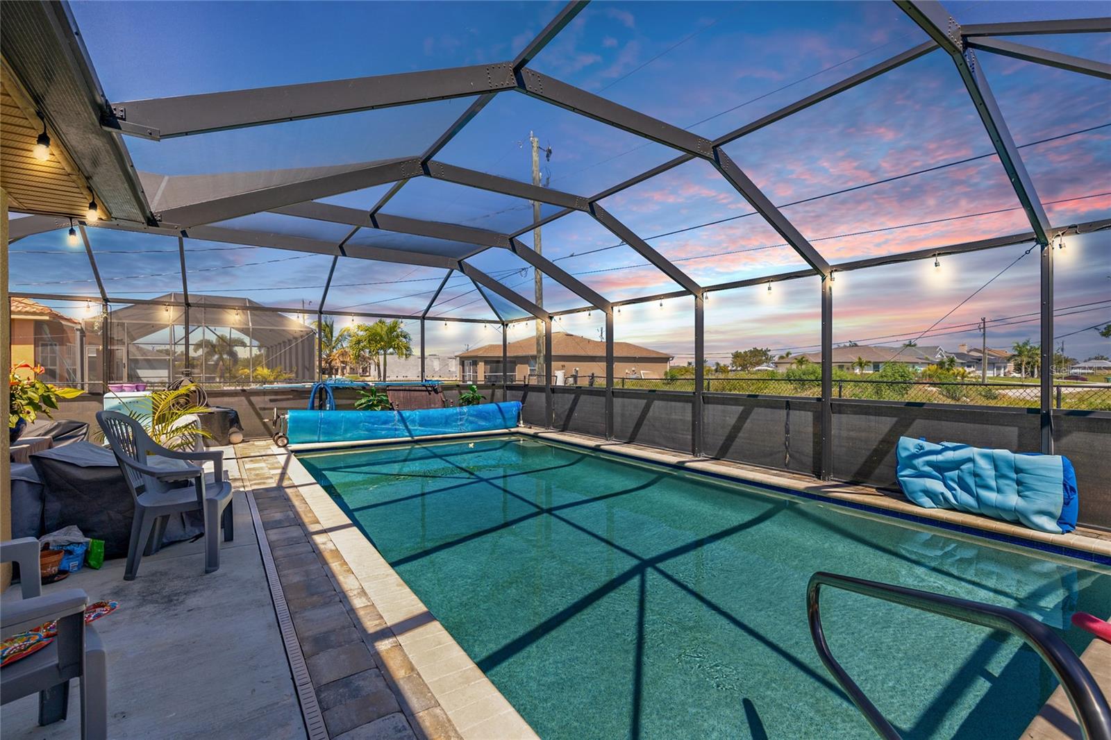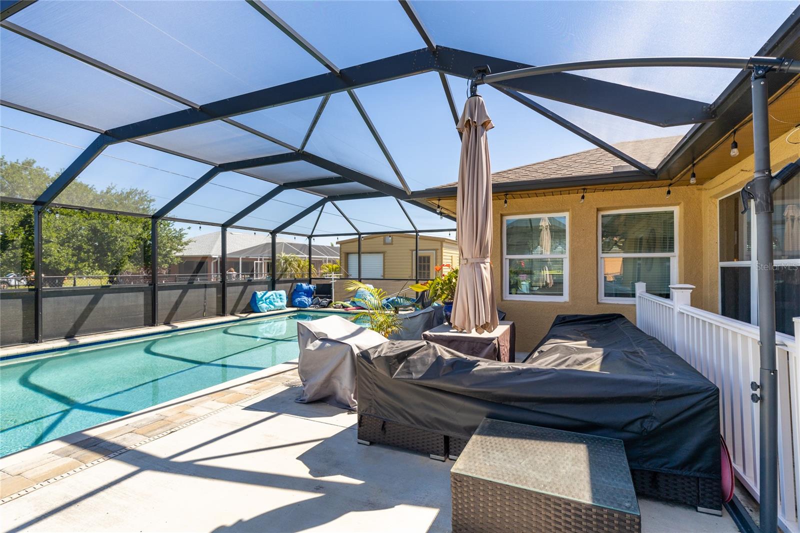 Make sure to check out the Virtual Tour for a 3D Model w/ Walkthrough, Floor Plan w/ Measurements, Video, & more! Looking for your perfect spot in NW Cape Coral - just MINUTES to Pine Island Sound - with a private pool, granite countertops, No HOA, Flood Zone X for NO Required Flood Insurance! AND SOLAR PANELS for UNDER $450K?! Here's your sign! Check out this amazing 3/2/2 pool home with 1458 SF Living, Solar Panels in 2022, pool built in 2020, and a fully fenced yard. Beyond the STUNNING 20'+ tall palm trees you will find a covered entryway leading to your new home (or home away from home!). Immediately to your right upon entry you have a set of glass french doors leading to the office/den/bonus room... as you exit the foyer you're greeted by an open and airy great room w/ vaulted ceilings, kitchen with Bright Cabinetry, stainless appliances, granite countertops w/ breakfast bar, and a separate bar area by the dining space. To the right side of the home, two guest bedrooms share a jack & jill bath and to the left side of the home is your entire master suite w/ walk-in closets and tons of space... and then straight through the living room you've got another bonus room that leads to the screened pool, lanai, and back yard. Have a furry friend? There's already a pet-door built into the wall in the master bedroom, giving them their own lanai access to the fenced back yard! Close to all the restaurants and shopping you could hope for, this is exactly what you've been looking for - Low Cost, Relaxing, Pool, Low Maintenance... did we mention relaxing? Good! ...but don't relax on this fantastic deal - set up your private showing and get your offer in ASAP!