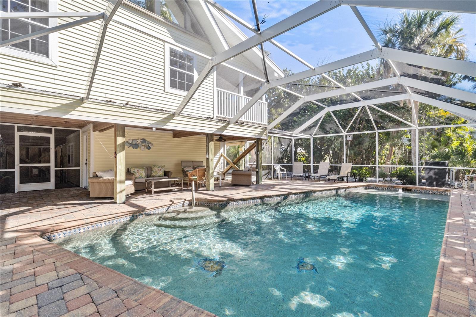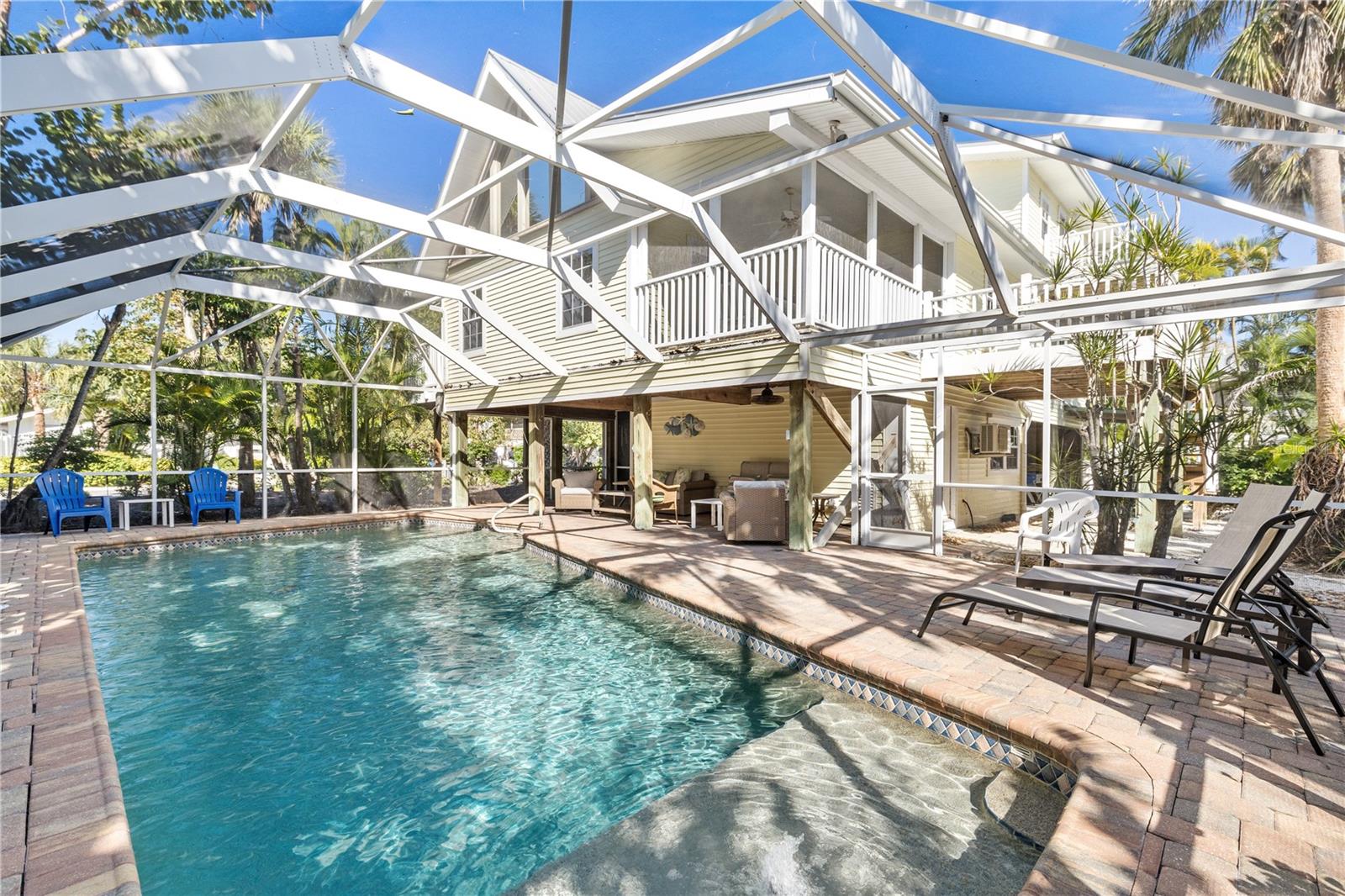 GREAT INVESTMENT OPPORTUNITY OR PRIVATE HOME! ALL BRAND NEW BAER'S LIVING ROOM FURNITURE! Schedule your private showing of "BIRD OF PARADISE!" This is a very successful vacation Rental with scheduled bookings through 2024. Social Media Visitors inquire daily about RENTALS to help support the Islands. This beautiful, turnkey, Chalet style home is spacious and bright with vaulted ceilings. 4 BR/4BA offers privacy for guests. Sleeps 10 with plenty of room for entertainment. The heated pool, pool table (new felt coming.),ping pong table and outside grill offer guests a break from the beach (As if you'd want a break from the beach).The Mucky Duck Sunset is 2 blocks away. Only 2 houses from beach access. This is an amazing home on magnificent Captiva Island. Please watch the video for a full virtual experience. Sellers have made several improvements including, a new roof over the grilling area, kitchen backsplash, kitchen lanai has BRAND NEW LINOLEUM TILE, New guest-room kitchenette, new septic system and irrigation system. New mini split A/C is installed in 4th bedroom. Exterior deck was redone with a solid stain in October 2023. Seeing is believing! This home could be yours.