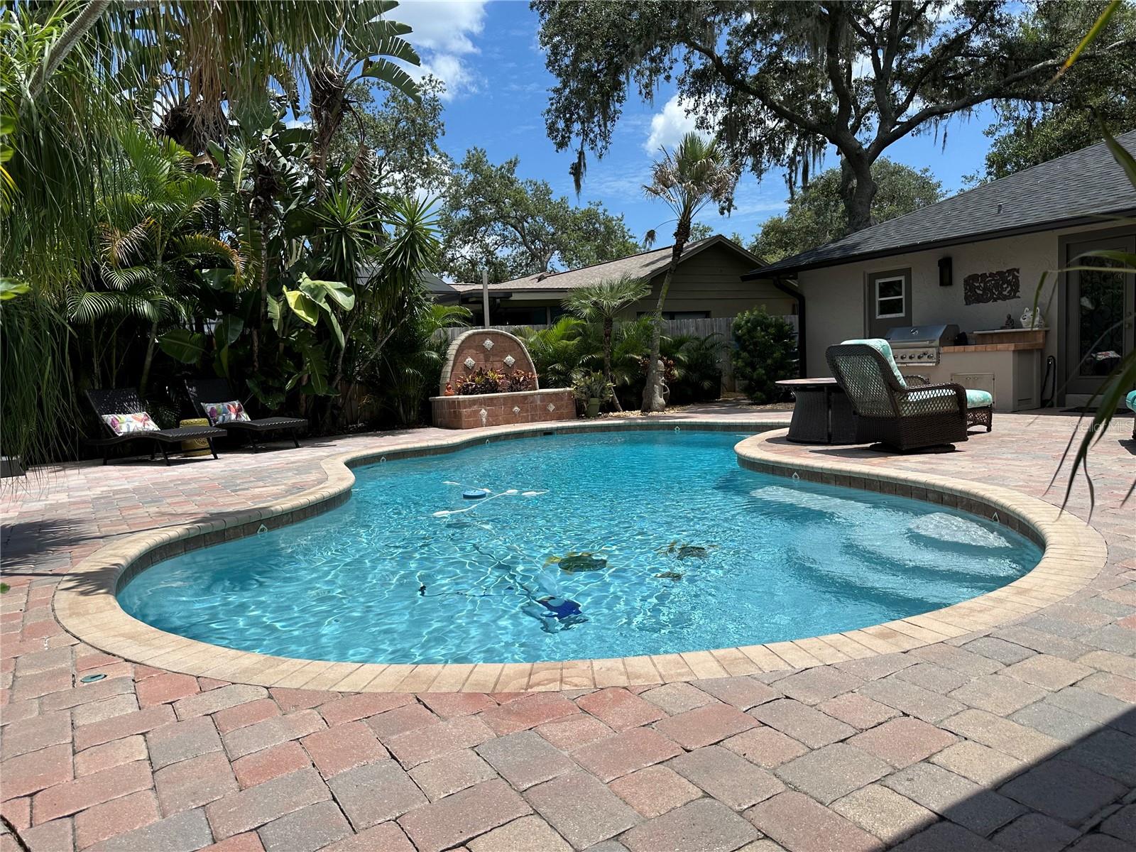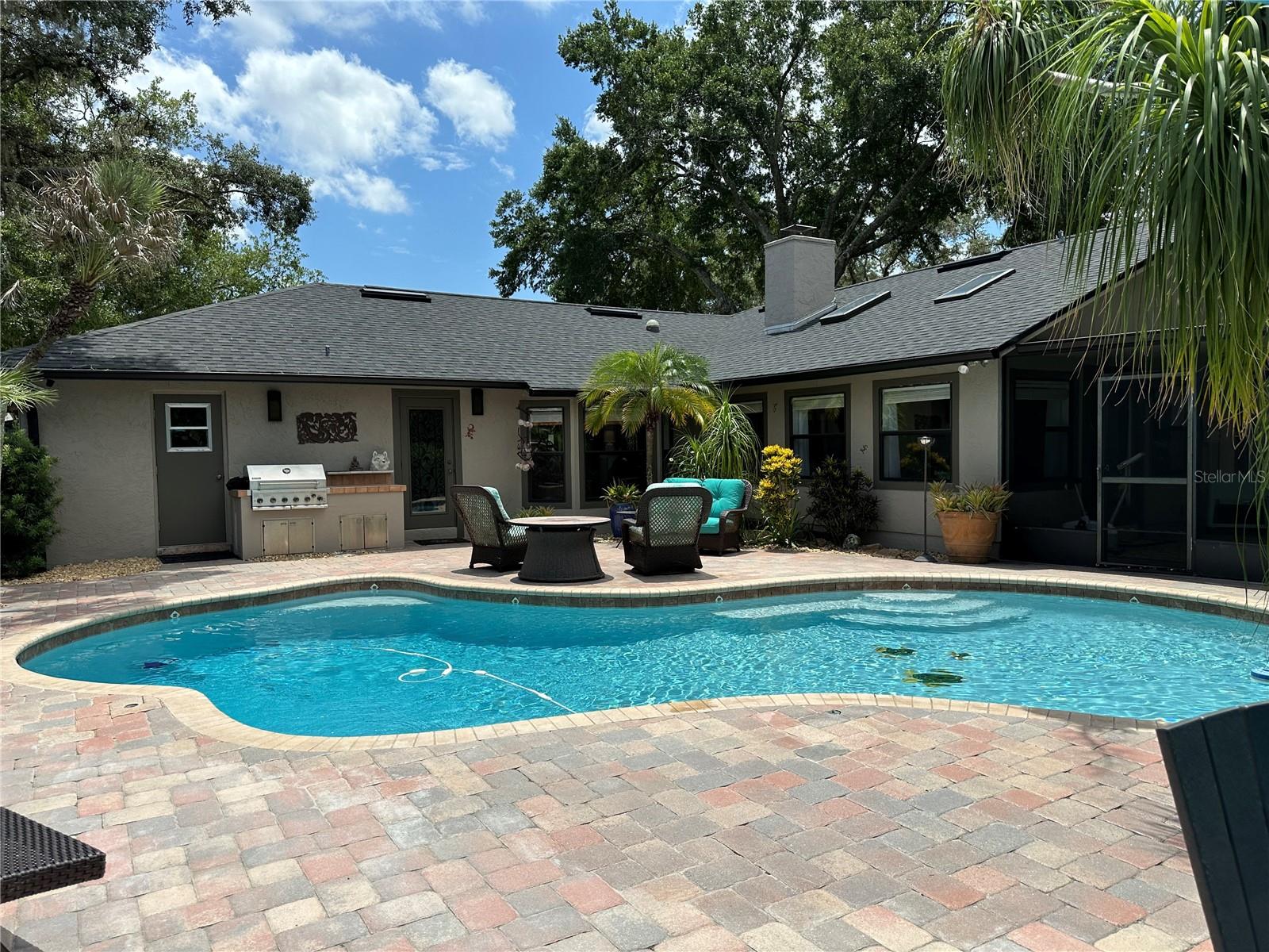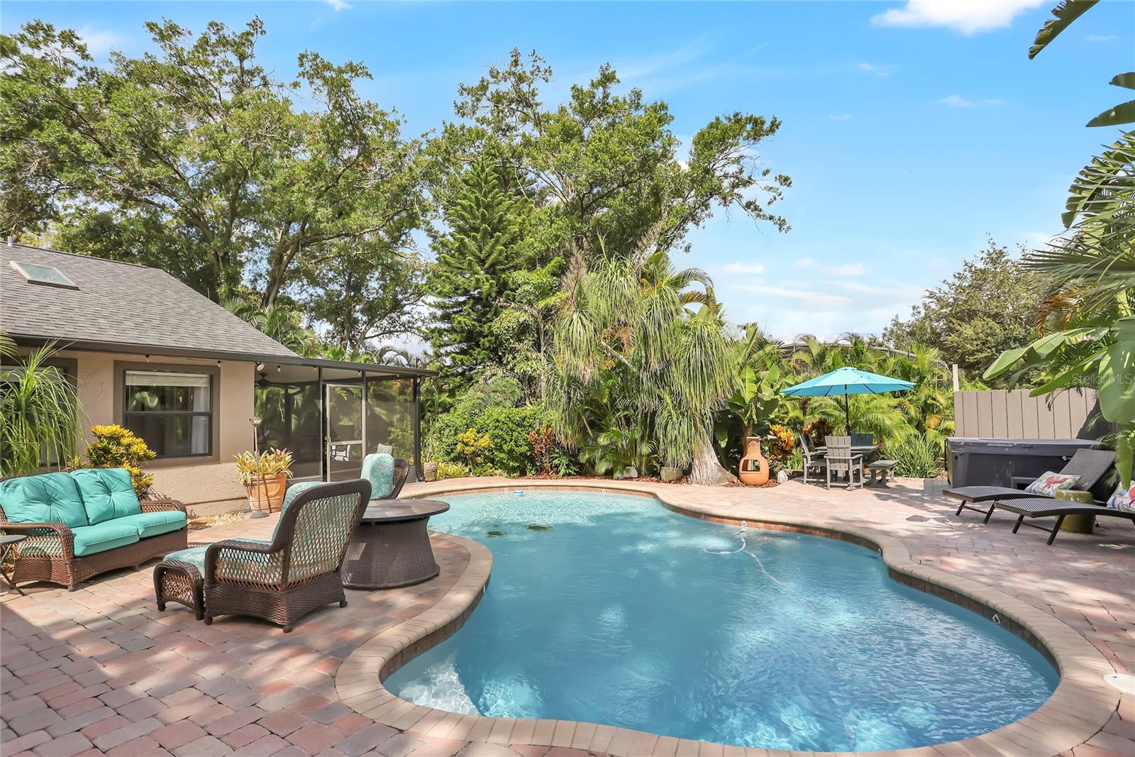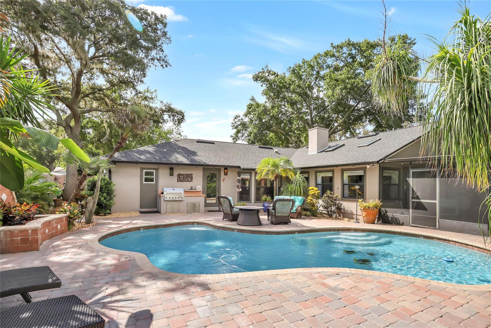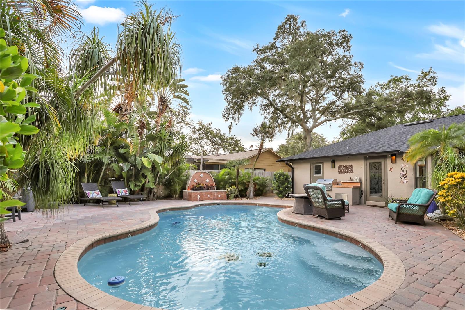 Your PERSONAL OASIS and incredible home await you! Expect to be impressed as you enter and are welcomed by an open floor plan with high ceilings, crown molding, tile floors, brick fireplace, remodeled kitchen to include brand new refrigerator, cherry wood cabinets, granite countertops, and SS appliances. Private home office off the dining room, with glass French doors, allows you to work in quiet with plenty of natural light. A spacious and separate family room/sunroom provides another area for large gatherings for family and friends. Recent renovations to the primary bathroom include ceramic wood-like tile floors, dual sinks and pass through shower off a very large primary bedroom with walk-in closet. Plenty of storage space not only in the oversized garage with built-in workshop but also the large indoor laundry room to include washer and dryer. If that’s not enough, step outside to your entertainer’s delight! Beautiful brick paver patio and walkways, lush landscaping and tropical setting where you can enjoy your recently resurfaced pool with deck jets, new Polaris, surround sound system (that also includes the living room, family room and garage on their own zones), new outdoor grill and a Hot Springs hot tub that is constantly cleaning on its own! A covered screened porch gives you a break from the sun and to get out of the rain and outdoor shed provides a place for all your tools. Roof (2022), AC (2015), Water Heater (2015), replumbed with PVC, newer windows and new gutters. Located within an active, city owned golf course community where you can see wild peacocks on your evening walks! Don’t pass on this home – you won’t be disappointed!