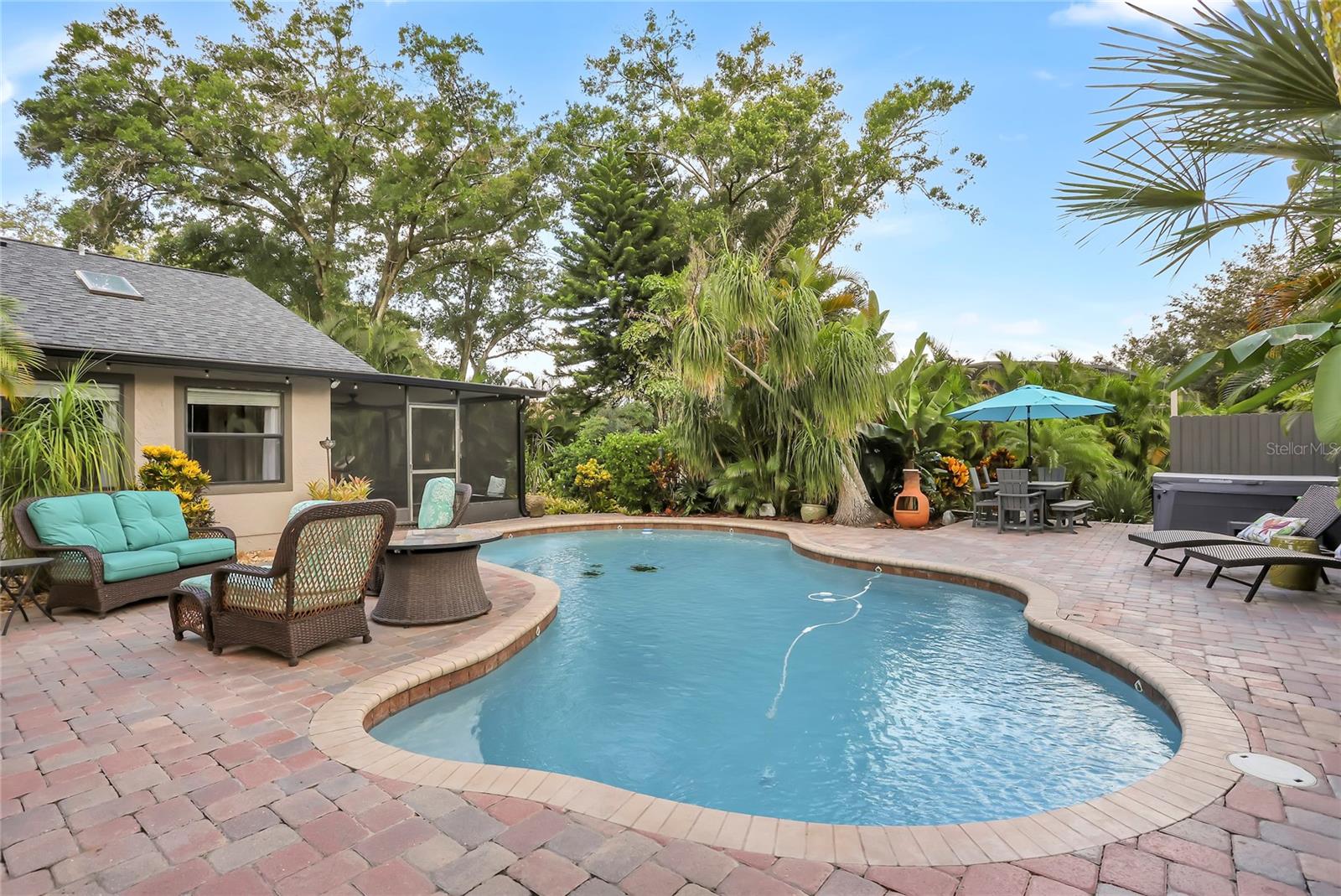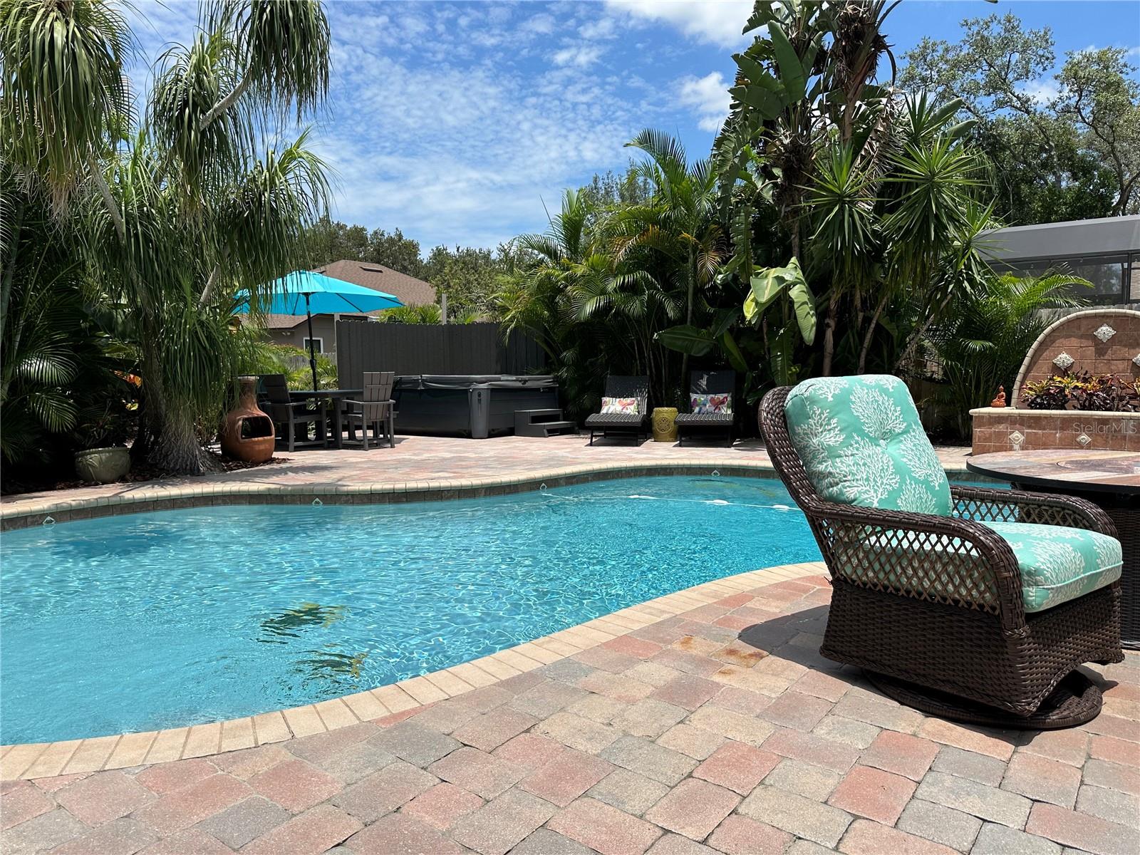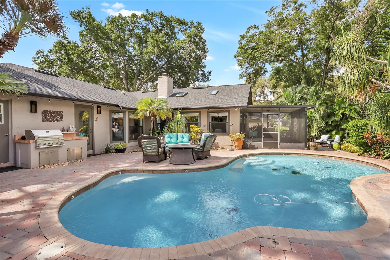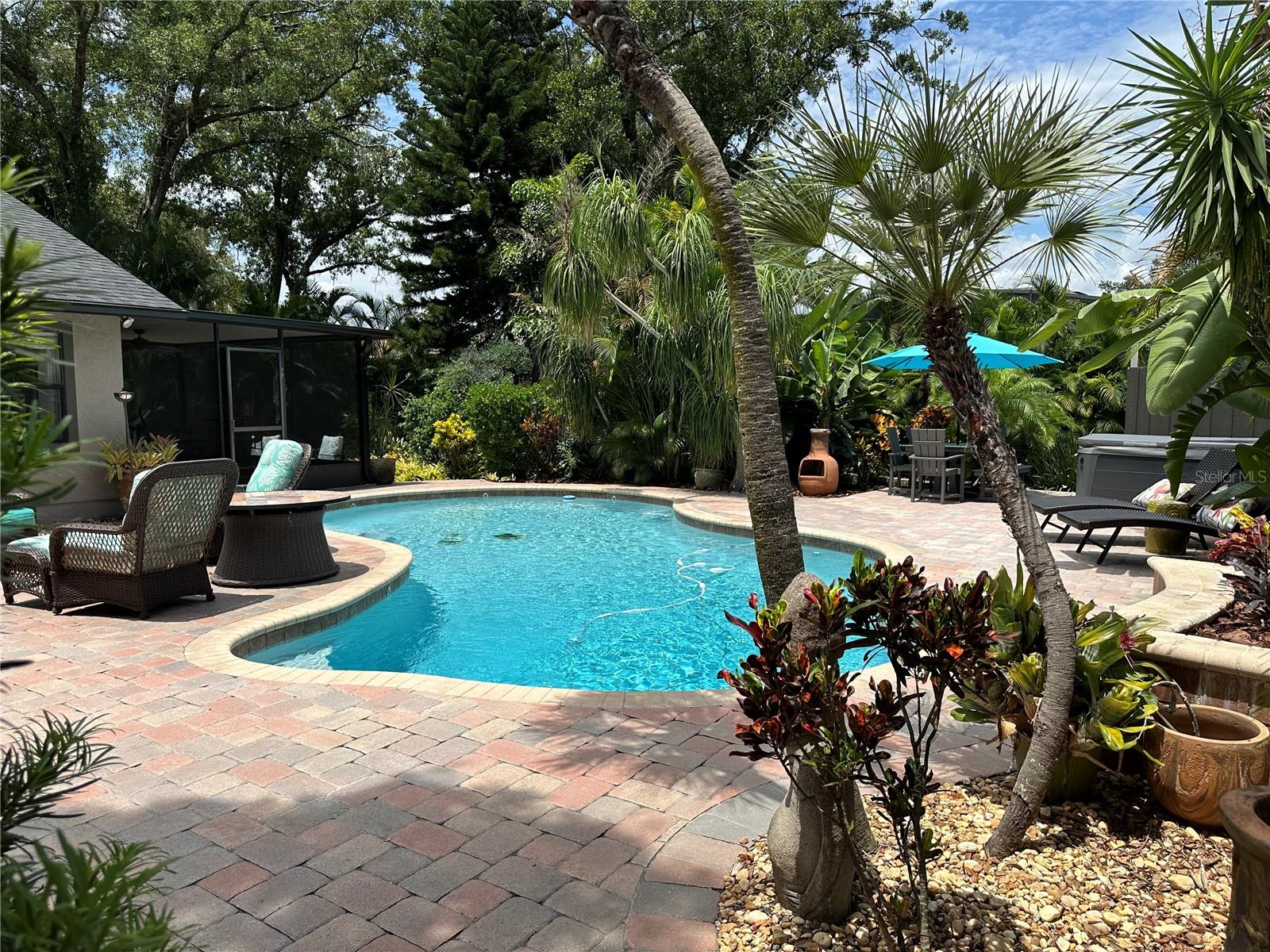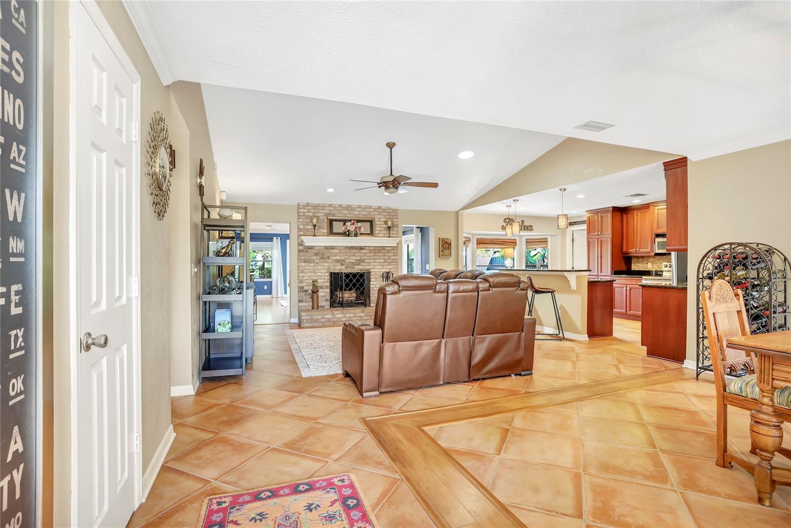 Your PERSONAL OASIS and incredible home await you! Expect to be impressed as you enter and are welcomed by an open floor plan with high ceilings, crown molding, tile floors, brick fireplace, remodeled kitchen to include brand new refrigerator, cherry wood cabinets, granite countertops, and SS appliances. Private home office off the dining room, with glass French doors, allows you to work in quiet with plenty of natural light. A spacious and separate family room/sunroom provides another area for large gatherings for family and friends. Recent renovations to the primary bathroom include ceramic wood-like tile floors, dual sinks and pass through shower off a very large primary bedroom with walk-in closet. Plenty of storage space not only in the oversized garage with built-in workshop but also the large indoor laundry room to include washer and dryer. If that’s not enough, step outside to your entertainer’s delight! Beautiful brick paver patio and walkways, lush landscaping and tropical setting where you can enjoy your recently resurfaced pool with deck jets, new Polaris, surround sound system (that also includes the living room, family room and garage on their own zones), new outdoor grill and a Hot Springs hot tub that is constantly cleaning on its own! A covered screened porch gives you a break from the sun and to get out of the rain and outdoor shed provides a place for all your tools. Roof (2022), AC (2015), Water Heater (2015), replumbed with PVC, newer windows and new gutters. Located within an active, city owned golf course community where you can see wild peacocks on your evening walks! Don’t pass on this home – you won’t be disappointed!