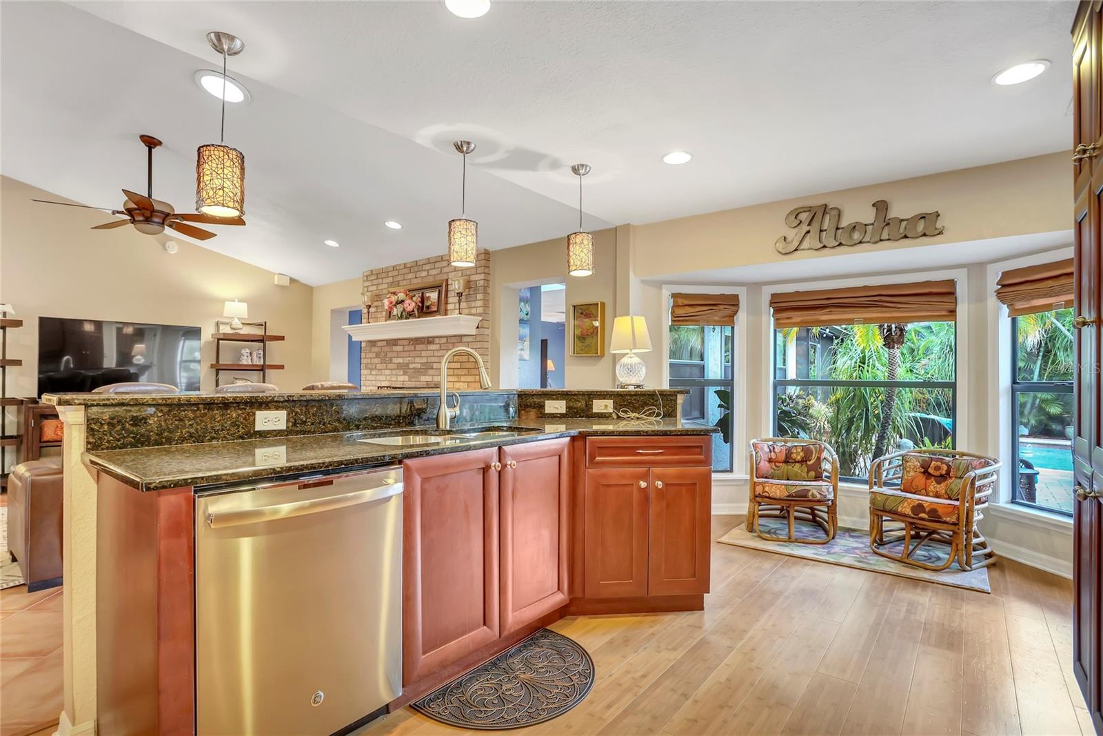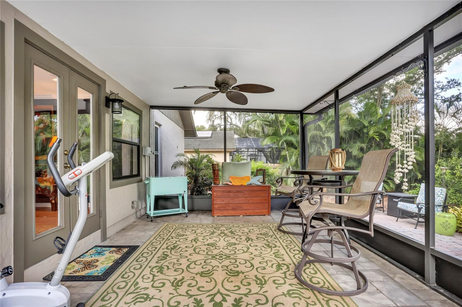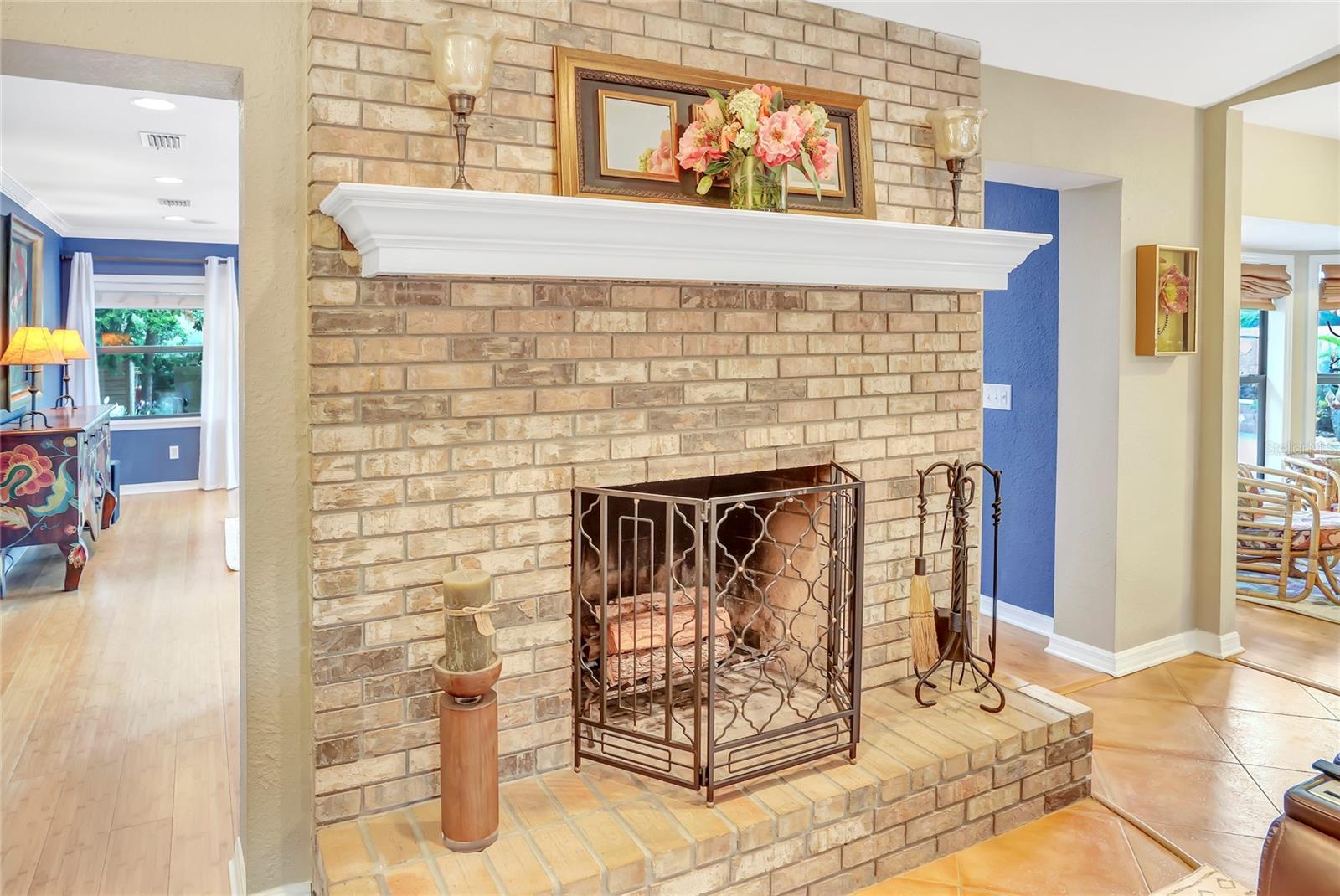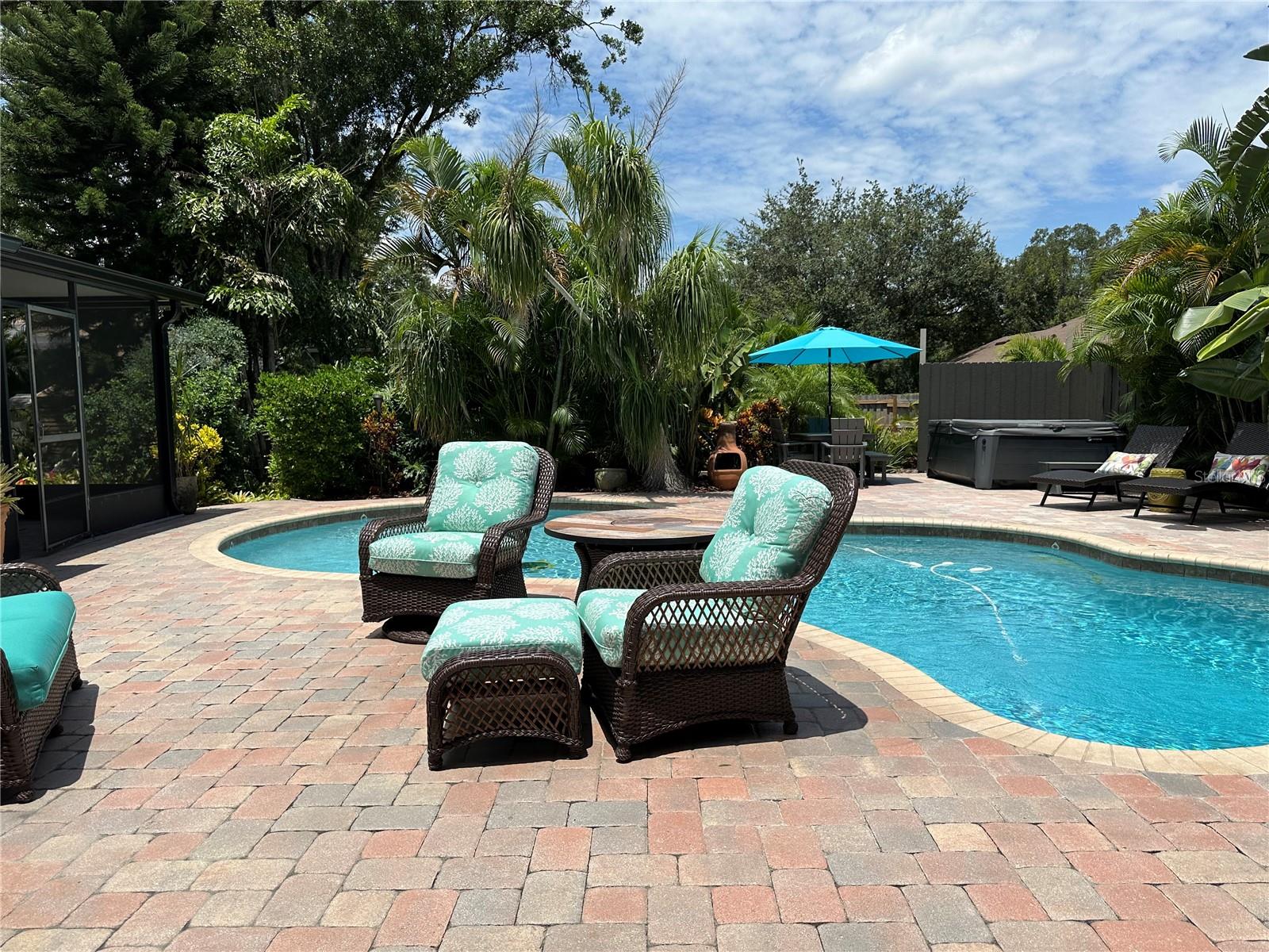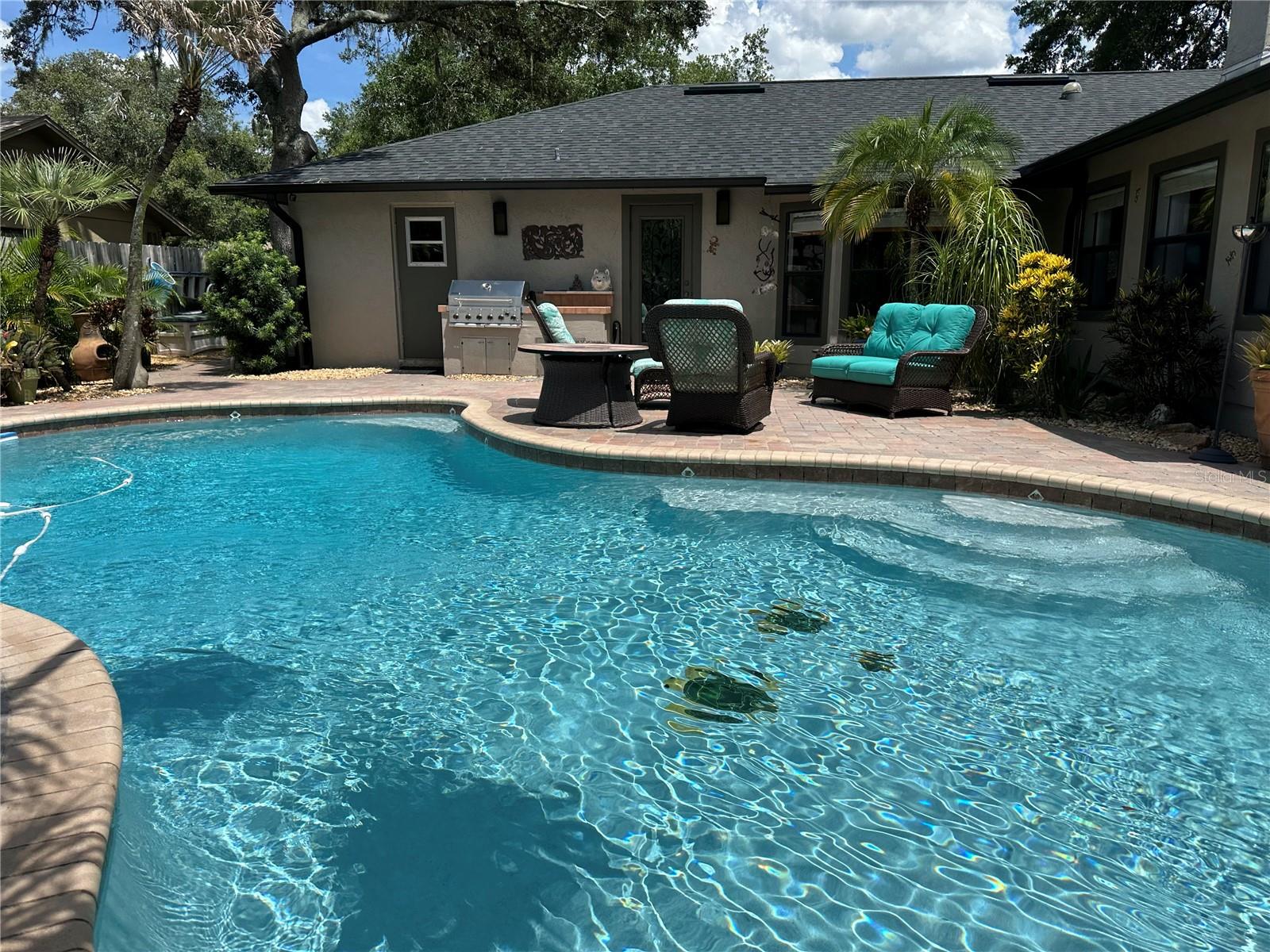 Your PERSONAL OASIS and incredible home await you! Expect to be impressed as you enter and are welcomed by an open floor plan with high ceilings, crown molding, tile floors, brick fireplace, remodeled kitchen to include brand new refrigerator, cherry wood cabinets, granite countertops, and SS appliances. Private home office off the dining room, with glass French doors, allows you to work in quiet with plenty of natural light. A spacious and separate family room/sunroom provides another area for large gatherings for family and friends. Recent renovations to the primary bathroom include ceramic wood-like tile floors, dual sinks and pass through shower off a very large primary bedroom with walk-in closet. Plenty of storage space not only in the oversized garage with built-in workshop but also the large indoor laundry room to include washer and dryer. If that’s not enough, step outside to your entertainer’s delight! Beautiful brick paver patio and walkways, lush landscaping and tropical setting where you can enjoy your recently resurfaced pool with deck jets, new Polaris, surround sound system (that also includes the living room, family room and garage on their own zones), new outdoor grill and a Hot Springs hot tub that is constantly cleaning on its own! A covered screened porch gives you a break from the sun and to get out of the rain and outdoor shed provides a place for all your tools. Roof (2022), AC (2015), Water Heater (2015), replumbed with PVC, newer windows and new gutters. Located within an active, city owned golf course community where you can see wild peacocks on your evening walks! Don’t pass on this home – you won’t be disappointed!