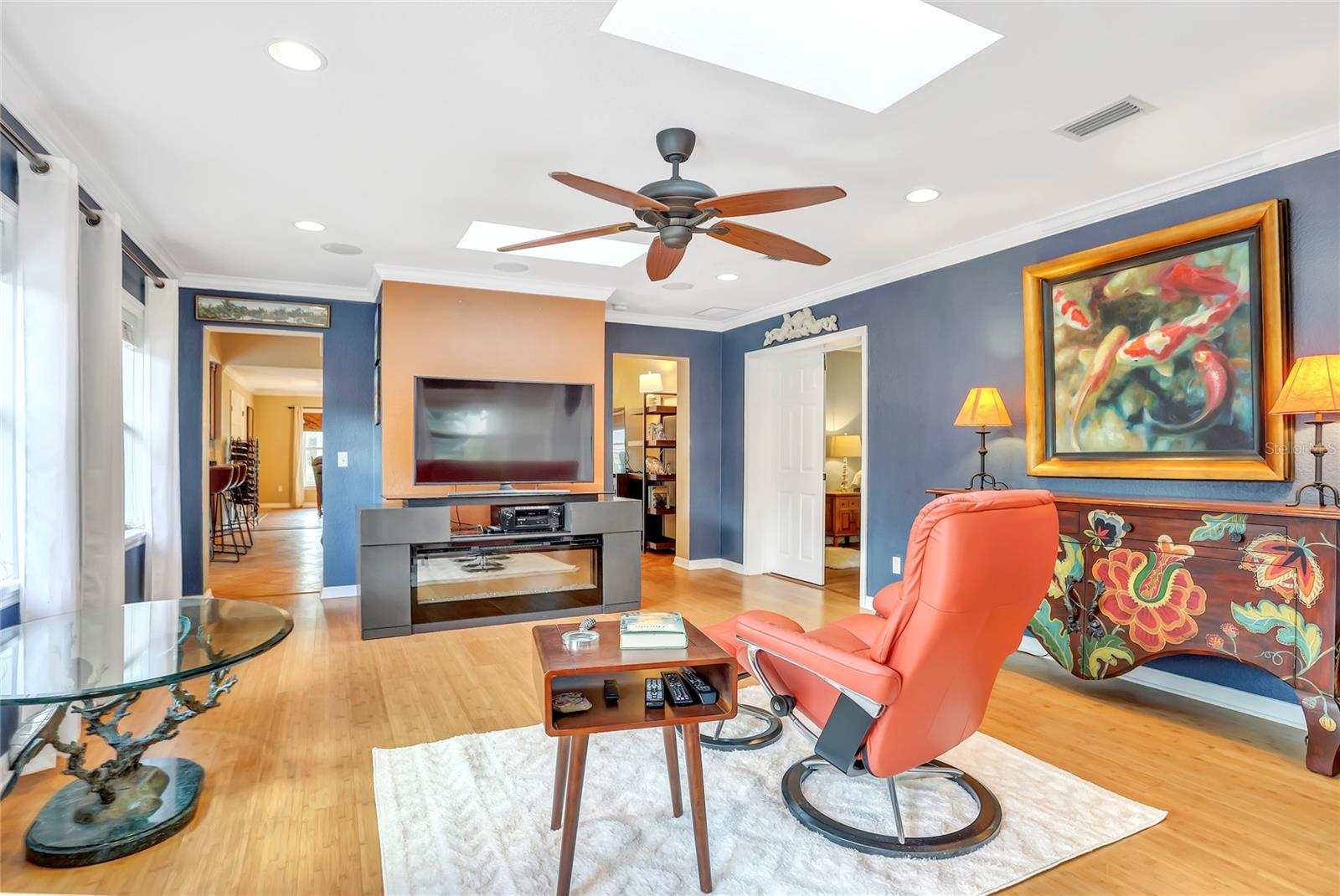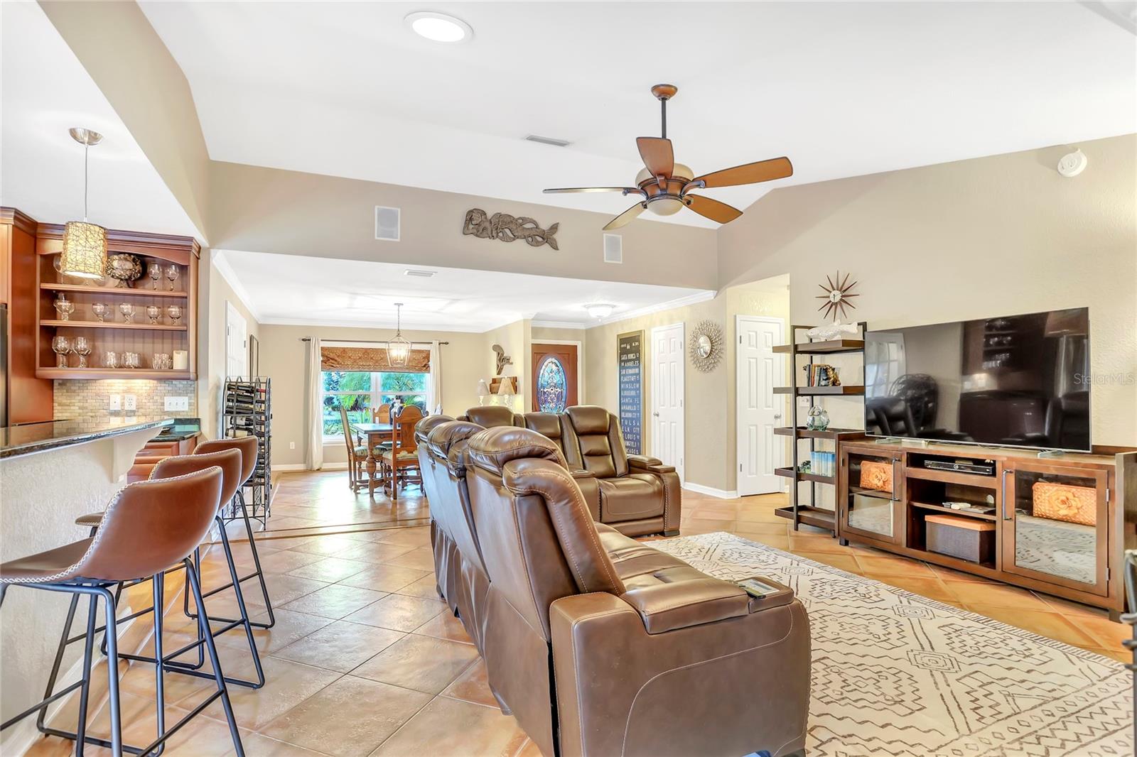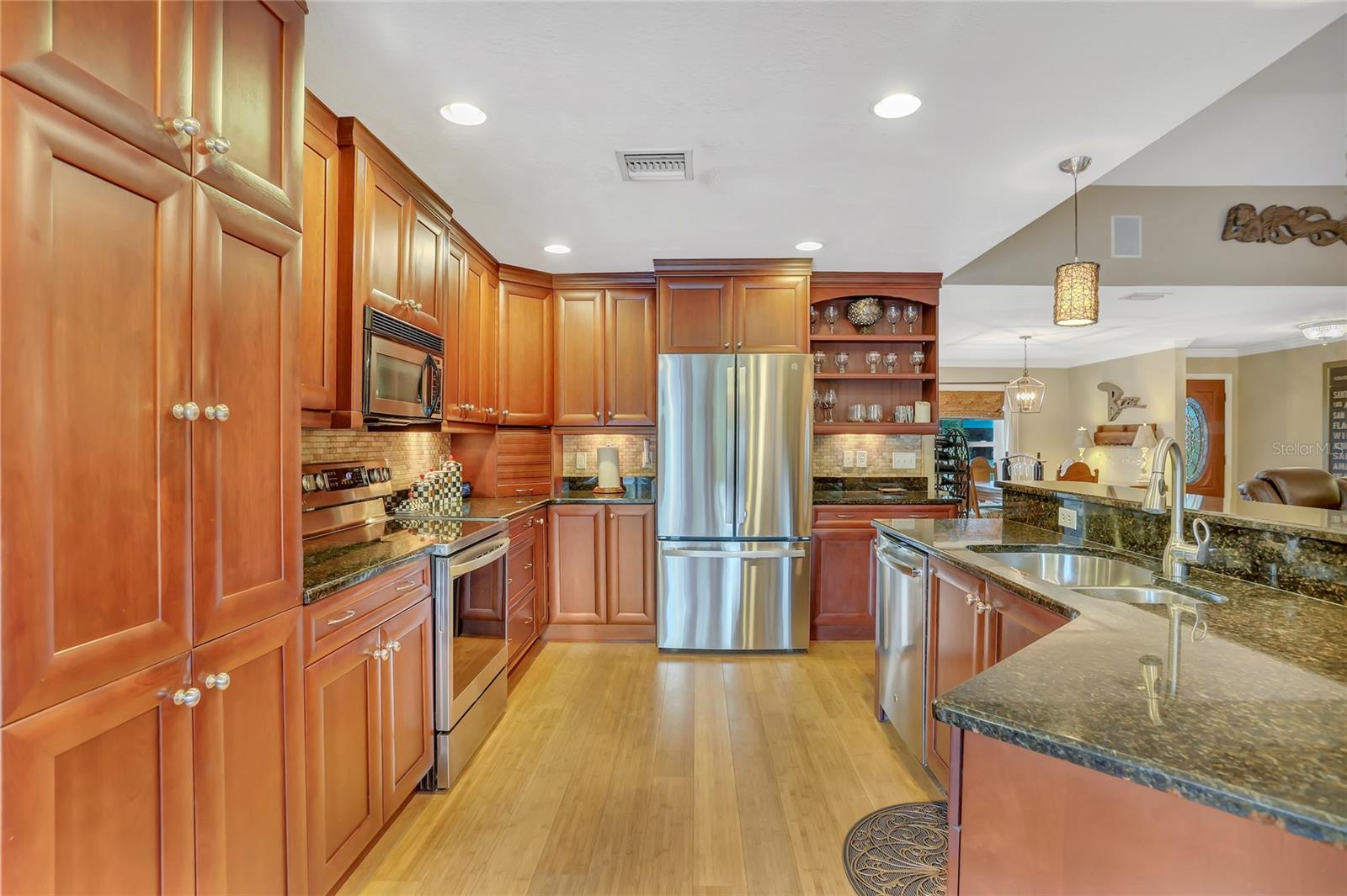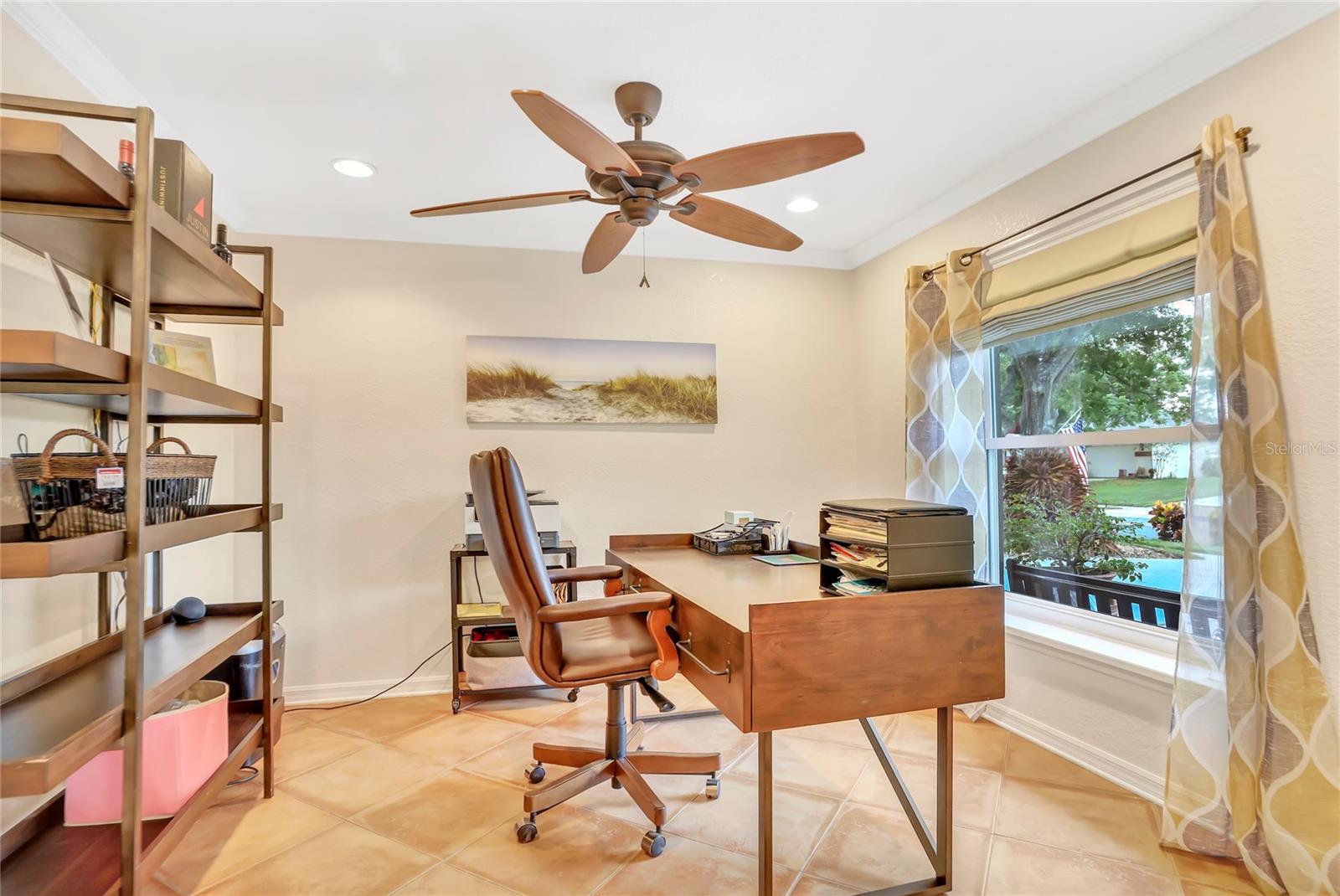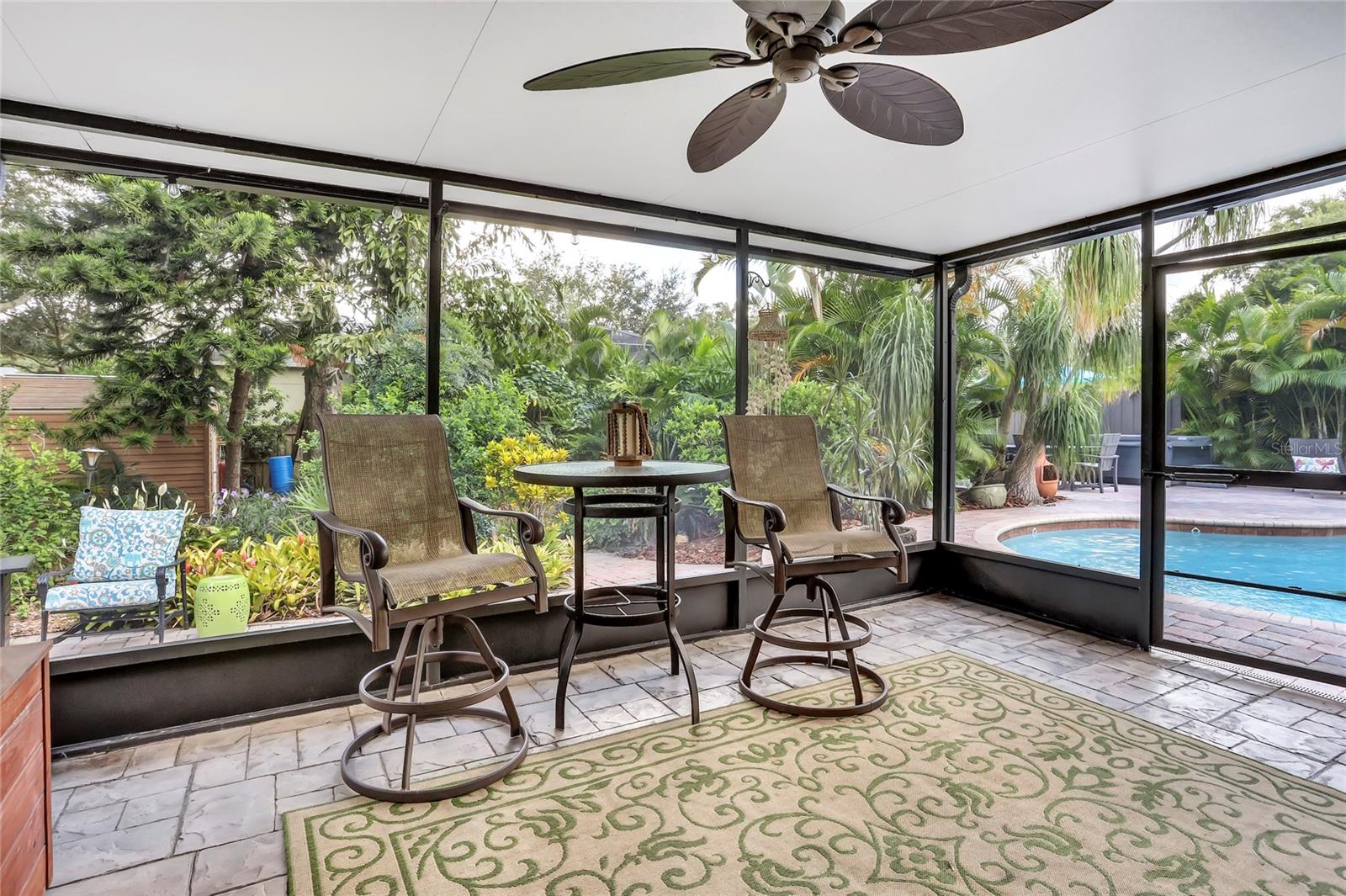 Your PERSONAL OASIS and incredible home await you! Expect to be impressed as you enter and are welcomed by an open floor plan with high ceilings, crown molding, tile floors, brick fireplace, remodeled kitchen to include brand new refrigerator, cherry wood cabinets, granite countertops, and SS appliances. Private home office off the dining room, with glass French doors, allows you to work in quiet with plenty of natural light. A spacious and separate family room/sunroom provides another area for large gatherings for family and friends. Recent renovations to the primary bathroom include ceramic wood-like tile floors, dual sinks and pass through shower off a very large primary bedroom with walk-in closet. Plenty of storage space not only in the oversized garage with built-in workshop but also the large indoor laundry room to include washer and dryer. If that’s not enough, step outside to your entertainer’s delight! Beautiful brick paver patio and walkways, lush landscaping and tropical setting where you can enjoy your recently resurfaced pool with deck jets, new Polaris, surround sound system (that also includes the living room, family room and garage on their own zones), new outdoor grill and a Hot Springs hot tub that is constantly cleaning on its own! A covered screened porch gives you a break from the sun and to get out of the rain and outdoor shed provides a place for all your tools. Roof (2022), AC (2015), Water Heater (2015), replumbed with PVC, newer windows and new gutters. Located within an active, city owned golf course community where you can see wild peacocks on your evening walks! Don’t pass on this home – you won’t be disappointed!