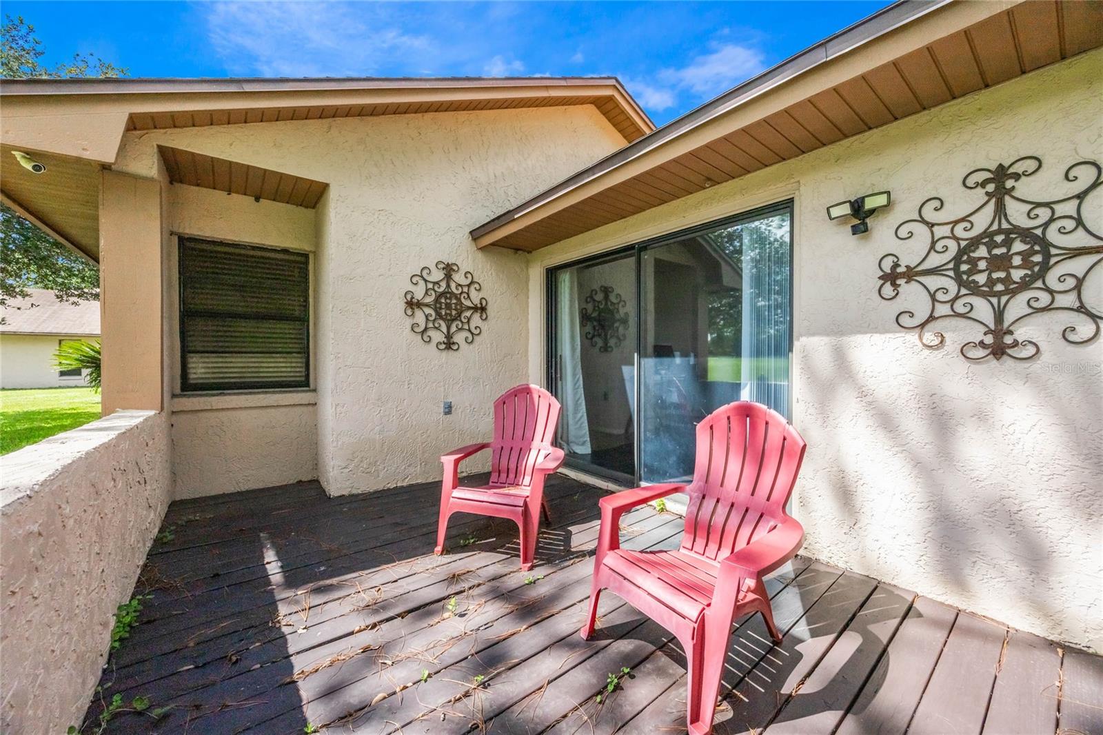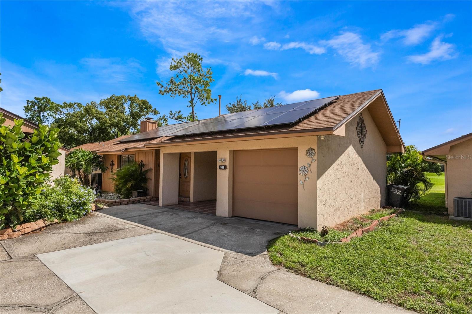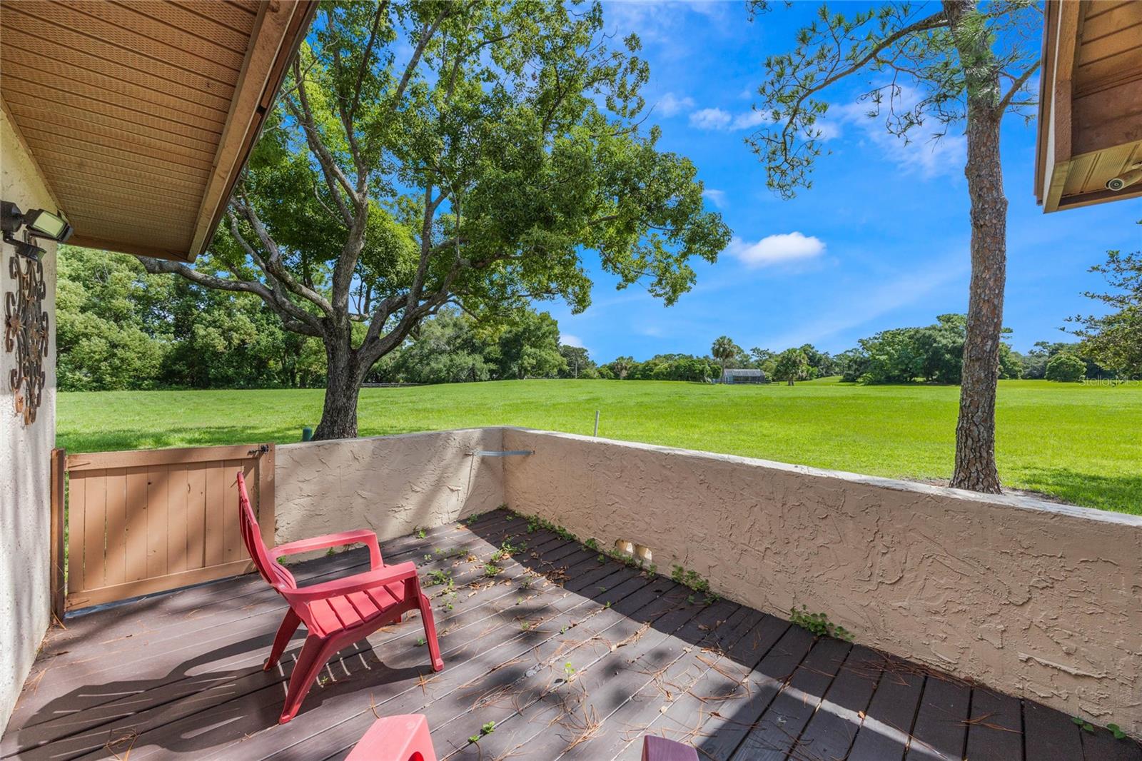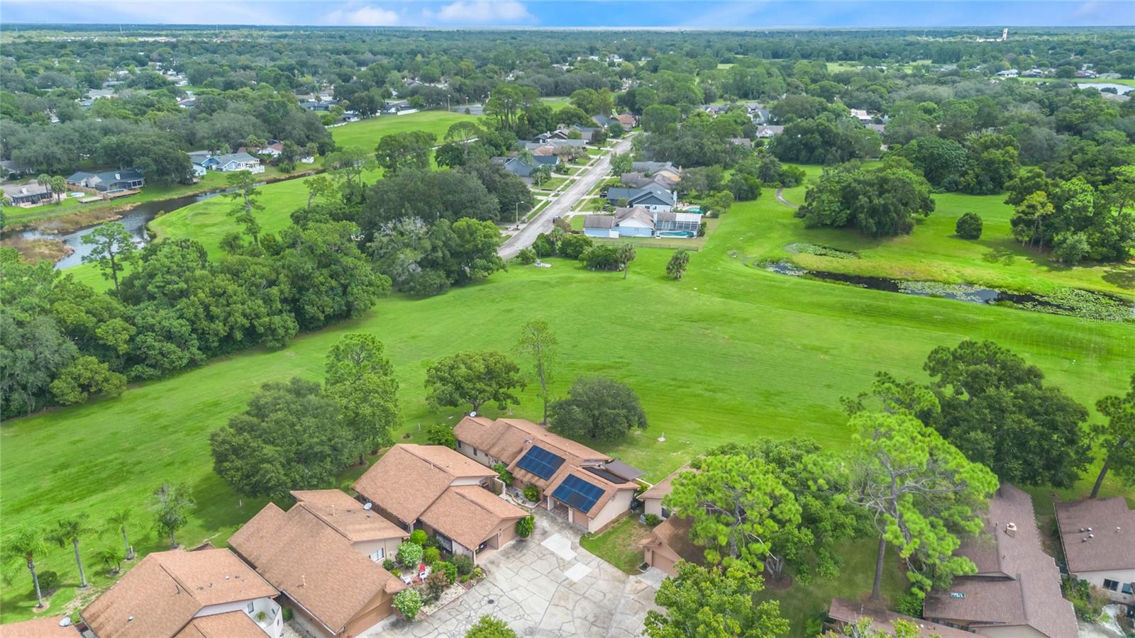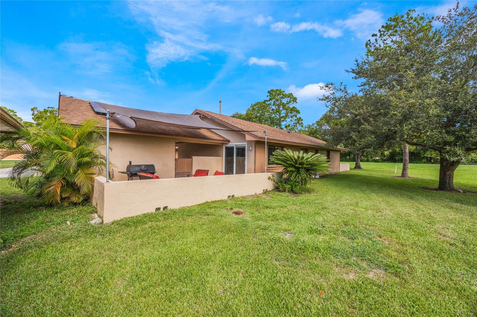 No Rear Neighbors with Open Grassy Views! This 3-bedroom, 2-bathroom home in the Deer Run Community offers a peaceful setting with no rear neighbors and direct views of an open park, with a private patio connected to the primary bedroom. Inside, the living area offers an open floorplan with a gas fireplace and built-in shelving. The adjacent dining area includes a convenient office nook for additional workspace. The kitchen is equipped with stainless-steel appliances, a gas range, and a farm-style sink. Enjoy the views from the primary ensuite featuring vaulted ceilings with exposed wood beams, direct access to a private patio and walk in closet. Two additional bedrooms share a second bathroom. Outside, enjoy views of the expansive green space from the second patio, which includes sun shading for comfort. Recent updates include a new air conditioning system and water filtration system installed in 2024. Solar panels are installed for energy efficiency. The property also includes a detached garage with carport, providing parking and storage. The Deer Run community offers a community pool and is conveniently located near parks, schools, shopping, and dining with close proximity to Maitland and Winter Park.