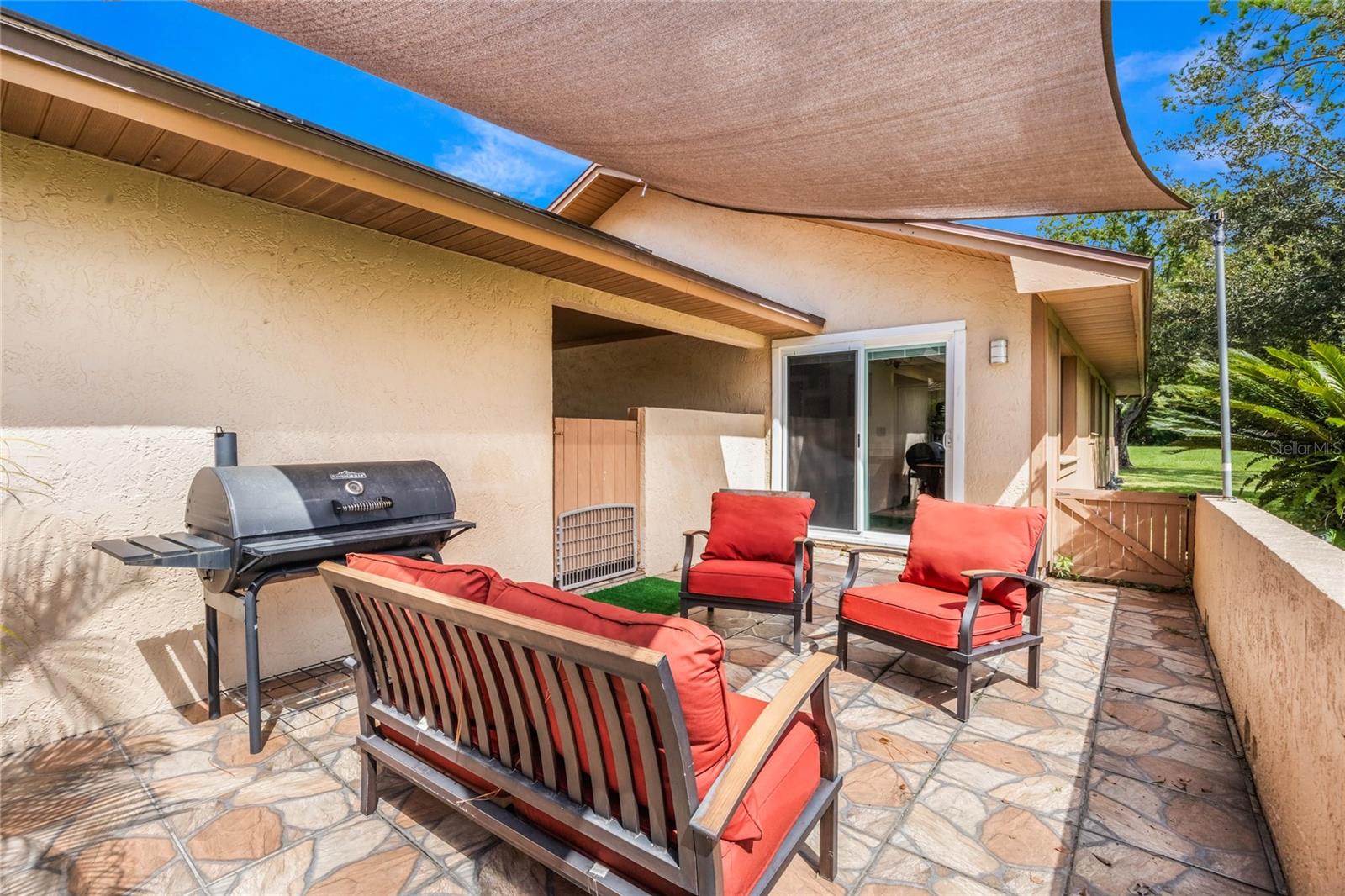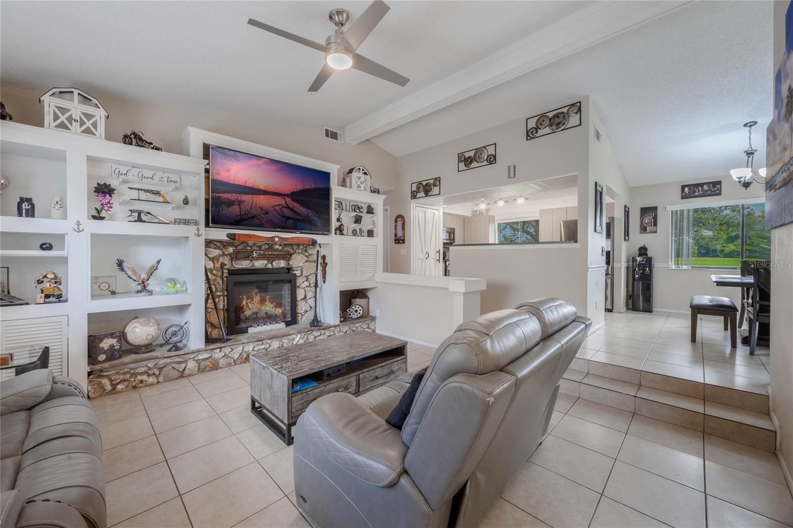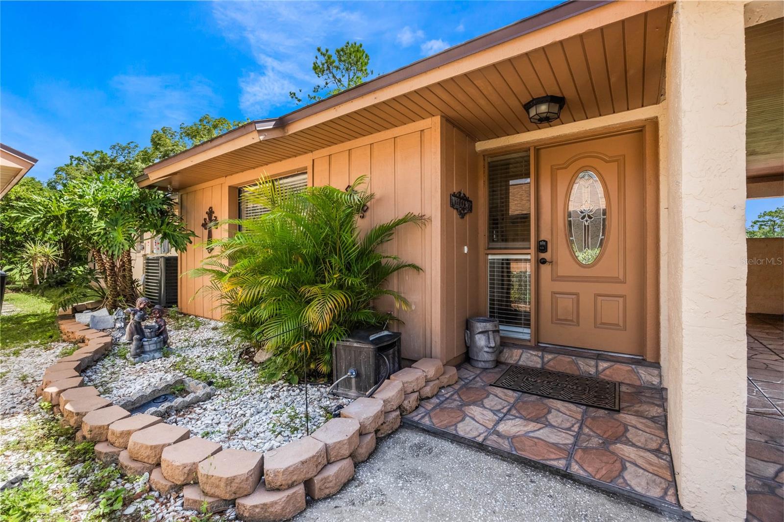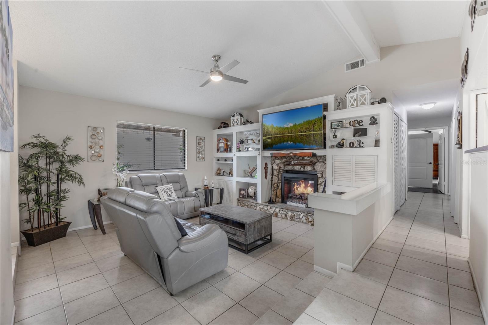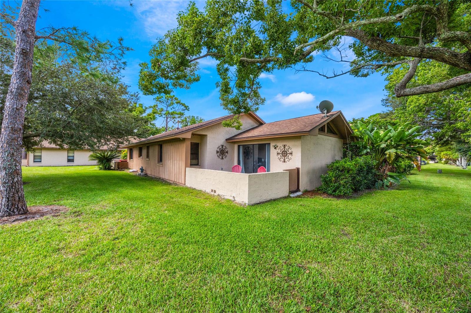 No Rear Neighbors with Open Grassy Views! This 3-bedroom, 2-bathroom home in the Deer Run Community offers a peaceful setting with no rear neighbors and direct views of an open park, with a private patio connected to the primary bedroom. Inside, the living area offers an open floorplan with a gas fireplace and built-in shelving. The adjacent dining area includes a convenient office nook for additional workspace. The kitchen is equipped with stainless-steel appliances, a gas range, and a farm-style sink. Enjoy the views from the primary ensuite featuring vaulted ceilings with exposed wood beams, direct access to a private patio and walk in closet. Two additional bedrooms share a second bathroom. Outside, enjoy views of the expansive green space from the second patio, which includes sun shading for comfort. Recent updates include a new air conditioning system and water filtration system installed in 2024. Solar panels are installed for energy efficiency. The property also includes a detached garage with carport, providing parking and storage. The Deer Run community offers a community pool and is conveniently located near parks, schools, shopping, and dining with close proximity to Maitland and Winter Park.