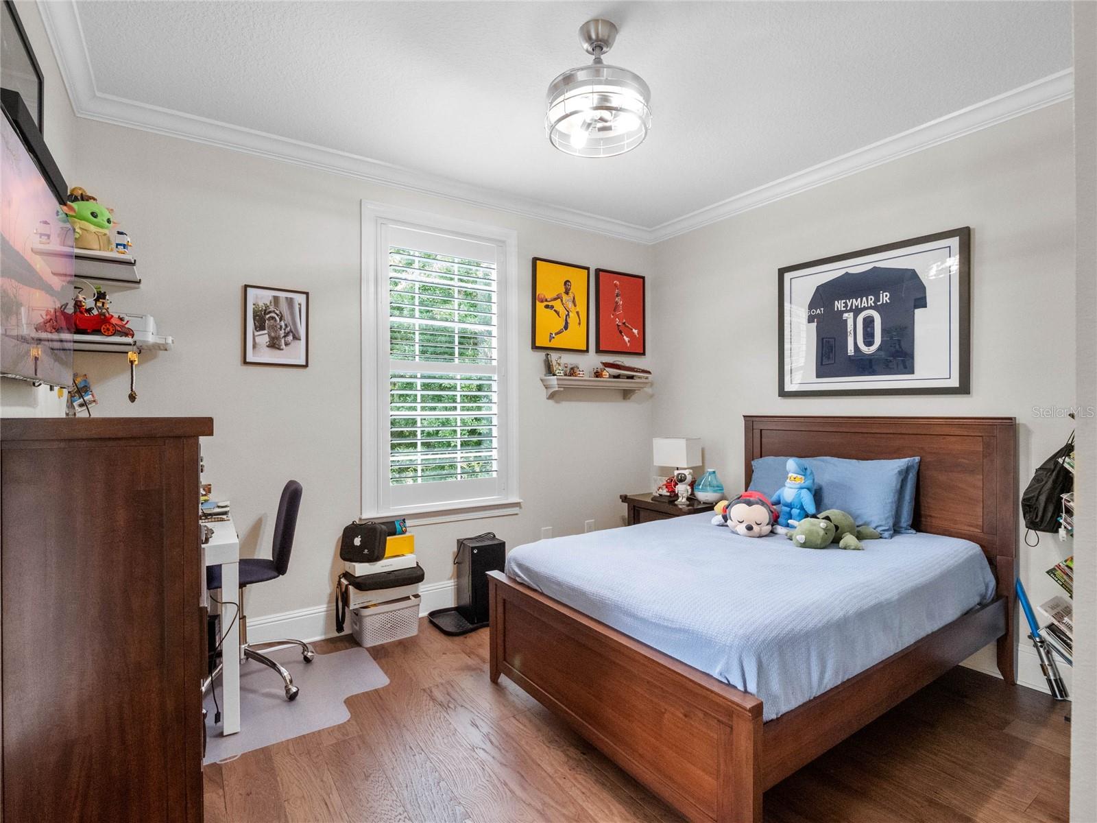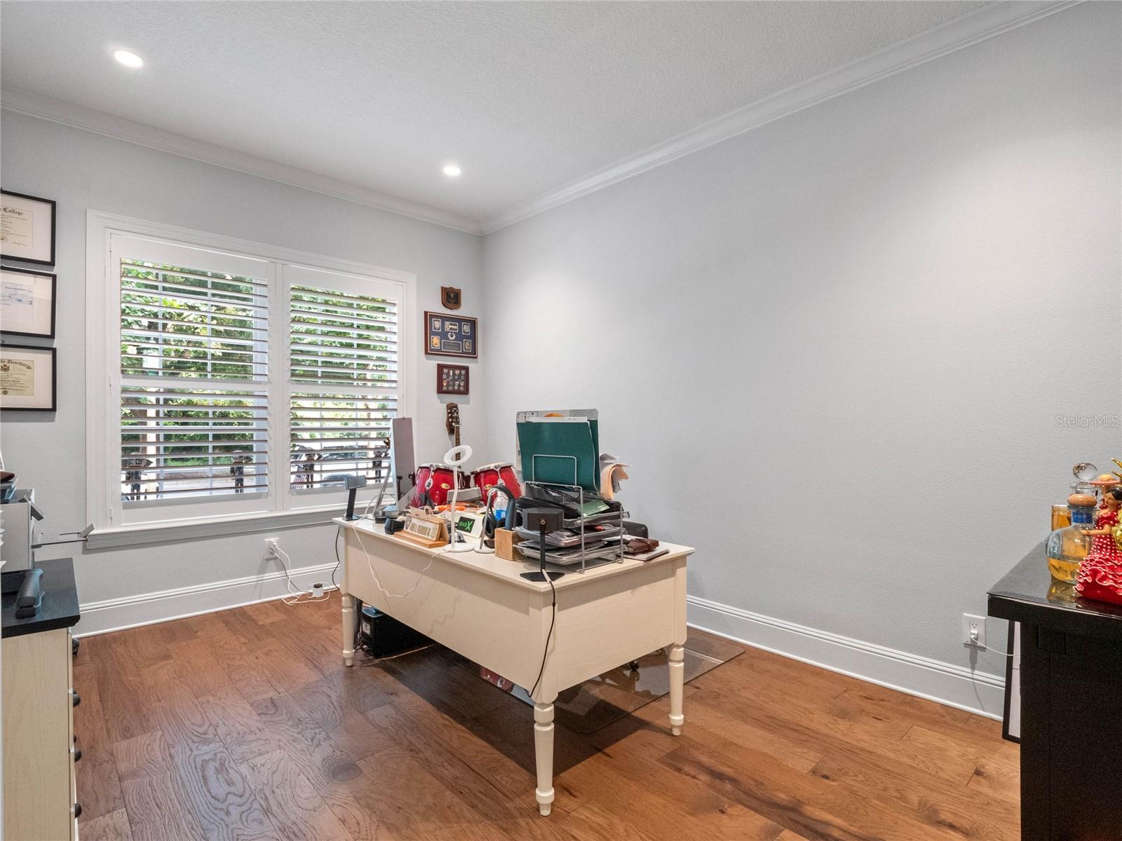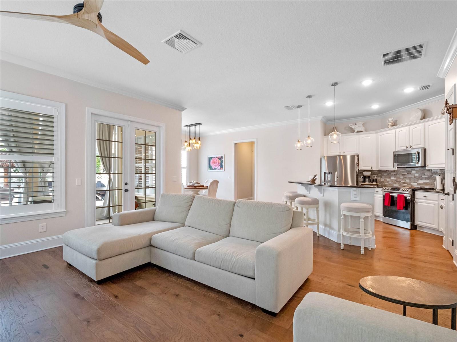 Comfort meets elegance in this spacious 4-bedroom, 3.5-bathroom, 3-car garage Artisan Park home situated on an oversized, professionally landscaped lot. Extensively upgraded in 2018 this home is a must see. Notable features in the home include spacious first floor master, high-end hickory wood floors throughout, staircase rebuilt in 2018, premium hardware and hinges on all interior doors, interior and exterior ceiling fans, crown molding on the first & second floors, 7-inch baseboards, high ceilings, high end custom plantation shutters including all exterior doors, stainless steel kitchen appliances, professionally painted (white) cherry cabinets in kitchen and bathrooms (with under-lighting in kitchen), stone backsplash, granite counter tops, custom closets, premium A/C units - 2018 (with 16 seer, UV lights, and humidity control), remote control blind in window at staircase landing, all bathrooms upgraded with new fixtures and hardware in 2018, and air conditioned garage. Ownership includes exclusive resident access to the Artisan Park Clubhouse with benefits including a fitness center, resort style swimming pool and spa, billiards room, outdoor kitchen, restaurant/bar, plus banquet room. Celebration, FL is a residential community where families can enjoy parks, playgrounds, community pools and expansive nature trails, over 26 miles of walking/biking trails and an abundant venue of entertainment and elegant dining options right in town - they are all yours to luxuriate in from sun up to sun down!