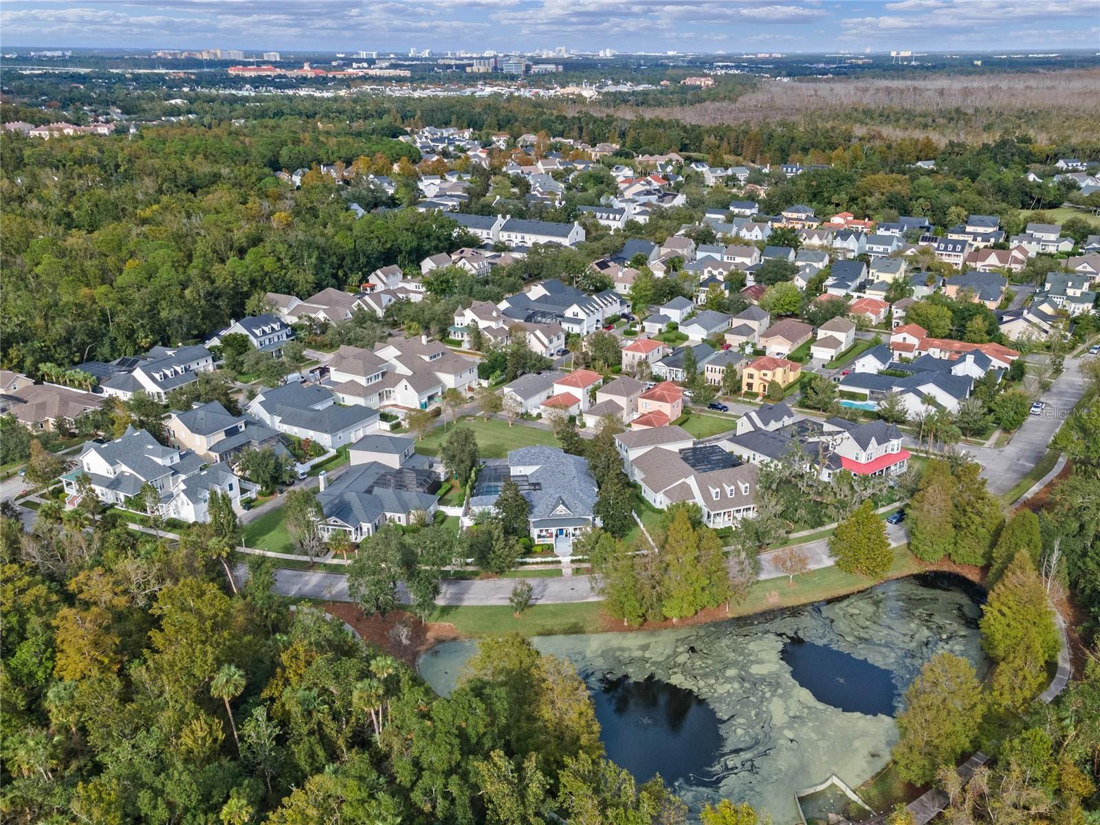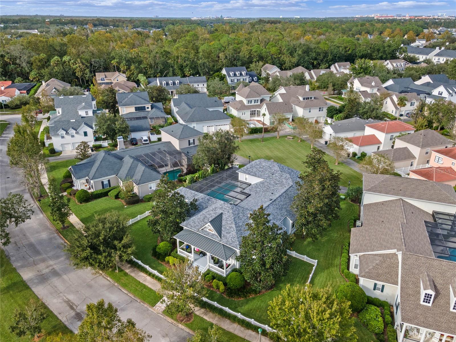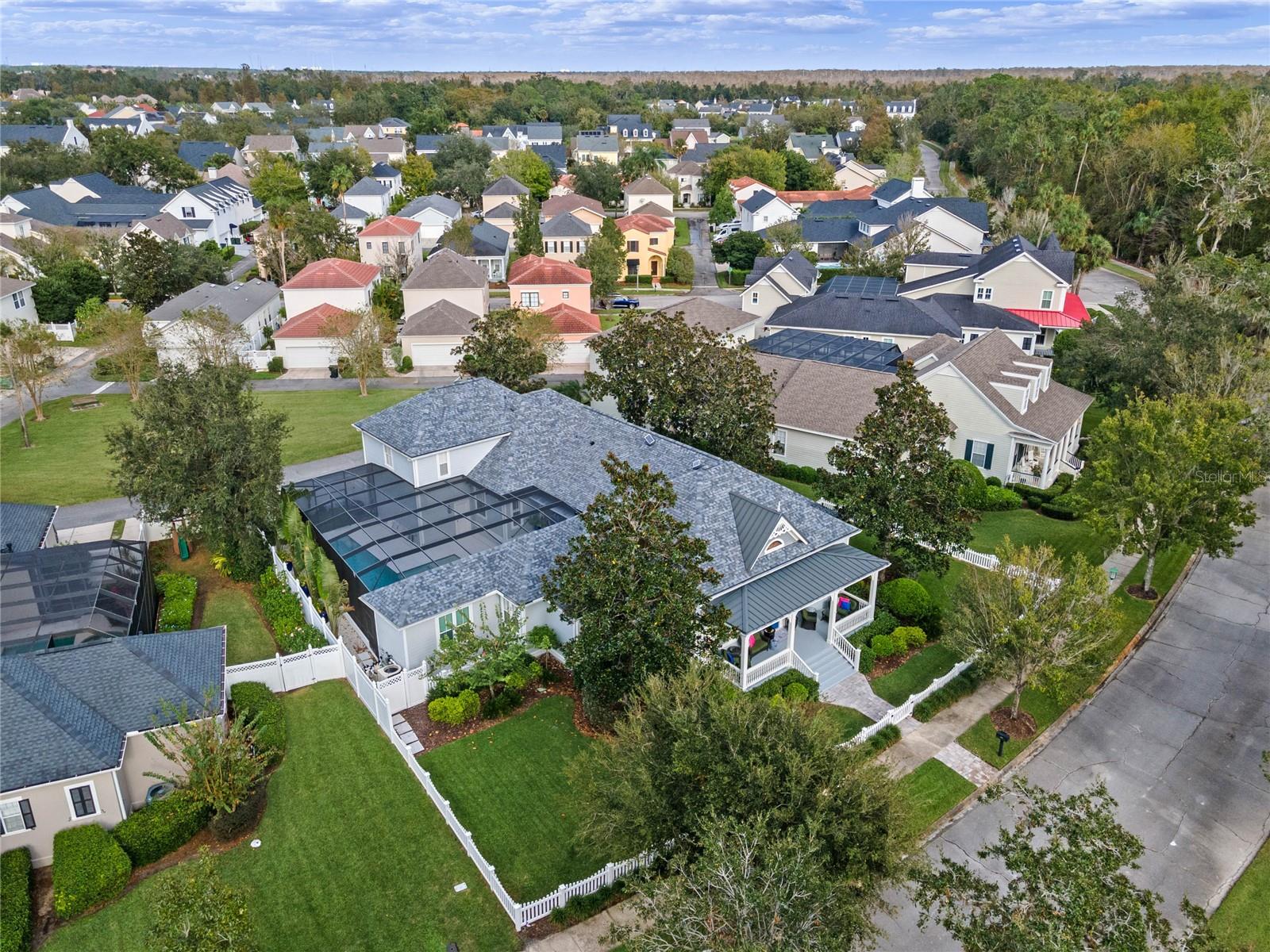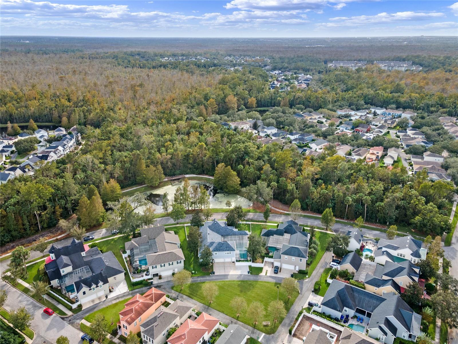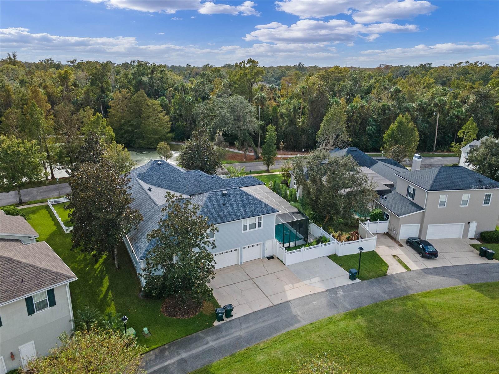 Welcome to 1003 Oak Pond Dr, a stunning single-story Morrison Libby masterpiece WITH A PRIVATE ONE-BEDROOM APARTMENT WITH SEPARATE ENTRANCE in the heart of Celebration, FL, set on an expansive, pie-shaped lot with serene views of water and lush conservation land. This exquisite pool home seamlessly combines elegance and comfort, showcasing breathtaking architectural details like soaring ceilings, graceful archways, and stately columns. From the moment you step inside, the bright, open floor plan welcomes you with an abundance of natural light, pouring through large windows and glass doors that frame the serene backyard and pool. The formal living and dining rooms exude timeless charm, with rich hardwood floors and crown molding. The front sitting room is a perfect retreat, with French doors and double-hung windows that open to views of the expansive patio and fenced backyard—a private oasis for relaxation. The family room, with its impressive volume ceiling, flows seamlessly into the chef’s kitchen, featuring custom cabinetry, granite countertops, and top-of-the-line appliances, including a 2024 Electrolux refrigerator, Thermador gas range, and Fisher & Paykel pull-out dishwasher. A recent gas line addition completes this kitchen’s transformation into a culinary haven. The master suite is a sanctuary of luxury, complete with three large windows that overlook the tranquil backyard. Its en-suite bath is a showcase of refinement, featuring a limestone soaking tub, Bianco Rhino marble counters, marble floors, designer tile, and custom cabinetry. The guest bathroom has also been upgraded with marble accents and custom cabinetry, while the three additional bedrooms offer ample space—all on a single floor. An array of thoughtful upgrades enhances the home’s functionality and aesthetic appeal. Lighting has been meticulously selected, including LED recessed lights with dimmers and elegant Restoration Hardware sconces. The main A/C unit has been replaced with a triple-zone system, incorporating double filtration and air purification. Every bedroom now boasts rich wood flooring, complemented by crown molding and tall baseboards throughout. Above the three-car garage, discover a private one-bedroom apartment with its own entrance, renovated bathroom (2023), and a separate washer and dryer—ideal for guests or extended family. The exterior has been beautifully maintained, with a new roof featuring designer shingles and a waterproof membrane layer, a freshly painted facade, new gutters with guards, and stylish stone pavers leading to the front entrance. Landscape lighting and underground drainage ensure both beauty and functionality. Celebration, FL, offers an exceptional lifestyle with parks, playgrounds, community pools, and over 26 miles of nature trails for walking and biking. Explore dining, shopping, and entertainment venues right in town—all waiting to be enjoyed from sunup to sundown. Experience luxurious, turnkey living at 1003 Oak Pond Dr, where elegance meets modern convenience in one of Florida's most desirable communities. Chandeliers in the Formal living room and family/gathering room do not convey.