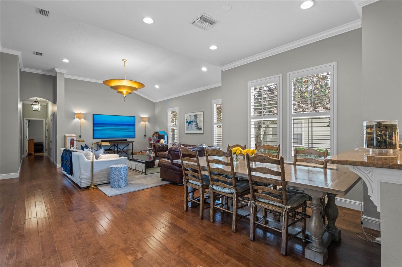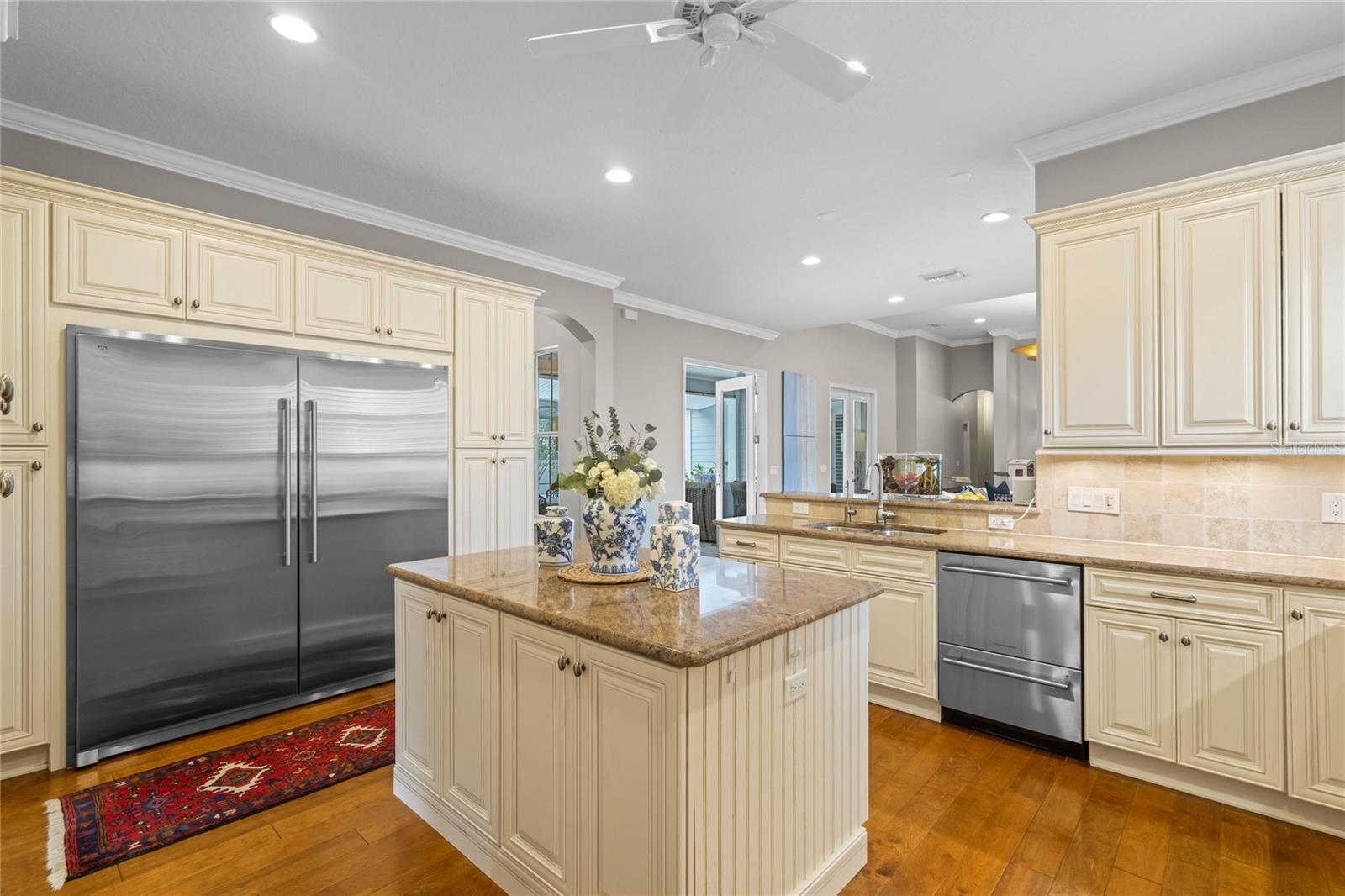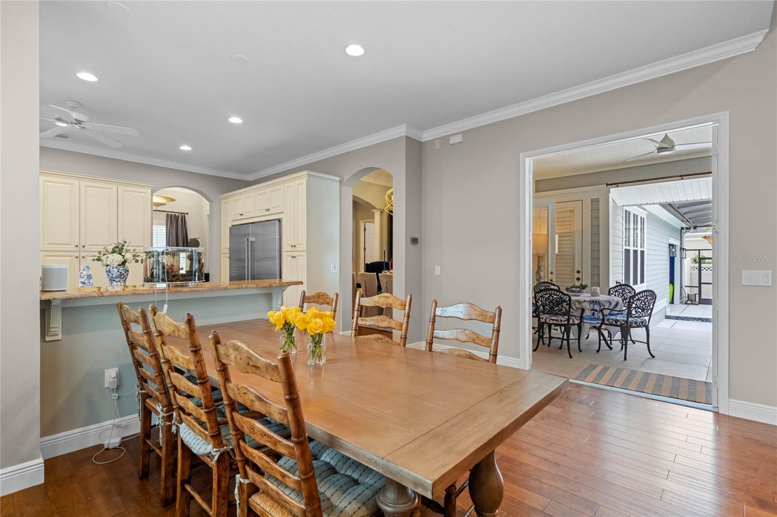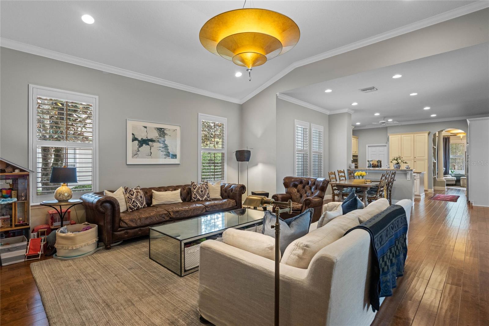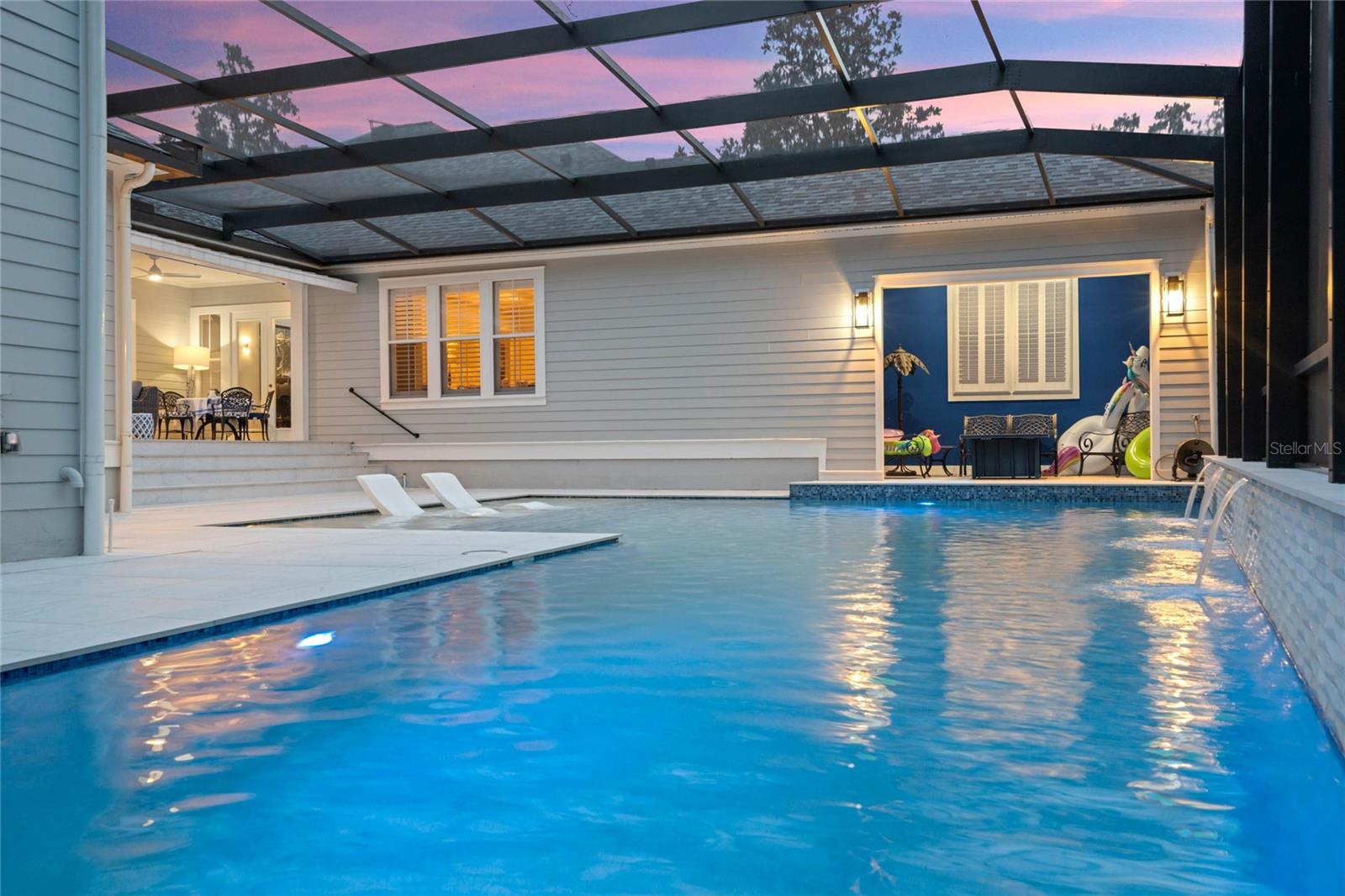 Welcome to 1003 Oak Pond Dr, a stunning single-story Morrison Libby masterpiece WITH A PRIVATE ONE-BEDROOM APARTMENT WITH SEPARATE ENTRANCE in the heart of Celebration, FL, set on an expansive, pie-shaped lot with serene views of water and lush conservation land. This exquisite pool home seamlessly combines elegance and comfort, showcasing breathtaking architectural details like soaring ceilings, graceful archways, and stately columns. From the moment you step inside, the bright, open floor plan welcomes you with an abundance of natural light, pouring through large windows and glass doors that frame the serene backyard and pool. The formal living and dining rooms exude timeless charm, with rich hardwood floors and crown molding. The front sitting room is a perfect retreat, with French doors and double-hung windows that open to views of the expansive patio and fenced backyard—a private oasis for relaxation. The family room, with its impressive volume ceiling, flows seamlessly into the chef’s kitchen, featuring custom cabinetry, granite countertops, and top-of-the-line appliances, including a 2024 Electrolux refrigerator, Thermador gas range, and Fisher & Paykel pull-out dishwasher. A recent gas line addition completes this kitchen’s transformation into a culinary haven. The master suite is a sanctuary of luxury, complete with three large windows that overlook the tranquil backyard. Its en-suite bath is a showcase of refinement, featuring a limestone soaking tub, Bianco Rhino marble counters, marble floors, designer tile, and custom cabinetry. The guest bathroom has also been upgraded with marble accents and custom cabinetry, while the three additional bedrooms offer ample space—all on a single floor. An array of thoughtful upgrades enhances the home’s functionality and aesthetic appeal. Lighting has been meticulously selected, including LED recessed lights with dimmers and elegant Restoration Hardware sconces. The main A/C unit has been replaced with a triple-zone system, incorporating double filtration and air purification. Every bedroom now boasts rich wood flooring, complemented by crown molding and tall baseboards throughout. Above the three-car garage, discover a private one-bedroom apartment with its own entrance, renovated bathroom (2023), and a separate washer and dryer—ideal for guests or extended family. The exterior has been beautifully maintained, with a new roof featuring designer shingles and a waterproof membrane layer, a freshly painted facade, new gutters with guards, and stylish stone pavers leading to the front entrance. Landscape lighting and underground drainage ensure both beauty and functionality. Celebration, FL, offers an exceptional lifestyle with parks, playgrounds, community pools, and over 26 miles of nature trails for walking and biking. Explore dining, shopping, and entertainment venues right in town—all waiting to be enjoyed from sunup to sundown. Experience luxurious, turnkey living at 1003 Oak Pond Dr, where elegance meets modern convenience in one of Florida's most desirable communities. Chandeliers in the Formal living room and family/gathering room do not convey.