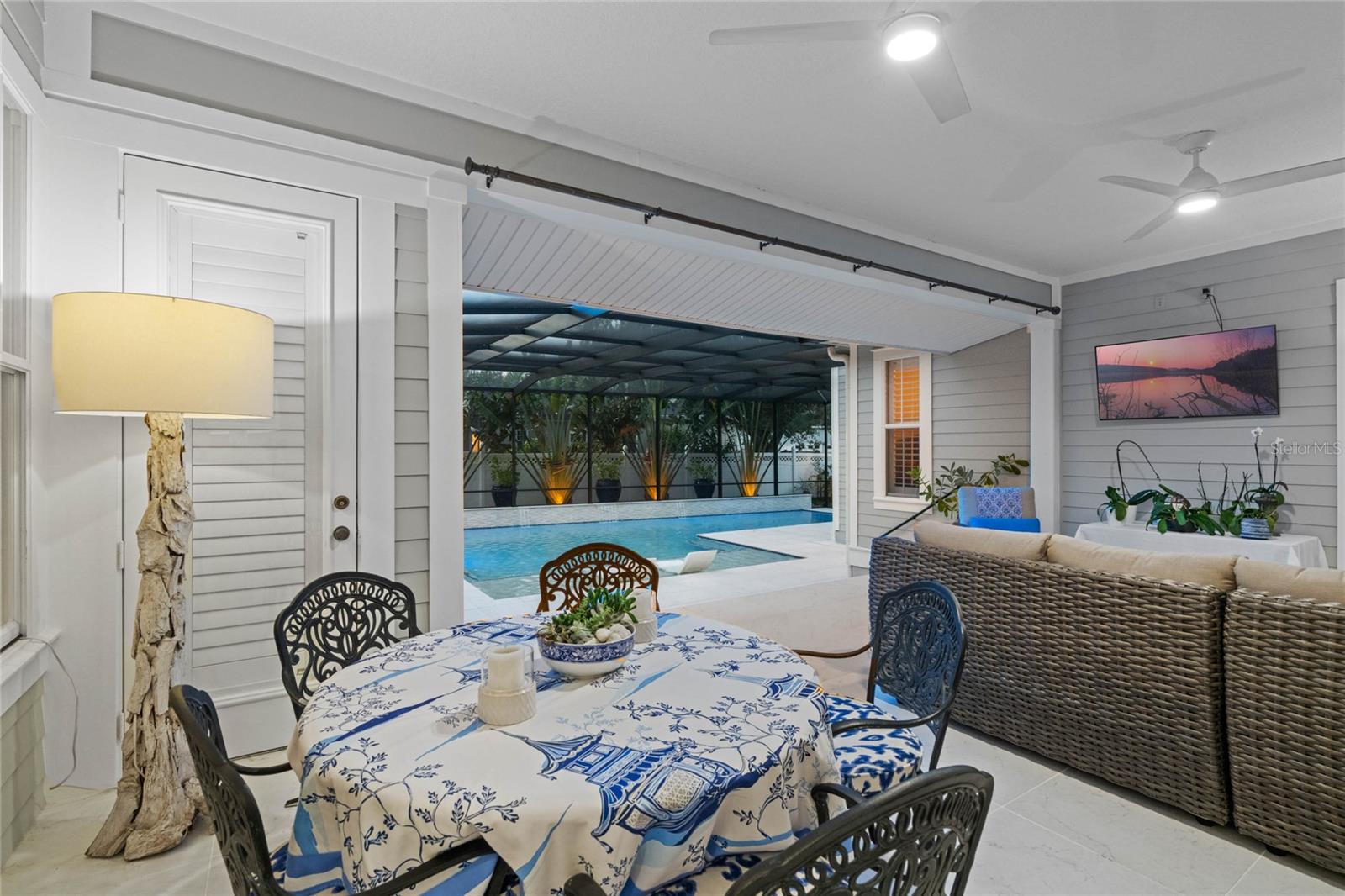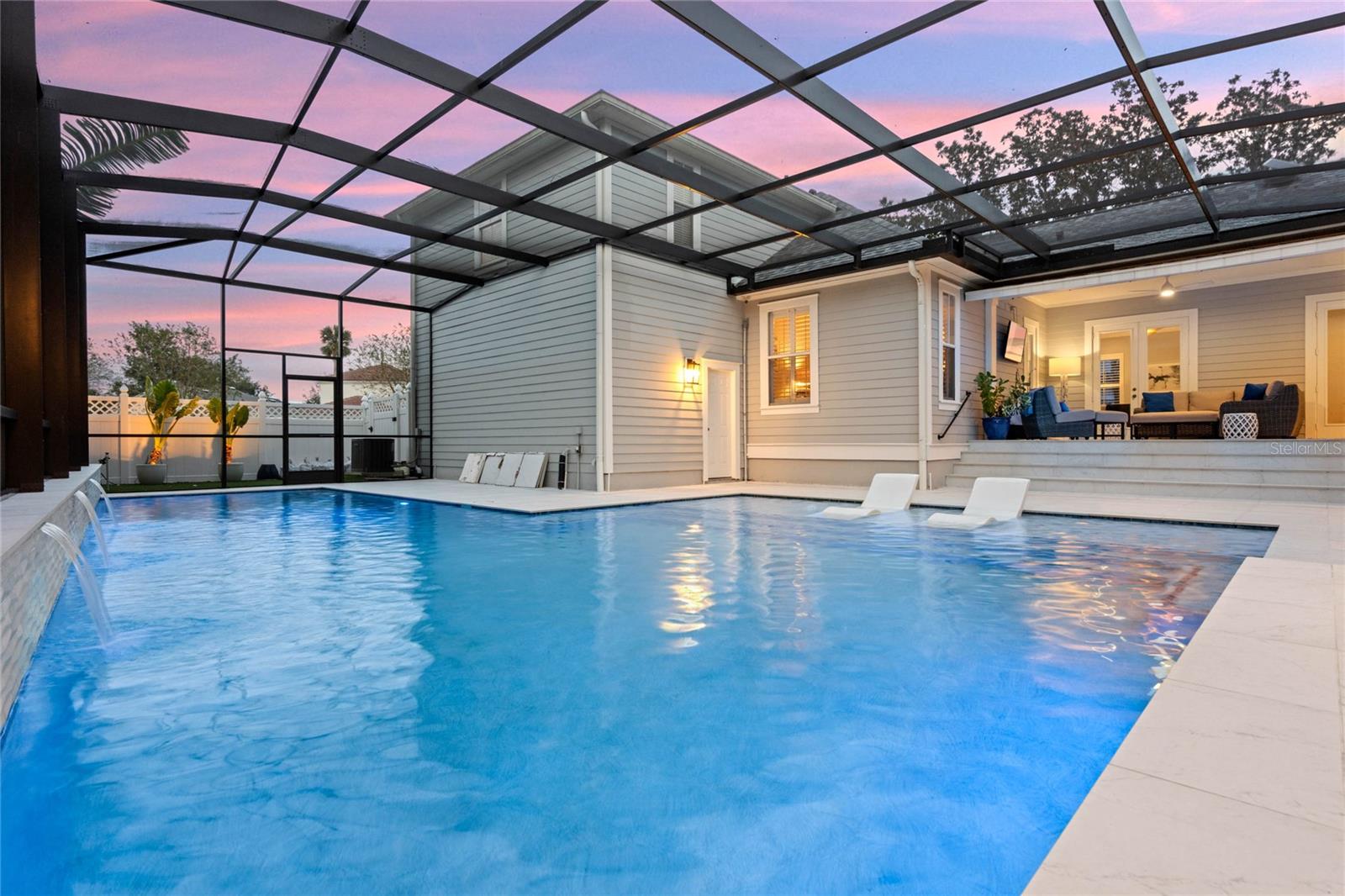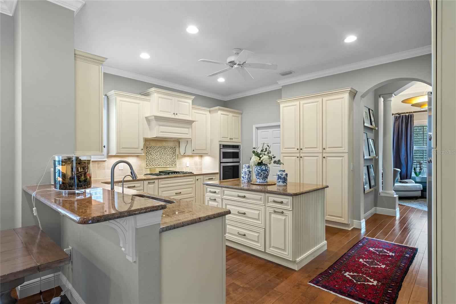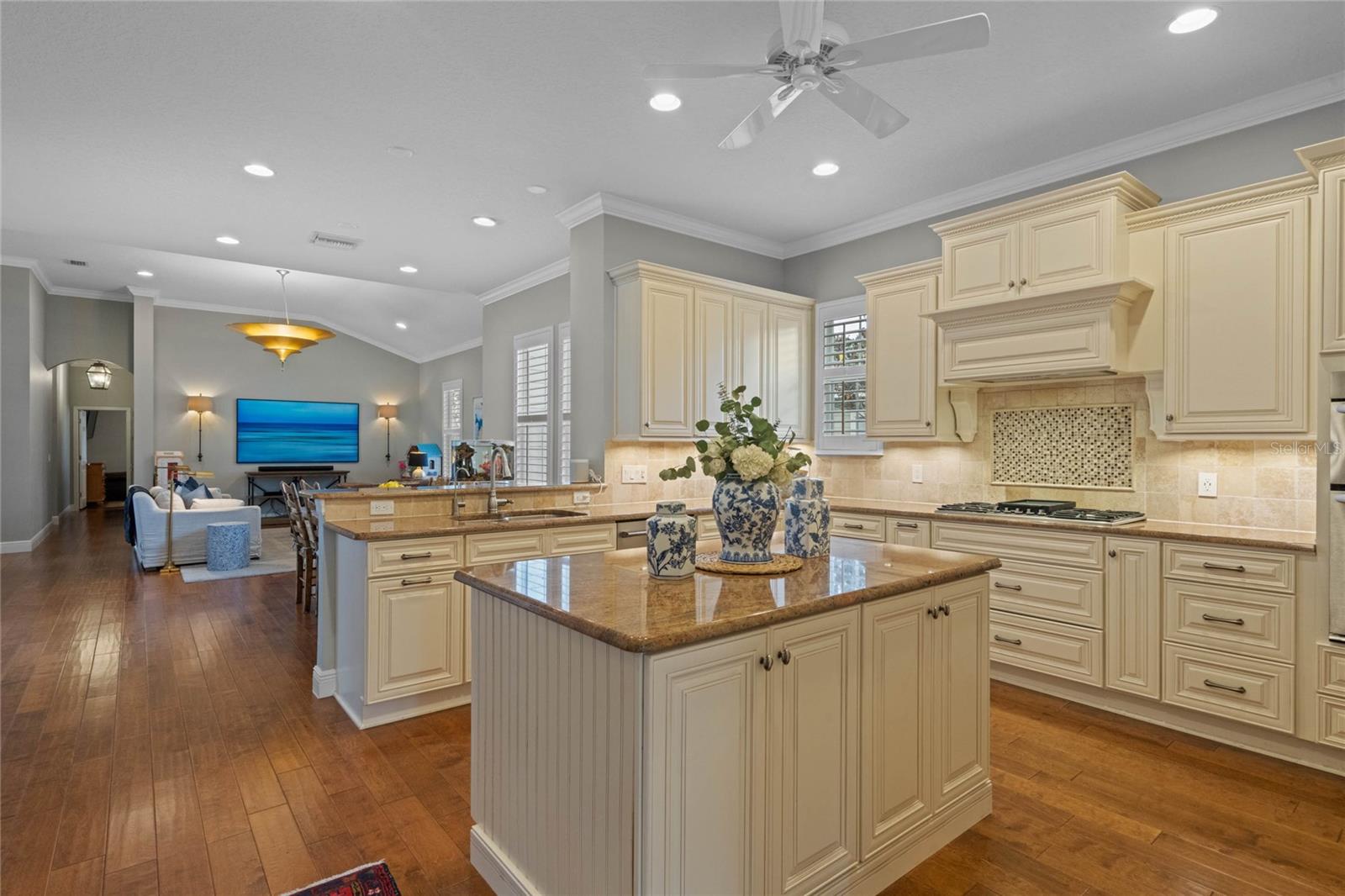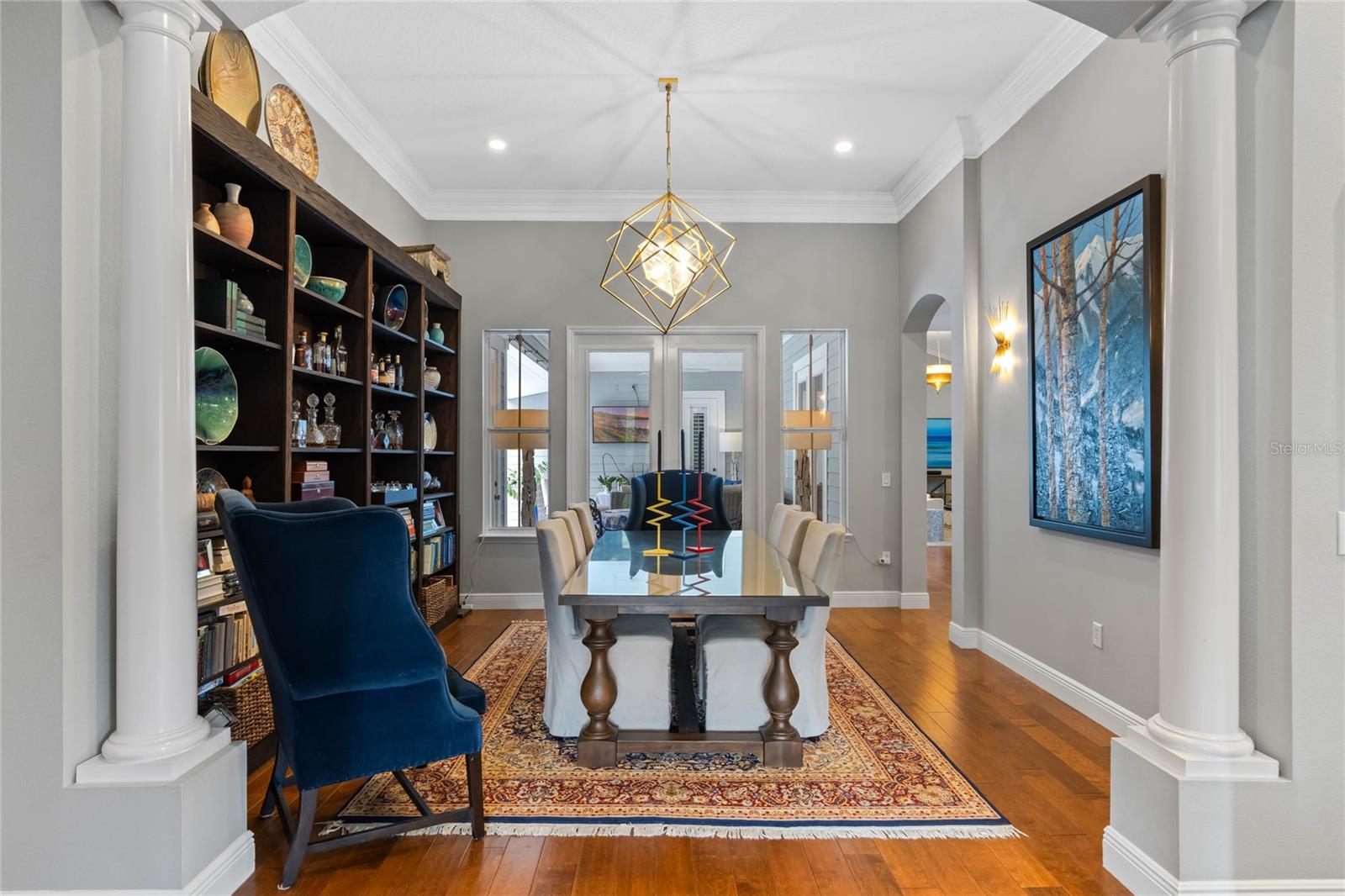 Welcome to 1003 Oak Pond Dr, a stunning single-story Morrison Libby masterpiece WITH A PRIVATE ONE-BEDROOM APARTMENT WITH SEPARATE ENTRANCE in the heart of Celebration, FL, set on an expansive, pie-shaped lot with serene views of water and lush conservation land. This exquisite pool home seamlessly combines elegance and comfort, showcasing breathtaking architectural details like soaring ceilings, graceful archways, and stately columns. From the moment you step inside, the bright, open floor plan welcomes you with an abundance of natural light, pouring through large windows and glass doors that frame the serene backyard and pool. The formal living and dining rooms exude timeless charm, with rich hardwood floors and crown molding. The front sitting room is a perfect retreat, with French doors and double-hung windows that open to views of the expansive patio and fenced backyard—a private oasis for relaxation. The family room, with its impressive volume ceiling, flows seamlessly into the chef’s kitchen, featuring custom cabinetry, granite countertops, and top-of-the-line appliances, including a 2024 Electrolux refrigerator, Thermador gas range, and Fisher & Paykel pull-out dishwasher. A recent gas line addition completes this kitchen’s transformation into a culinary haven. The master suite is a sanctuary of luxury, complete with three large windows that overlook the tranquil backyard. Its en-suite bath is a showcase of refinement, featuring a limestone soaking tub, Bianco Rhino marble counters, marble floors, designer tile, and custom cabinetry. The guest bathroom has also been upgraded with marble accents and custom cabinetry, while the three additional bedrooms offer ample space—all on a single floor. An array of thoughtful upgrades enhances the home’s functionality and aesthetic appeal. Lighting has been meticulously selected, including LED recessed lights with dimmers and elegant Restoration Hardware sconces. The main A/C unit has been replaced with a triple-zone system, incorporating double filtration and air purification. Every bedroom now boasts rich wood flooring, complemented by crown molding and tall baseboards throughout. Above the three-car garage, discover a private one-bedroom apartment with its own entrance, renovated bathroom (2023), and a separate washer and dryer—ideal for guests or extended family. The exterior has been beautifully maintained, with a new roof featuring designer shingles and a waterproof membrane layer, a freshly painted facade, new gutters with guards, and stylish stone pavers leading to the front entrance. Landscape lighting and underground drainage ensure both beauty and functionality. Celebration, FL, offers an exceptional lifestyle with parks, playgrounds, community pools, and over 26 miles of nature trails for walking and biking. Explore dining, shopping, and entertainment venues right in town—all waiting to be enjoyed from sunup to sundown. Experience luxurious, turnkey living at 1003 Oak Pond Dr, where elegance meets modern convenience in one of Florida's most desirable communities. Chandeliers in the Formal living room and family/gathering room do not convey.