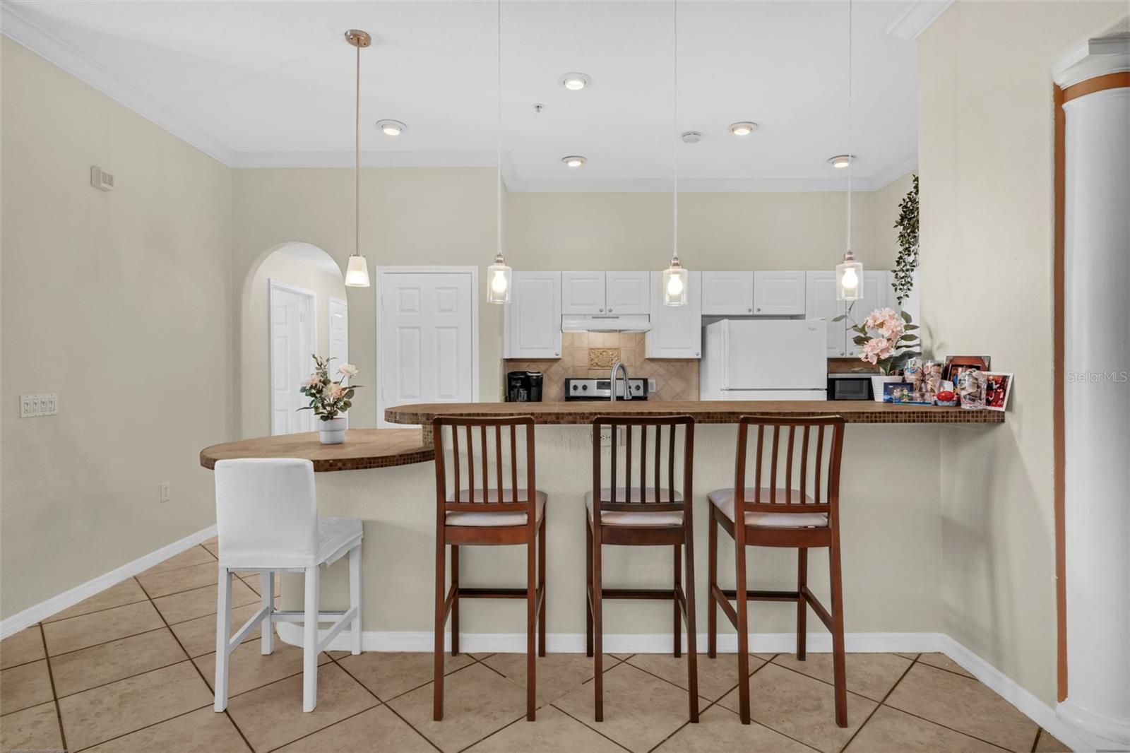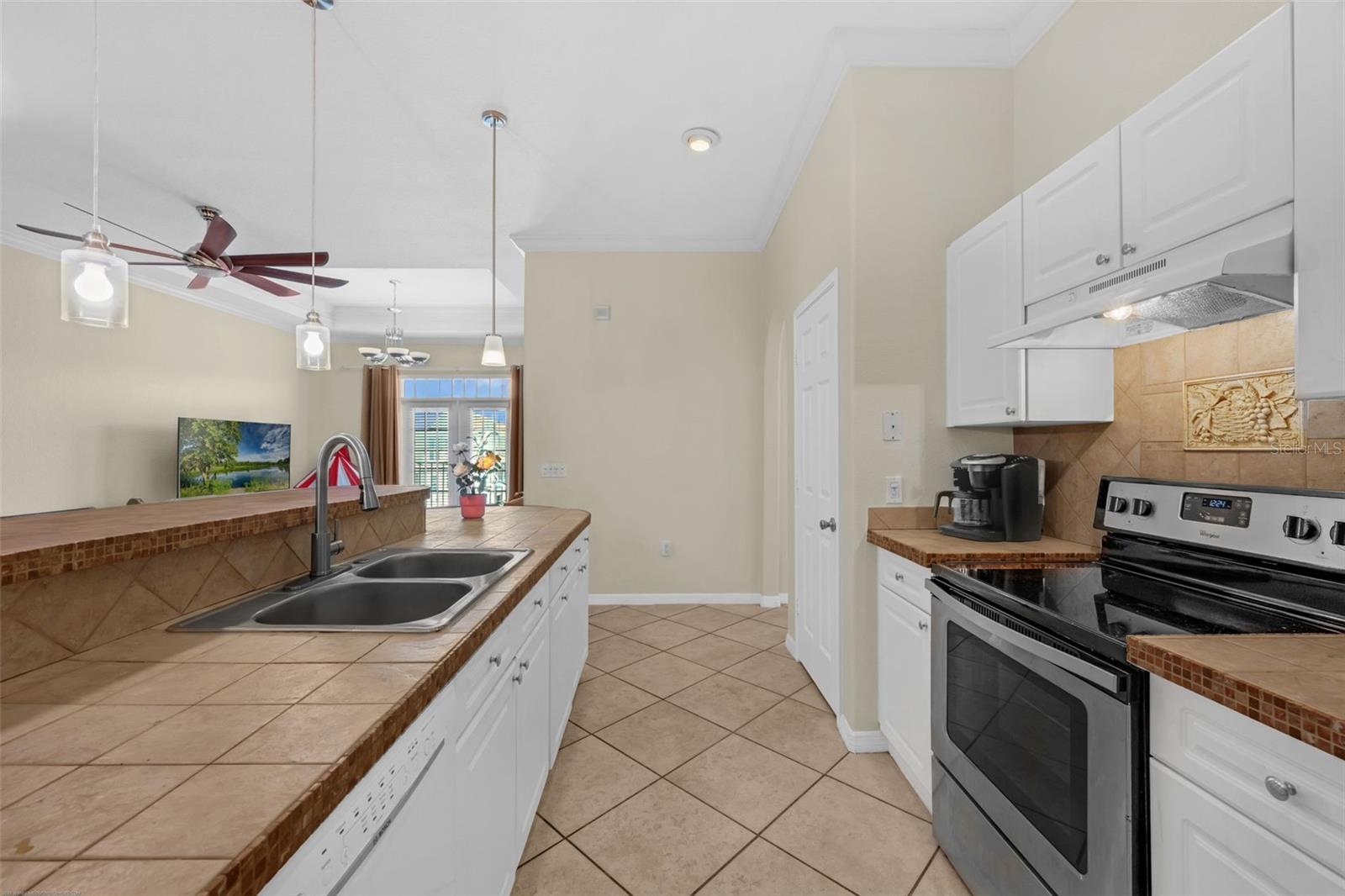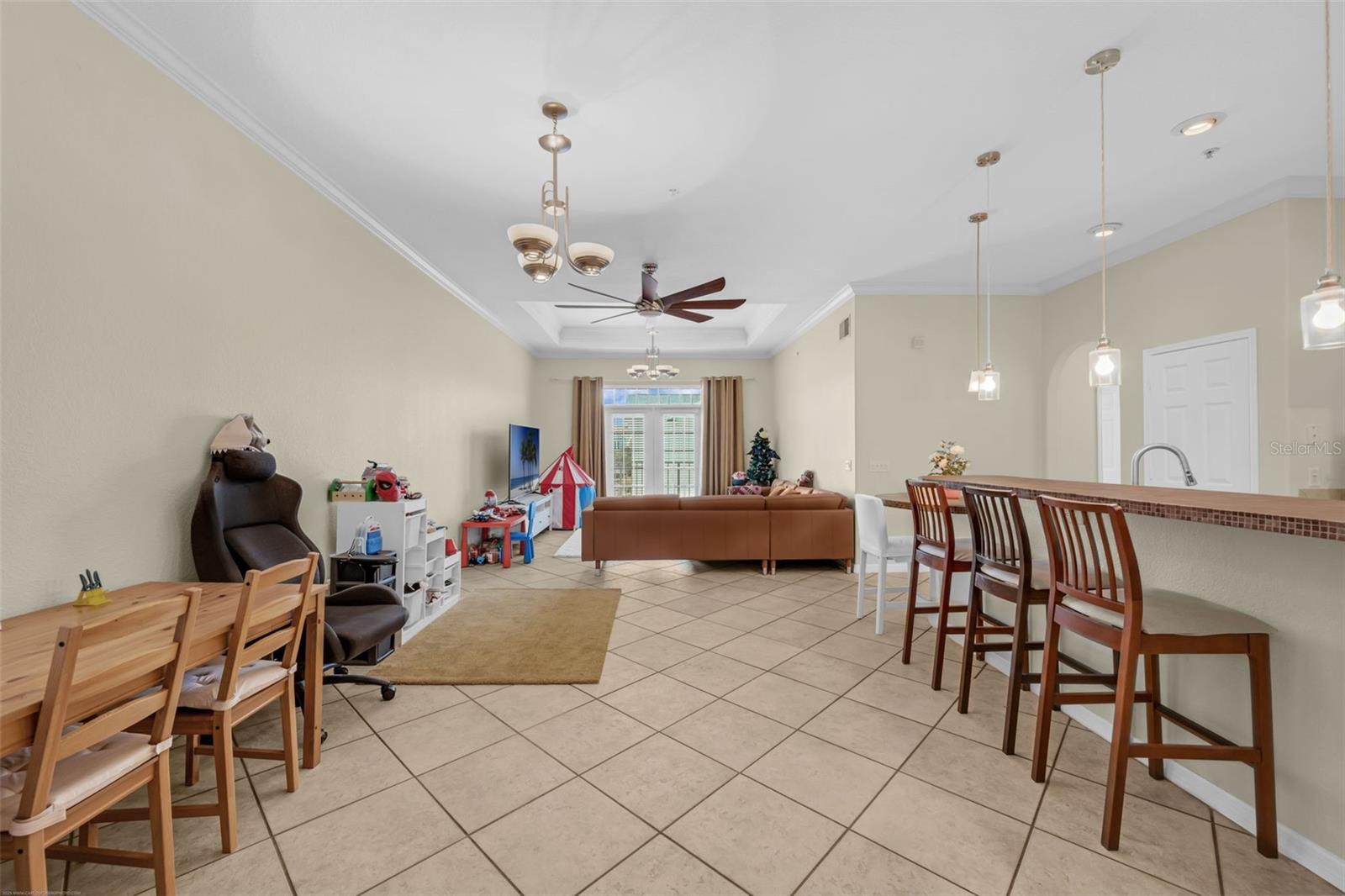 Take the elevator to your top-floor corner unit and step into this 3-bedroom, 2-bath “Kennedy” floor plan—one of the most spacious layouts in Georgetown at Celebration. The entry foyer welcomes you with a nicely sized coat closet and leads into an open-concept living and dining area featuring tray ceilings and crown molding.Tile flooring runs throughout the entire condo—no carpet anywhere—with decorative inlays. The kitchen offers a large breakfast bar with accent tile, ample counter space, and stainless steel appliances. The laundry closet, adjacent to the kitchen, includes a washer and dryer. Doors from both the living room and one of the bedrooms open onto a spacious 27-foot covered porch, ideal for relaxing or entertaining. All three bedrooms feature walk-in closets, and there’s an additional linen closet in the hallway. The primary suite includes dual sinks and a tiled walk-in shower. Water heater replaced in 2022. This condo can be sold with the furniture included, offering a convenient option for those seeking a move-in-ready or turnkey property. Georgetown residents enjoy access to a community pool, clubhouse, tennis court, fitness center, playground, trash pickup, and a car wash station. Located with easy access to major highways and nearby shopping, dining, and the Walt Disney World Resort, this condo combines functionality, space, and low-maintenance living in one of Celebration’s most convenient neighborhoods. Celebration Florida is a residential community where you can enjoy parks, playgrounds, community pools, over 26 miles of walking/biking trails, with shopping and dining options right in town.