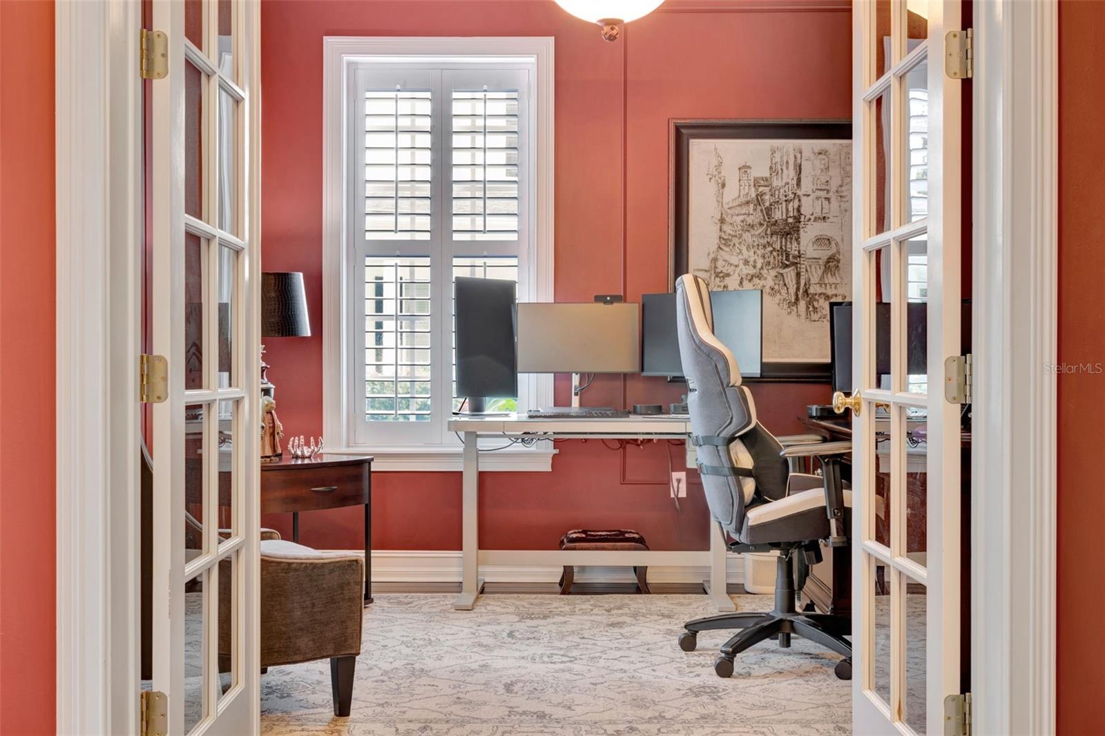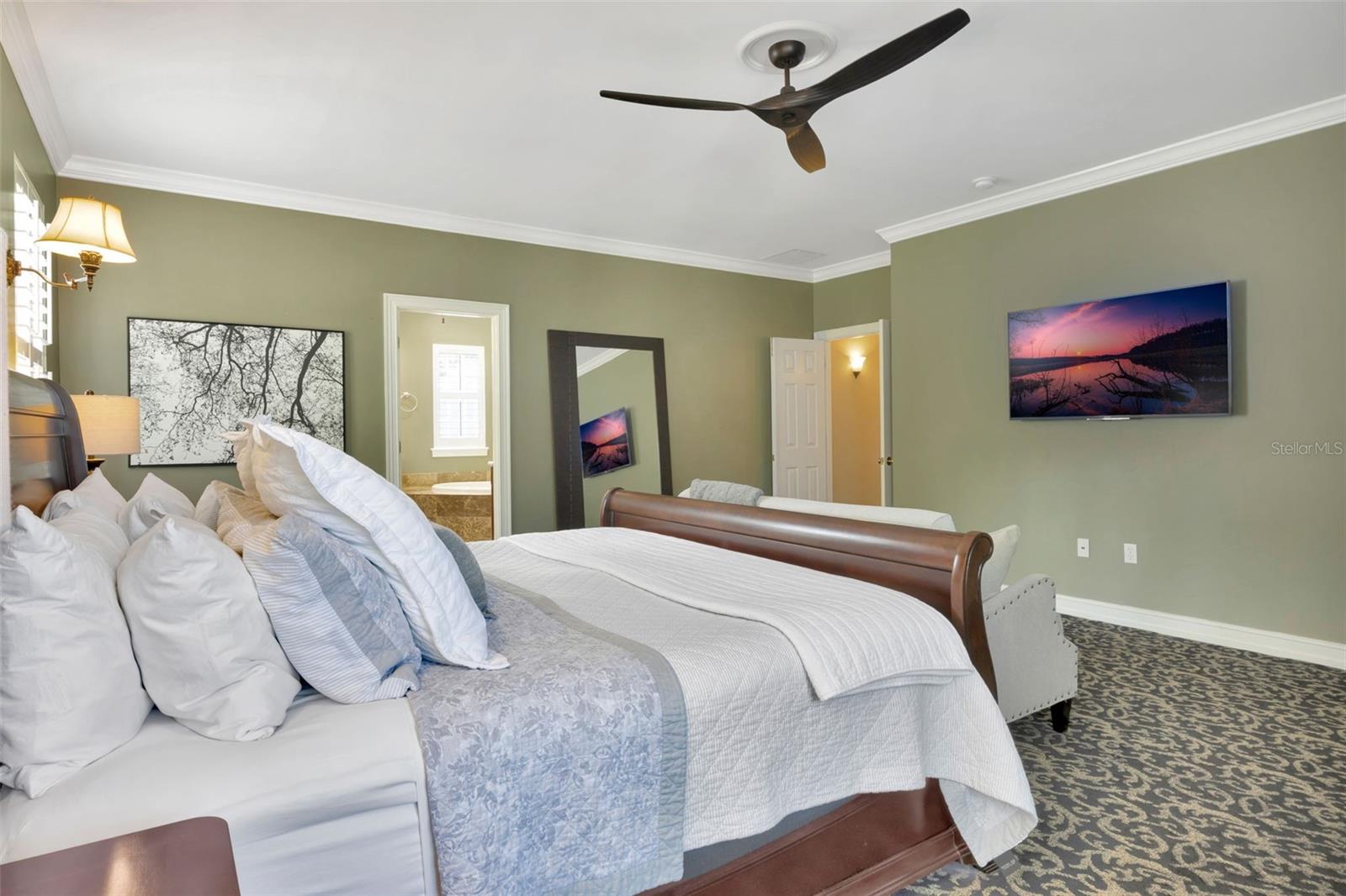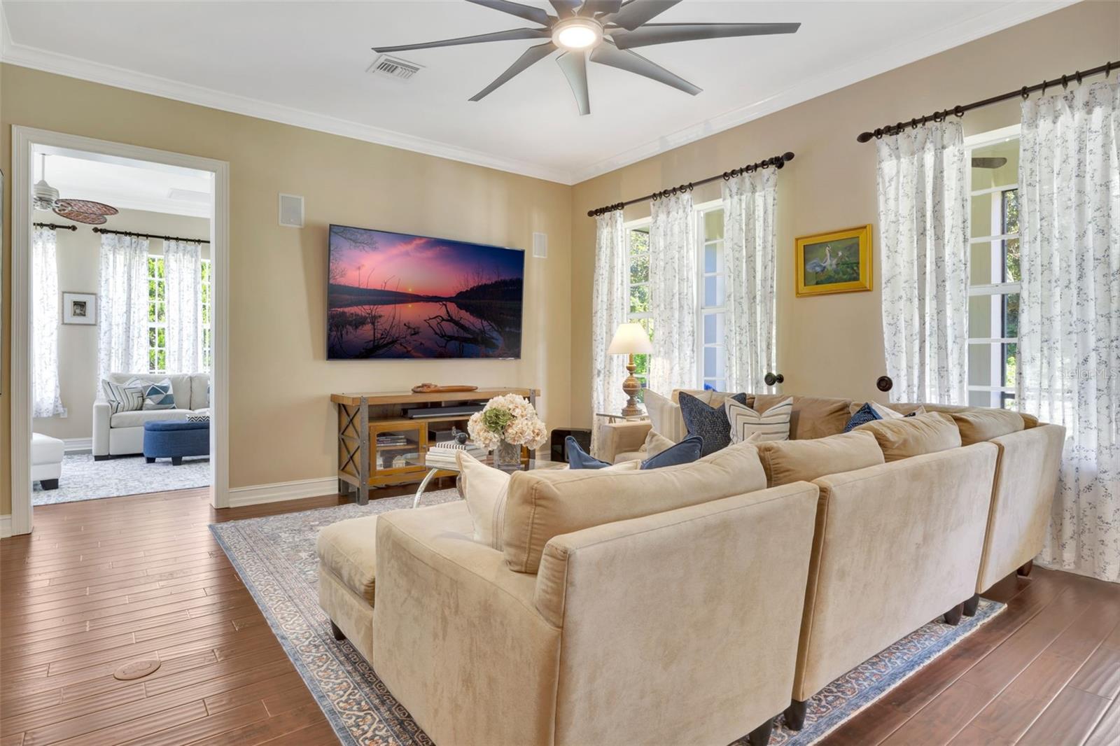 Welcome home to classic southern elegance in Celebration’s coveted Artisan Park. Discover timeless architecture and modern comfort in this impeccably maintained Issa Homes “Caldwell” model, set on a rare half-acre homesite that backs onto a protected Eagle Preserve greenbelt. Morning sun bathes the expansive, fully fenced backyard—ideal for a future pool, summer kitchen, or elegant garden retreat—while mature landscaping ensures privacy and a serene natural backdrop. Inside, every detail speaks of craftsmanship and care. Wide 5-inch plank hardwood floors, smooth high ceilings, crown molding, porcelain switch plates, and plantation shutters create a refined aesthetic throughout. The main level offers gracious living and entertaining spaces, including a sun-filled family room, a glass-wrapped sunroom, and a private office behind French doors. The gourmet kitchen features 42-inch cabinetry, granite counters, stainless-steel appliances, a breakfast bar, and a cheerful nook for casual dining. Upstairs, the owners’ suite is a sanctuary with two walk-in closets—including an oversized “hers” closet—and luxurious sculpted wool carpeting. Additional bedrooms, a well-appointed laundry room, and designer lighting complete the upper level. A three-car garage is complemented by a beautifully finished detached apartment with its own kitchen, living area, bedroom, bath, and laundry—perfect for guests or income potential. Since 2016, the residence has benefited from extensive enhancements and thoughtful upgrades: a new roof, four new A/C units, fresh interior and exterior paint, a tankless water heater for the guest house, new stainless appliances (including wall-oven combo and range hood), designer ceiling fans, updated faucets throughout, a new washer and dryer, and a 2025 vinyl privacy fence. Conceived by Disney as a model town where nature and community blend seamlessly, Celebration is renowned for its picturesque streetscapes, lakeside parks, and vibrant downtown with boutique shopping, fine dining, and year-round events. Residents enjoy over 26 miles of scenic walking and biking trails, the renowned Celebration Golf Club, and convenient access to I-4, SR-417, world-class medical care, and all of Walt Disney World’s attractions. Artisan Park elevates that lifestyle with exclusive membership to the Artisan Club—offering a private restaurant and bar, resort-style pool, state-of-the-art fitness center, and a grand clubhouse for social gatherings. An exceptional opportunity awaits you as this home combines classic Southern grace with modern luxury and the unparalleled amenities of Celebration’s premier neighborhood. It is truly move-in ready for the most discerning buyer seeking privacy, sophistication, and a celebrated way of life.