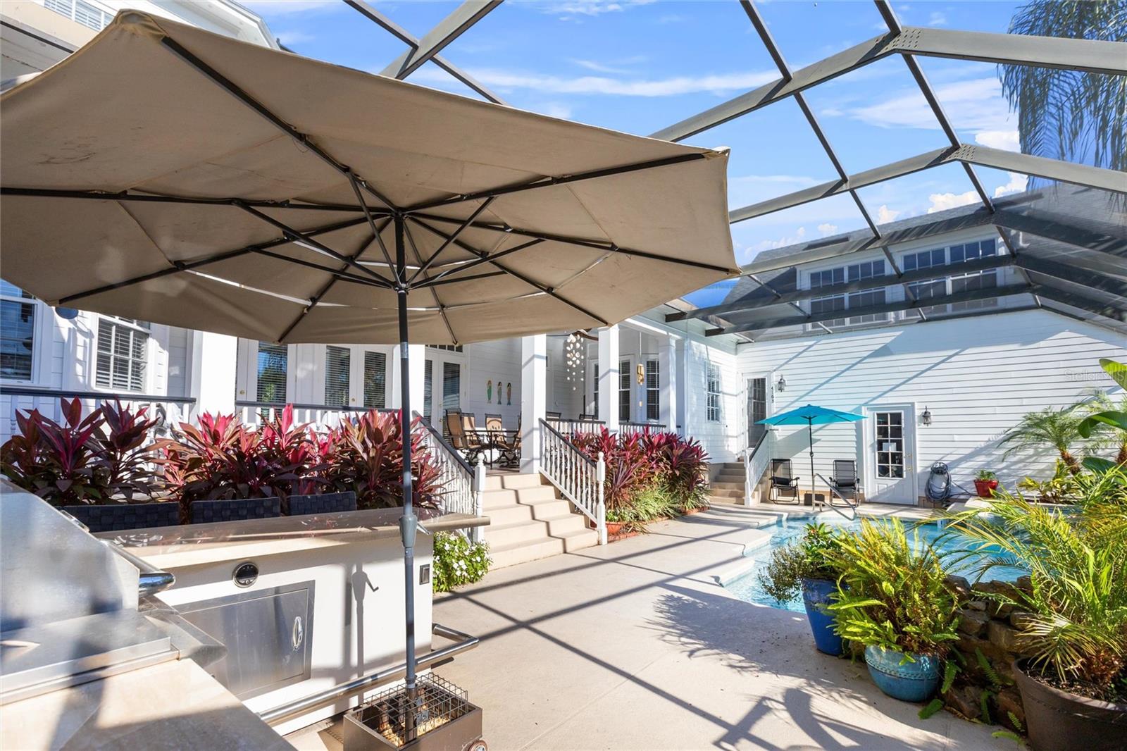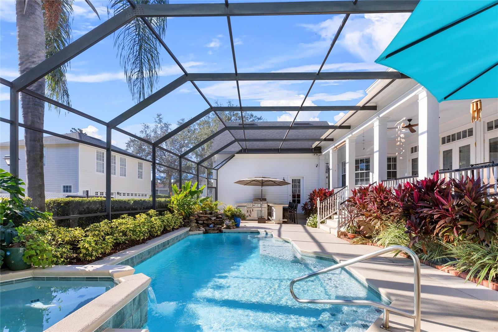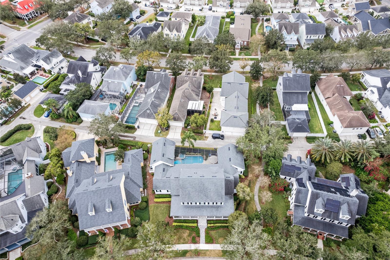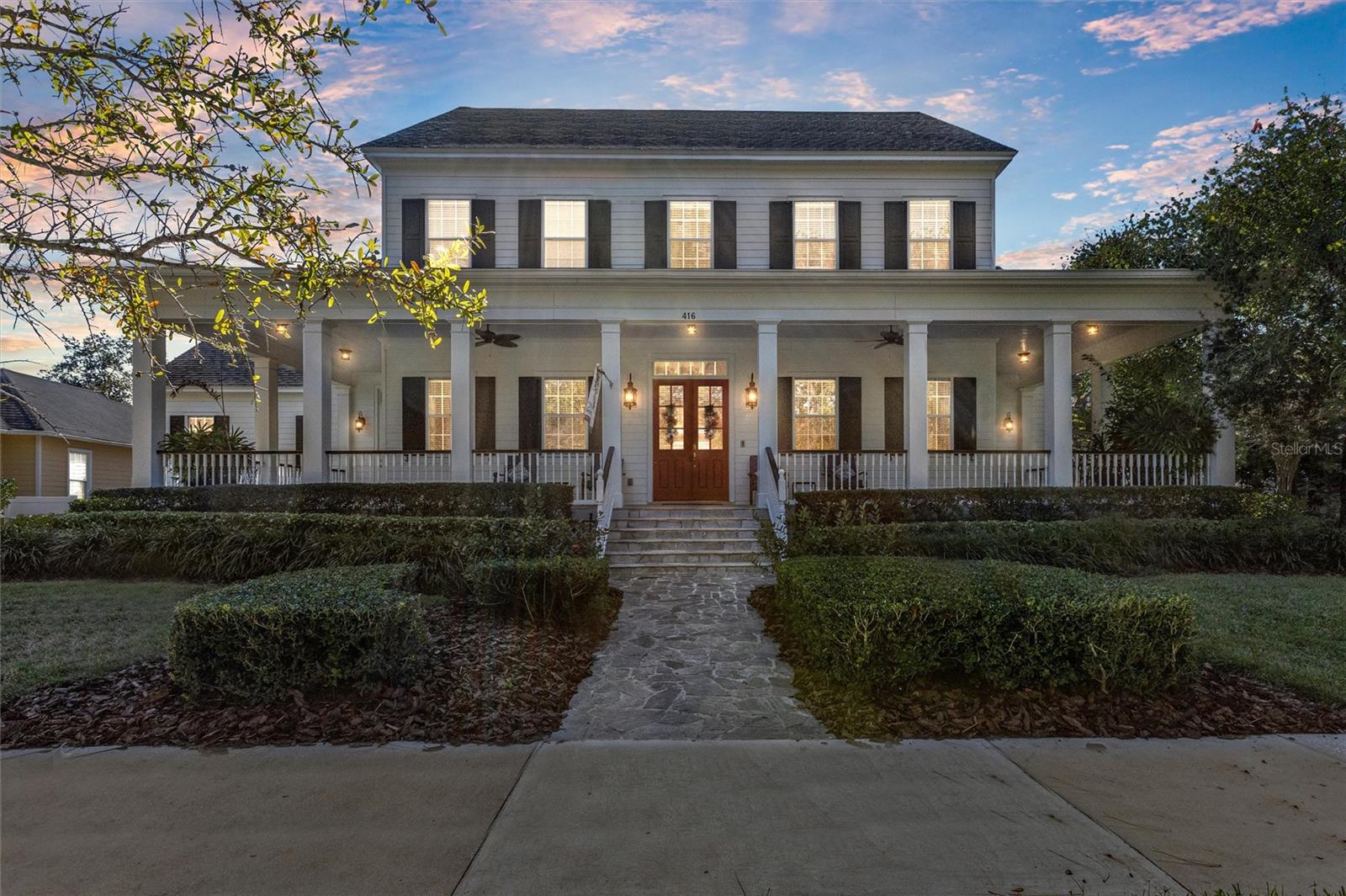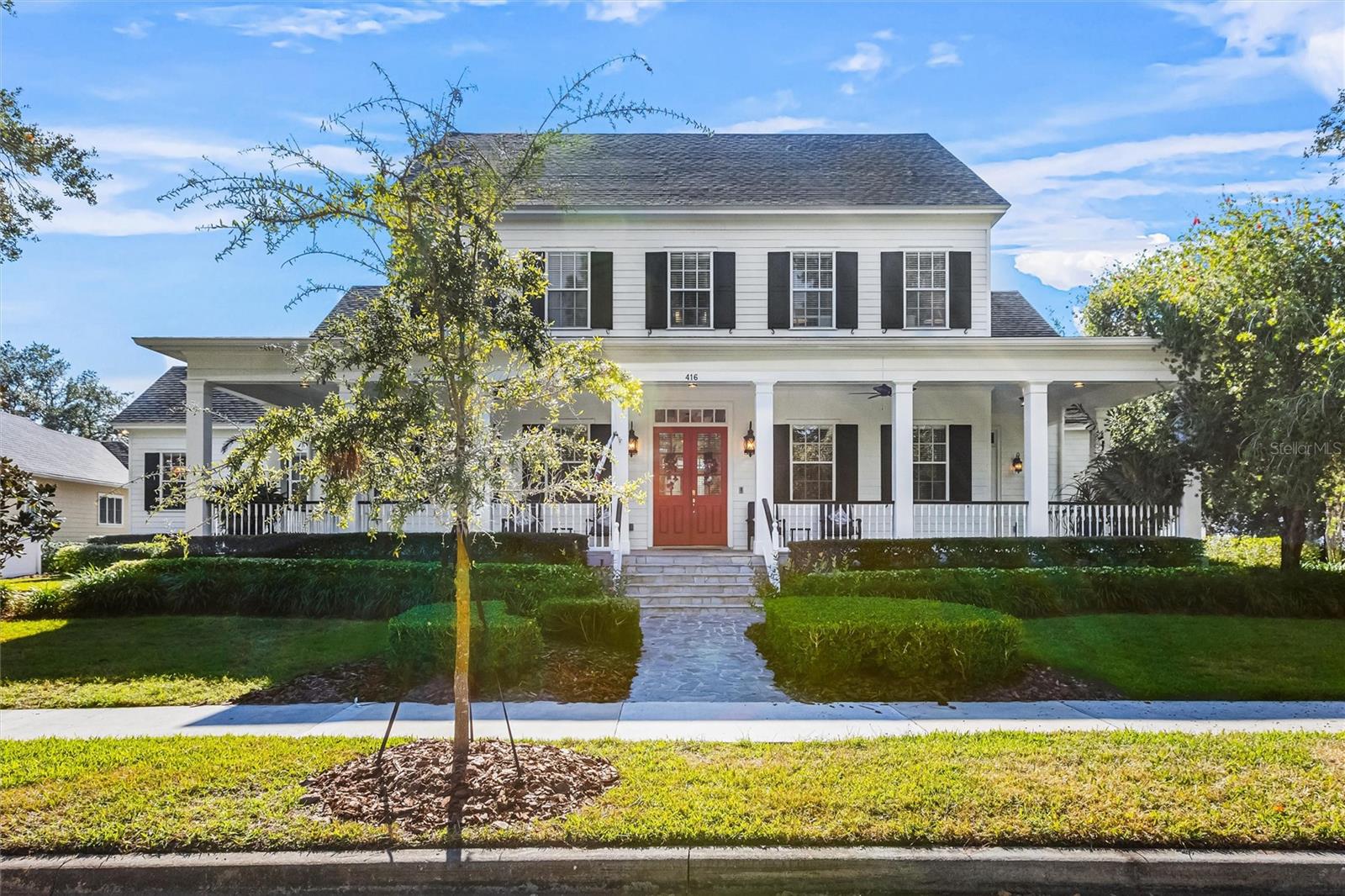 This custom-designed Estate coastal-style home, nestled in the heart of Celebration, Florida is located on one of the most coveted Main Village streets - just steps away from downtown restaurants & shops, and mere minutes from Walt Disney World. This exquisite 5-bedroom, 5.5-bathroom home offers over 5,000 square feet of living space and an array of recent enhancements including: two New Water Heaters (2024), Whole-home Water Softener system, Resurfaced Pool, an Outdoor Kitchen with stunning stone bar, grill, and mini-fridge — perfect for entertaining family and friends. ** BE SURE TO REVIEW THE 3D FLOOR PLAN - INTERACTIVE VISUAL TOUR ** The massive wrap-around Flagstone Porch faces lush conservation with a canopy of Mature Trees on a quiet street. Inside, the open floor plan showcases non-textured painted interiors and gleaming Wood Floors. The bright Chef’s Kitchen is a dream, featuring many new high-end appliances including a double refrigerator, oven (KitchenAid), cooktop and dishwasher (Bosch). Expansive wrap-around bar seating seamlessly connects the kitchen to the family room and eat-in area - with custom built-ins, a Gas Mini-Fireplace and picturesque views of the sparkling south-facing pool. The first-floor Primary Suite is your private retreat just off the family room, offering a sitting area, spa-like bathroom with its six-jet massage and rain shower, Two Walk-in Closets and a convenient stackable washer and dryer. Step directly from your suite to the screened patio and pool area for ultimate relaxation. Upstairs, three spacious bedrooms include a Second Primary Suite with a luxurious bath, and two bedrooms sharing a Jack-and-Jill bathroom. A versatile loft area at the top of the main staircase completes the second floor - perfect for relaxing or gaming. This property also features TWO OVERSIZED GARAGES with built-in shelving, accommodating up to FOUR VEHICLES. Above one garage is a bonus room with wood floors - perfect for an office, media room, or an additional bedroom. Above the other garage sits a studio apartment with private entrances from the pool patio or the garage interior, with a full kitchen, bathroom and closet space —ideal for guests or rental income. The backyard is a true oasis, boasting a Resurfaced Heated pool - with Waterfall and Spa - surrounded by lush landscaping, and an expansive patio with a newly added Outdoor Kitchen and Bar for al fresco dining.
