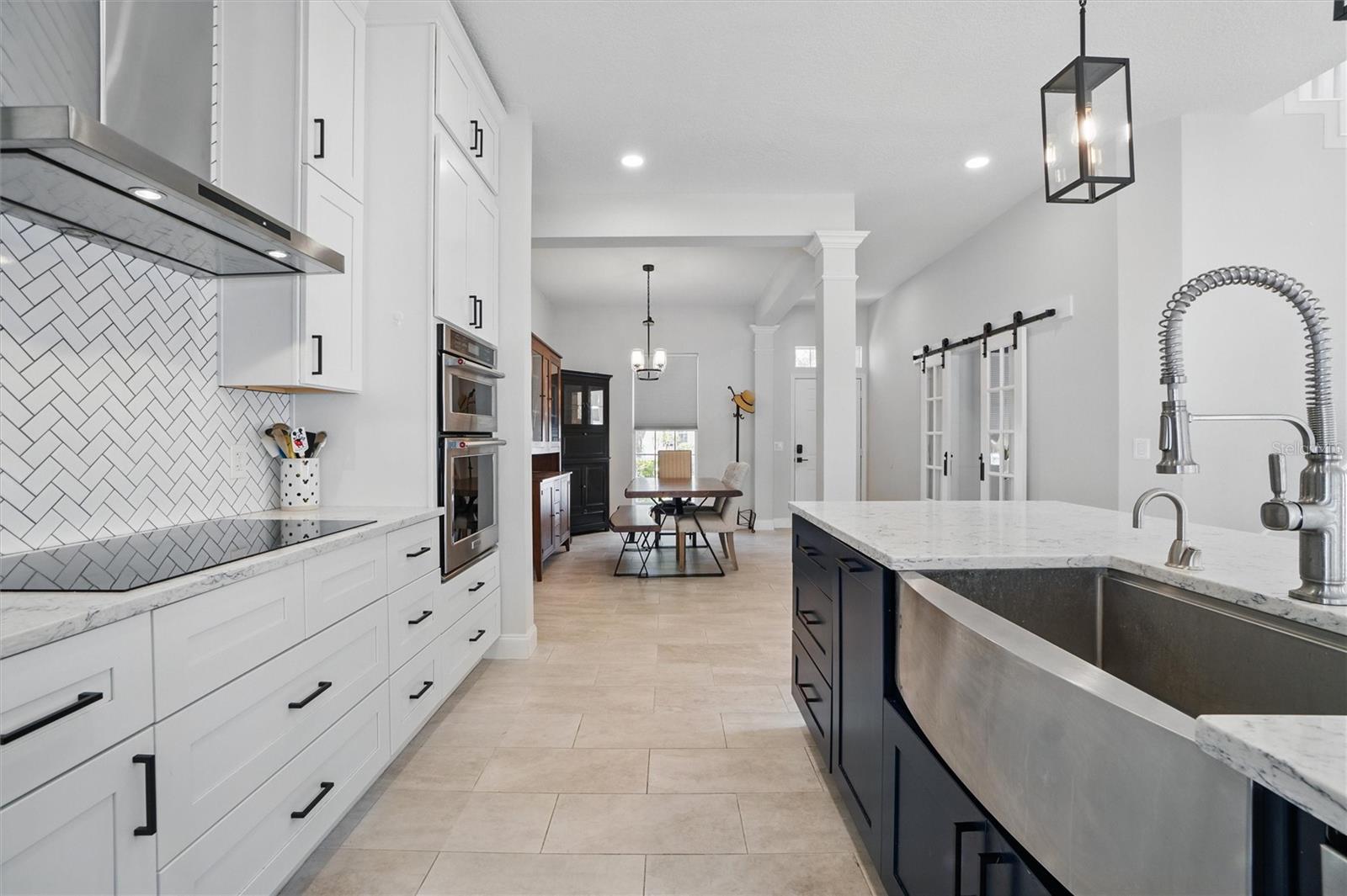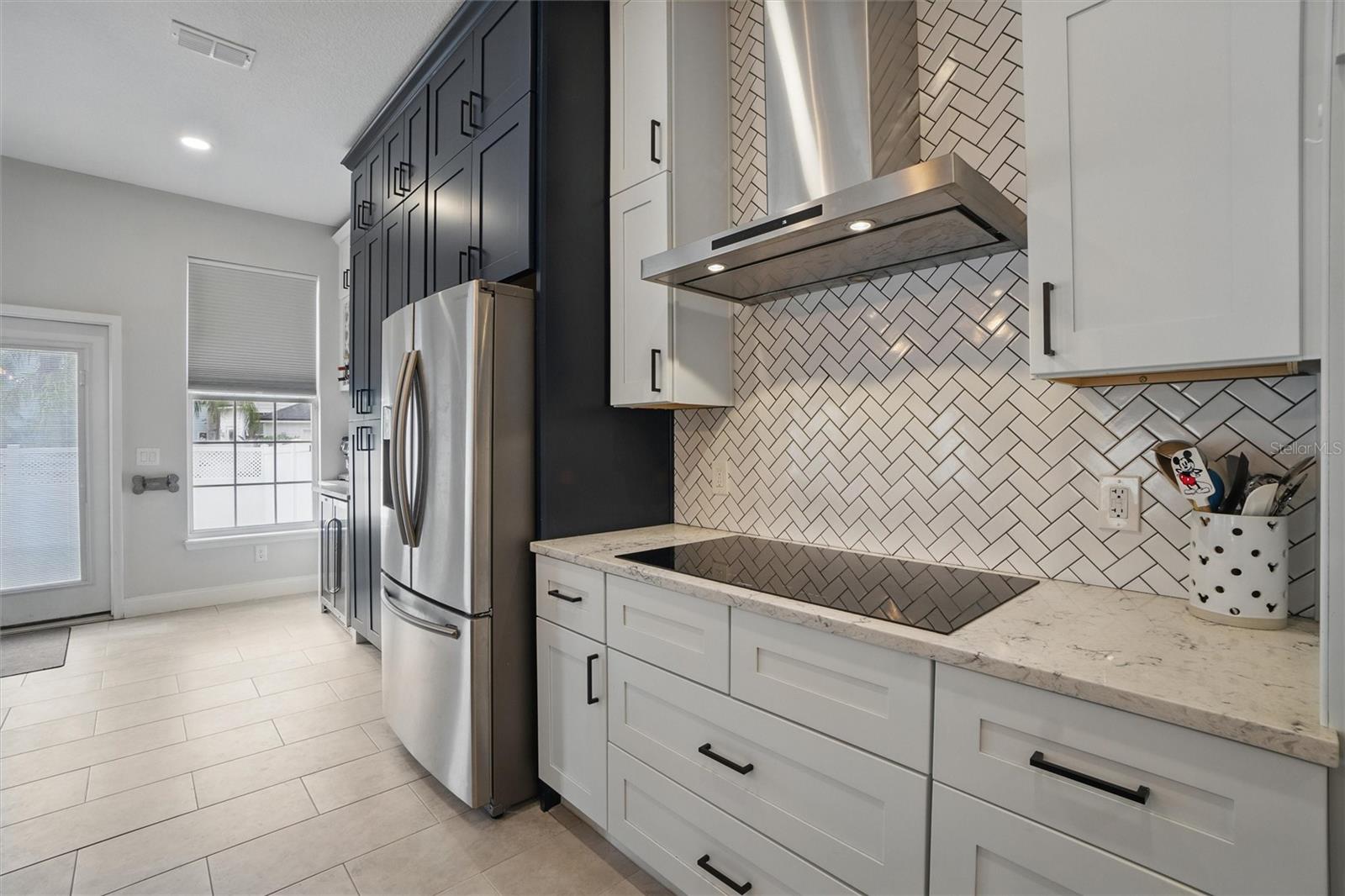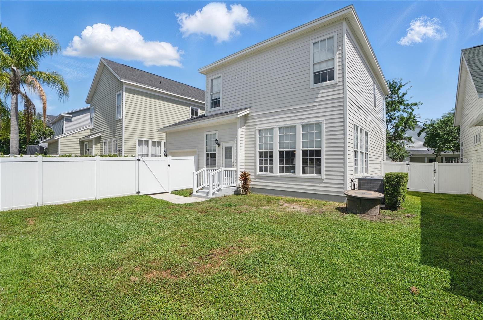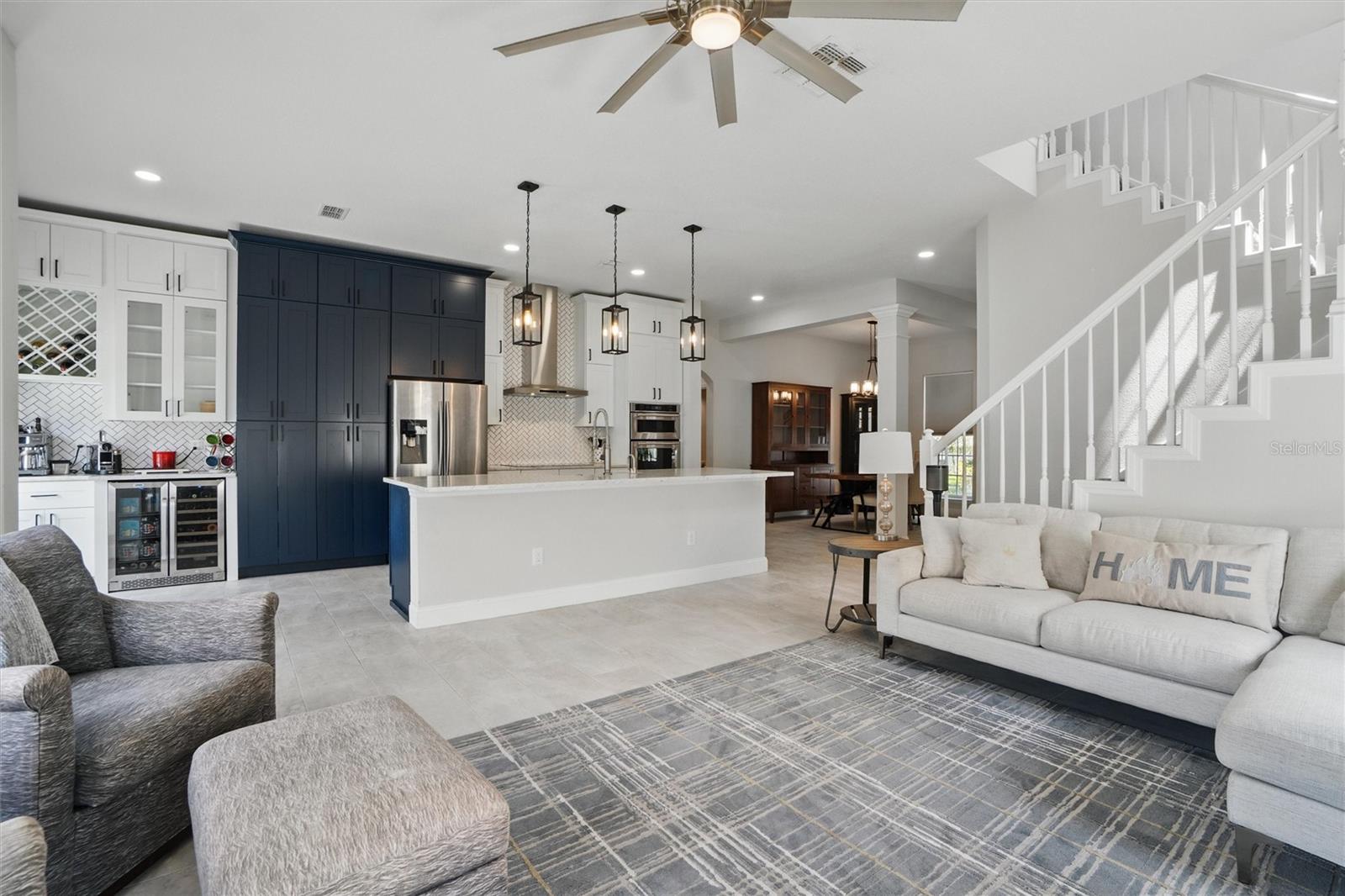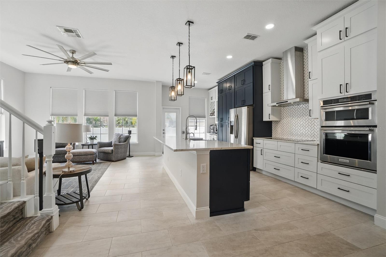 This beautifully Remodeled 3-4 Bedroom Home with standout Design Features, is located on a quiet Street, just around the corner from Celebration's North Village Arboretum and Preservation. The Open Floor Plan provides copious natural light. The FIRST FLOOR FEATURES: Handsome Barn Doors lead to a Large HOME OFFICE with rolling library ladder to access the floor-to-ceiling built-in Bookshelves - it can also be used as a first floor bedroom, The DINING AREA is to the right [approx. 12'x9'], a CUSTOM Expanded KITCHEN that has a Center Island of gleaming light Granite and with seating for casual dining, amazing floor -to-ceiling storage cabinets with soft close drawers, pullout shelving, an oversized Stainless Sink with Instant Hot Water dispenser, a Five Burner Bosch 36" INDUCTION cooktop, a full Stainless Steel Range Hood, a backsplash of custom herringbone subway tiles, statement Pendant Lighting, a double door Beverage Refrigerator, KitchenAid double convection oven, microwave and Dishwasher. and a built-in Wine Rack above a dedicated coffee bar/wine bar area. Adjacent to the Kitchen is The LAUNDRY ROOM with ELFA customizable Organization System, and a custom HALF BATH. THE SECOND LEVEL access is via a stately staircase and features: The PRIMARY BEDROOM and a Modern Bath that features a double vanity, quartz countertops, updated plumbing, XL Glass enclosed walk-in Shower and large Walk in Closet with custom ELFA System. Two additional spacious Bedrooms also feature Container Store ELFA storage and Hanging systems, an additional MULTIPURPOSE ROOM can serve as a Den, Office, Playroom, Exercise Room, or Media Room. The GARAGE includes a GLADIATOR wall-mounted storage and an Organizational System. The Parking Pad offers parking for additional vehicles. The FENCED BACK YARD has more than enough space [see the photos] to use your Imagination - for a POOL, a Playground for outdoor activities, a Garden... it offers Privacy to expand your Outdoor Entertainment! ENERGY EFFICIENT: 2020 ROOF replacement, 2021 AC System with UVC Light for enhanced Purification and 2021 Home Renovations. North Village features a Popular Resident - Only POOL and Recreation Area and two recently refurbished Playgrounds, and a sand VOLLEYBALL court. The Publix Shopping Center and multiple eateries are a 3–5-minute drive away as well as the popular Daycare Center. This home is located near shopping areas, restaurants, and entry to I-4 East and West. Home is Move-in ready to Enjoy!