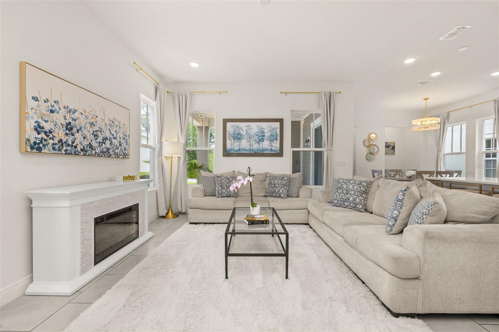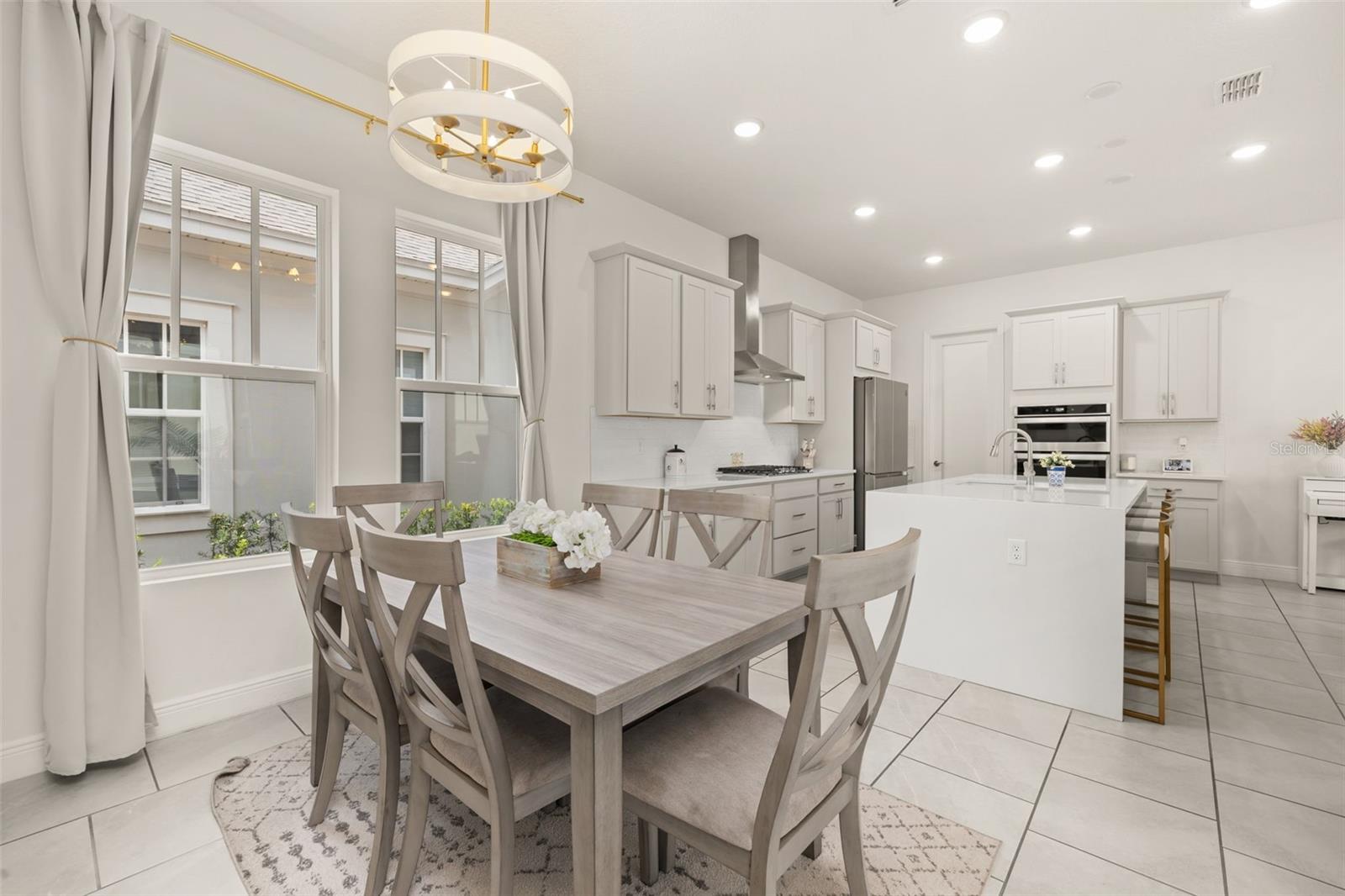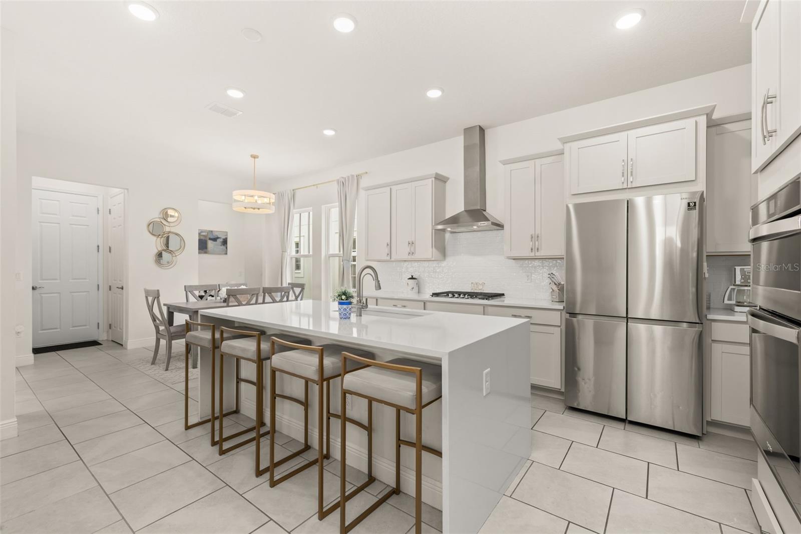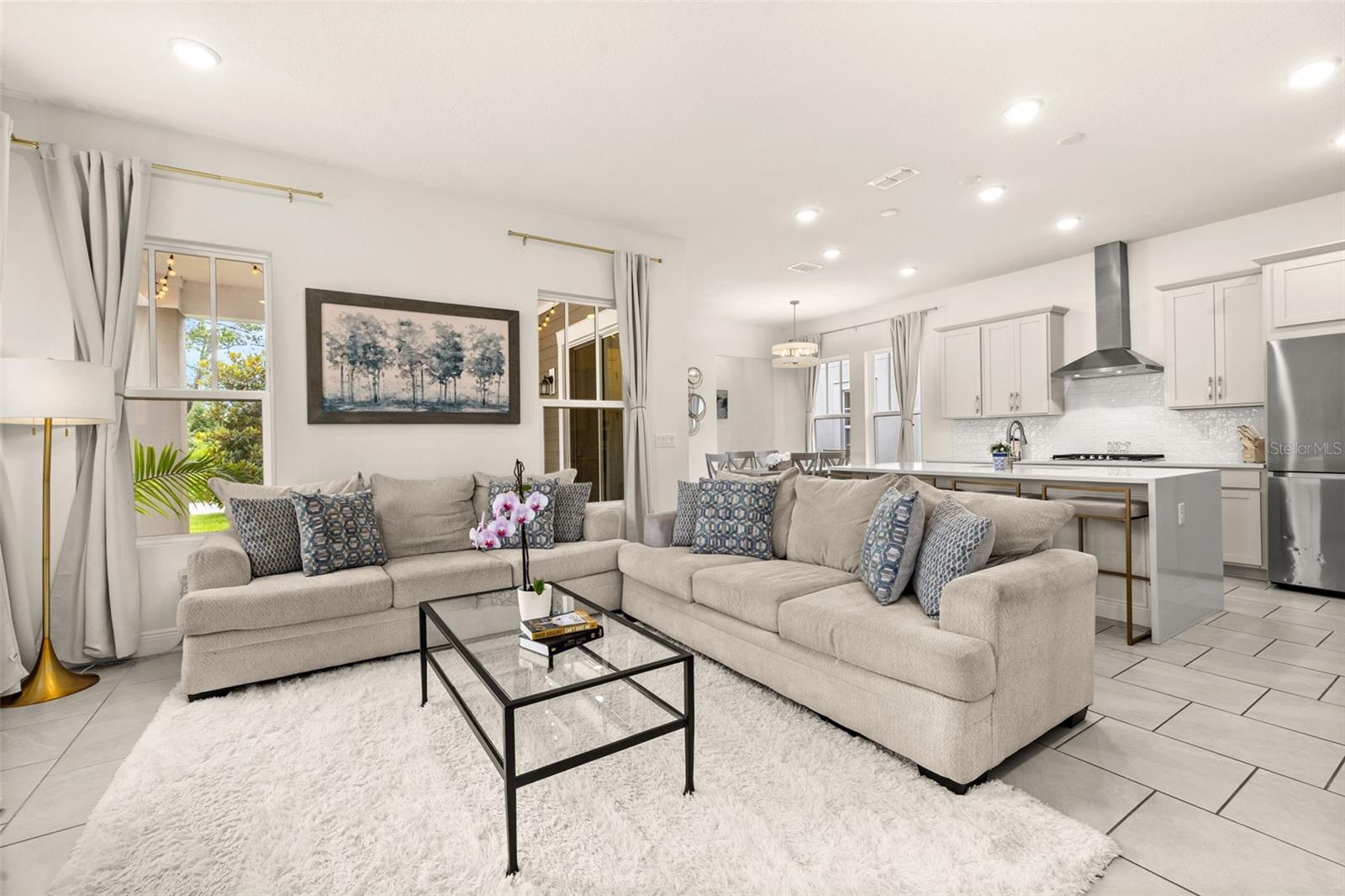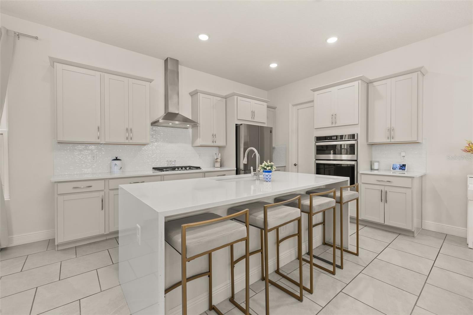 Welcome to an exquisite residence nestled in the heart of Island Village, Celebration. This elegant home offers an open and modern living experience with spacious flex and entertaining areas abound. LOCATED with CONSERVATION behind the property creating the beauty of nature. Step inside to discover a seamless blend of style and functionality. Upon entering the grand two story foyer entryway, one notices 12x12 ceramic tile flooring laid in brickwork vertical offset pattern, 5 inch baseboards, 8 foot high doors, dual pane windows and recessed lighting throughout. Just off the foyer is the first floor Office/5TH BEDROOM with walk in closets, the perfect flex space to suit your needs. Moving towards the heard of the home, one is greeted by the large living area with open floorplan design, plenty of natural light and ease of access to kitchen and outdoor spaces, an entertainers dream. The kitchen features alabaster colored 42 inch cabinets with brushed nickel pulls, pure white quartz counters with waterfall edge finish, blanco wave style subway tile backsplash and a single basin undermount sink with gooseneck faucet and filter tap. The stainless steel double oven, 4 burner gas stove, French door refrigerator and dishwasher complete this chefs paradise. The adjoining dining area and kids zone nook flows effortlessly making it ideal for both entertaining and cozy gatherings. Just off the dining area is the lanai overlooking the oversized side and backyard area, a premium in Celebration. As you head upstairs, the loft area provides a secluded hang out spot for those wanting a little getaway. The primary suite is adorned with tray ceiling with recessed lighting, oversized walk-in closet and primary bath perfected with gentlemen's height dual vanity, brushed nickel pulls, quartz countertops, square cut undermount sinks, dual handle faucets and walk-in shower with tile to the ceiling. Down the hall you'll find the secondary bathroom flanked by bedrooms 2, 3 and 4. The secondary bathroom is also embellished with gentlemen's height dual vanity, brushed nickel pulls, quartz countertops, square cut undermount sinks, dual handle faucets and tub/shower combo. Just one block from Downtown Island Village shops and restaurants, enjoy the community amenities, gym, pool and over 26 miles of Celebration's Nature Trails. This home also provides easy access to all that Celebration has to offer, only 1 mile to the new Shops at Celebration Pointe, 4 miles to Market Street, and less than 15 minutes to Magic Kingdom. This perfect blend of modern elegance and thoughtful design awaits your presence.