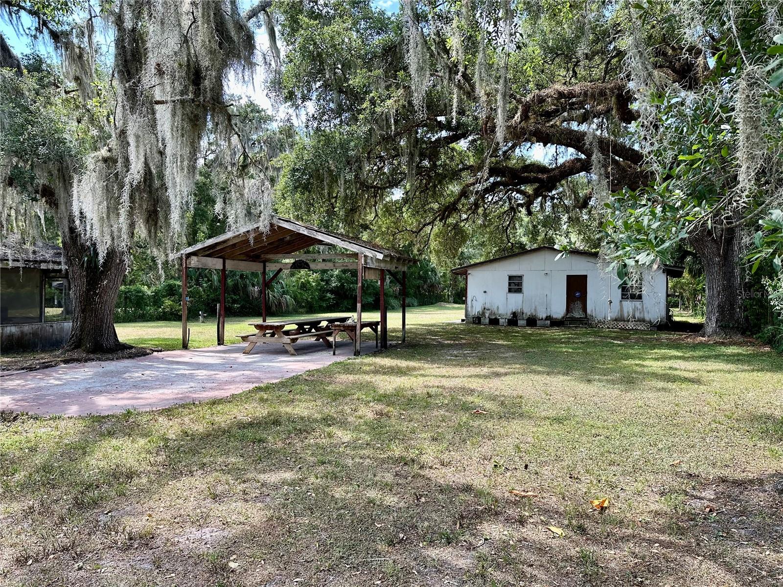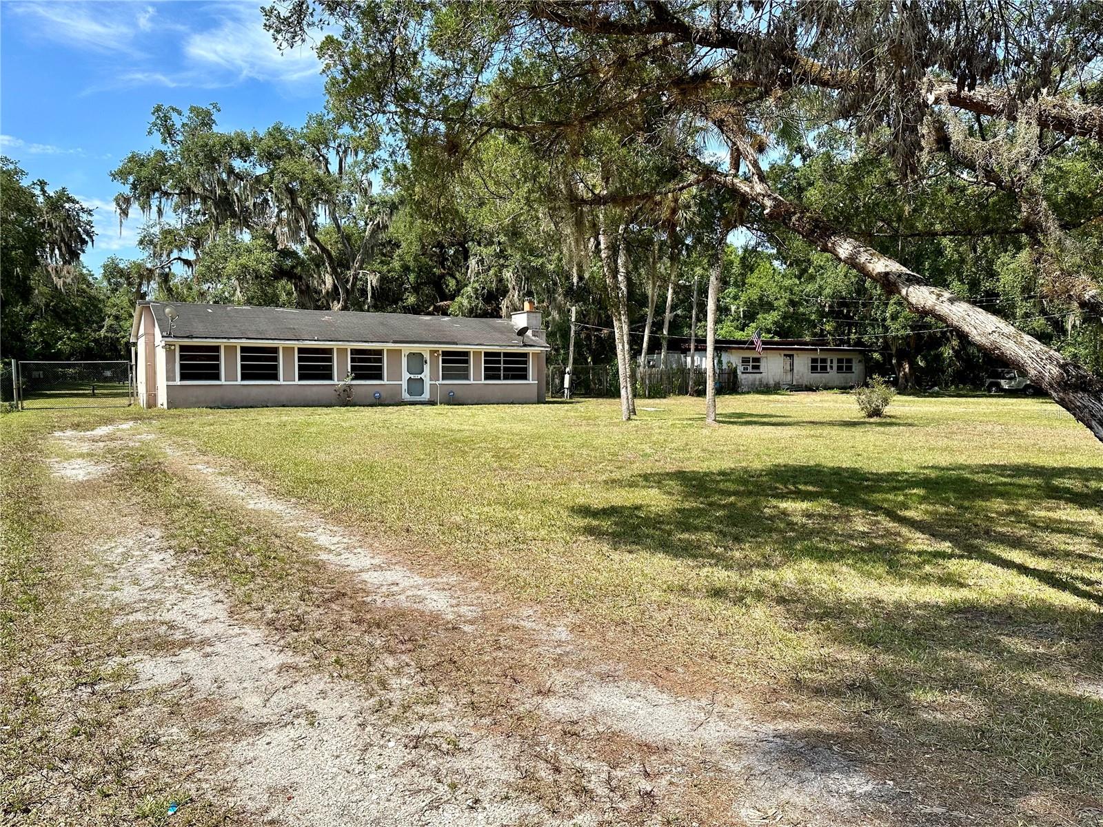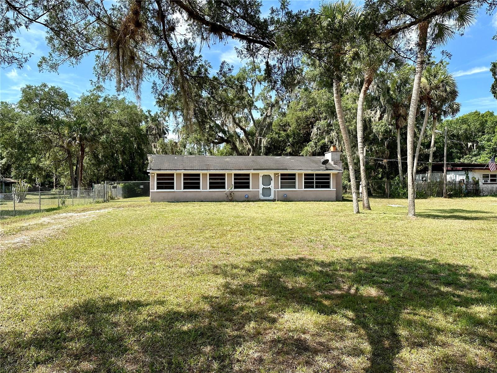 One acre of land covered with beautiful oak trees. Enough room to store all of your play toys. That's right, there is NO HOA here. This two bedroom one bath home has recently been remodeled throughout with new paneling on the walls and ceilings. New carpeting throughout, new kitchen cabinetry, and countertops. The bonus room features a real wood-burning Stone fireplace. There is a huge storage shop building in the back with a side concrete slab for all of your projects or parking. There is currently 2 wells and 2 septic tanks on the property. A little gazebo and a covered area for friends and family to gather. You are located in between Orlando and Titusville, so the commute to either is quite short. Florida's Space Coast Beaches are only 30 minutes away. Schedule your viewing soon.
