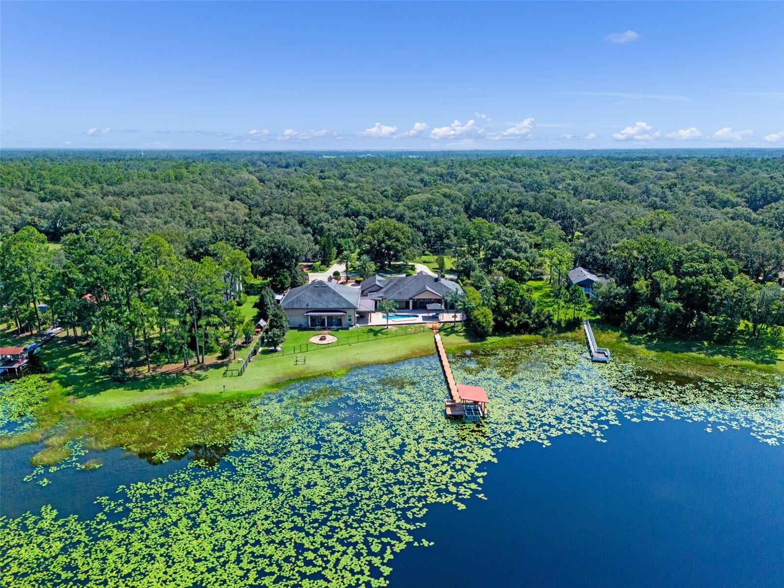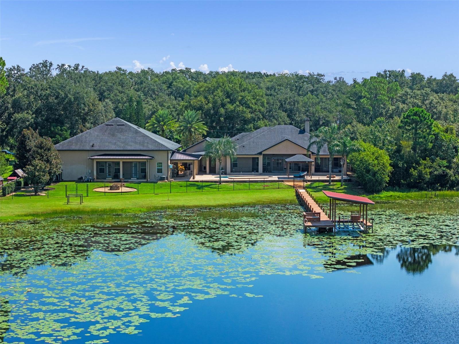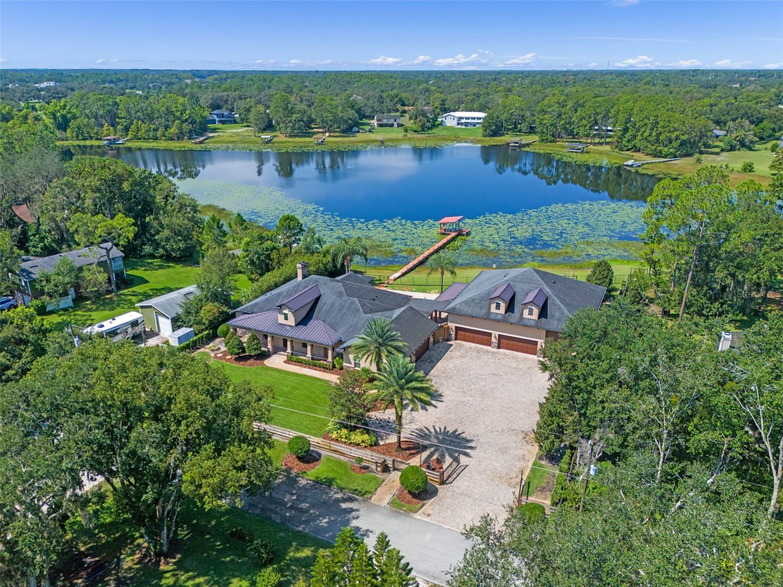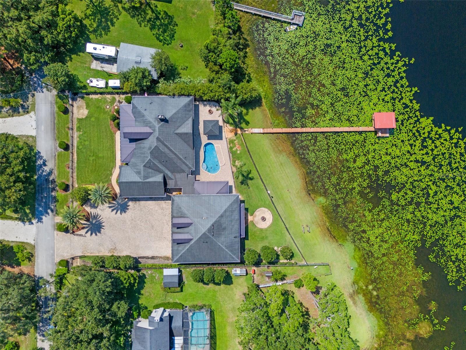Lakefront estate of unparalleled elegance. Discover an extraordinary custom home where luxury meets lakefront tranquility on this spectacular estate. This architectural masterpiece showcases impeccable craftsmanship throughout, featuring soaring high ceilings and elegant 10-foot doors that create an atmosphere of grandeur and quality. The heart of this home centers around the magnificent living room, where solid wood built-ins surround a stunning fireplace and entertainment center, ideally framing your lakefront views. Gorgeous flooring flows seamlessly throughout, complemented by exquisite ceiling beam accents, custom trim work, and dramatic tray ceilings that add architectural interest to every room. The gourmet kitchen stands as a culinary masterpiece, boasting beautiful granite countertops, premium stainless steel appliances, and a thoughtfully designed butler's pantry. A built-in buffet area provides elegant entertaining space, while stone wall accents add natural beauty and warmth. Retreat to the luxurious primary suite, which offers direct access to an expansive screened porch overlooking both the sparkling pool and serene lake. The closet system and closet island with granite top ensures organized living, while plantation shutters throughout the home provide privacy and classic elegance. This thoughtfully designed split-bedroom floor plan includes additional bedrooms, with one featuring an en-suite bath, custom built-ins, walk-in closet, and generous storage areas. Amazing southwest-facing lake views promise breathtaking sunsets from multiple vantage points. The outdoor living spaces rival any resort destination. A fully equipped summer kitchen features a sink, premium grill, and outdoor shower, while the charming cabana provides the ideal poolside retreat. The lakefront location includes a private dock with lift, and a cozy firepit area creates magical evening gatherings. Vehicle enthusiasts will appreciate the exceptional garage facilities: a three-car attached garage, plus a remarkable four-car detached garage with additional RV accommodation. The detached structure also houses two versatile rooms – one serving as a games room, office, workshop, or gym with half bath, and a complete in-law suite featuring separate entrance, full bath and kitchenette. Practical luxury continues with an oversized laundry room featuring custom cabinetry, sink and granite counters. The fenced rear yard ensures privacy, while the electric-gated entrance with paver driveway and gorgeous landscaping creates impressive curb appeal. In an ideal setting with no HOA restrictions, this exceptional property offers the ultimate in lakefront luxury living, where every detail has been carefully considered to create a remarkable estate.