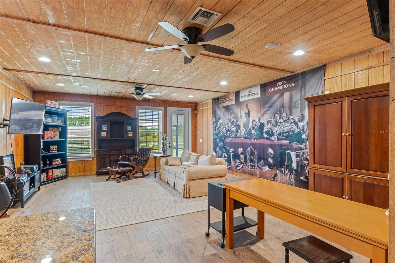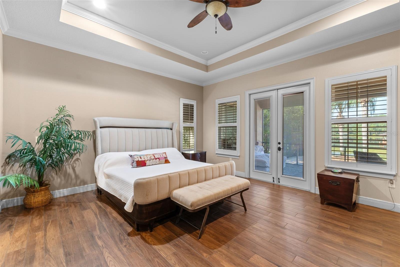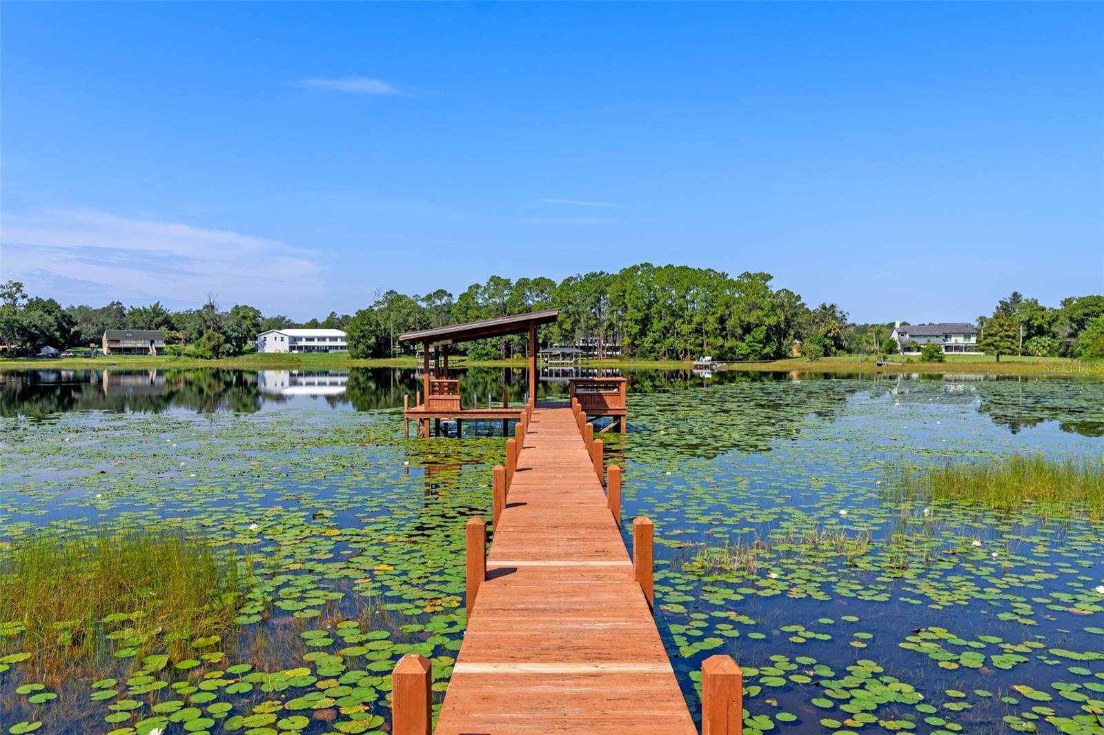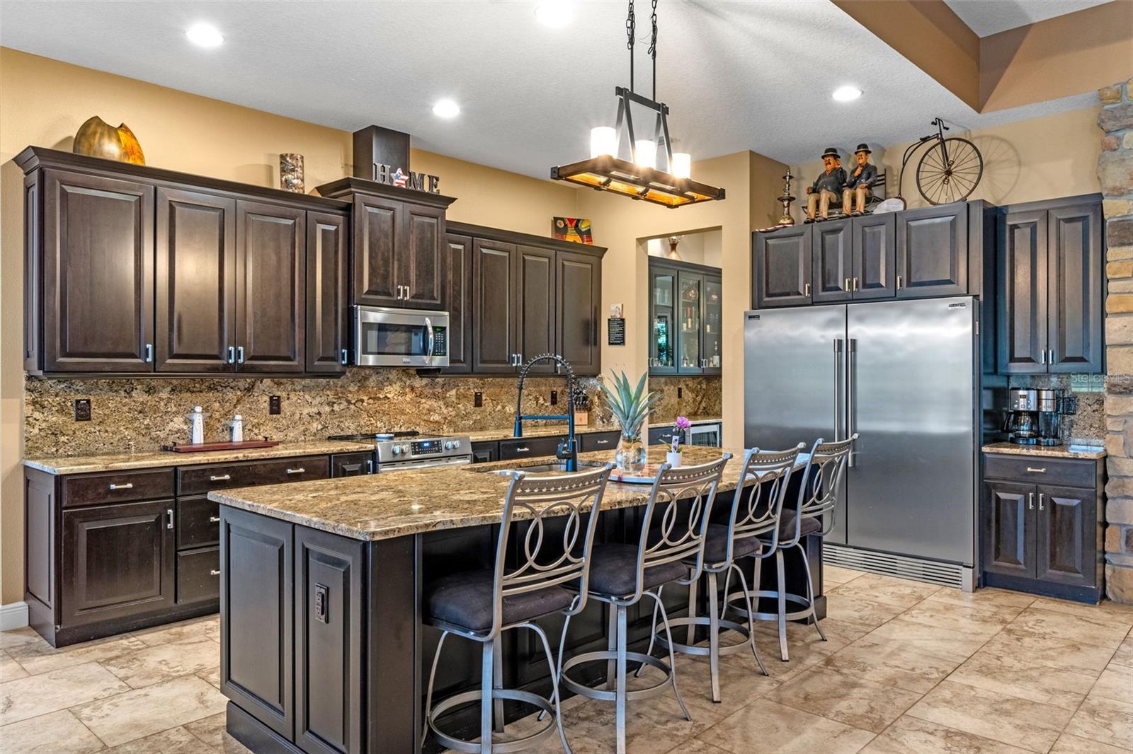 Lakefront estate of unparalleled elegance. Discover an extraordinary custom home where luxury meets lakefront tranquility on this spectacular estate. This architectural masterpiece showcases impeccable craftsmanship throughout, featuring soaring high ceilings and elegant 10-foot doors that create an atmosphere of grandeur and quality. The heart of this home centers around the magnificent living room, where solid wood built-ins surround a stunning fireplace and entertainment center, ideally framing your lakefront views. Gorgeous flooring flows seamlessly throughout, complemented by exquisite ceiling beam accents, custom trim work, and dramatic tray ceilings that add architectural interest to every room. The gourmet kitchen stands as a culinary masterpiece, boasting beautiful granite countertops, premium stainless steel appliances, and a thoughtfully designed butler's pantry. A built-in buffet area provides elegant entertaining space, while stone wall accents add natural beauty and warmth. Retreat to the luxurious primary suite, which offers direct access to an expansive screened porch overlooking both the sparkling pool and serene lake. The closet system and closet island with granite top ensures organized living, while plantation shutters throughout the home provide privacy and classic elegance. This thoughtfully designed split-bedroom floor plan includes additional bedrooms, with one featuring an en-suite bath, custom built-ins, walk-in closet, and generous storage areas. Amazing southwest-facing lake views promise breathtaking sunsets from multiple vantage points. The outdoor living spaces rival any resort destination. A fully equipped summer kitchen features a sink, premium grill, and outdoor shower, while the charming cabana provides the ideal poolside retreat. The lakefront location includes a private dock with lift, and a cozy firepit area creates magical evening gatherings. Vehicle enthusiasts will appreciate the exceptional garage facilities: a three-car attached garage, plus a remarkable four-car detached garage with additional RV accommodation. The detached structure also houses two versatile rooms – one serving as a games room, office, workshop, or gym with half bath, and a complete in-law suite featuring separate entrance, full bath and kitchenette. Practical luxury continues with an oversized laundry room featuring custom cabinetry, sink and granite counters. The fenced rear yard ensures privacy, while the electric-gated entrance with paver driveway and gorgeous landscaping creates impressive curb appeal. In an ideal setting with no HOA restrictions, this exceptional property offers the ultimate in lakefront luxury living, where every detail has been carefully considered to create a remarkable estate.