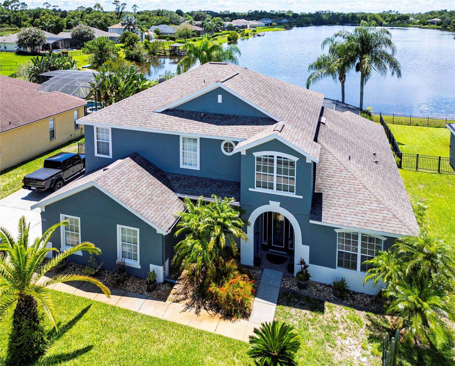Live the life you've always wanted in Osprey Lakes, which undoubtedly has to be the best kept secret in Seminole County. Experience the ultimate in lakefront living – a harmonious blend of elegance, comfort, and natural beauty. Step outside to your private oasis, where a spacious patio and sparkling pool awaits. It's the perfect spot for relaxation and alfresco dining with the backdrop of the tranquil lake and stunning sunsets creating an idyllic setting for both day and night. When you step in to the home, you are greeted with high ceilings and wood floors in the formal living and dining area, along with a bonus room/study, which is currently being used as an office. NEXT~ The downstairs oversized owner's suite features a bay window looking out over the pool to your gorgeous lake! You'll enjoy all of the closet space provided with his and her closests, along with built in organizers for maximum efficiency. The expansive bathroom will never leave you wanting 'more space' or feeling cramped, with it's large linen closet, private water closest and 2 separate sinks. Continue viewing the water from your eat in kitchen, family room, AND kitchen area, where you can also access the covered screen porch and pool area. Off of the large kitchen you will find the 1/2 bath/pool bath, along with under the stairs storage, access to the 2-sided staircase and the large separate laundry room. Moving upstairs there is a wet bar area off the loft, along with an oversized bedroom that has a large walk-in closet. Bedrooms 3 & 4 are also oversized and connected by a jack-n-jill bathroom. Once you have viewed the home, don't forget to peer in the expansive side loading garage. This home really has EVERYTHING you would want for a growing or multigenerational family. Space for everyone and closets galore. Don't wait to see this home, because views like this don't come around often! Improvements in 2023: exterior painted, patio painted and 2 new HVAC systems. Roof is 2015.