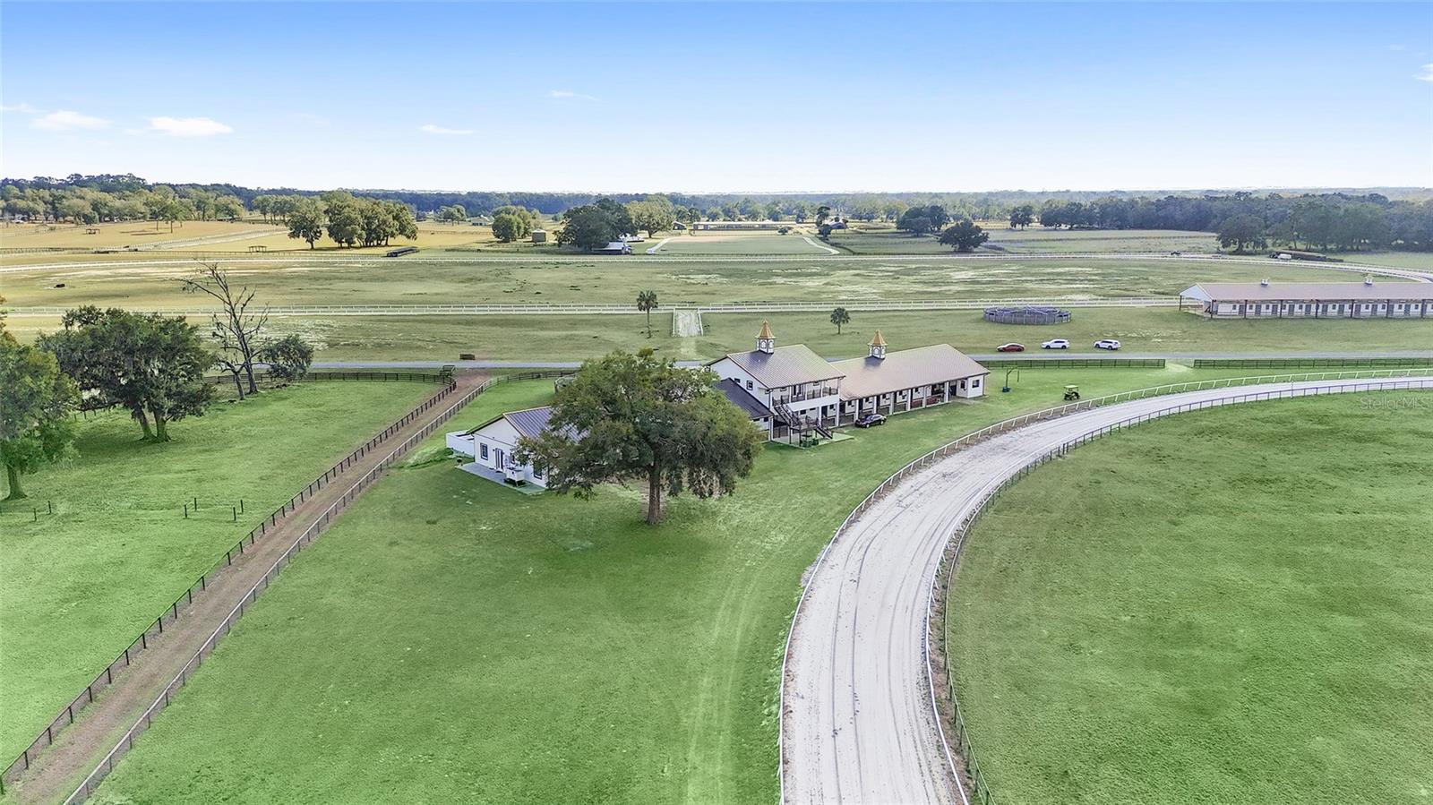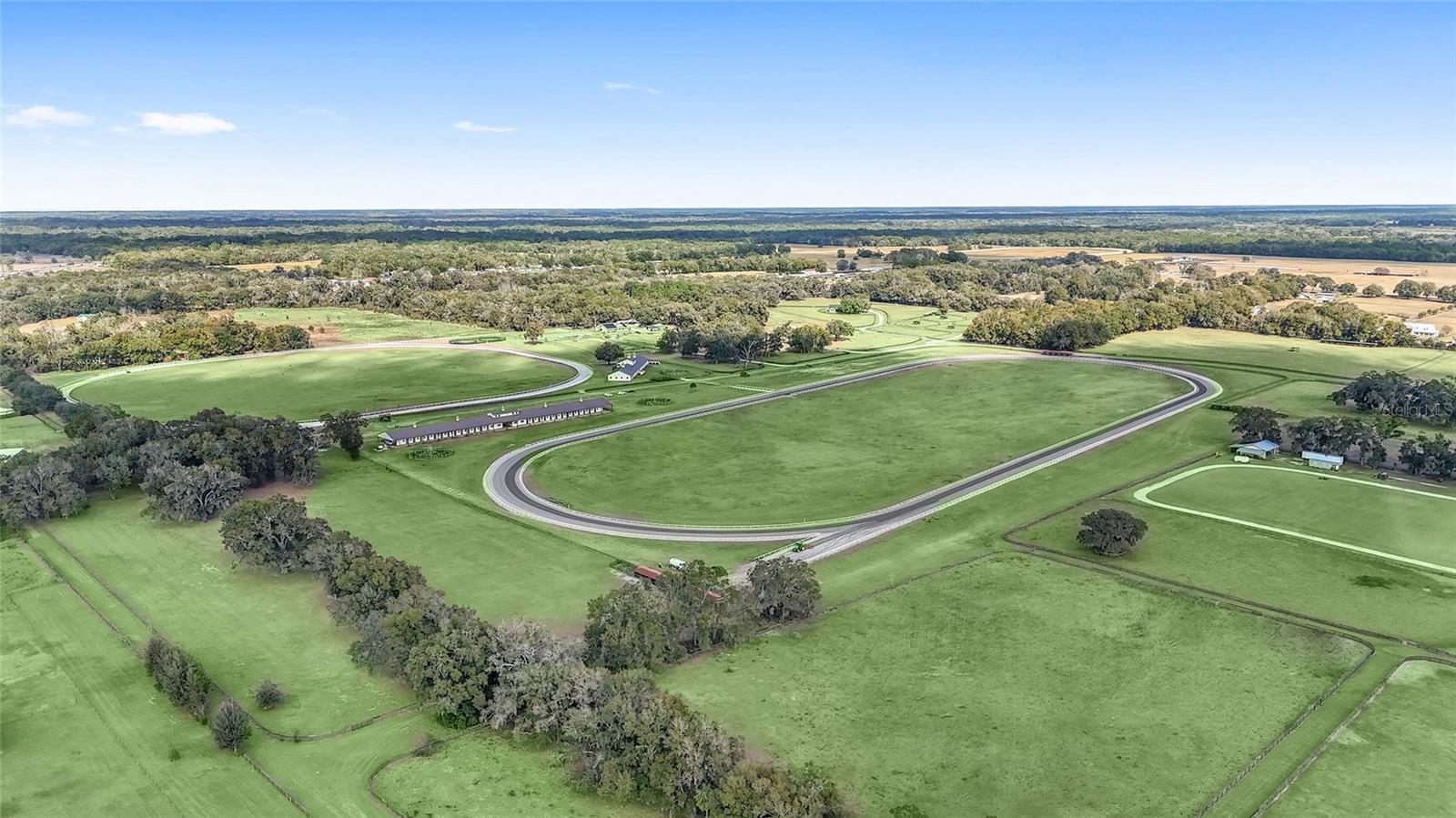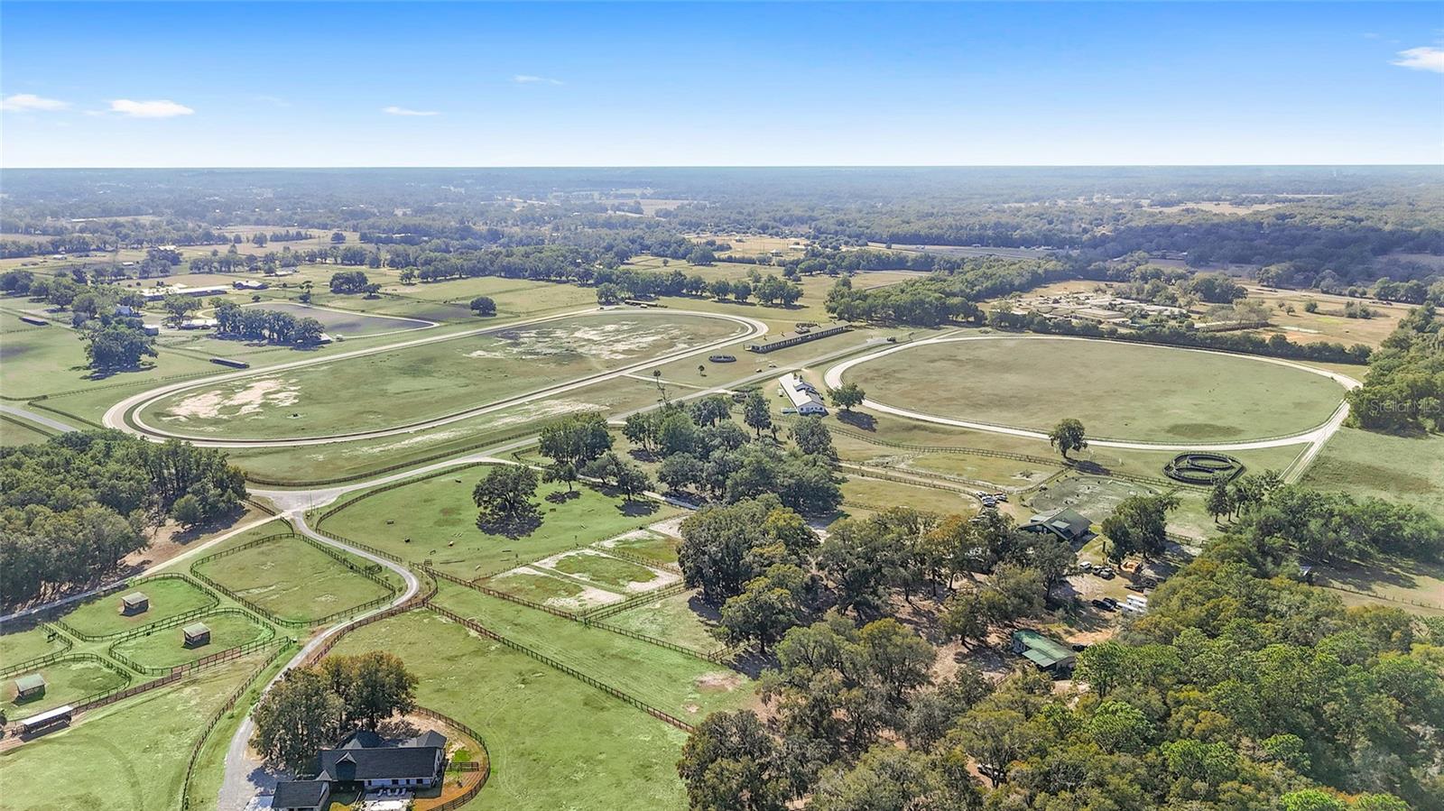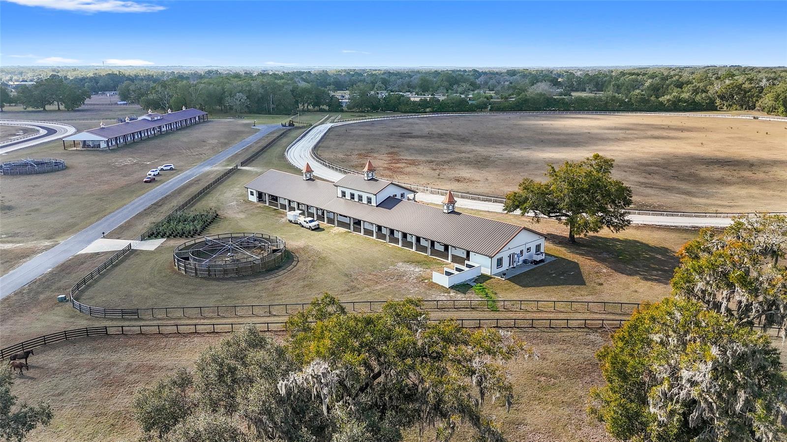 OWNER FINANCING OPTIONS AVAILABLE. Discover a rare opportunity to create your own premier equestrian community on 102 acres of high and dry land. This exceptional luxury development offers multiple purchase options, including nine 10-acre lots perfect for designing a custom equestrian neighborhood with a shared or revampable track. Turn-Key Training Facility: Enter through a striking double iron electric gate with keypad access. Enjoy expansive space ready for personalized landscaping, with irrigation already in place. Drive along smooth, winding, paved, and lighted roads that enhance the property's natural beauty. Benefit from underground utilities (cable, internet, phone) available throughout the facility. Impressive Barns and Living Quarters: Barn One: A grand custom barn featuring 28 stalls. An upstairs 3-bedroom, 2-bath apartment (1,150 sq. ft.) boasting a full kitchen, upgraded stainless steel appliances, granite countertops, porcelain tile, a full-size washer and dryer, and a breathtaking balcony view overlooking the north track. Second Private Home- A first-floor 2-bedroom, 1-bath apartment with granite counters and porcelain tile- amazing kitchen and living room. Additional ground-level facilities include barn office, stalls separated by block partitions, hot/cold wash racks, two offices (each with a half bath), and a combined kitchen/laundry area with a full bath. Additional Barn: 52 stalls- this over 22,000 sq. ft. barn. Including 4 efficiency barn apartments 1/1 with full bathroom. Ready to move your horses right in. Extensive Equestrian Amenities: Two race tracks on site—a five furlong track to the north and a six furlong track. Rolling, fenced green pastures with water access throughout. Complete with an additional: 9-stall feeding barns and six brood mare shelters with attached paddocks. A spacious 24' x 80' hay barn. Three hot-walkers to support daily training routines. Enjoy miles of trail riding throughout the community. Development Potential: Multiple residential and apartment options available, with lot sizes ranging from 10 to 30 acres—ideal for custom builds or exploring innovative business opportunities. Ownership rights include majority voting in the HOA, ensuring a voice in community decisions. This thoughtfully designed, gated development is perfectly situated and ready to support an active equestrian lifestyle. More photos and videos will available—contact us today for further details and to explore the many possibilities this property offers!
