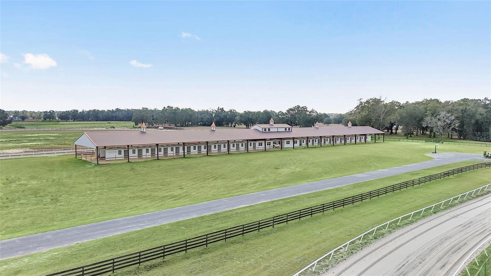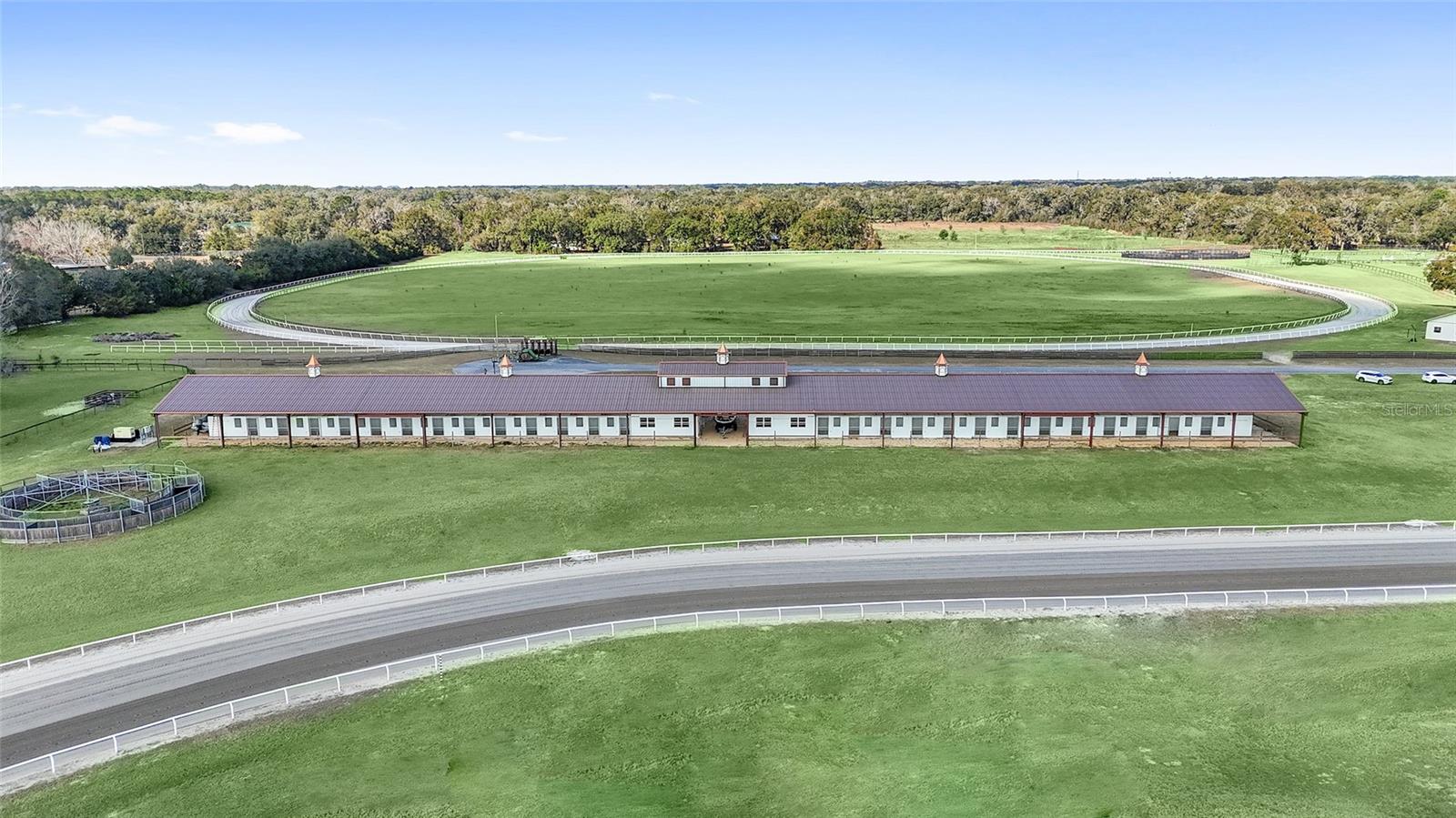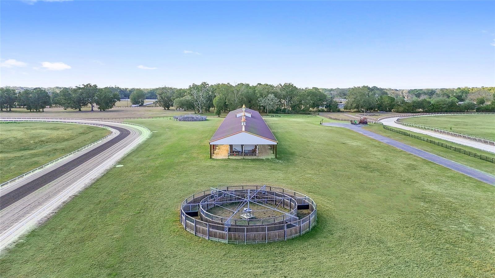 OWNER FINANCING OPTIONS AVAILABLE. Discover a rare opportunity to create your own premier equestrian community on 102 acres of high and dry land. This exceptional luxury development offers multiple purchase options, including nine 10-acre lots perfect for designing a custom equestrian neighborhood with a shared or revampable track. Turn-Key Training Facility: Enter through a striking double iron electric gate with keypad access. Enjoy expansive space ready for personalized landscaping, with irrigation already in place. Drive along smooth, winding, paved, and lighted roads that enhance the property's natural beauty. Benefit from underground utilities (cable, internet, phone) available throughout the facility. Impressive Barns and Living Quarters: Barn One: A grand custom barn featuring 28 stalls. An upstairs 3-bedroom, 2-bath apartment (1,150 sq. ft.) boasting a full kitchen, upgraded stainless steel appliances, granite countertops, porcelain tile, a full-size washer and dryer, and a breathtaking balcony view overlooking the north track. Second Private Home- A first-floor 2-bedroom, 1-bath apartment with granite counters and porcelain tile- amazing kitchen and living room. Additional ground-level facilities include barn office, stalls separated by block partitions, hot/cold wash racks, two offices (each with a half bath), and a combined kitchen/laundry area with a full bath. Additional Barn: 52 stalls- this over 22,000 sq. ft. barn. Including 4 efficiency barn apartments 1/1 with full bathroom. Ready to move your horses right in. Extensive Equestrian Amenities: Two race tracks on site—a five furlong track to the north and a six furlong track. Rolling, fenced green pastures with water access throughout. Complete with an additional: 9-stall feeding barns and six brood mare shelters with attached paddocks. A spacious 24' x 80' hay barn. Three hot-walkers to support daily training routines. Enjoy miles of trail riding throughout the community. Development Potential: Multiple residential and apartment options available, with lot sizes ranging from 10 to 30 acres—ideal for custom builds or exploring innovative business opportunities. Ownership rights include majority voting in the HOA, ensuring a voice in community decisions. This thoughtfully designed, gated development is perfectly situated and ready to support an active equestrian lifestyle. More photos and videos will available—contact us today for further details and to explore the many possibilities this property offers!