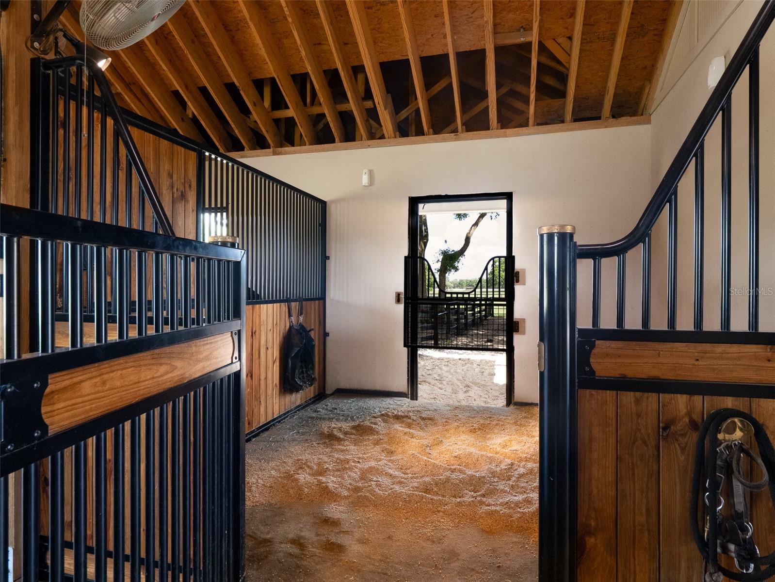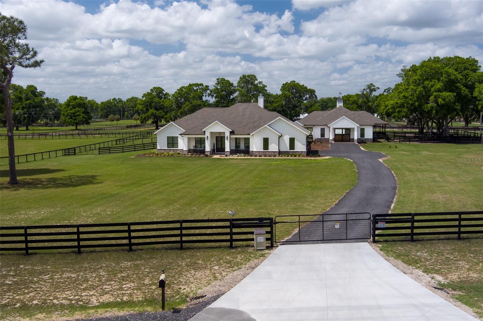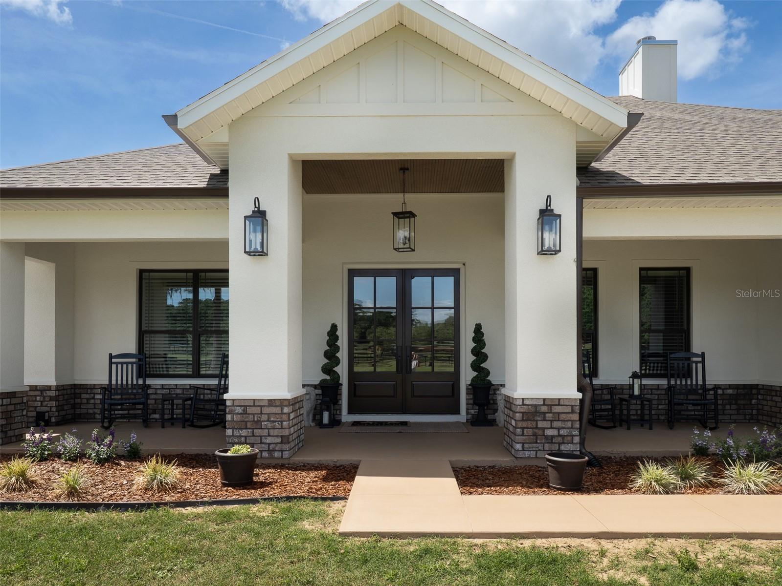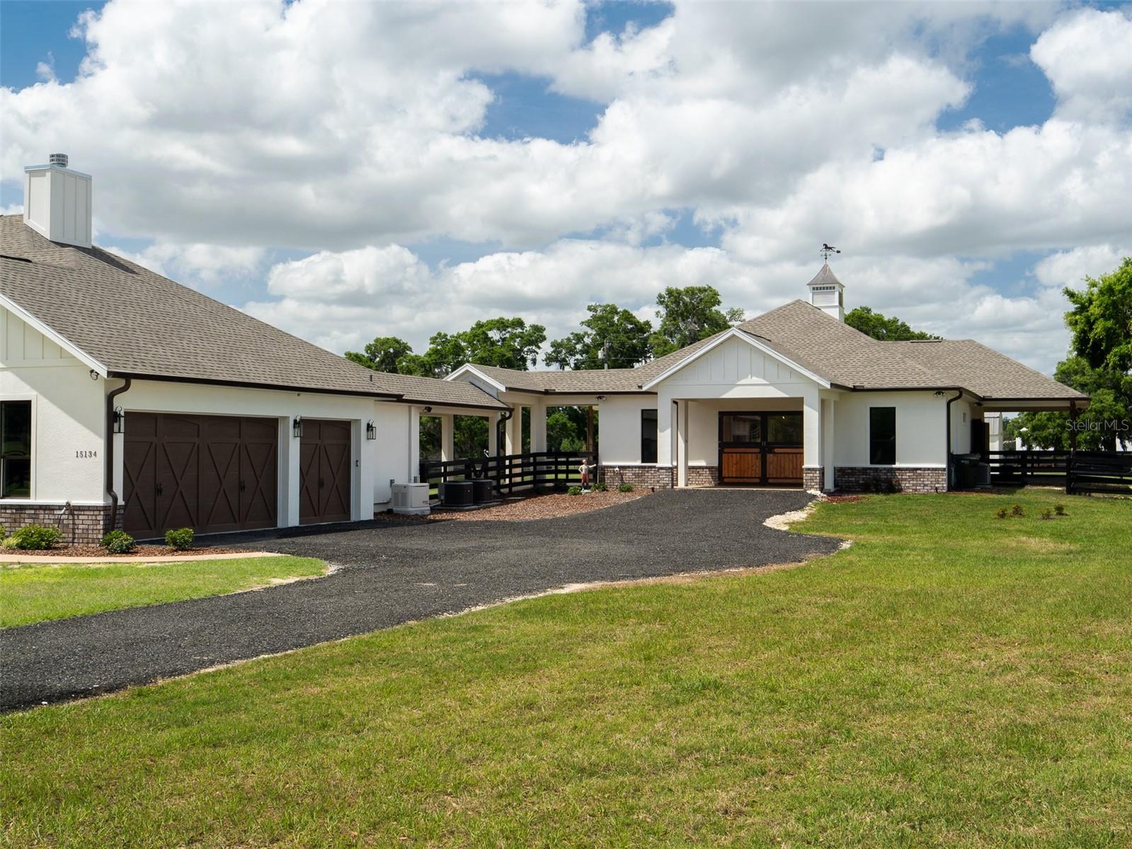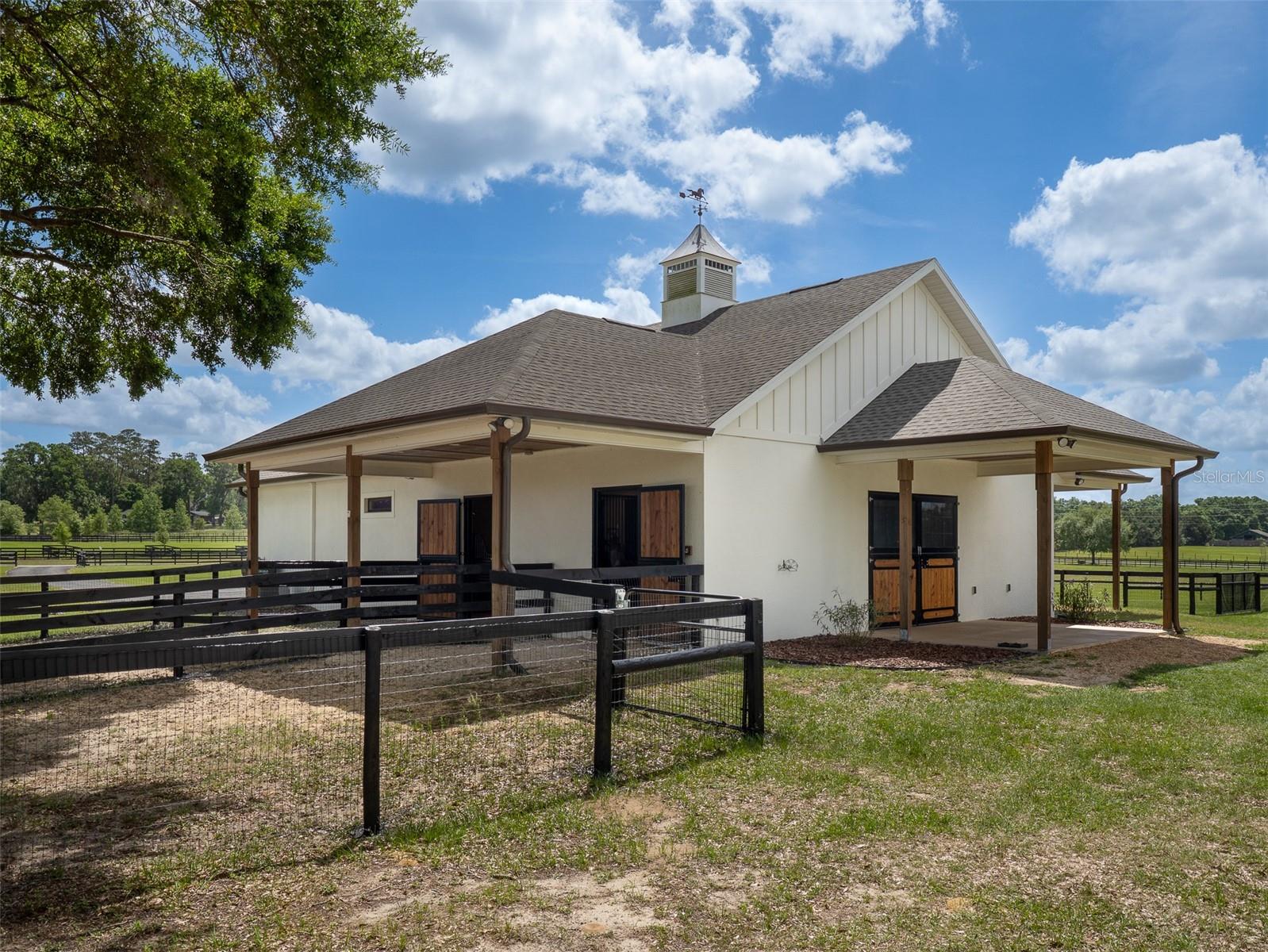 Located just 20 minutes from the World Equestrian Center, this 9.90-acre farm is set within the gated equestrian community of Bellemont Farms. Designed with attention to both form and function, the property is fully fenced and thoughtfully laid out for equestrian living. The well-equipped 4-stall center-aisle barn features custom European stall fronts with Dutch doors, stall mattresses, and spacious overhangs outside each stall. Additional barn features include a temperature-controlled tack room, feed room, bathroom/laundry area, and a separate storage room. A whole-house fan installed in the cupola, equipped with a timer, provides added ventilation. The wash rack is outfitted with hot and cold water and heaters for added convenience. For additional practicality, the barn includes an RV hookup, and a covered walkway connects the barn to the main residence, offering sheltered access regardless of the weather. Four manicured paddocks provide generous space for turnout, and residents enjoy direct access to the community bridle path for riding within the subdivision. The 3-bedroom, 3-bathroom home showcases attention to detail throughout, featuring an open-concept design with engineered hardwood and porcelain tile flooring. High ceilings further enhance the sense of space, with 10-foot ceilings throughout and 11-foot ceilings in the family room and master bedroom. The chef’s kitchen boasts custom cabinetry with quartz countertops, a farmhouse sink, a Viking professional series gas range, Bosch appliances, a large walk-in pantry, and a spacious kitchen island that is topped with hickory wood and equipped with a sink for preparing meals for guests or entertaining. The master bathroom offers a spa-like retreat, complete with a standing air jet tub, a large walk-in shower, and dual designer vanities. The rear patio includes stub-outs ready for an outdoor kitchen sink and gas cooking, offering the opportunity to create a customized outdoor entertaining space. Completing the property is a 3-car garage with an electric vehicle charging station and a generator that powers both the home and barn, all set in a peaceful, upscale equestrian setting.