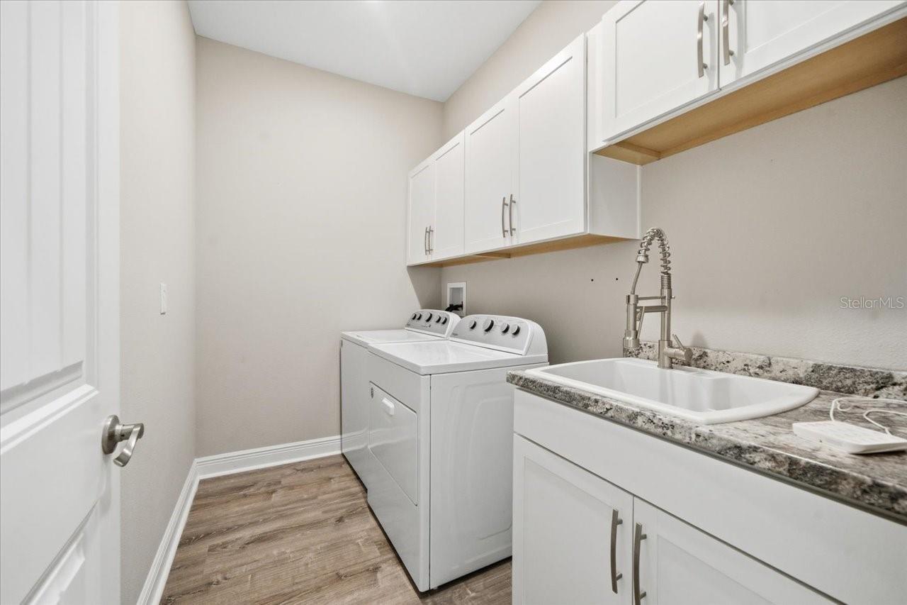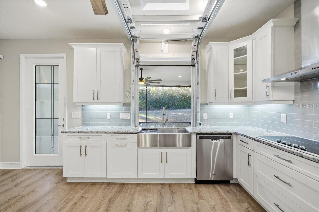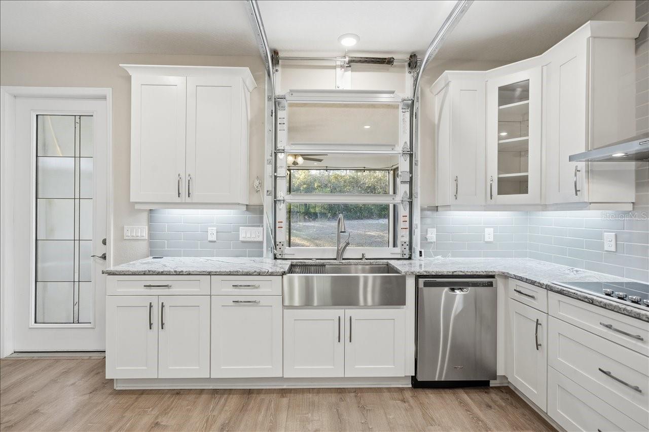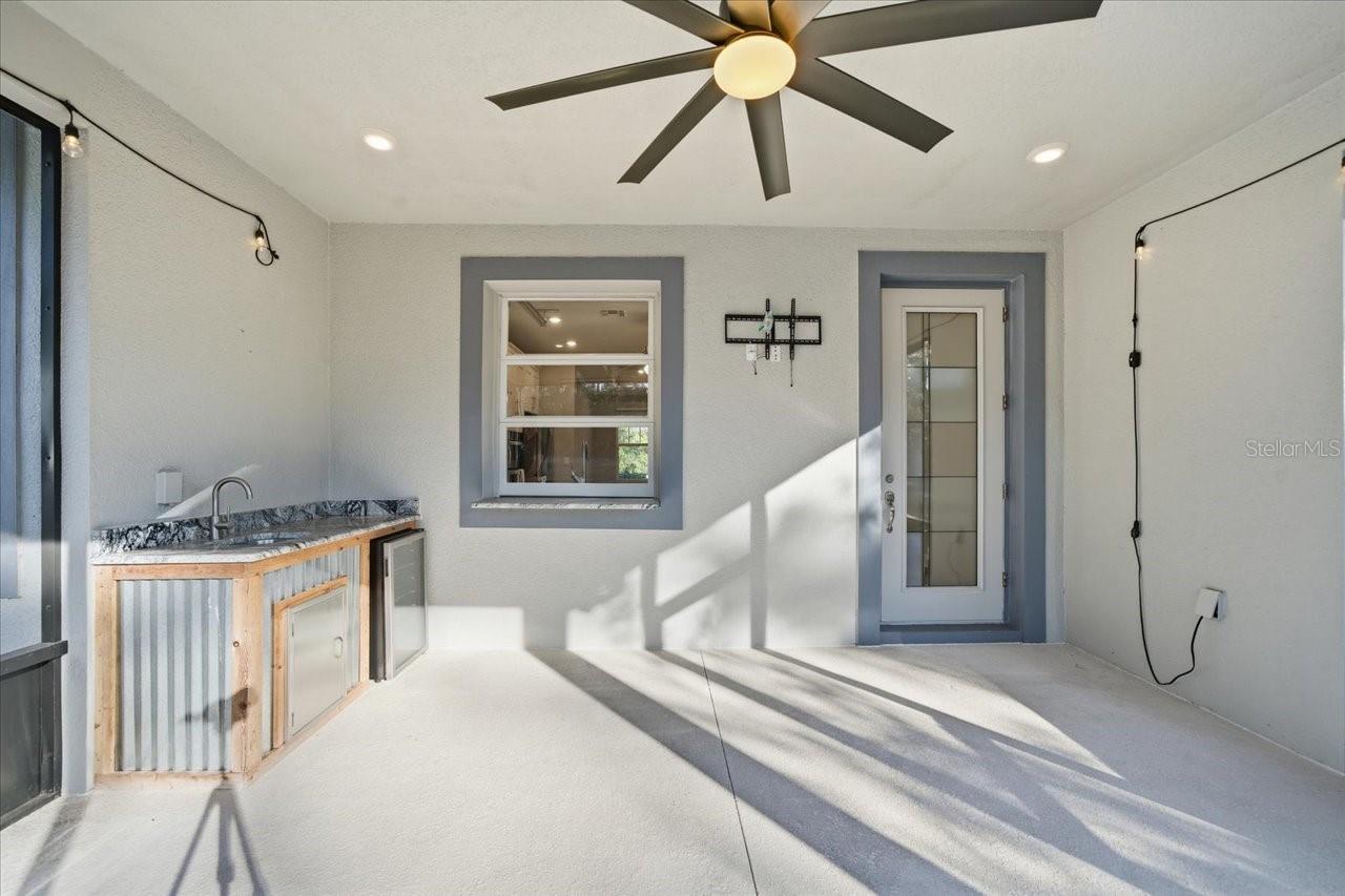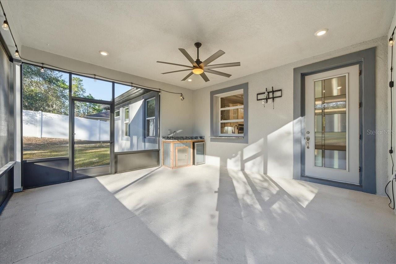 Prepare to be impressed the moment you step inside this beautifully upgraded home. Elegant tray ceilings highlight both the living room and primary bedroom, while 6" baseboards flow throughout for a clean, modern finish. The kitchen immediately commands attention with 42" cabinets topped with crown molding, soft-close features, under-cabinet lighting, and premium upgrades including quartz countertops, stainless steel appliances, a pot filler, and a distinctive garage-style window that opens directly to the patio, perfect for effortless entertaining. All bedrooms feature carpeting, while every bathroom showcases tile flooring and beautifully tiled showers. The primary suite is further elevated with a luxurious rain shower head, creating a spa-like experience at home. As you move toward the outdoor living area, a covered and screened patio invites you to relax year-round. The complete outdoor bar is built for hosting, featuring granite countertops and a beverage fridge. Gutters surround the entire home for added convenience and care. Inside the garage, you’ll find epoxy-sealed flooring and a Wi-Fi–enabled insulated garage door. Additional thoughtful enhancements include CCTV pre-wiring with cameras, an in-wall built-in safe in the primary bedroom, and a hideaway sliding screen at the front door. Quality construction adds even more value, with block exterior walls, spray foam insulation, and fully insulated exterior walls providing comfort and efficiency. Lightly lived in as a second home, this property feels nearly brand new and is truly move-in ready.