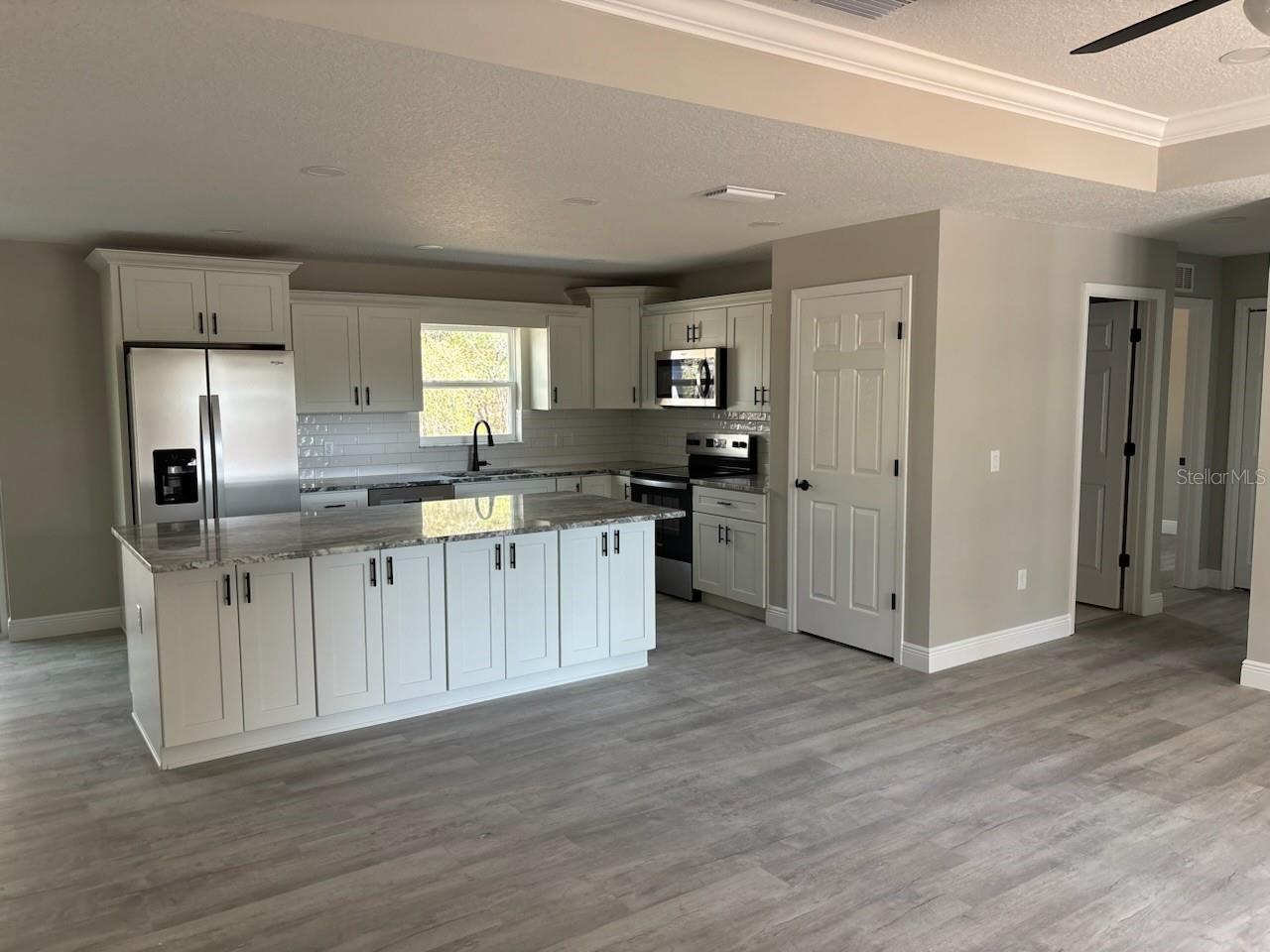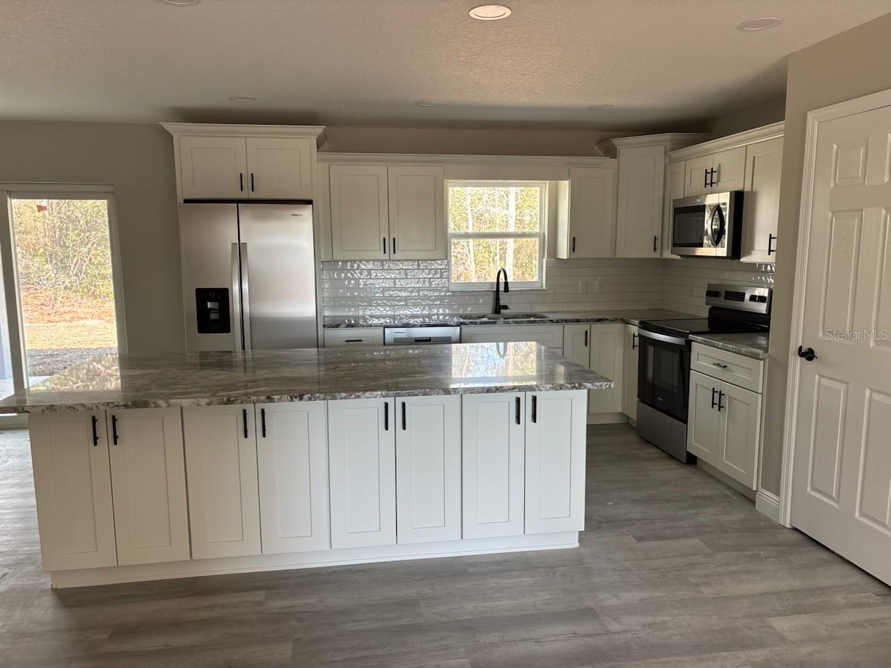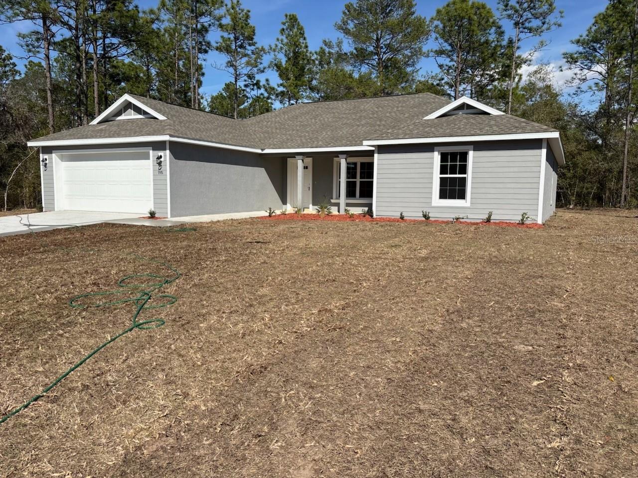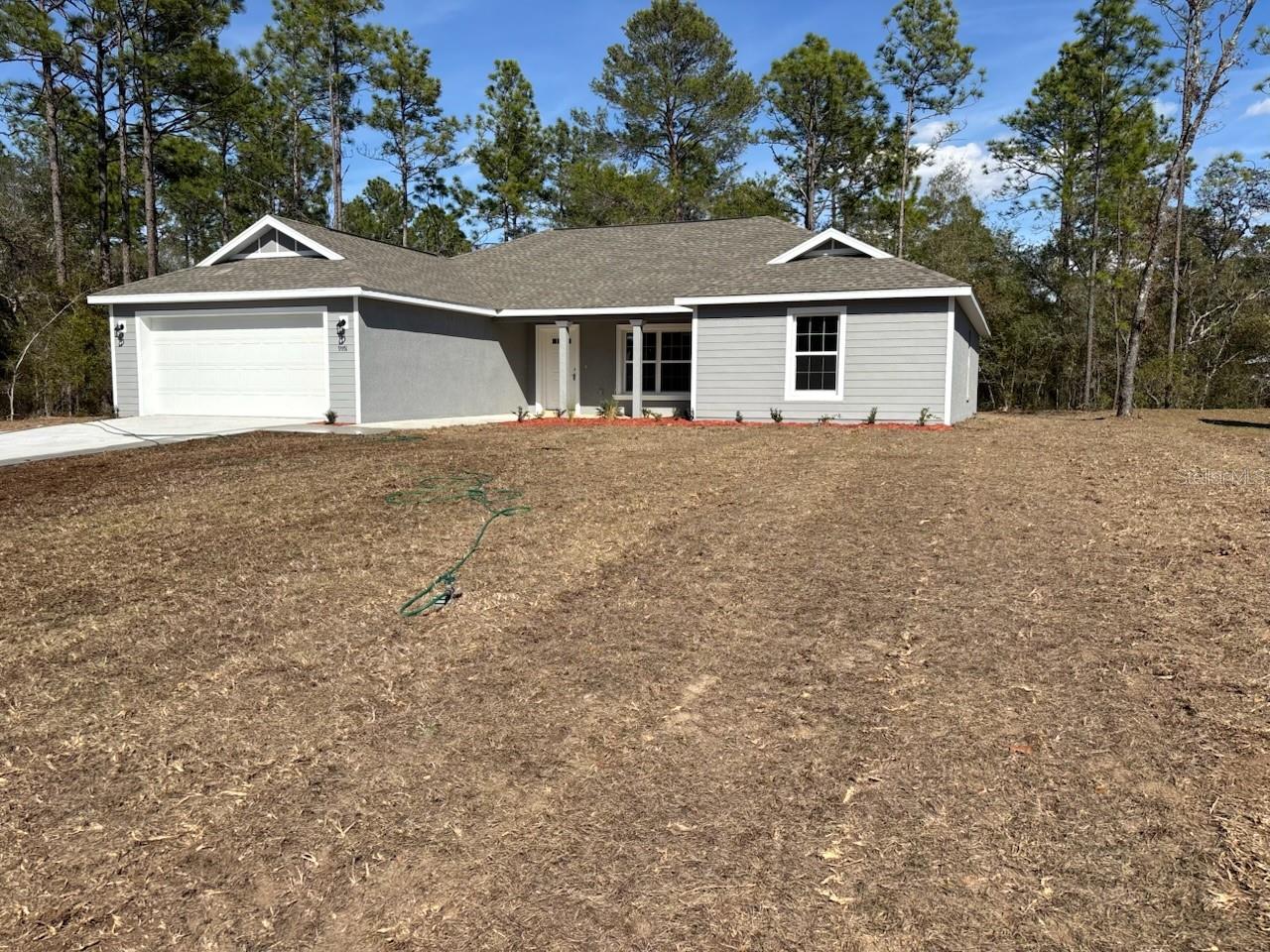 NEW CONSTRUCTION. MOVE-IN READY! The All New Captiva Model offers 4 bedrooms, 2 bathrooms, and 1,895 square feet of beautifully designed living space located in Citrus Springs. Built with solid concrete block construction, a 30-year architectural shingle roof, energy-efficient double-pane windows, and backed by a 10-year structural warranty, this home delivers lasting quality and peace of mind. The spacious great room features a tray ceiling with crown molding. It opens to a stunning kitchen complete with stainless steel appliances, custom white shaker cabinets with soft-close drawers, granite countertops, a subway tile backsplash, wrap-around refrigerator cabinetry, a built-in pantry, and an oversized island with large cabinets underneath. Luxury vinyl plank flooring runs through the main living areas and bedrooms, while all bathrooms feature elegant marble-look tile flooring. Both bathrooms include double vanities with granite countertops, and the private master suite offers two walk-in closets and a large dual-head shower for a spa-like retreat. Enjoy the convenience of a large laundry room with custom cabinets and a granite folding table, along with a flexible mud room or office space to fit your lifestyle. Step outside to a covered patio perfect for relaxing or entertaining. The attached 2-car garage includes an opener and remotes, and with no HOA fees, you will enjoy true ownership freedom. Located in flood zone X, this property is high and dry with no flood insurance required.