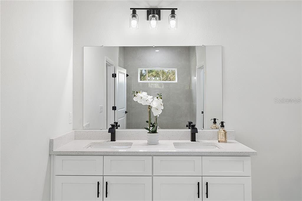 Discover modern Florida living in this newly built four-bedroom, two-bath home on a 0.23-acre lot in peaceful Dunnellon. The open-concept layout features a stylish kitchen with white quartz countertops, shaker cabinets, stainless steel appliances, and an island with seating for four. A split floor plan offers privacy, with a primary suite featuring two walk-in closets, matte black finishes, and a porcelain-tiled ensuite. Built with durable concrete block and stucco, the home includes a two-car garage and a spacious backyard with a patio. Conveniently located near Rainbow Springs State Park, KP Hole Park, and the Rainbow River, offering kayaking, tubing, and outdoor recreation.