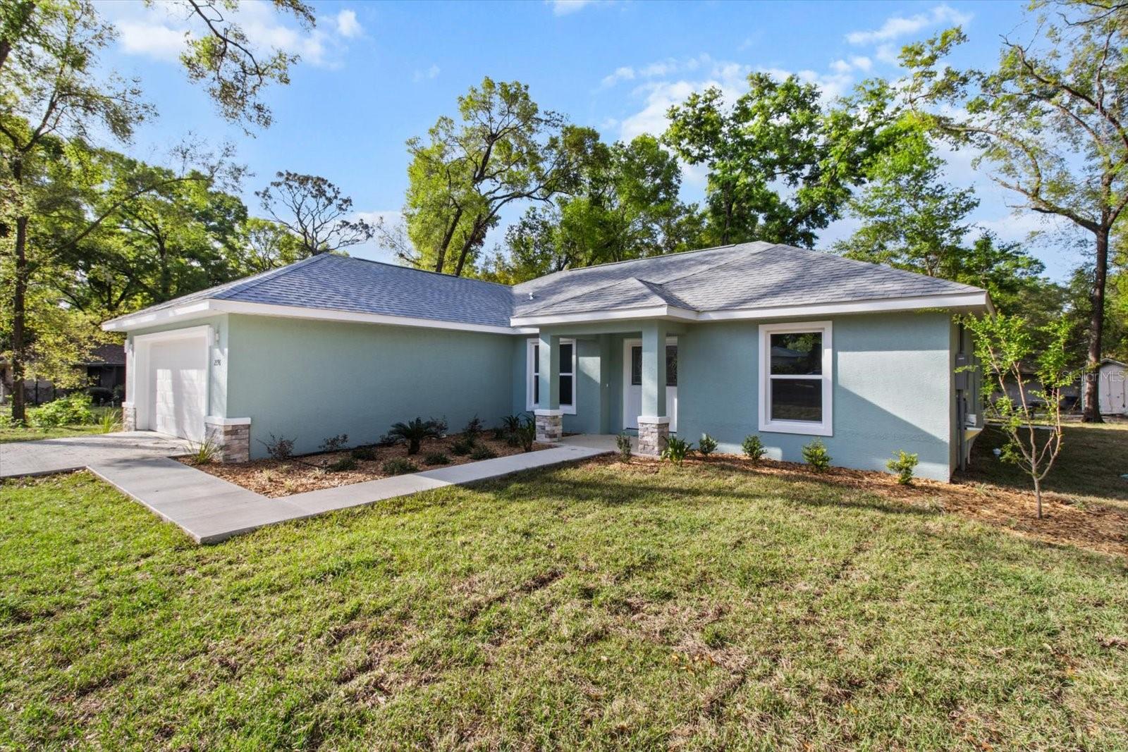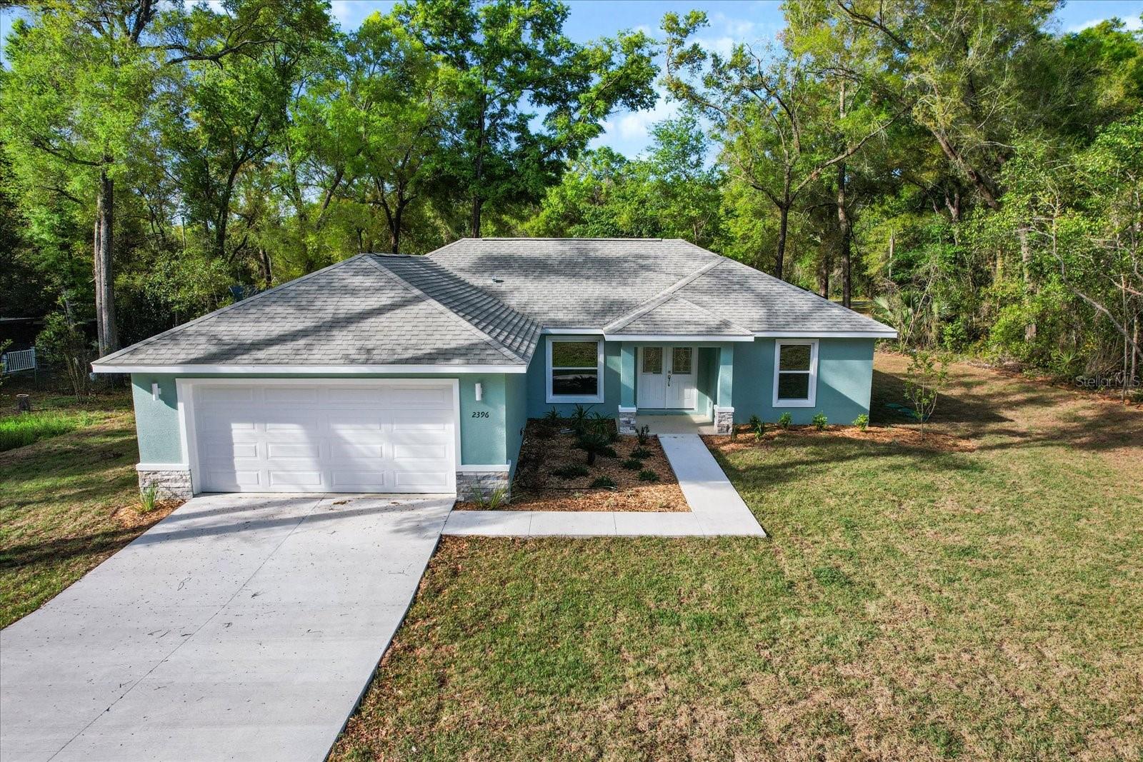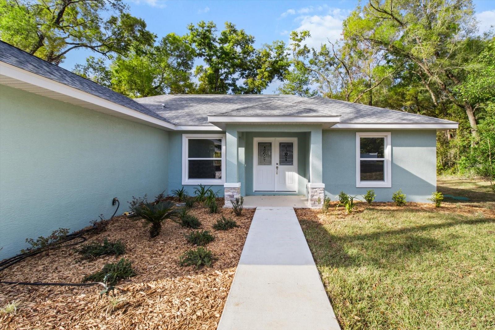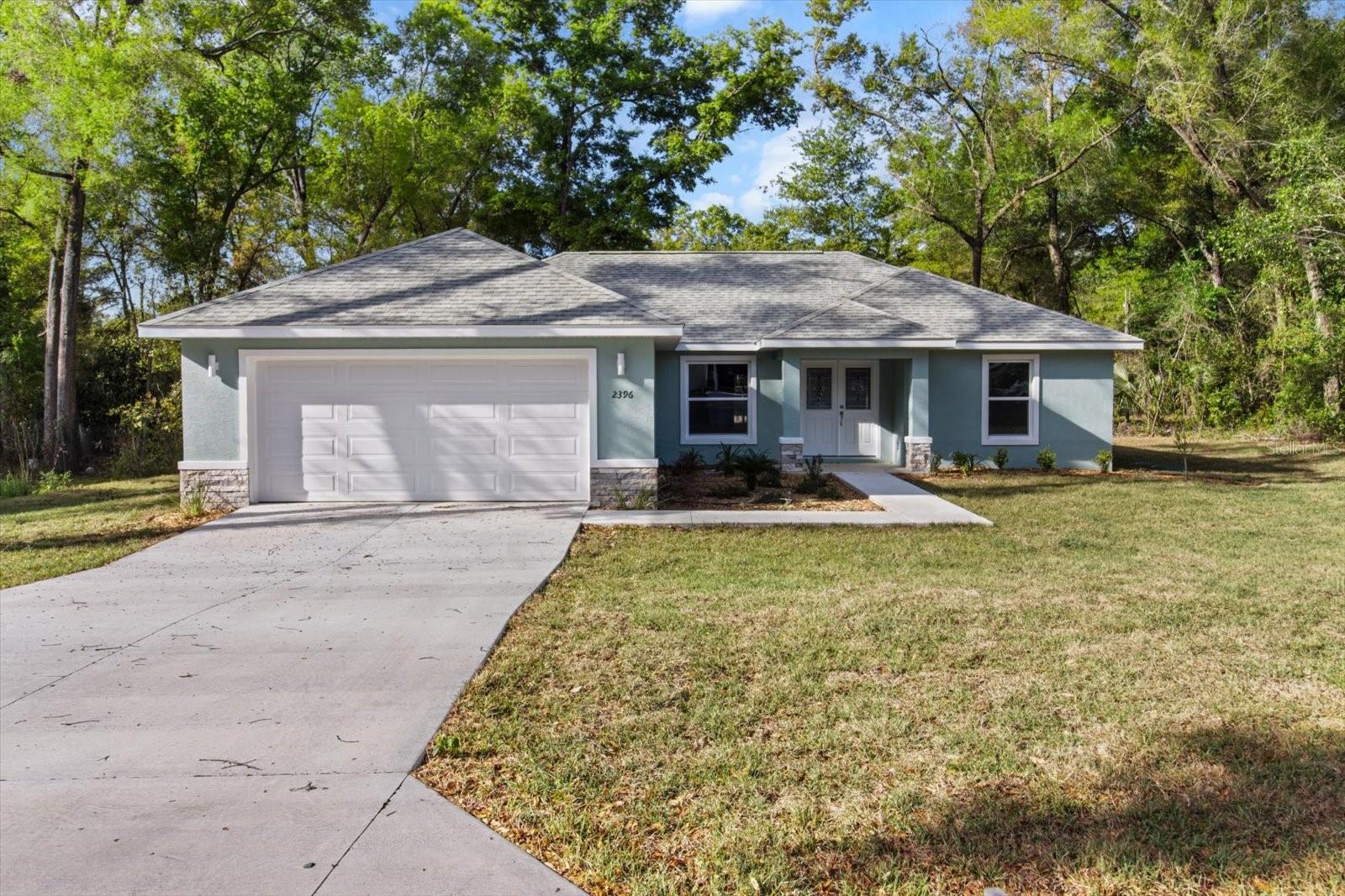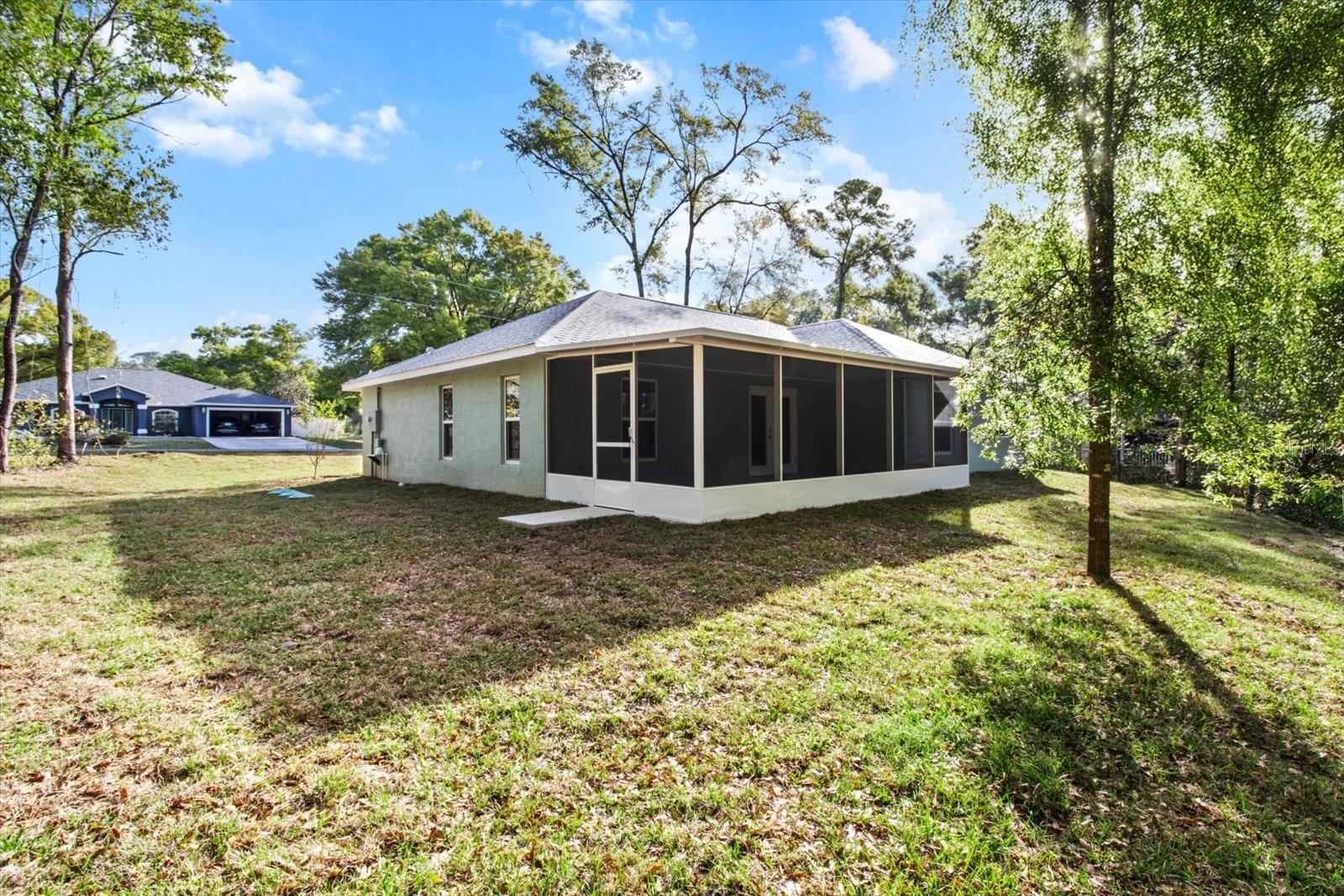 One or more photo(s) has been virtually staged. If you are looking for home in a quite neighborhood with the the golf course right across the street, this home is for you. Come check out this brand new beautifully landscaped home featuring 3 bedrooms, 2 full baths. The kitchen includes stainless-steel appliances, large quartz center island countertop and ceramic tile backsplash. The split-bedroom house plan includes luxury vinyl flooring throughout with carpet in the bedrooms and trey ceilings, . The primary bedroom has 2 large walk in closets and en-suite with a large tiled shower and double sinks. The home also has an interior laundry room and large enclosed lanai to sit and enjoy nature. There is a two car garage with epoxy flooring. There is no Homeowners Association (HOA), only an architectural committee.